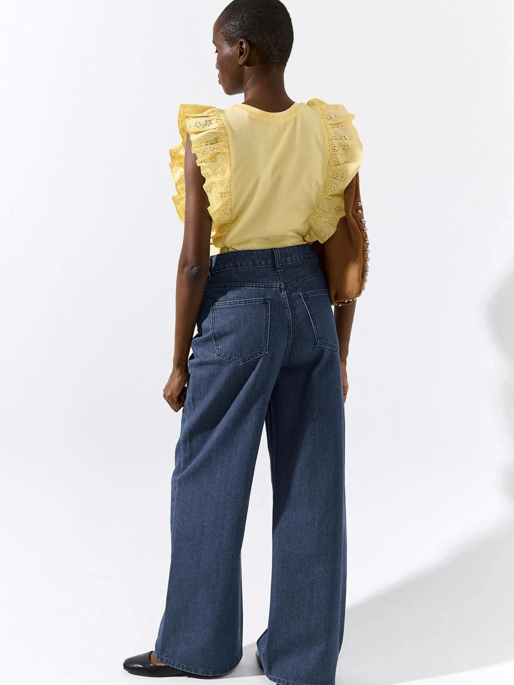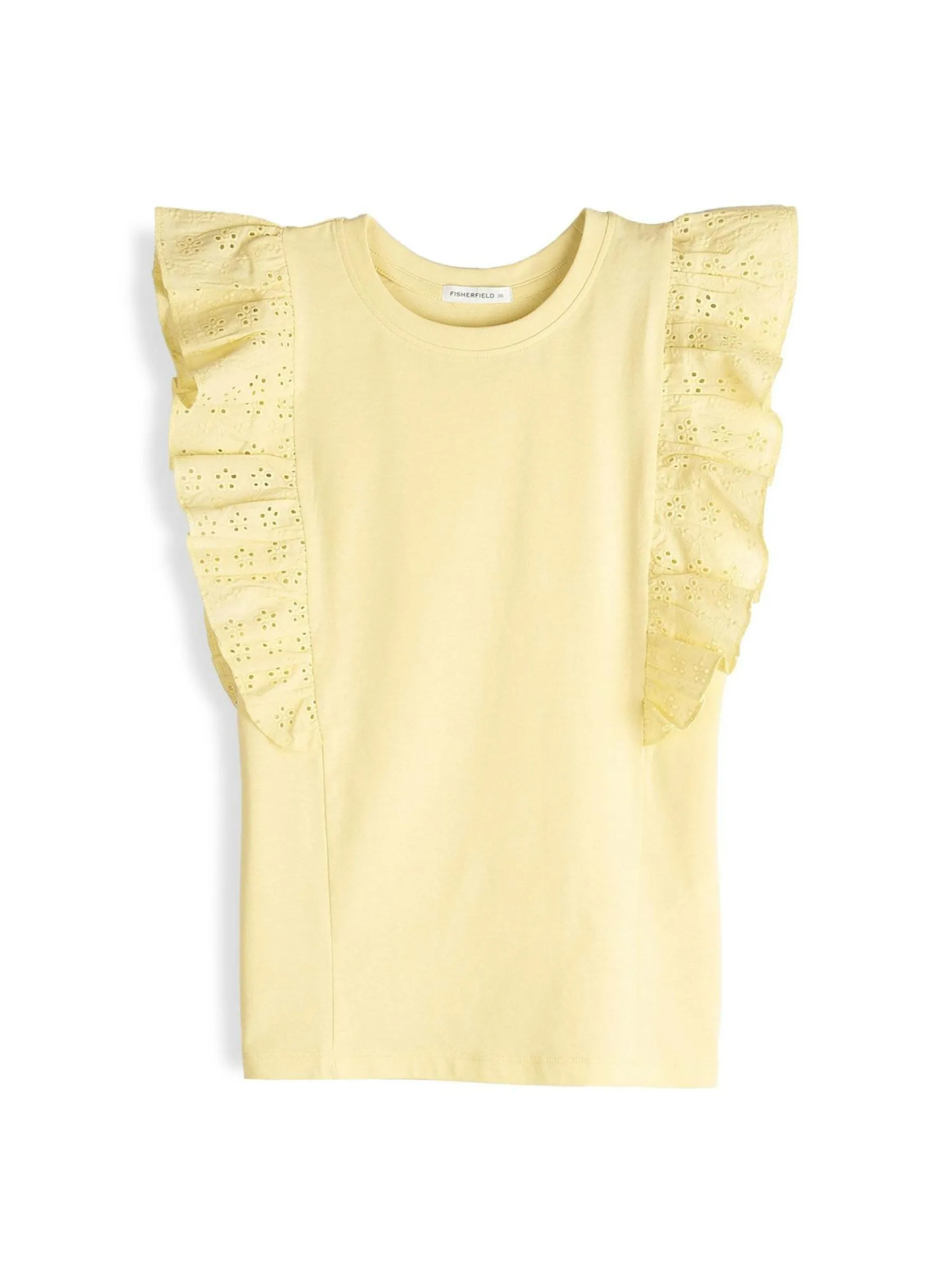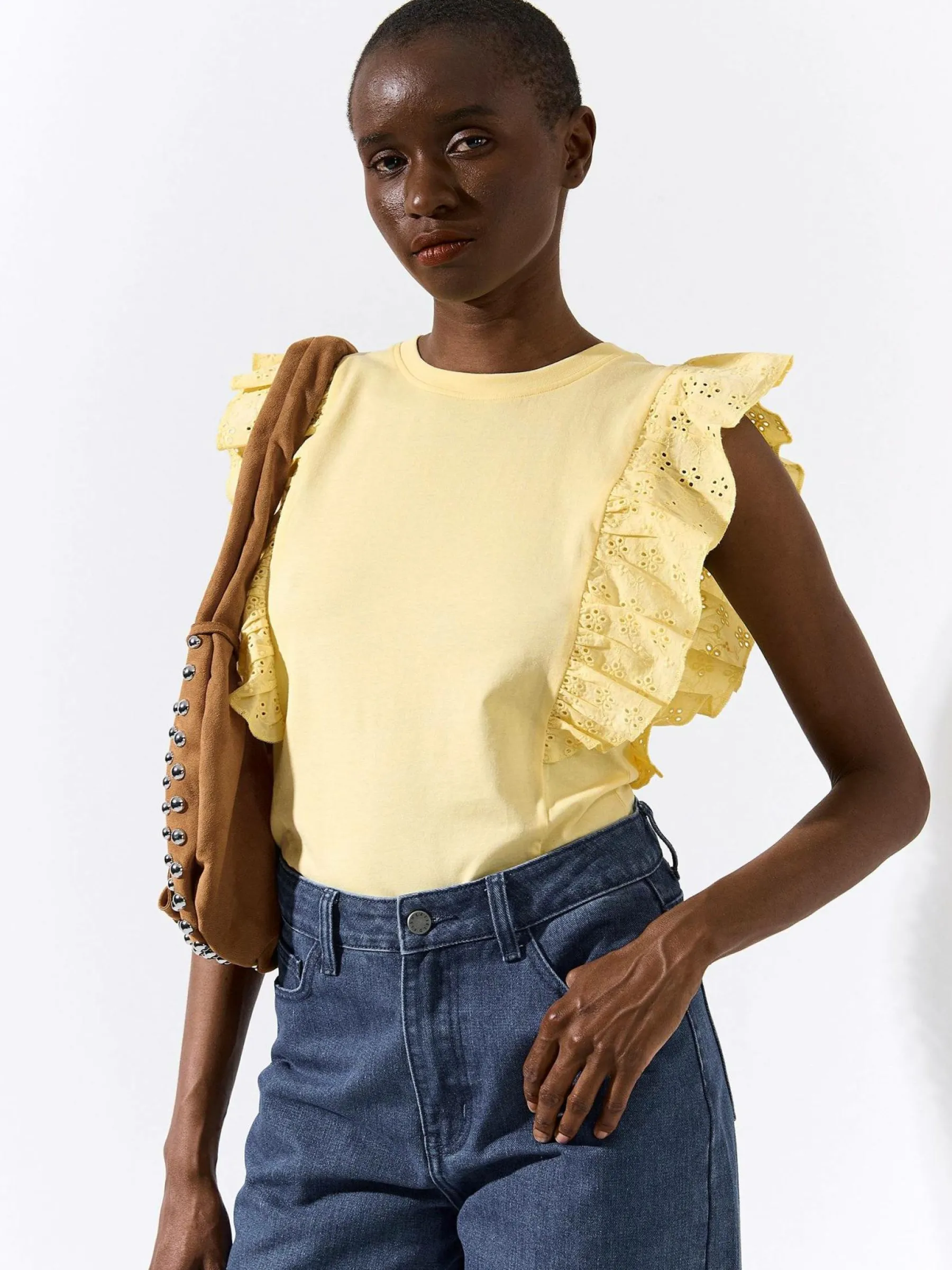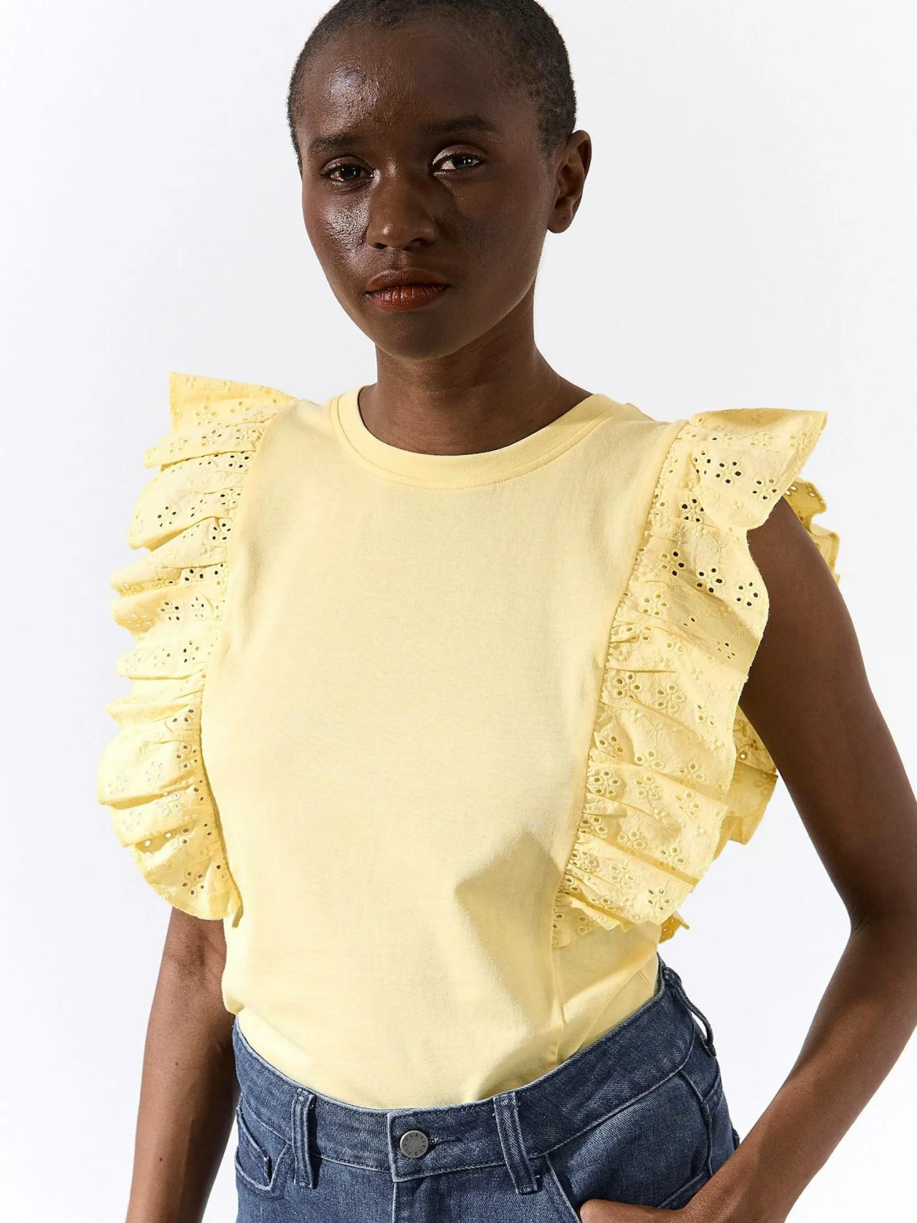 Kolor: żółtyKrój: z falbanąTyp: koszulkaRekaw: krótki rękawDługość: krótkiPattern style: pojedynczy kolorDeta…