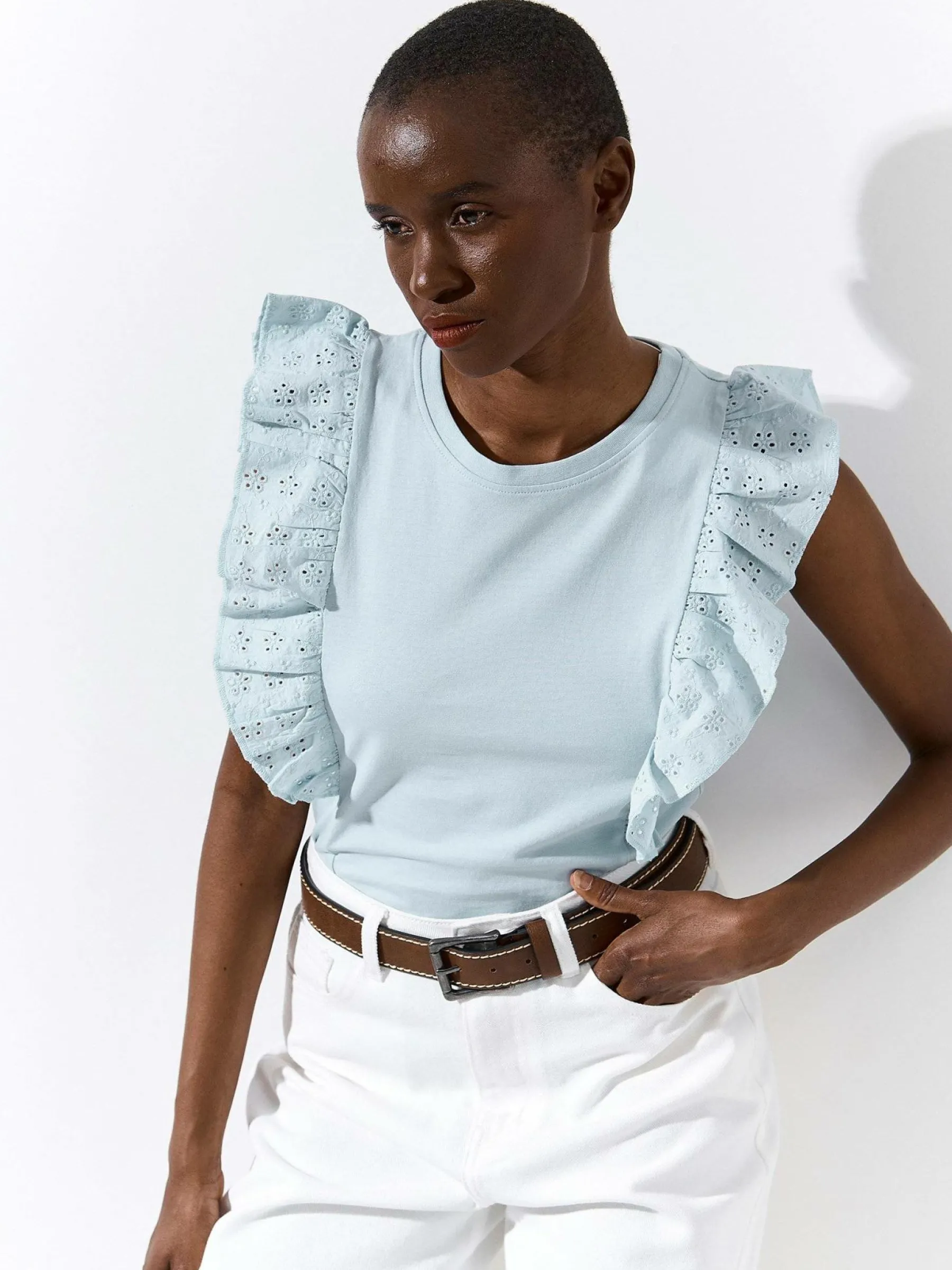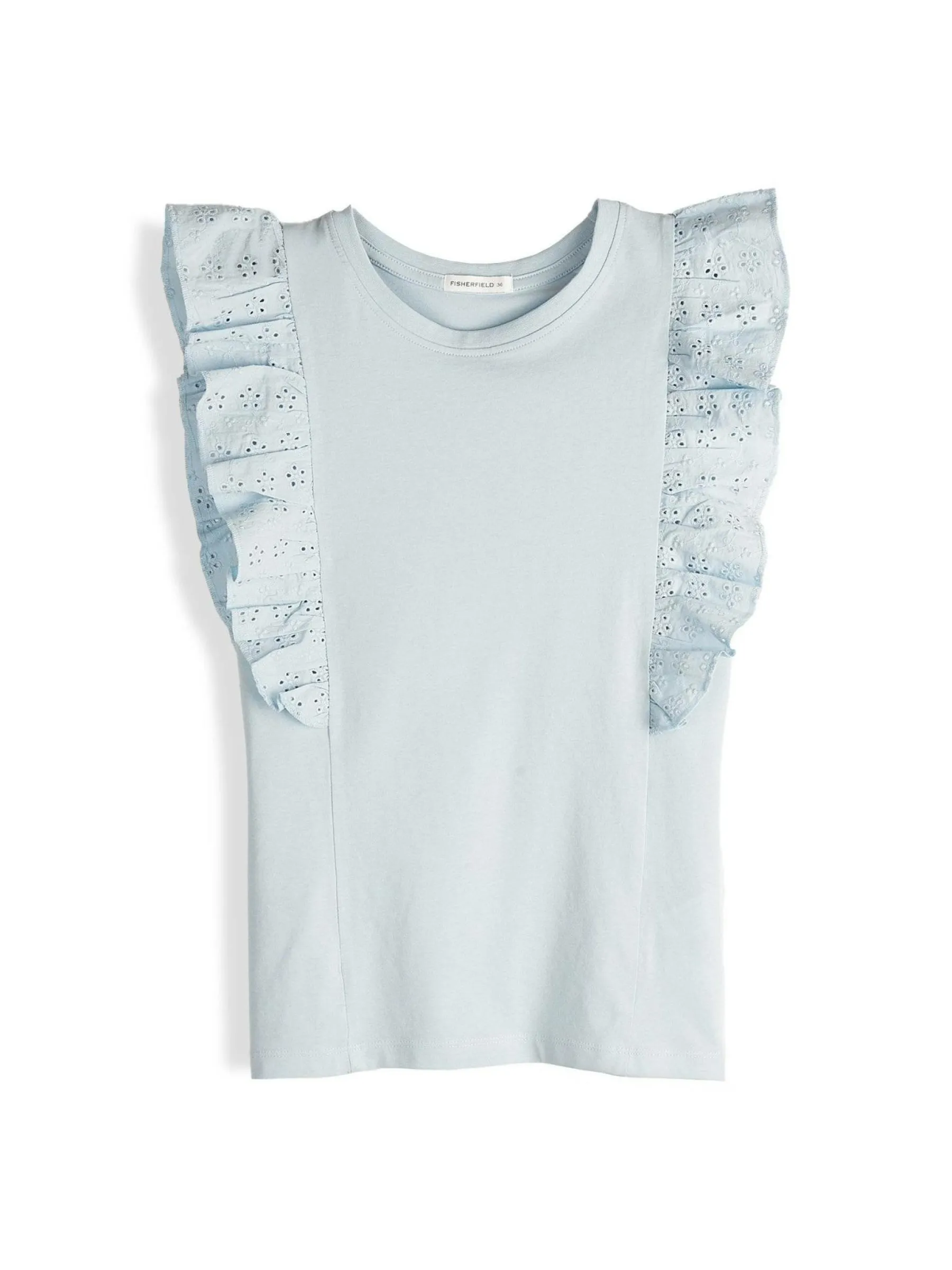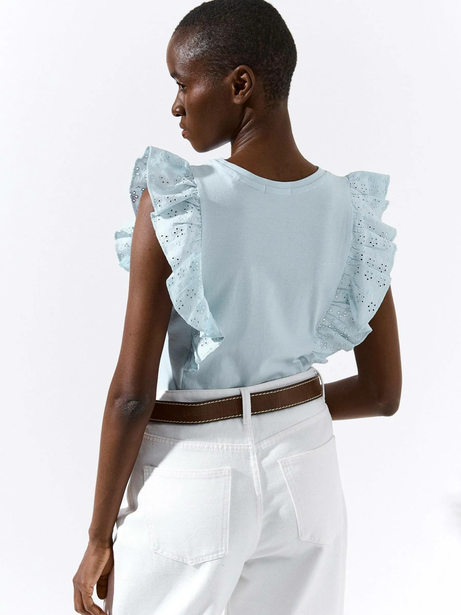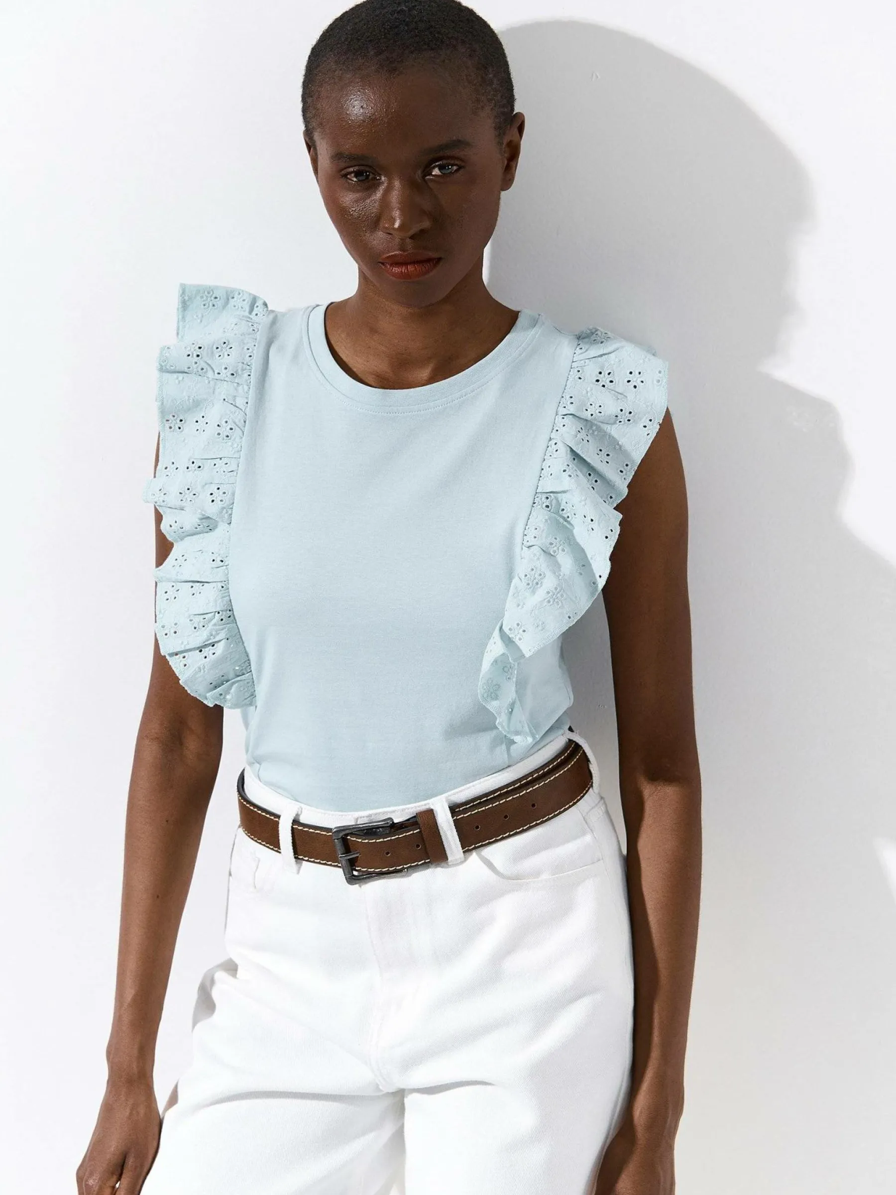 Kolor: niebieskiKrój: z falbanąTyp: koszulkaRekaw: krótki rękawDługość: krótkiPattern style: pojedynczy kolorDet…