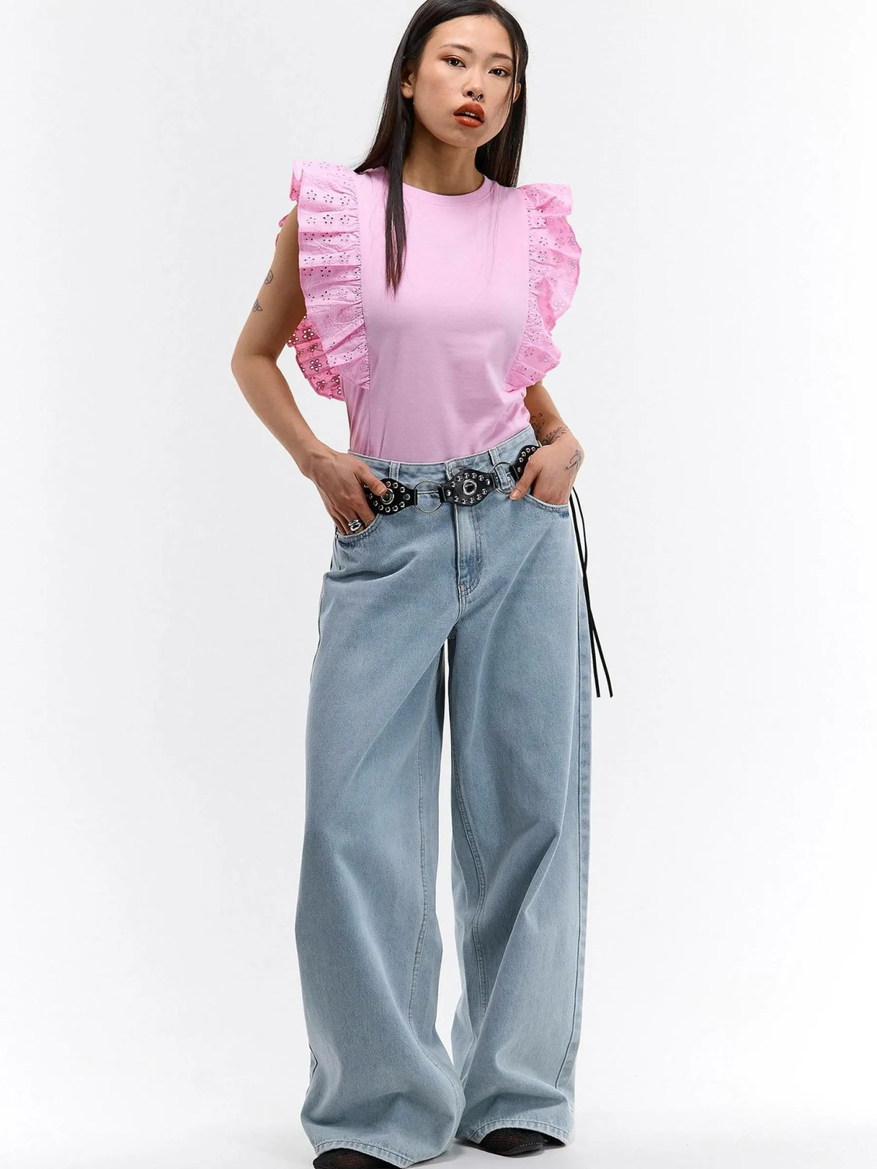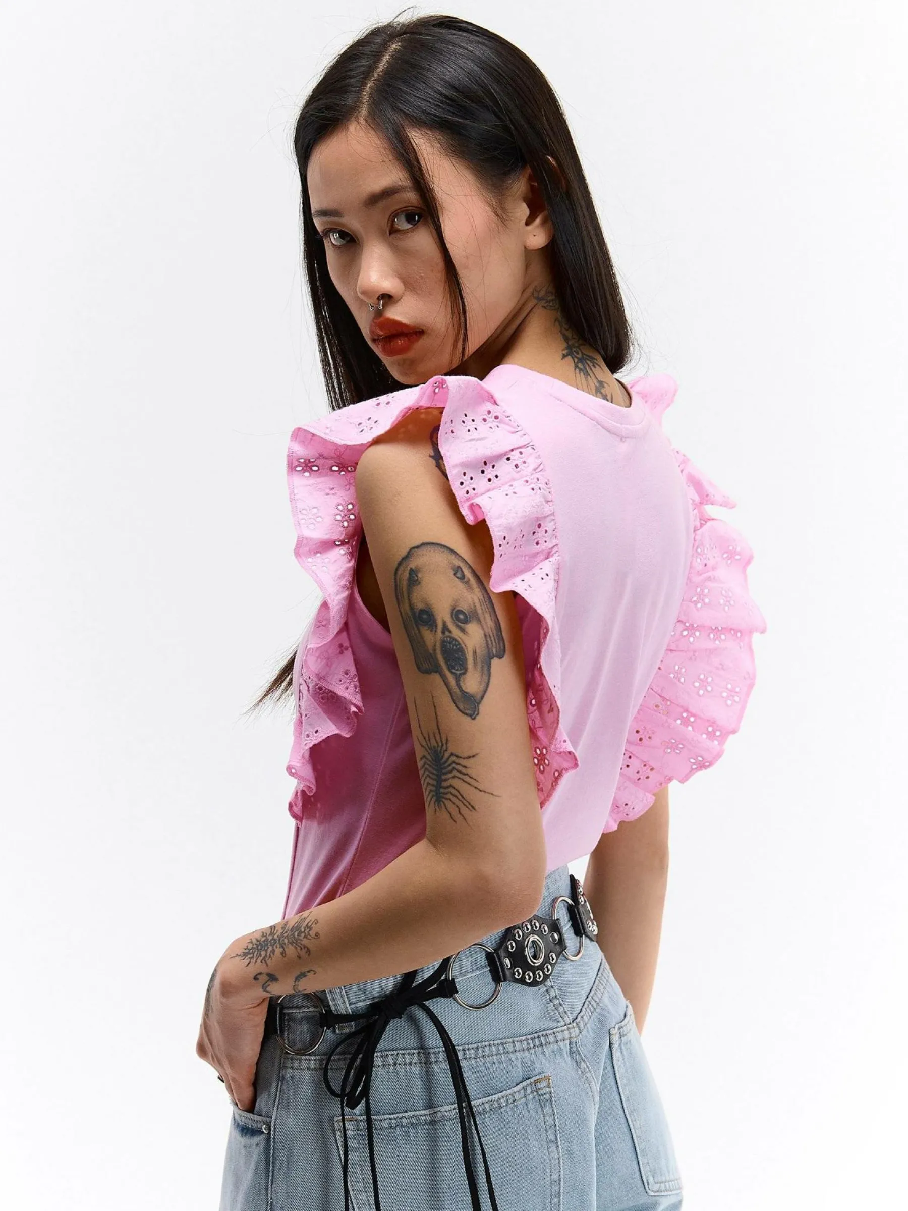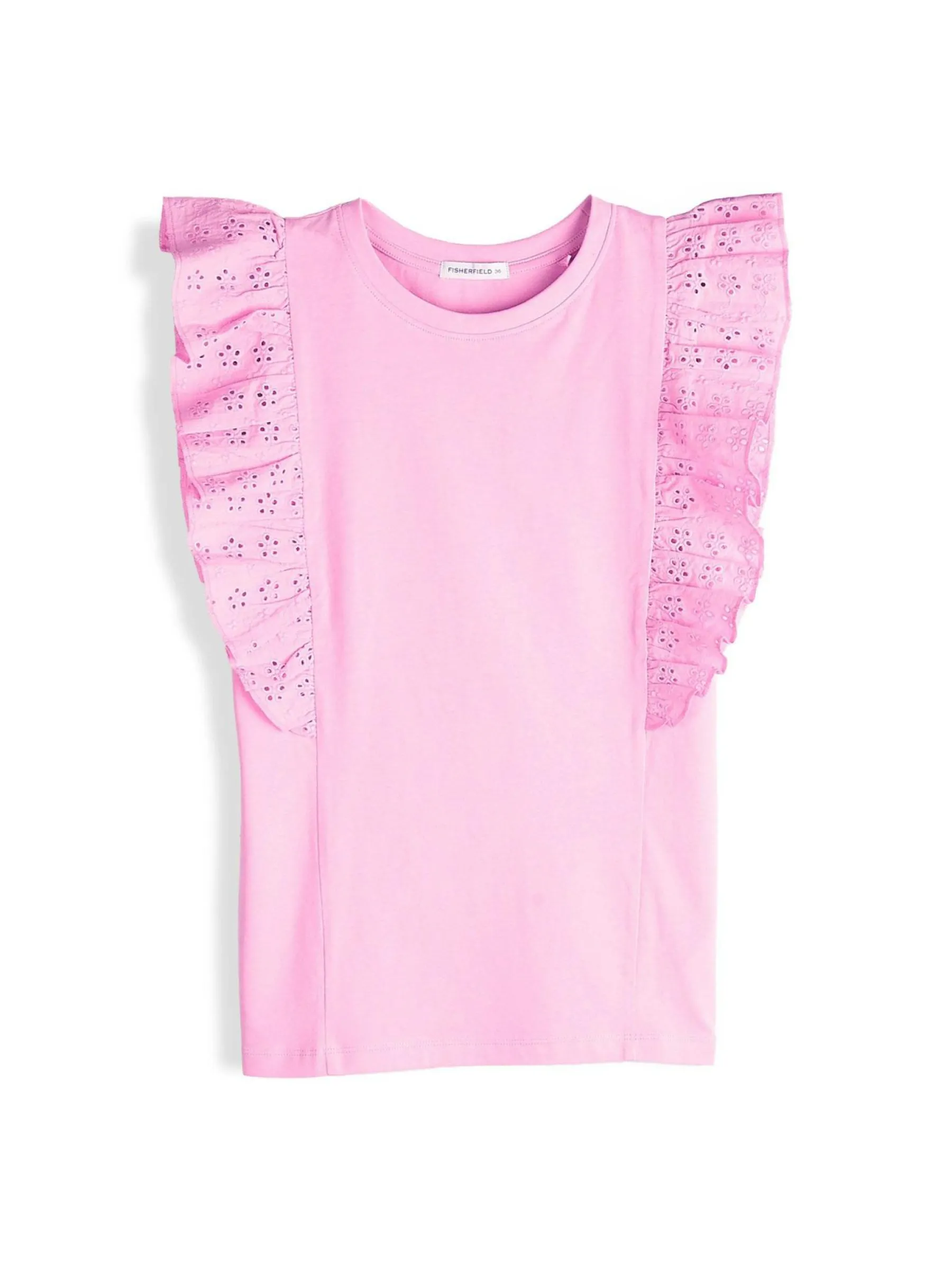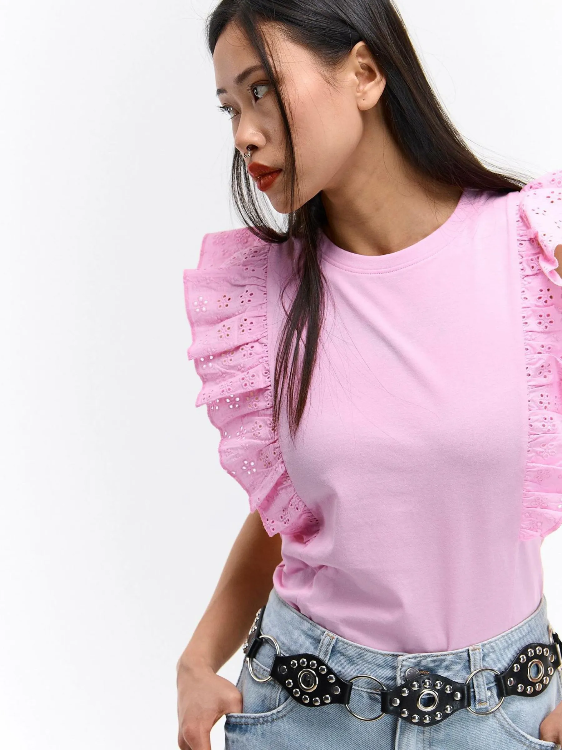 Kolor: różowyKrój: z falbanąTyp: koszulkaRekaw: krótki rękawDługość: krótkiPattern style: pojedynczy kolorDeta…