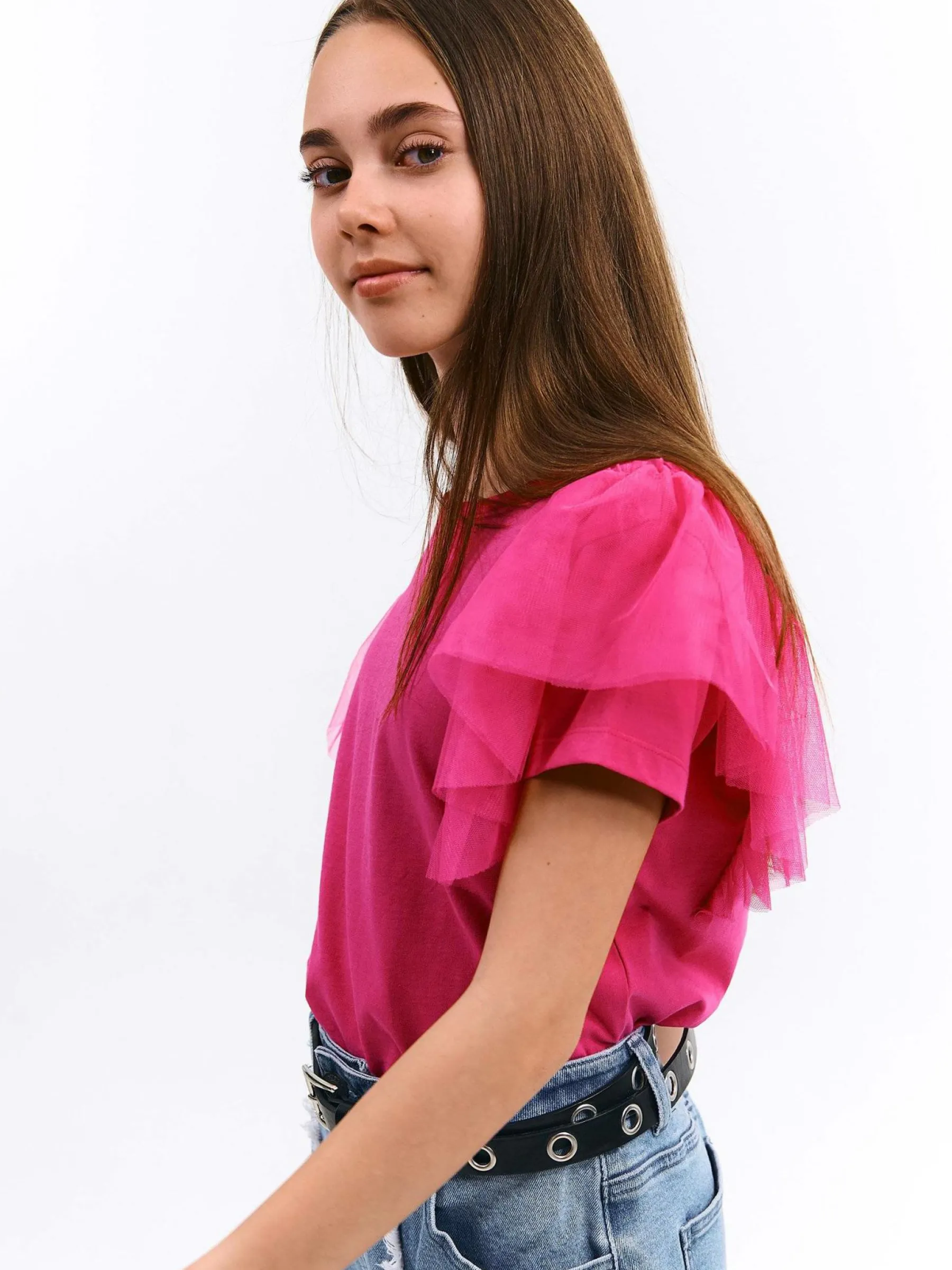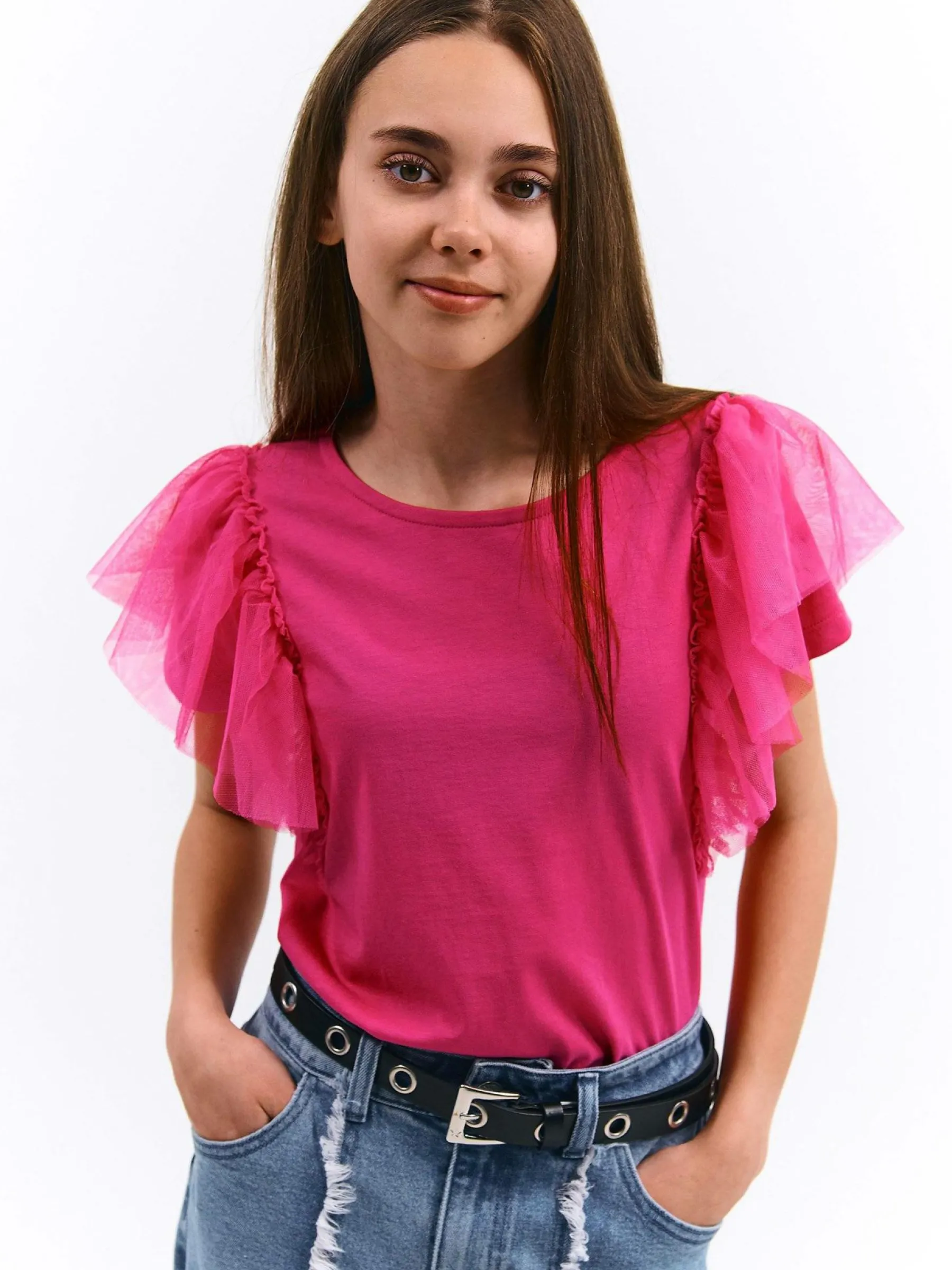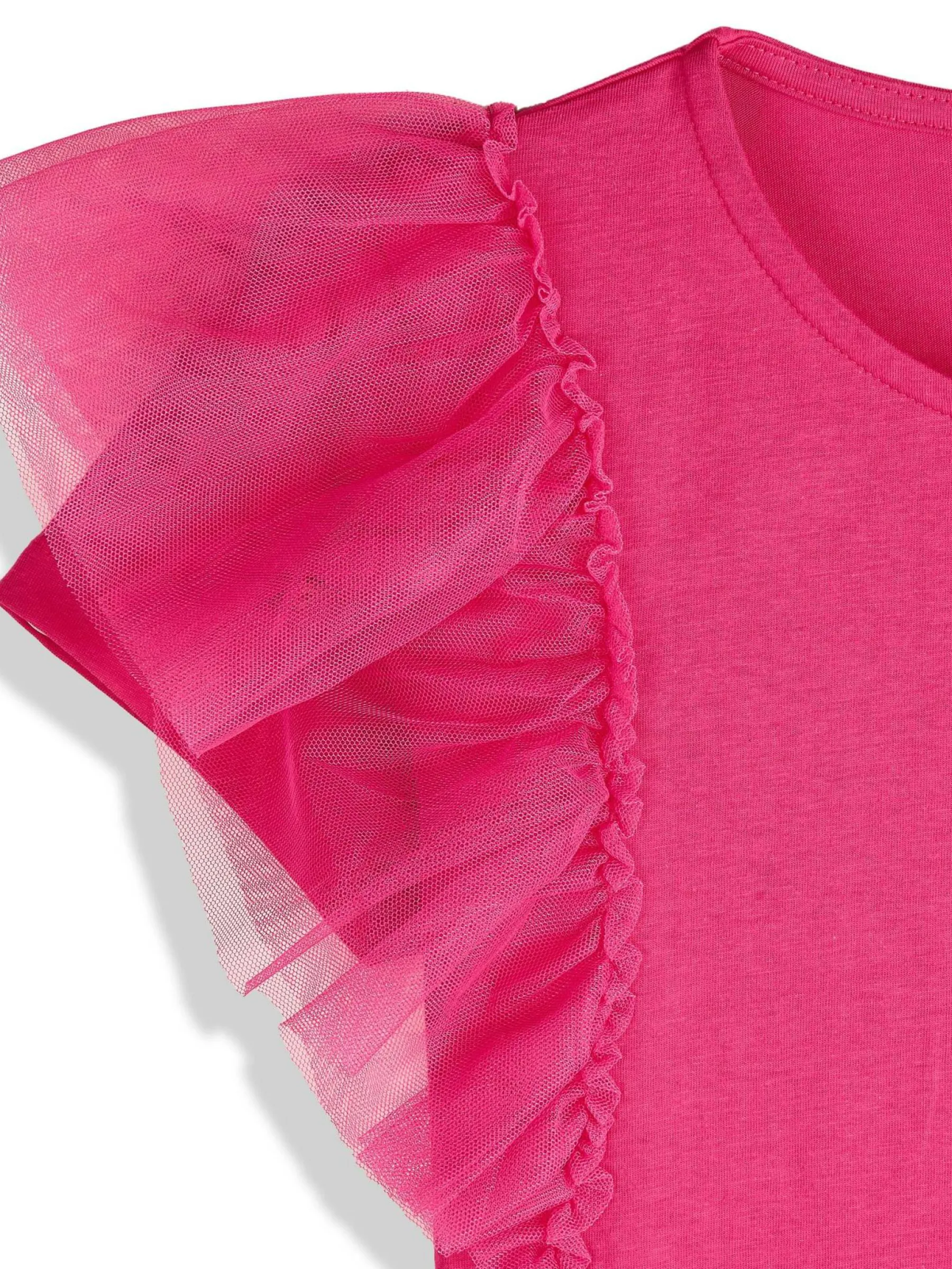 Kolor: różowyKrój: z falbanąTyp: koszulkaRekaw: krótki rękawDługość: krótkiPattern style: pojedynczy kolorDeta…