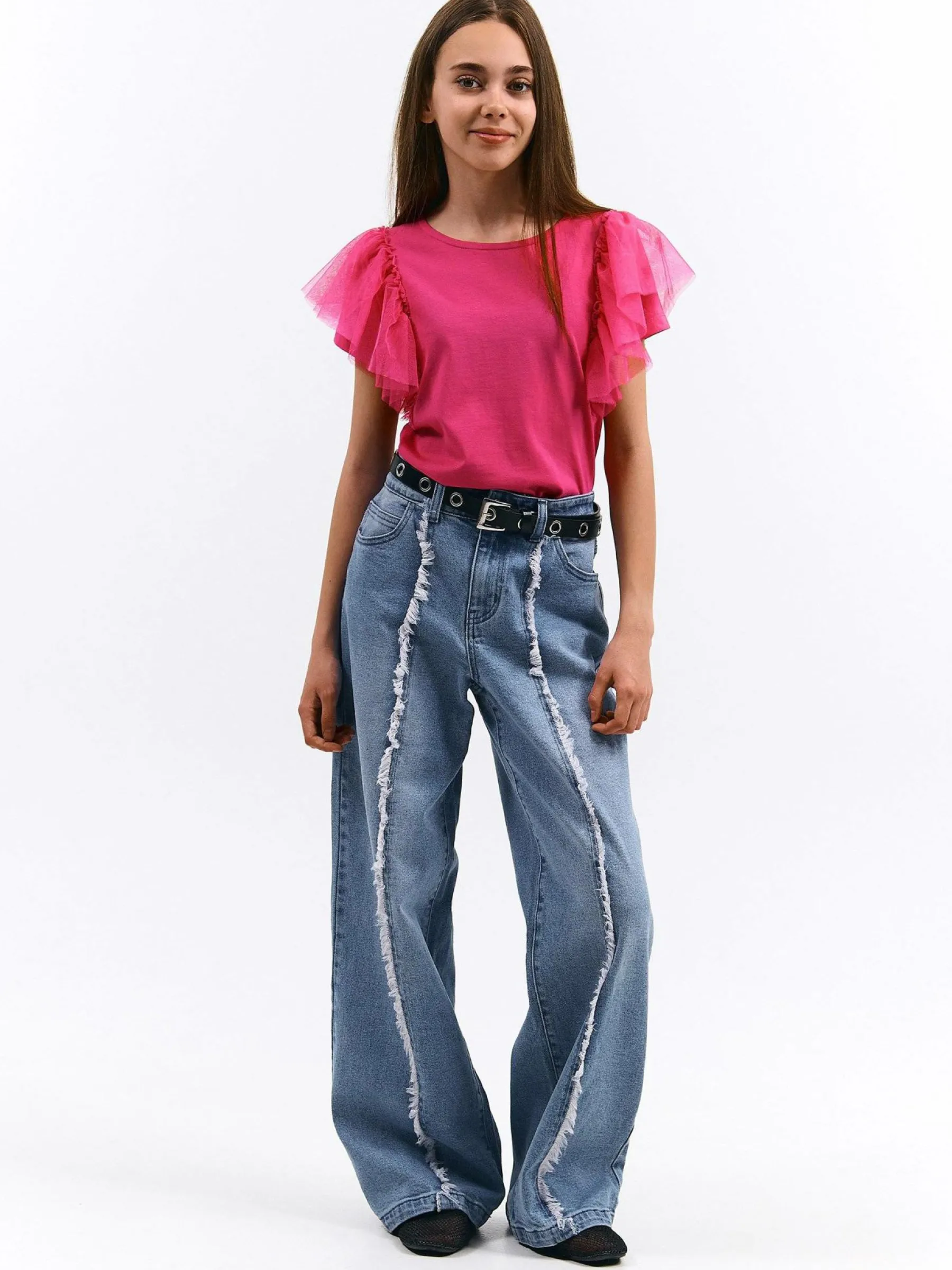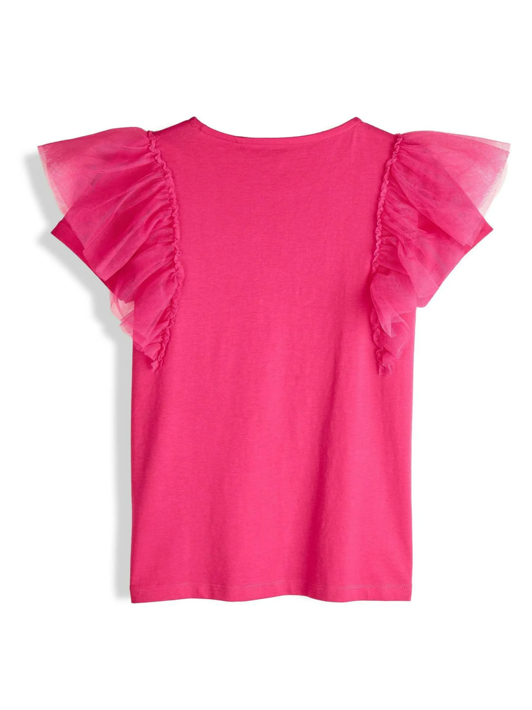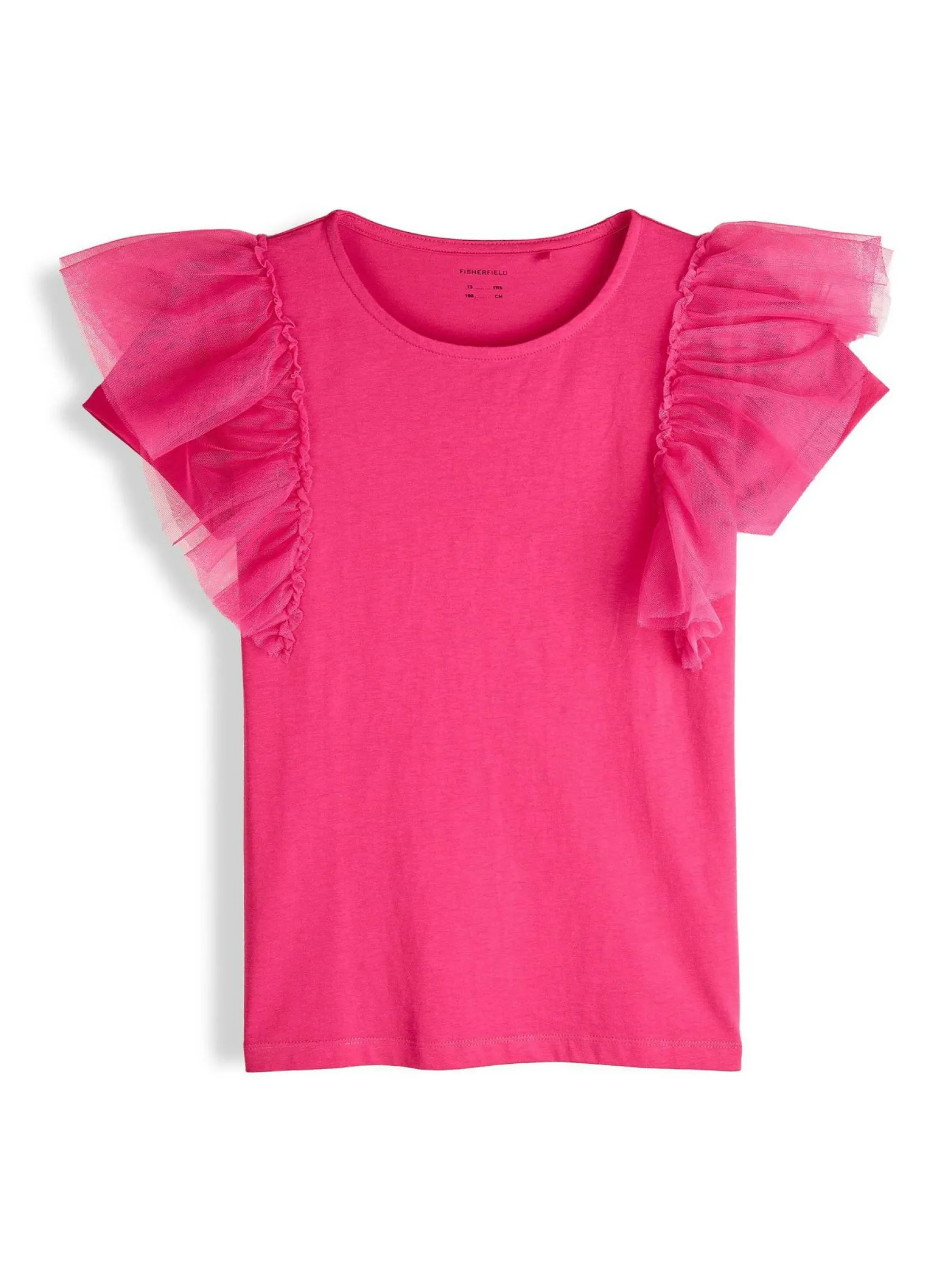 Kolor: różowyKrój: z falbanąTyp: koszulkaRekaw: krótki rękawDługość: krótkiPattern style: pojedynczy kolorDeta…