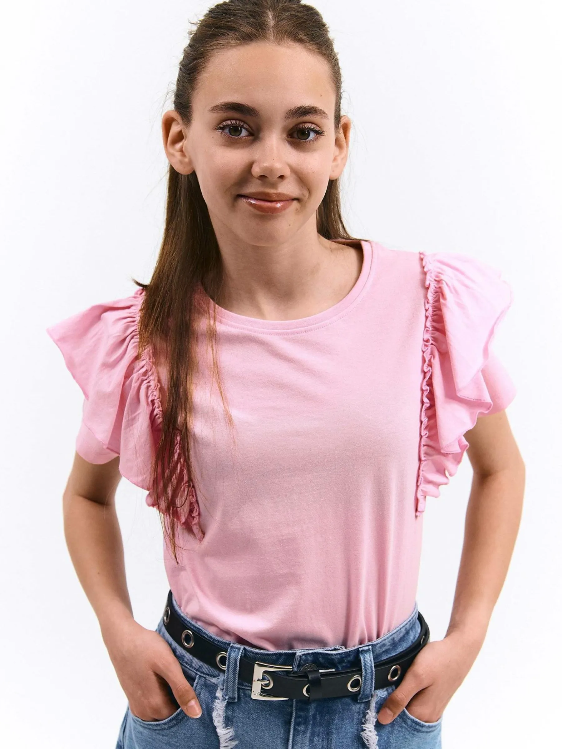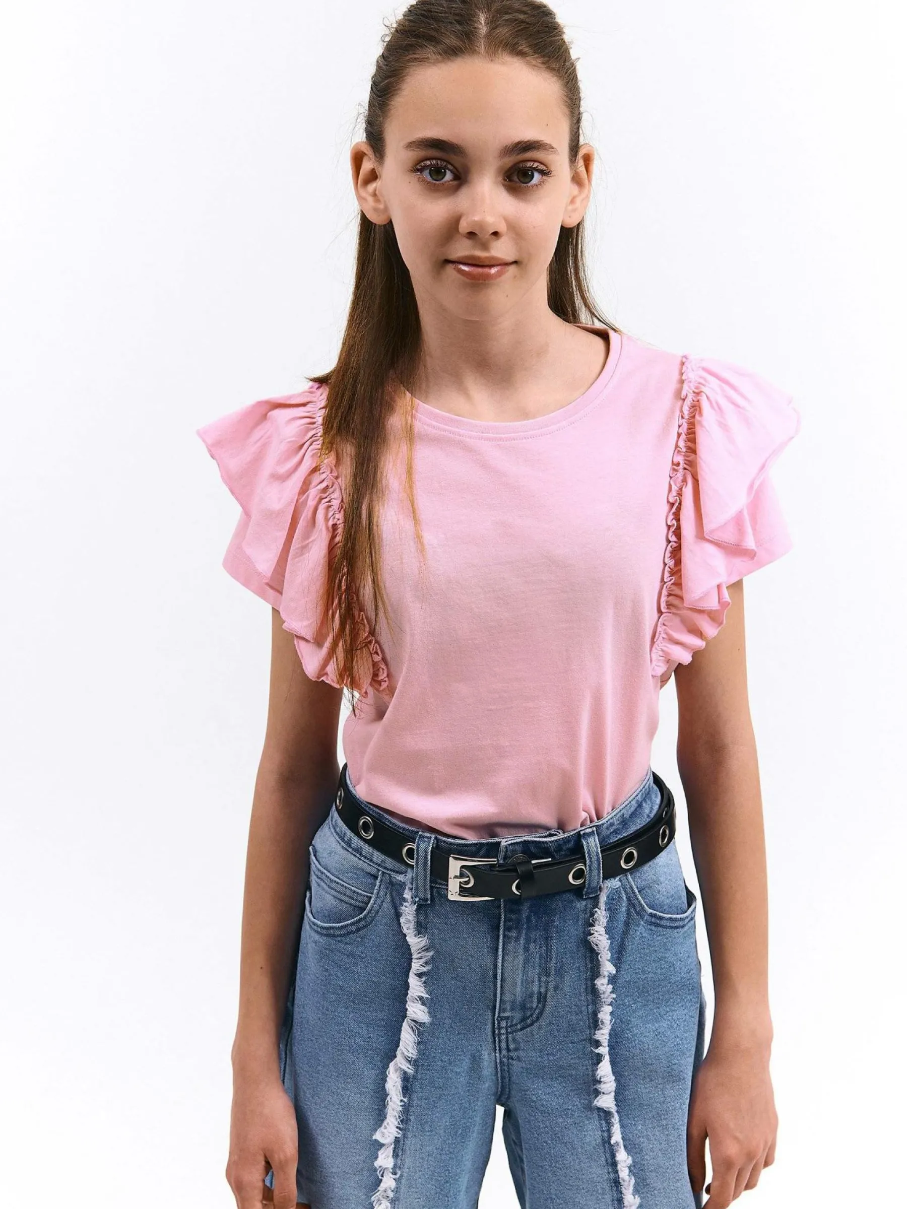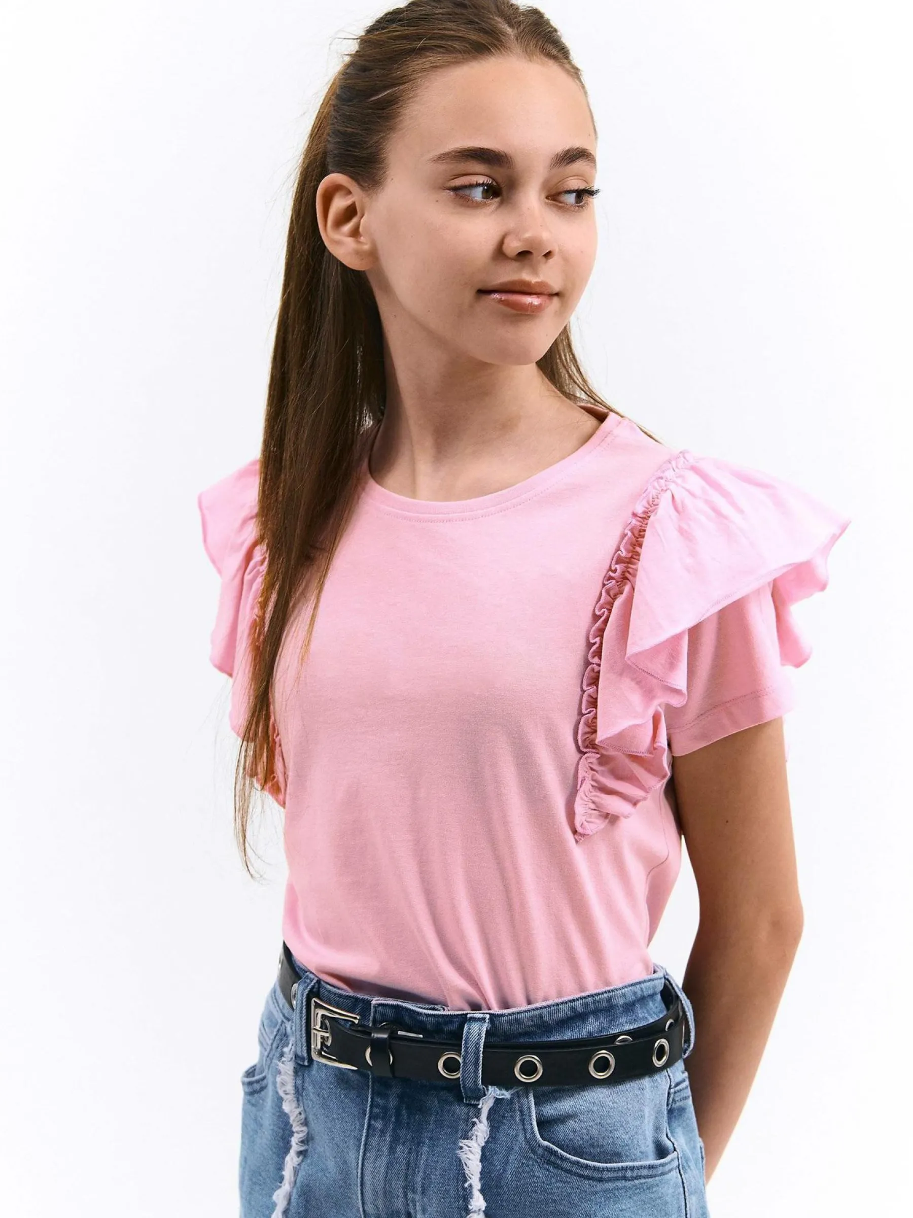 Kolor: różowyKrój: z falbanąTyp: koszulkaRekaw: krótki rękawDługość: krótkiPattern style: pojedynczy kolorDeta…