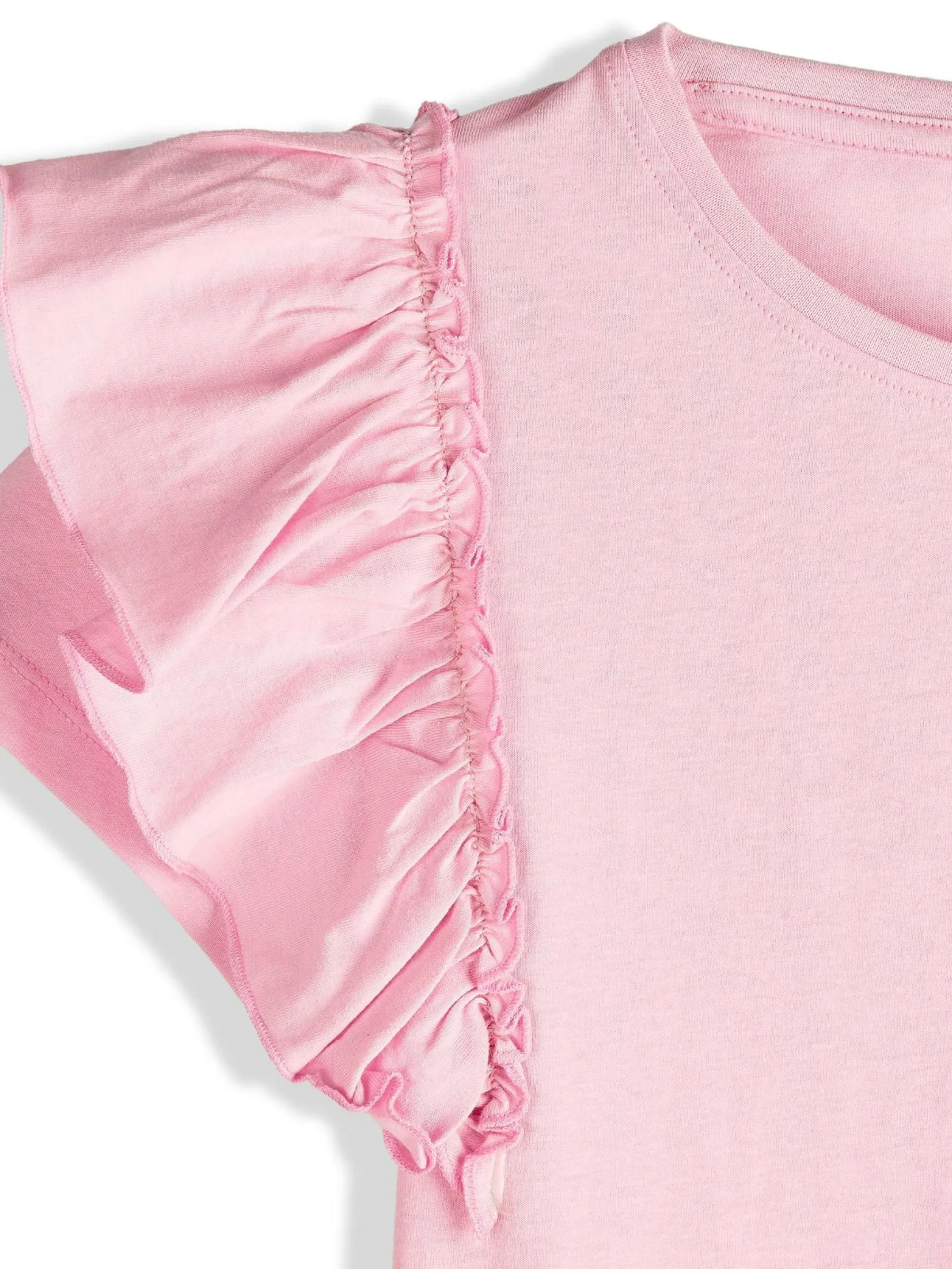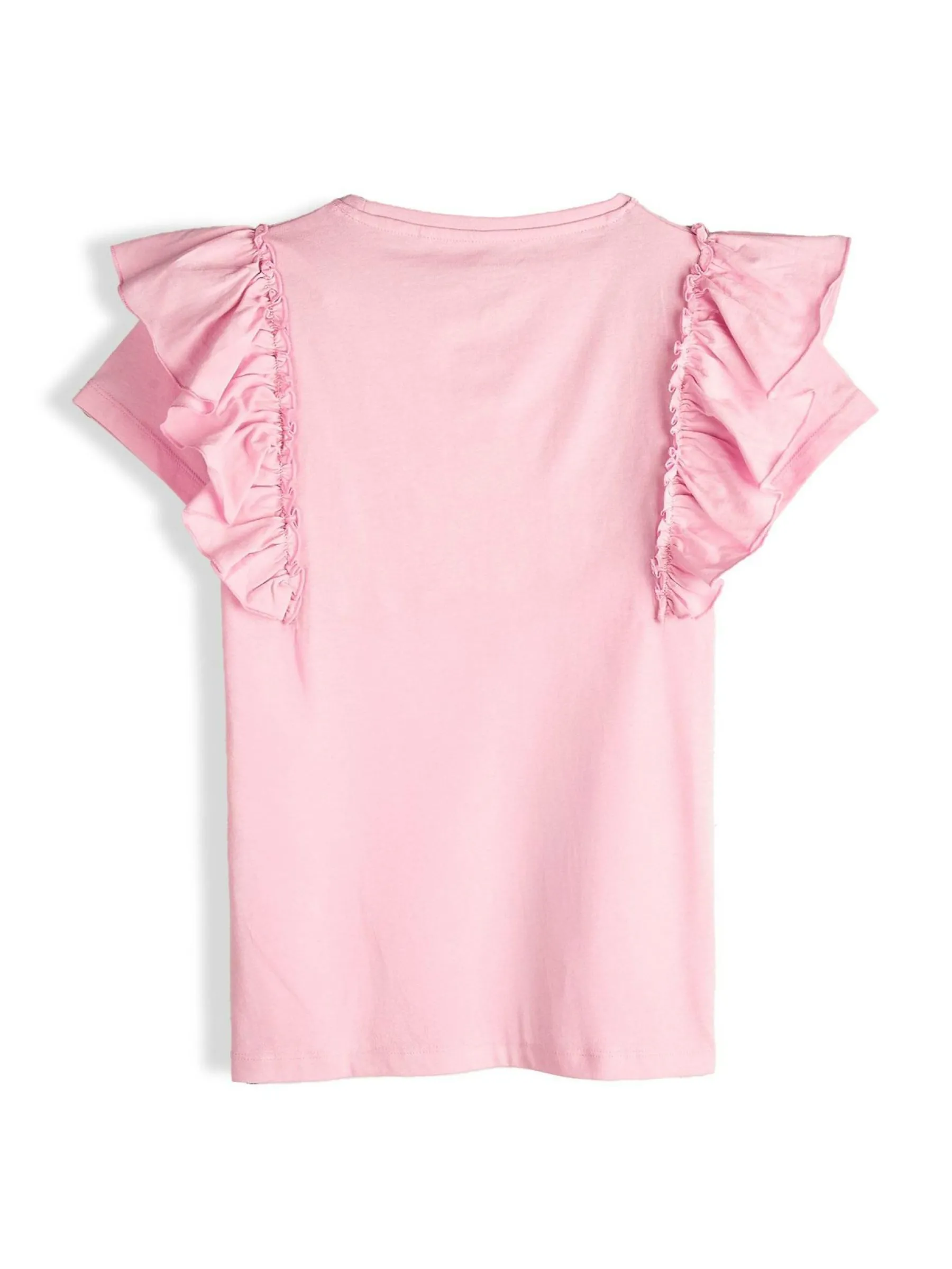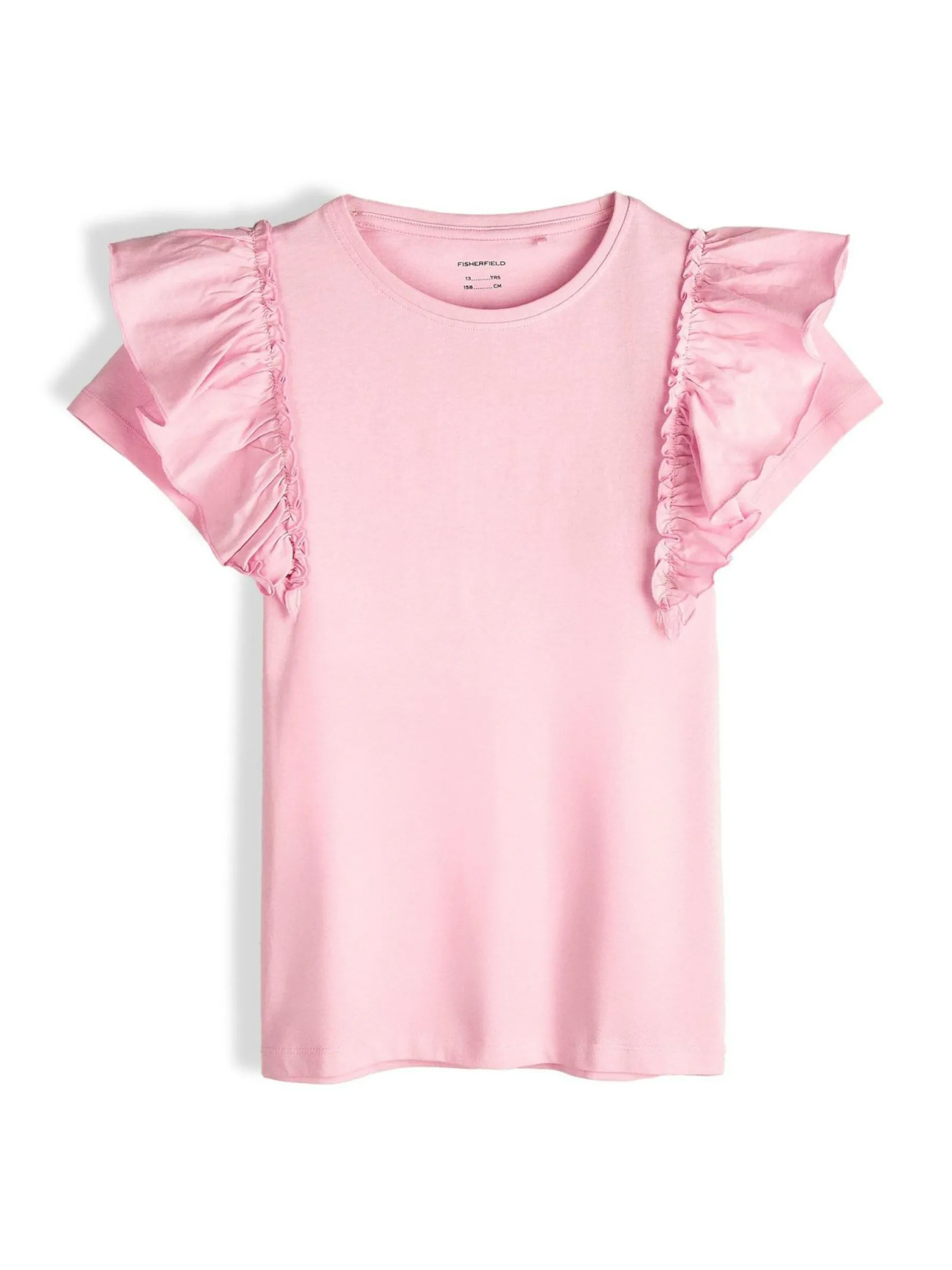 Kolor: różowyKrój: z falbanąTyp: koszulkaRekaw: krótki rękawDługość: krótkiPattern style: pojedynczy kolorDeta…