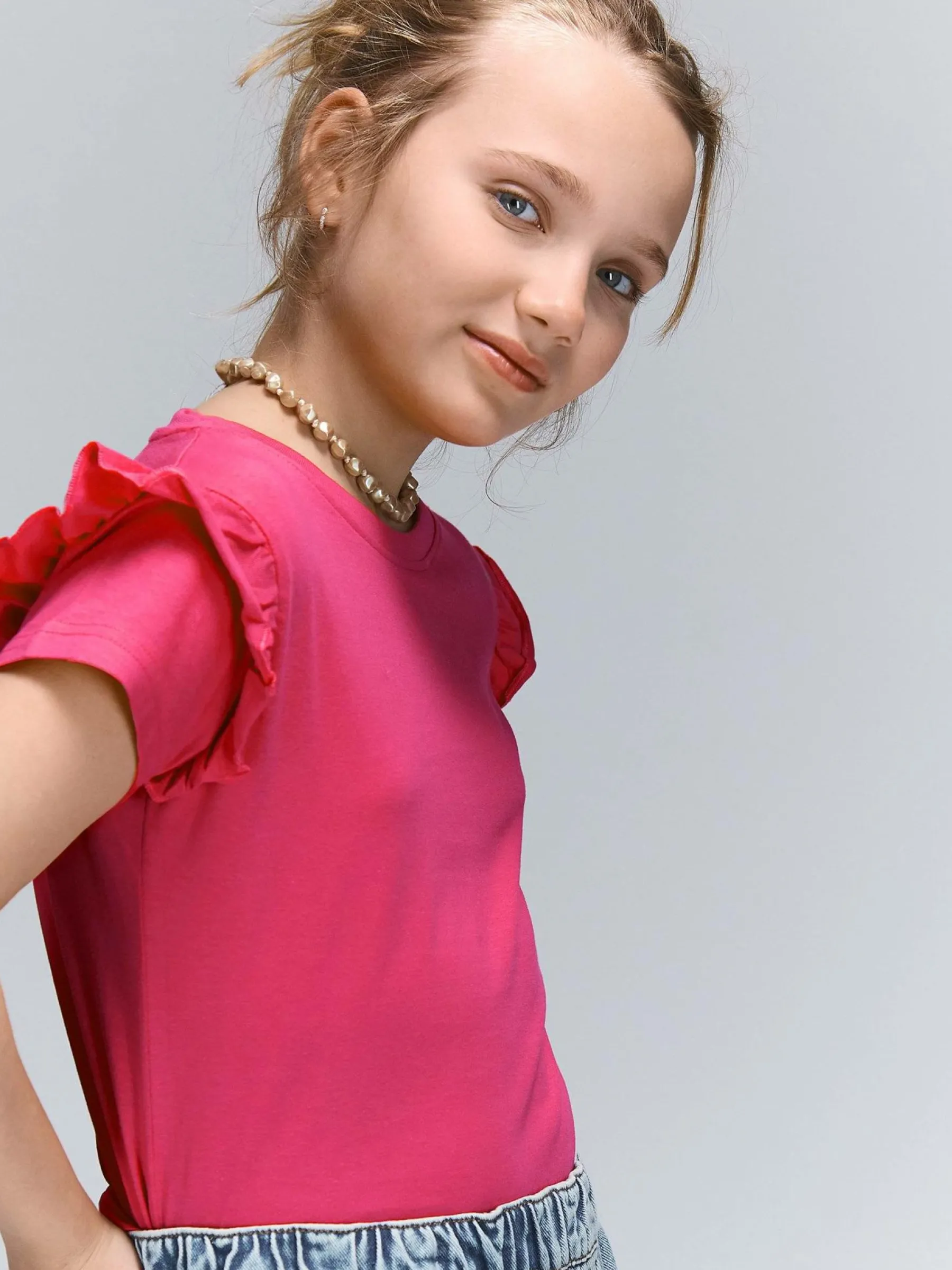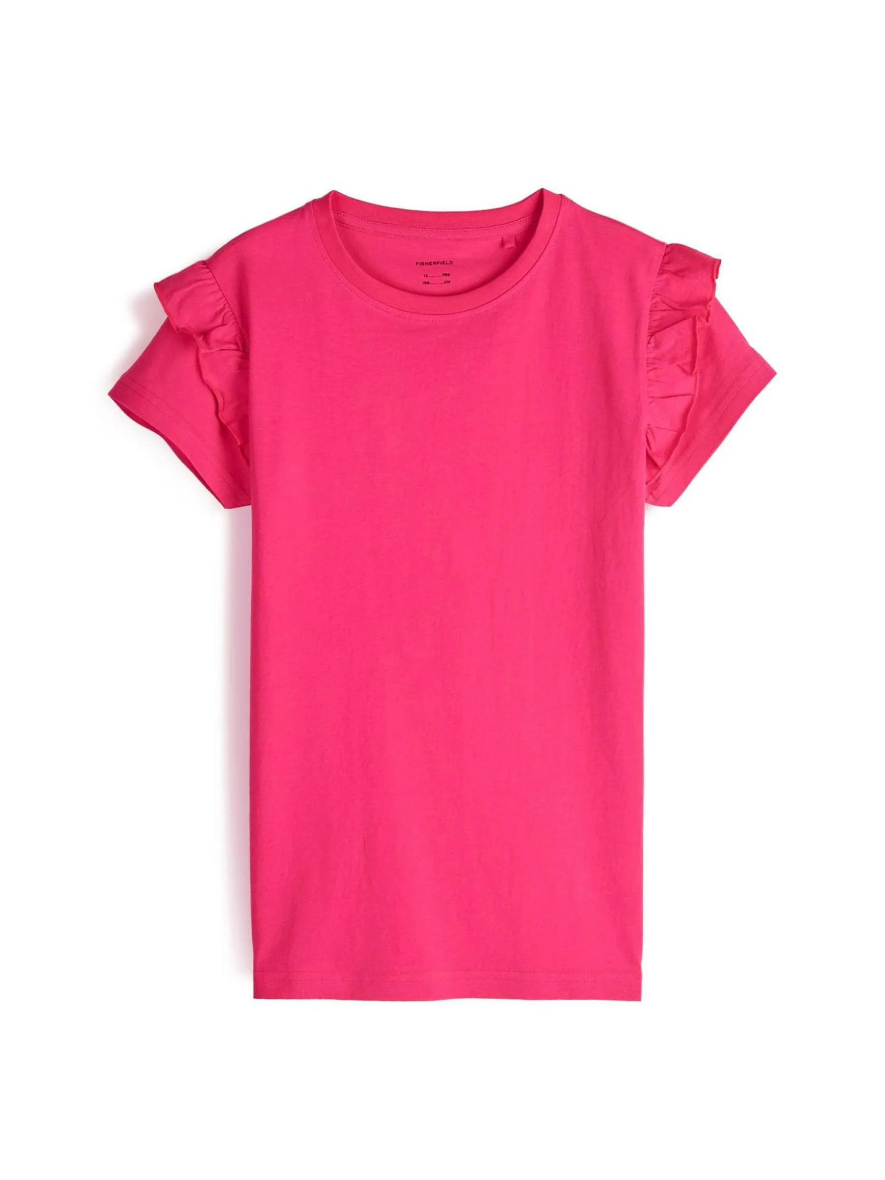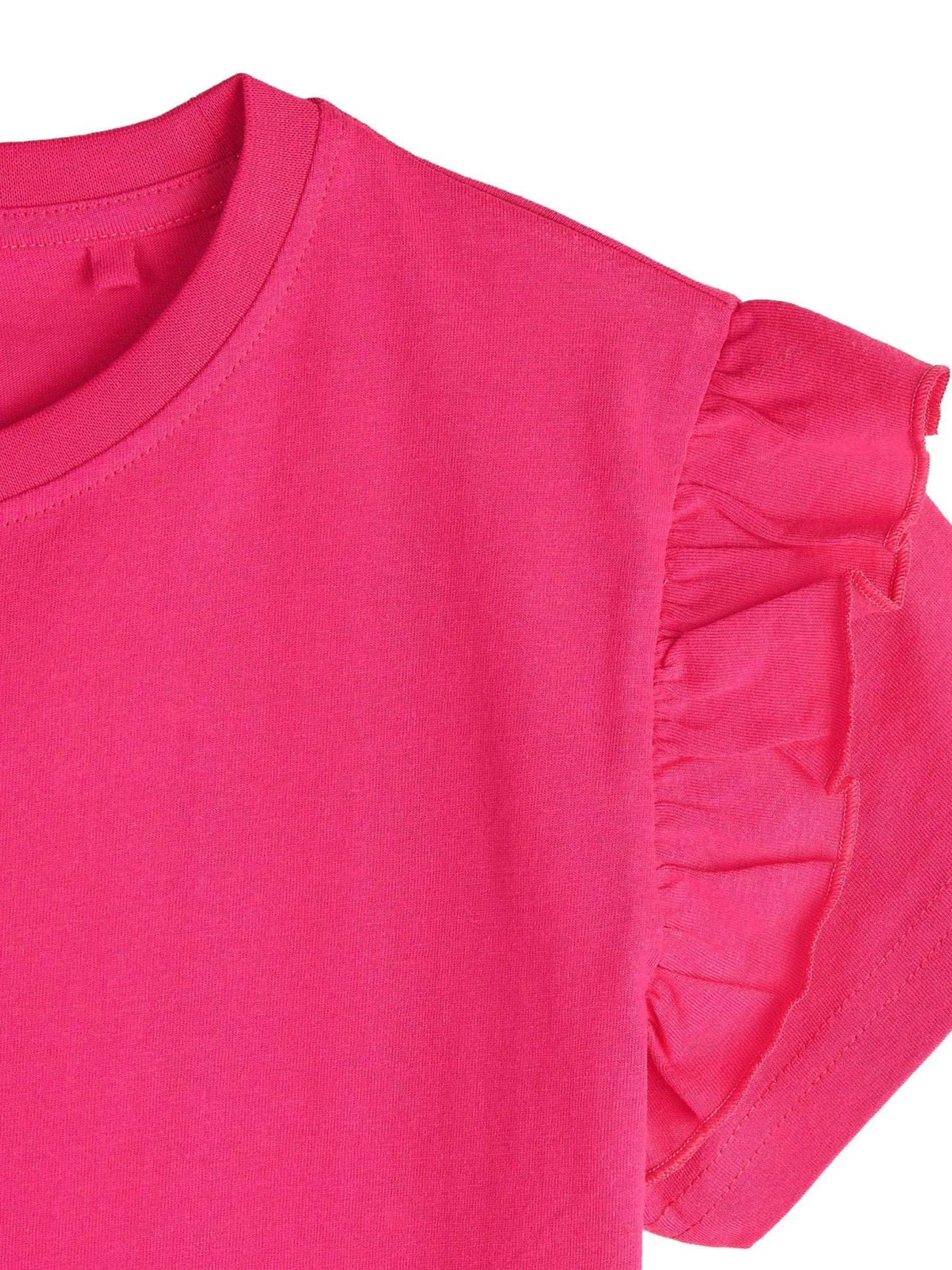 Kolor: różowyKrój: z falbanąTyp: koszulkaRekaw: krótki rękawDługość: krótkiPattern style: pojedynczy kolorDeta…