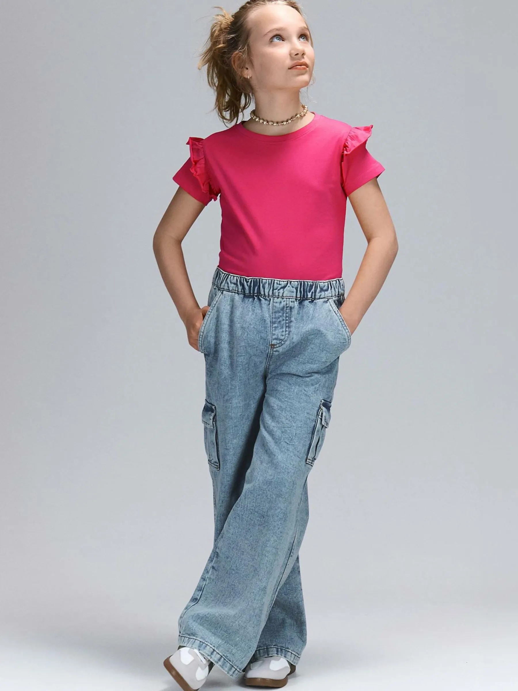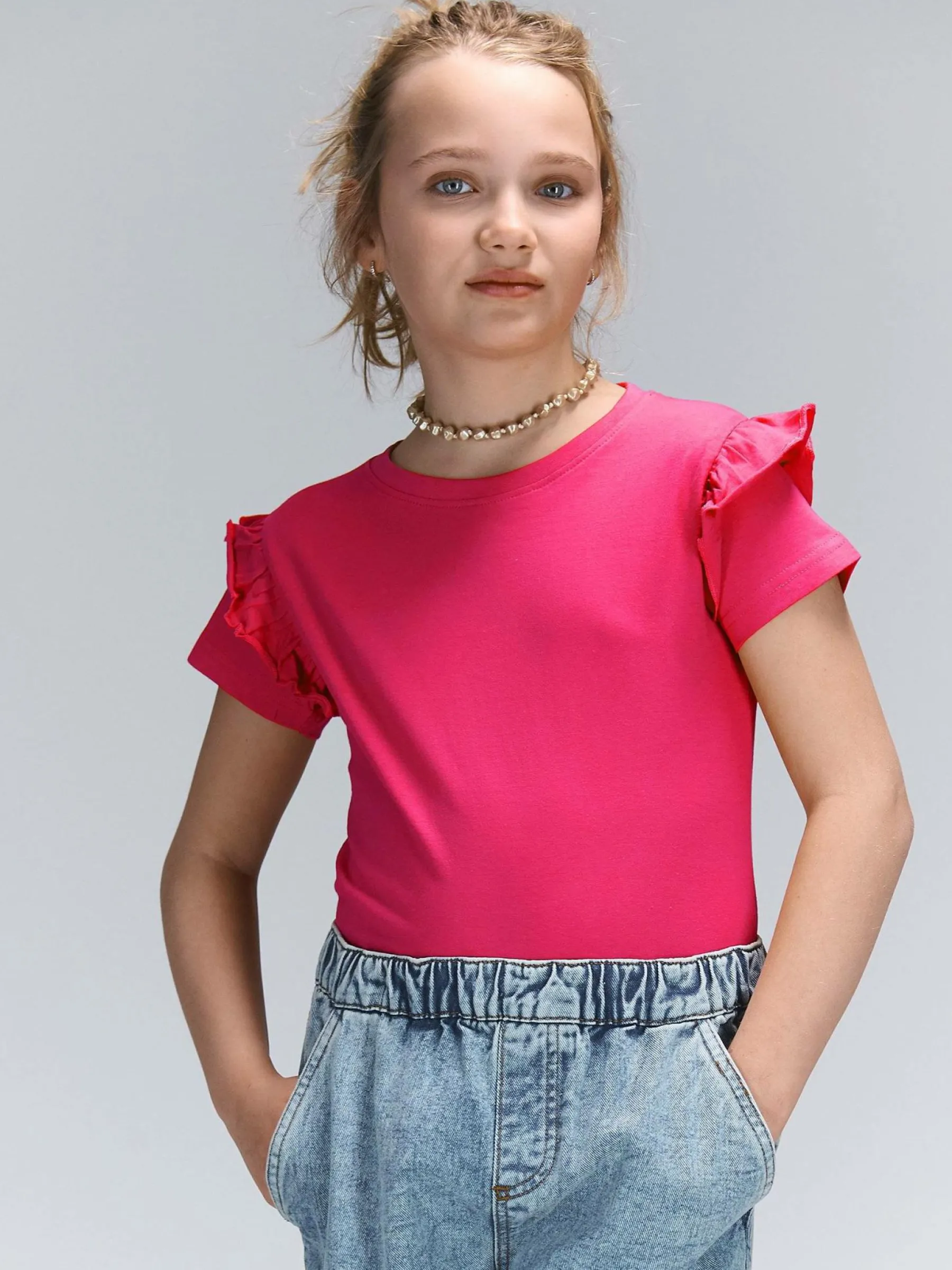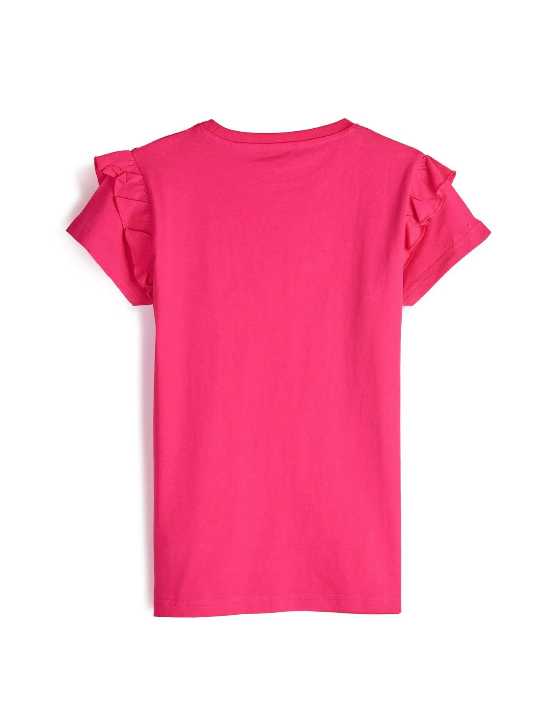 Kolor: różowyKrój: z falbanąTyp: koszulkaRekaw: krótki rękawDługość: krótkiPattern style: pojedynczy kolorDeta…