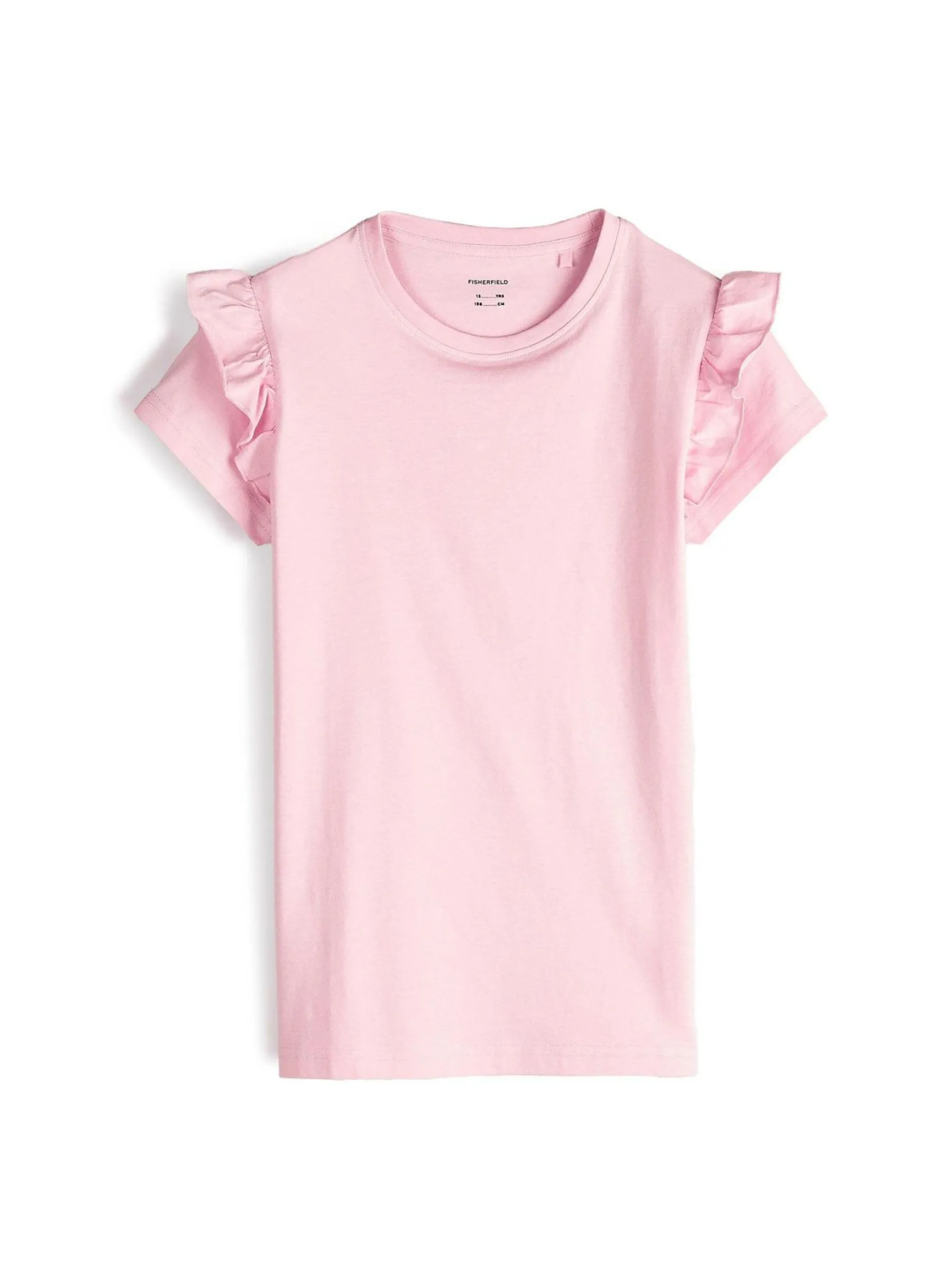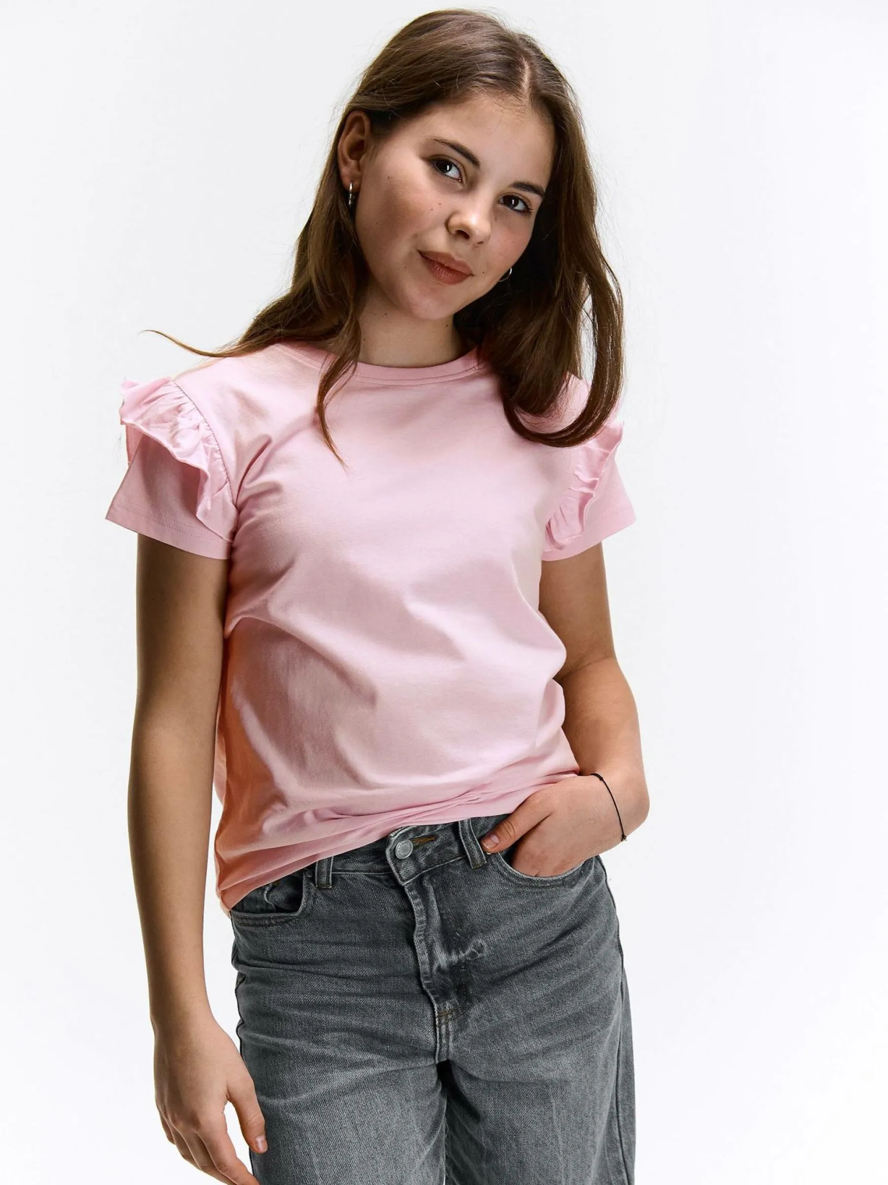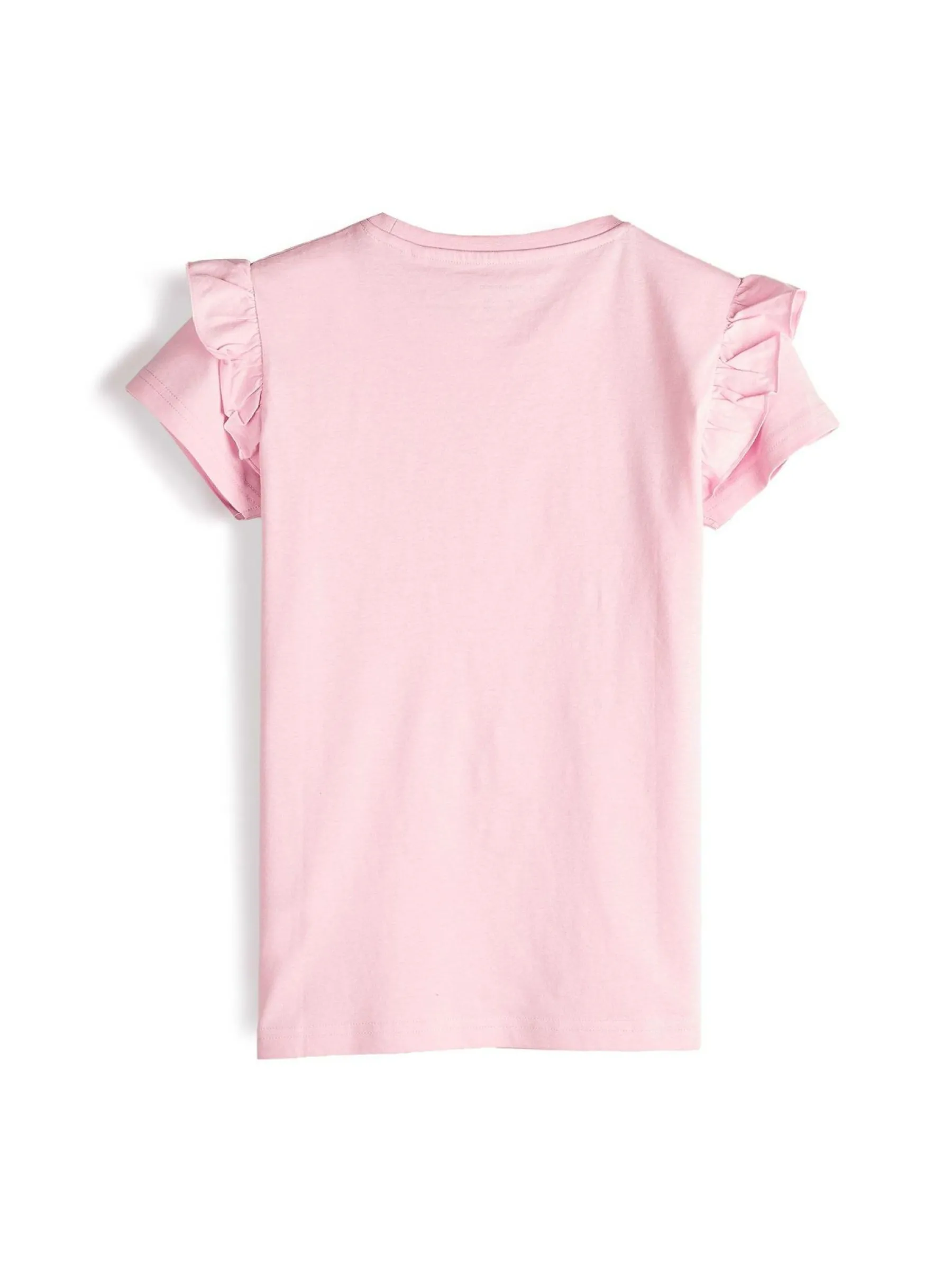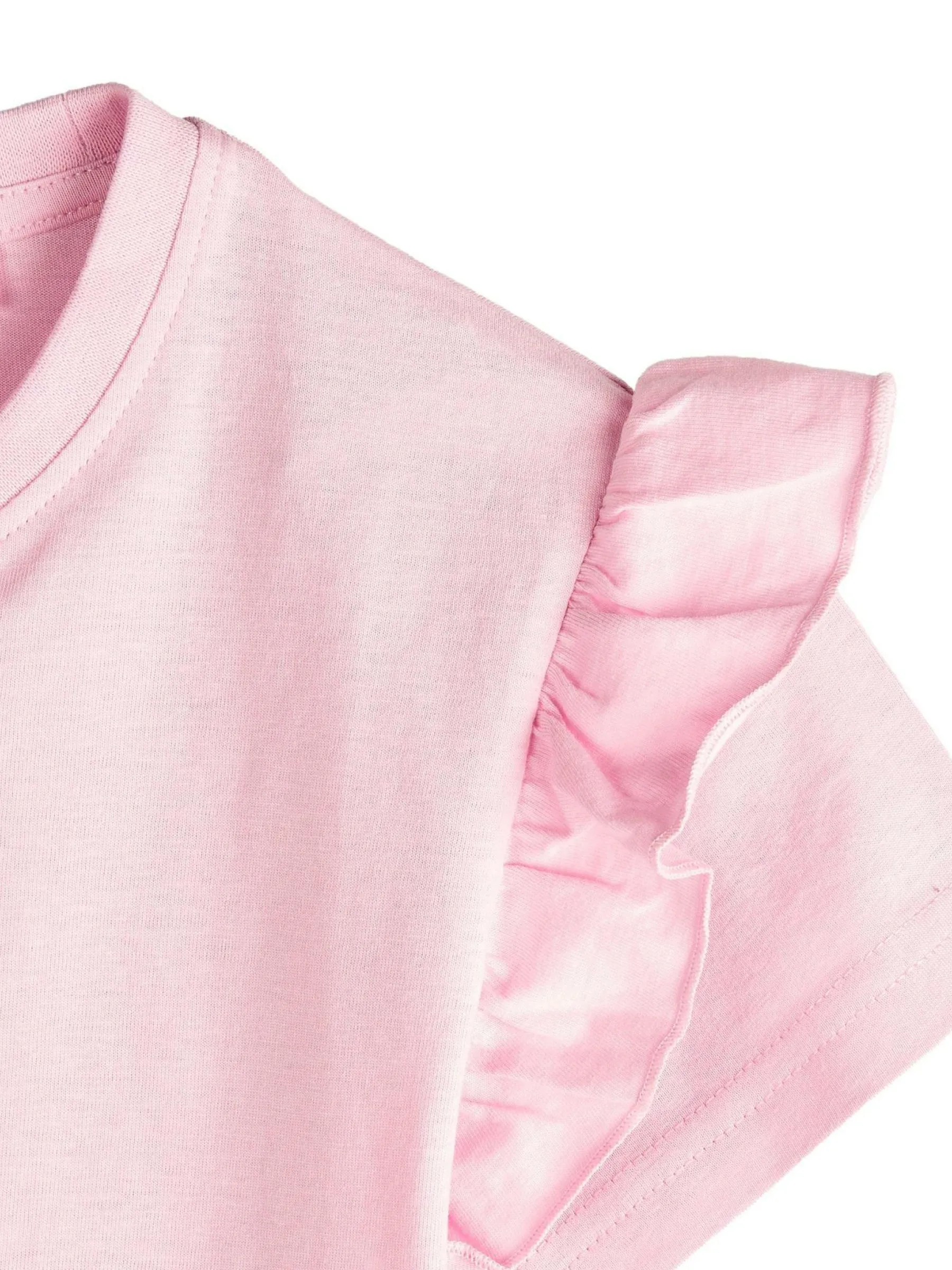 Kolor: różowyKrój: z falbanąTyp: koszulkaRekaw: krótki rękawDługość: krótkiPattern style: pojedynczy kolorDeta…