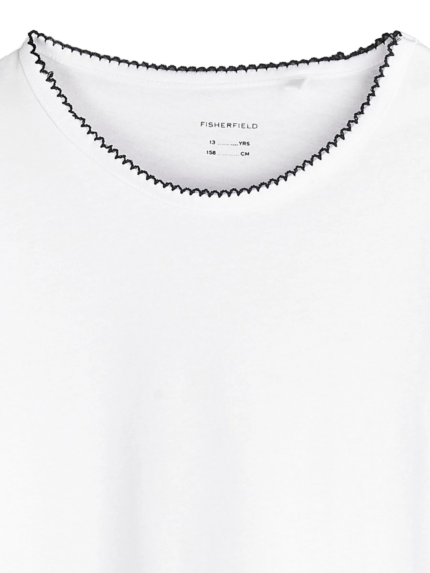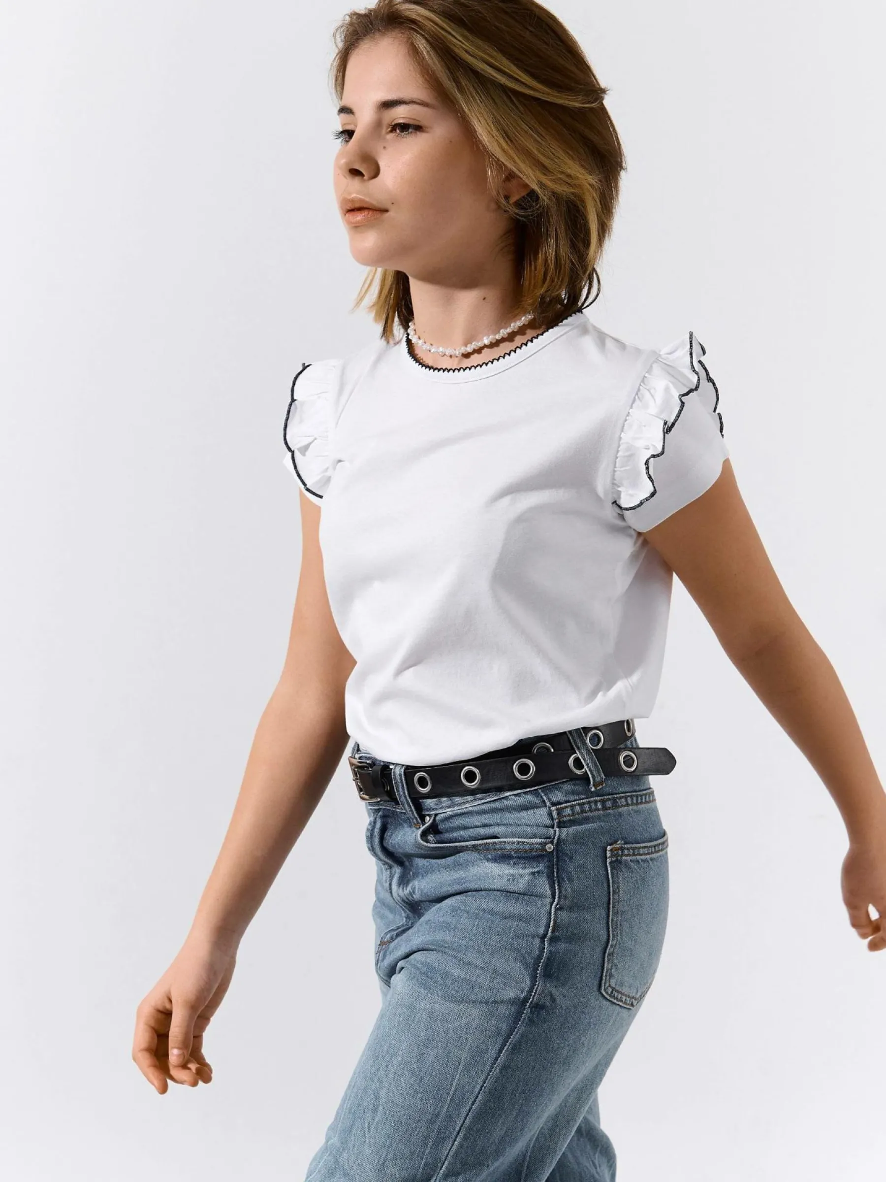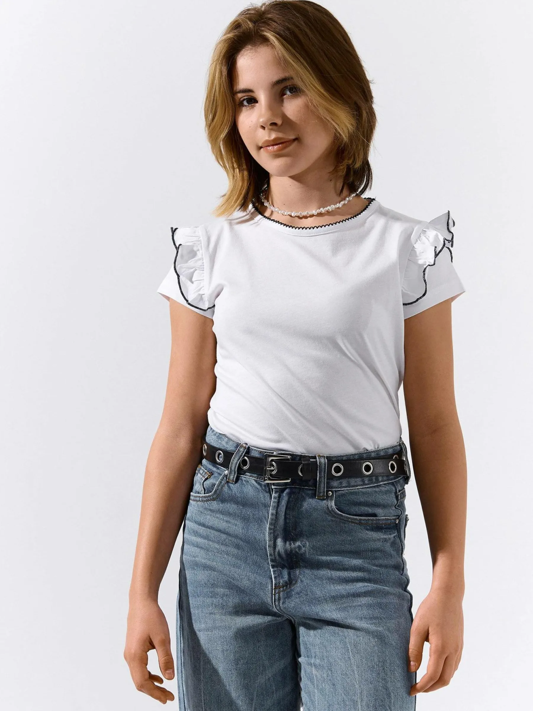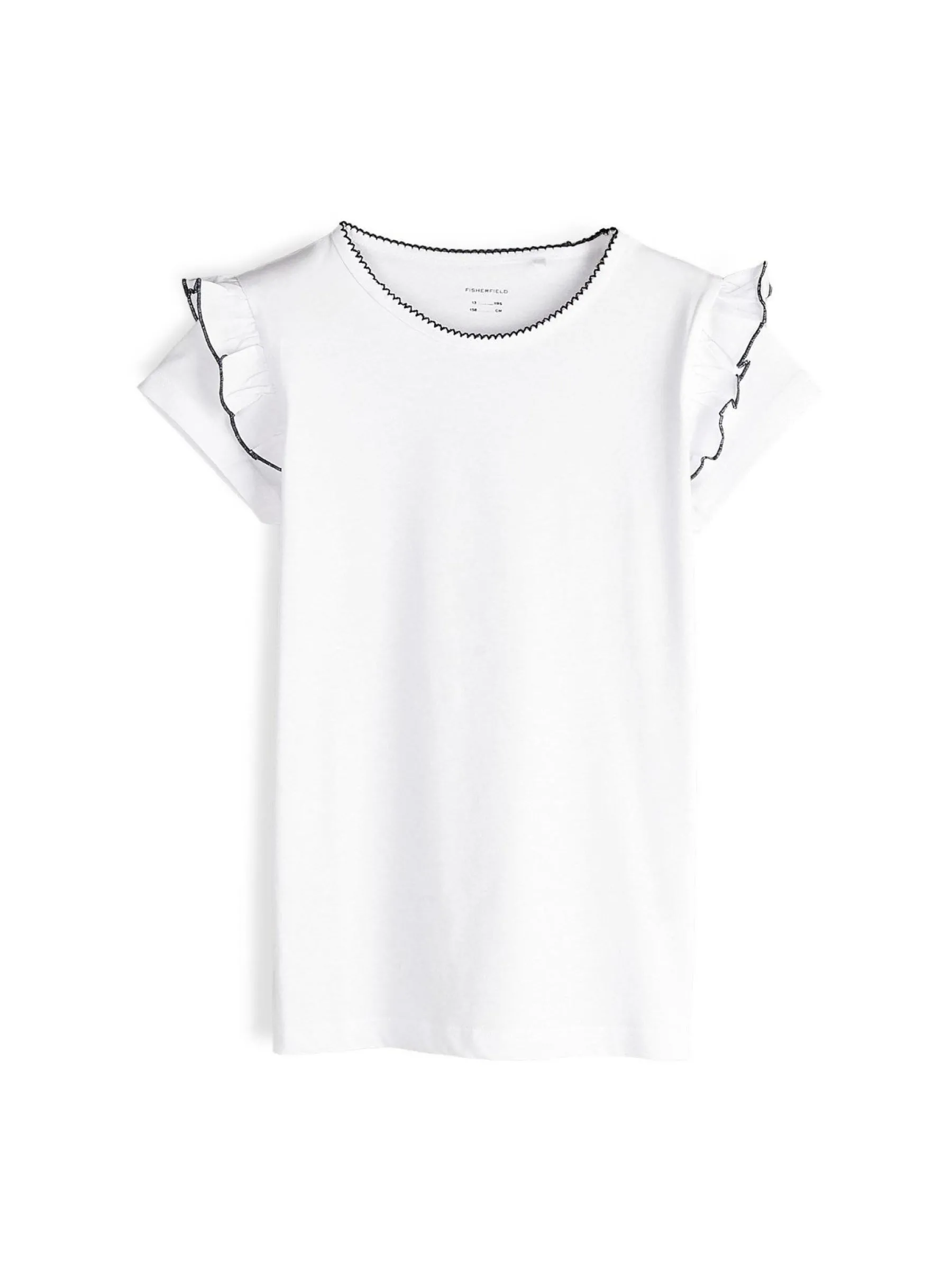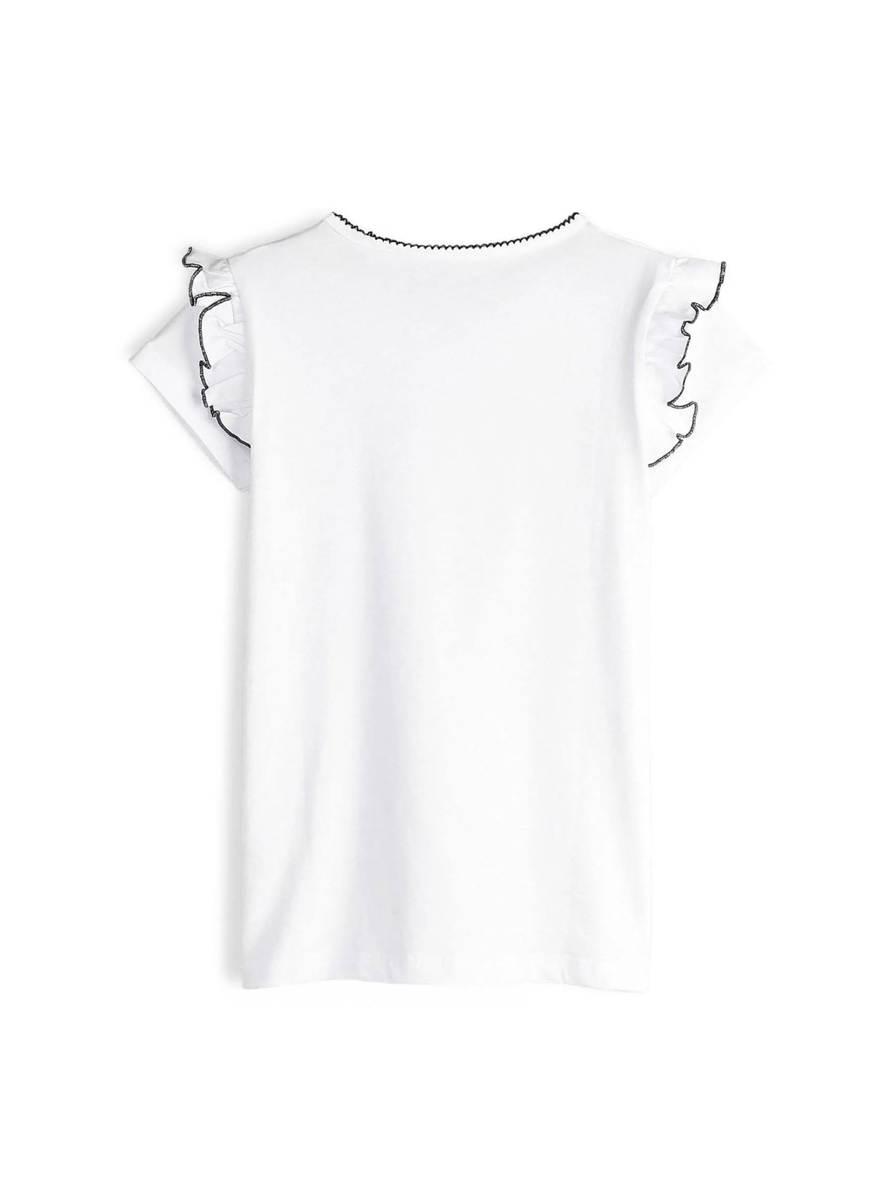 Kolor: białyKrój: z falbanąTyp: koszulkaRekaw: krótki rękawDługość: krótkiPattern style: pojedynczy kolorDetal:…