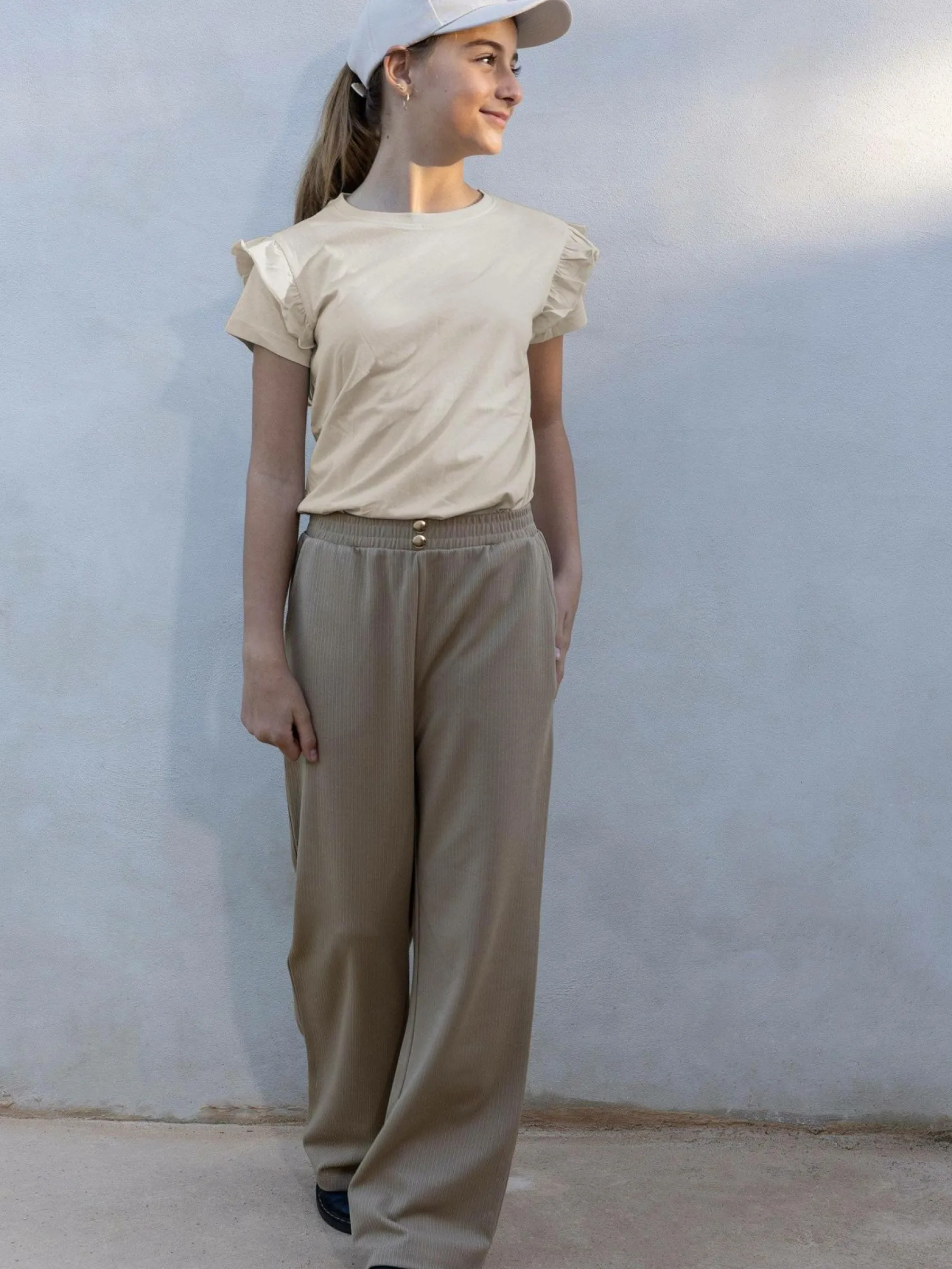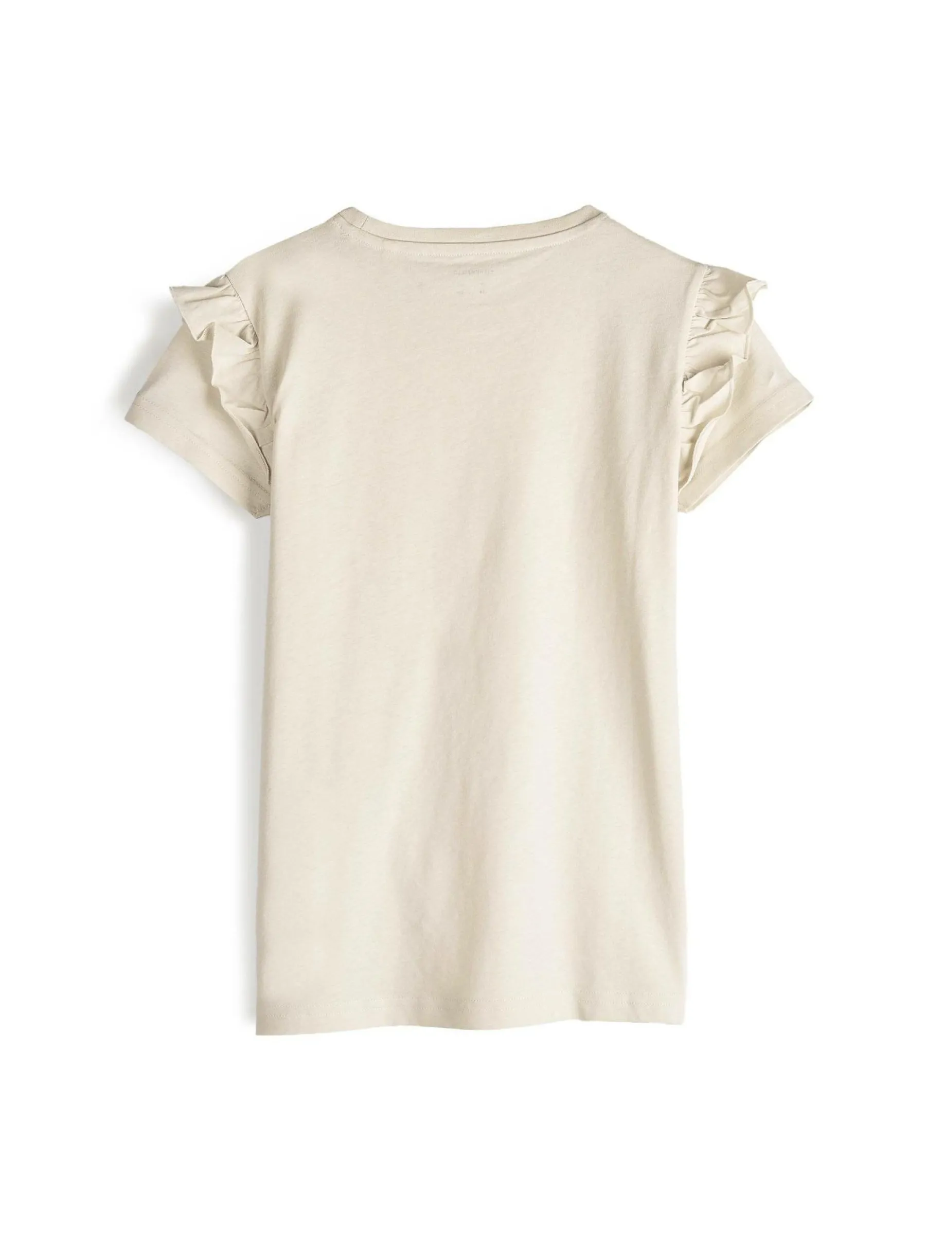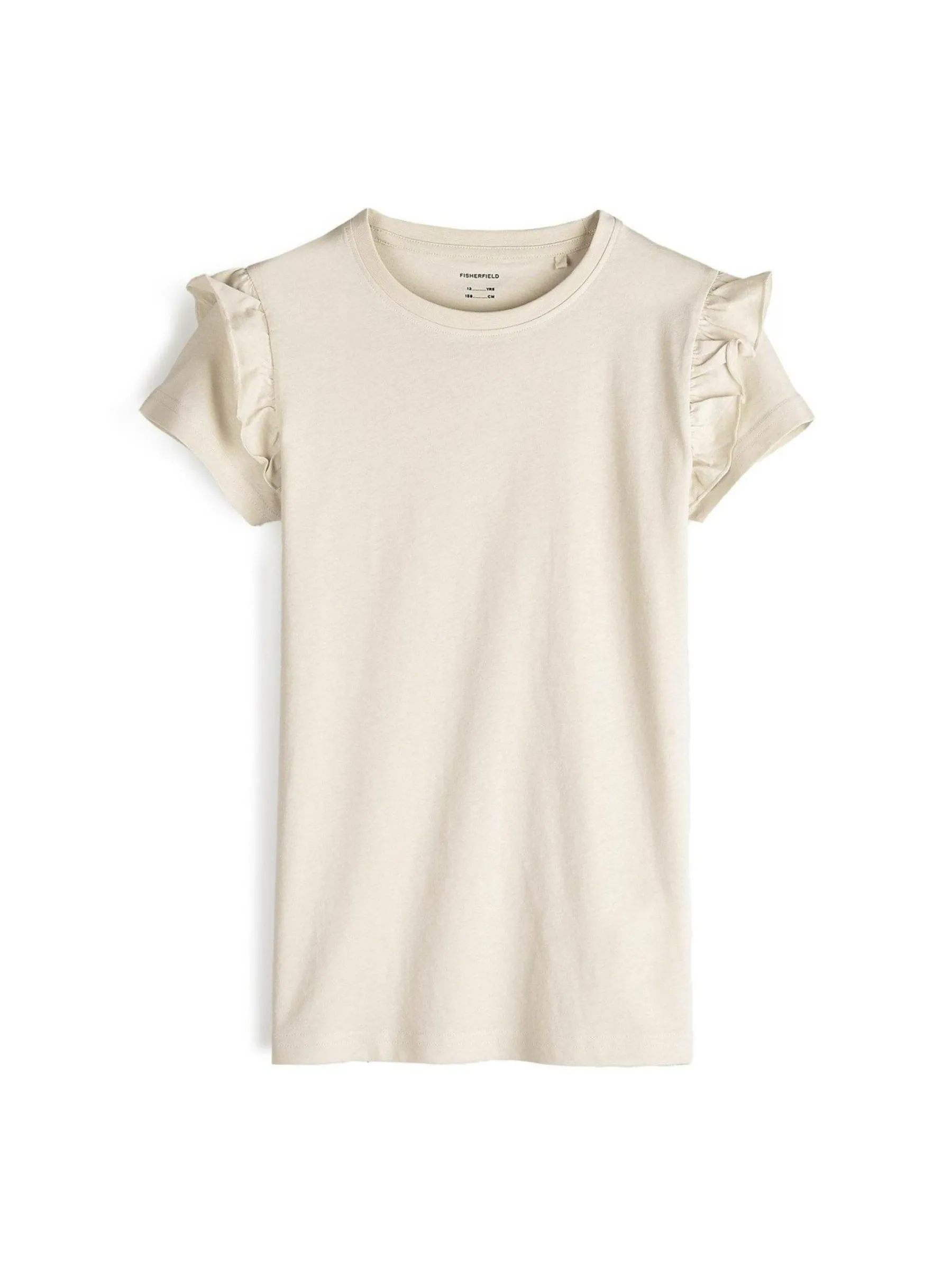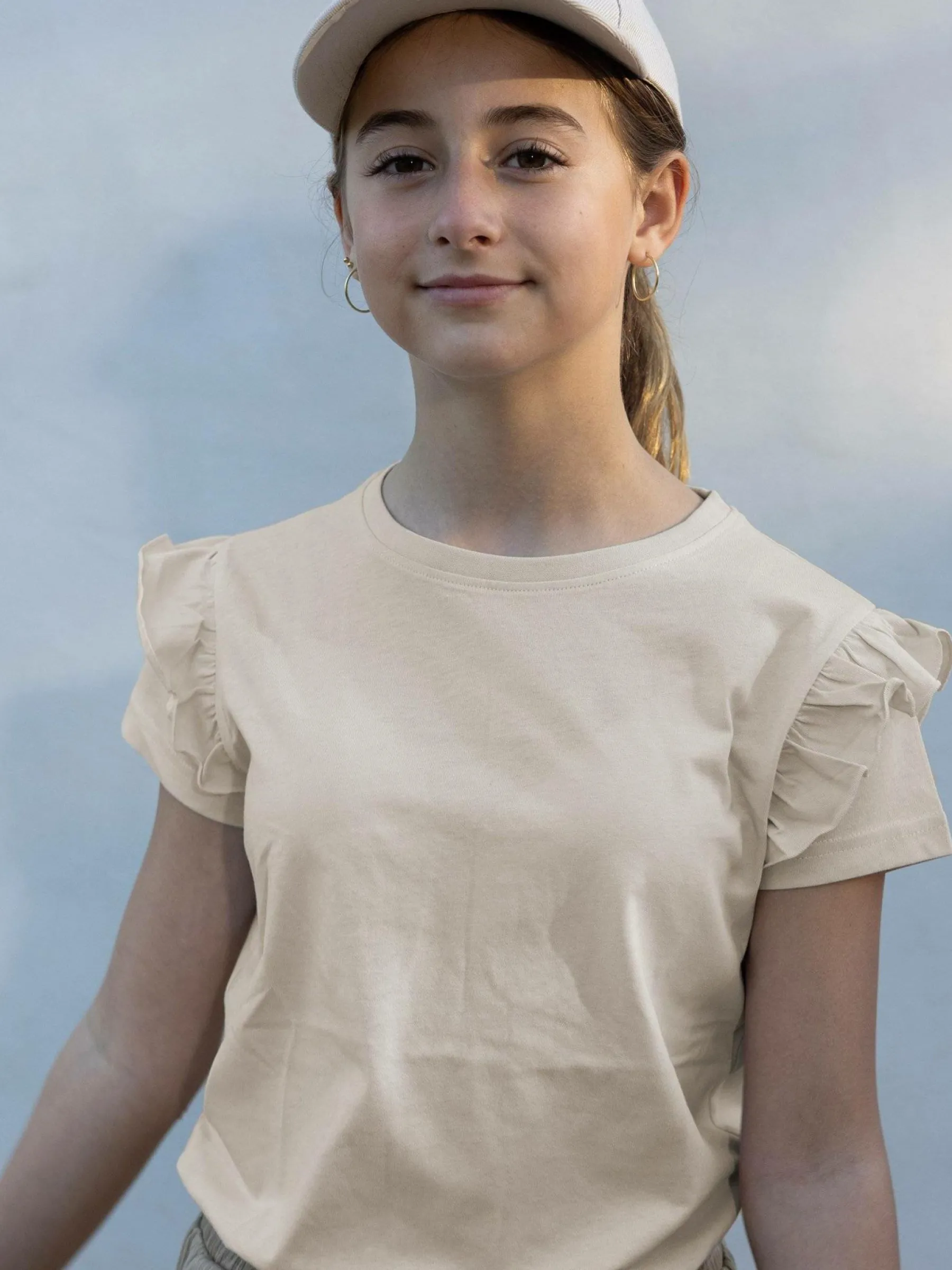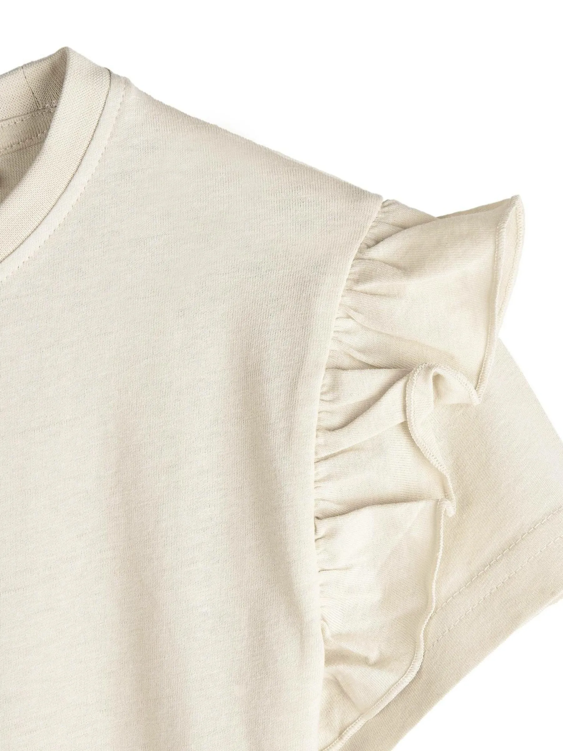 Kolor: beżowyKrój: z falbanąTyp: koszulkaRekaw: krótki rękawDługość: krótkiPattern style: pojedynczy kolorDetal…