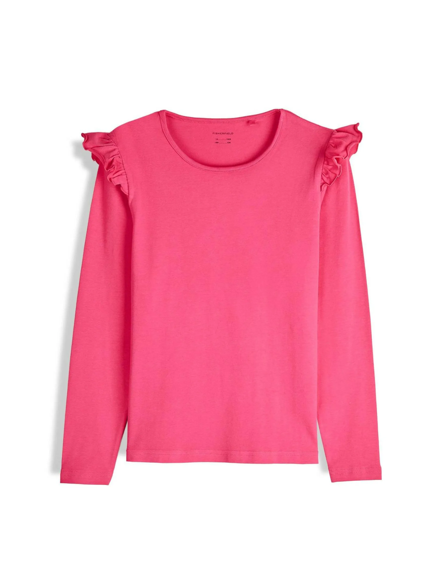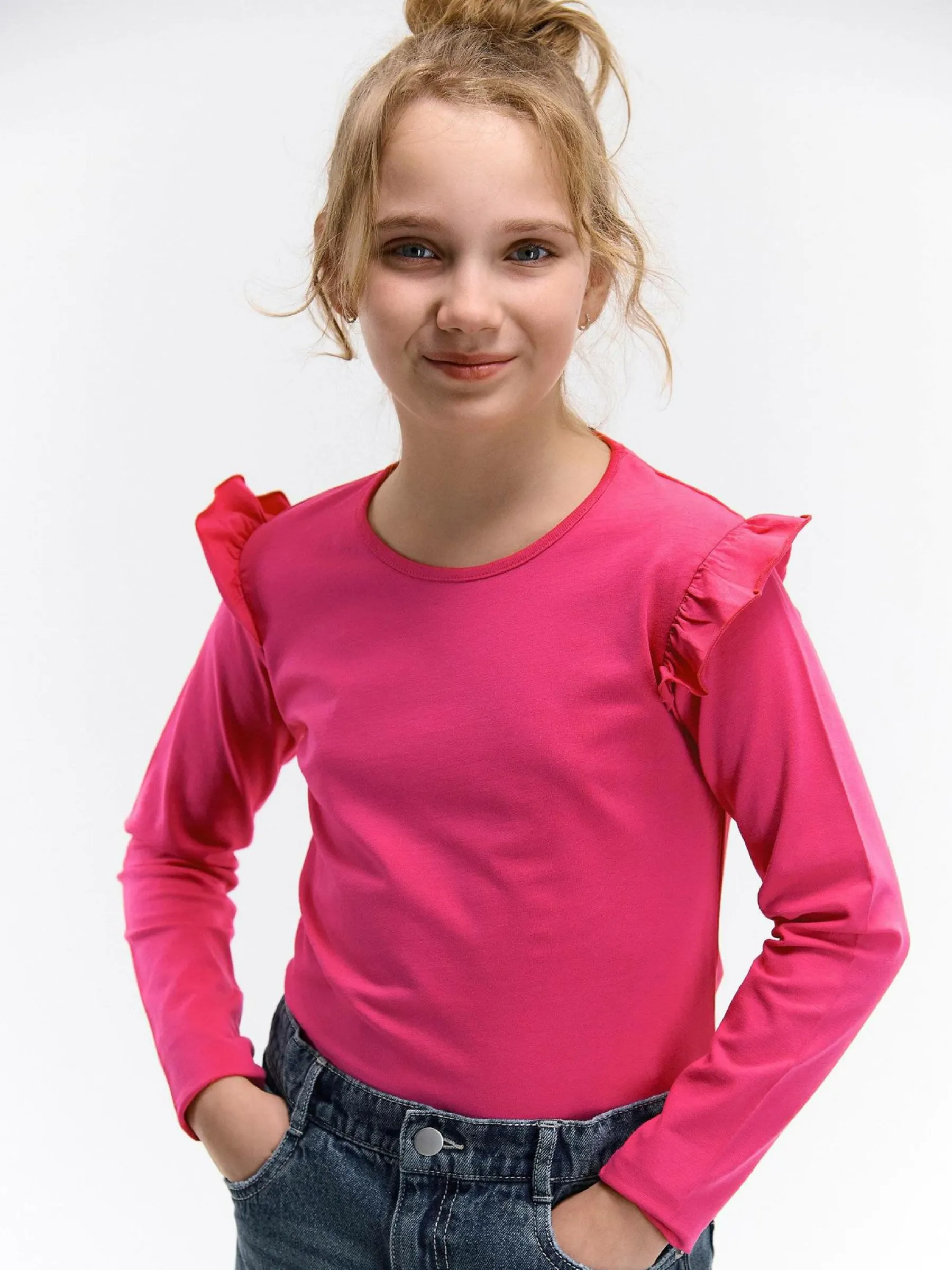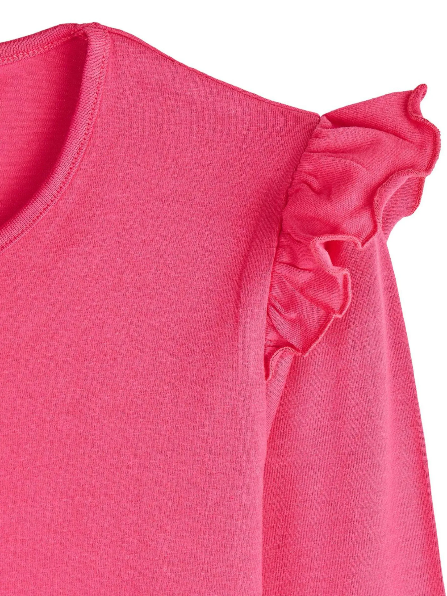 Kolor: różowyKrój: z falbanąTyp: koszulkaRekaw: długi rękawDługość: krótkiPattern style: pojedynczy kolorDetal…
