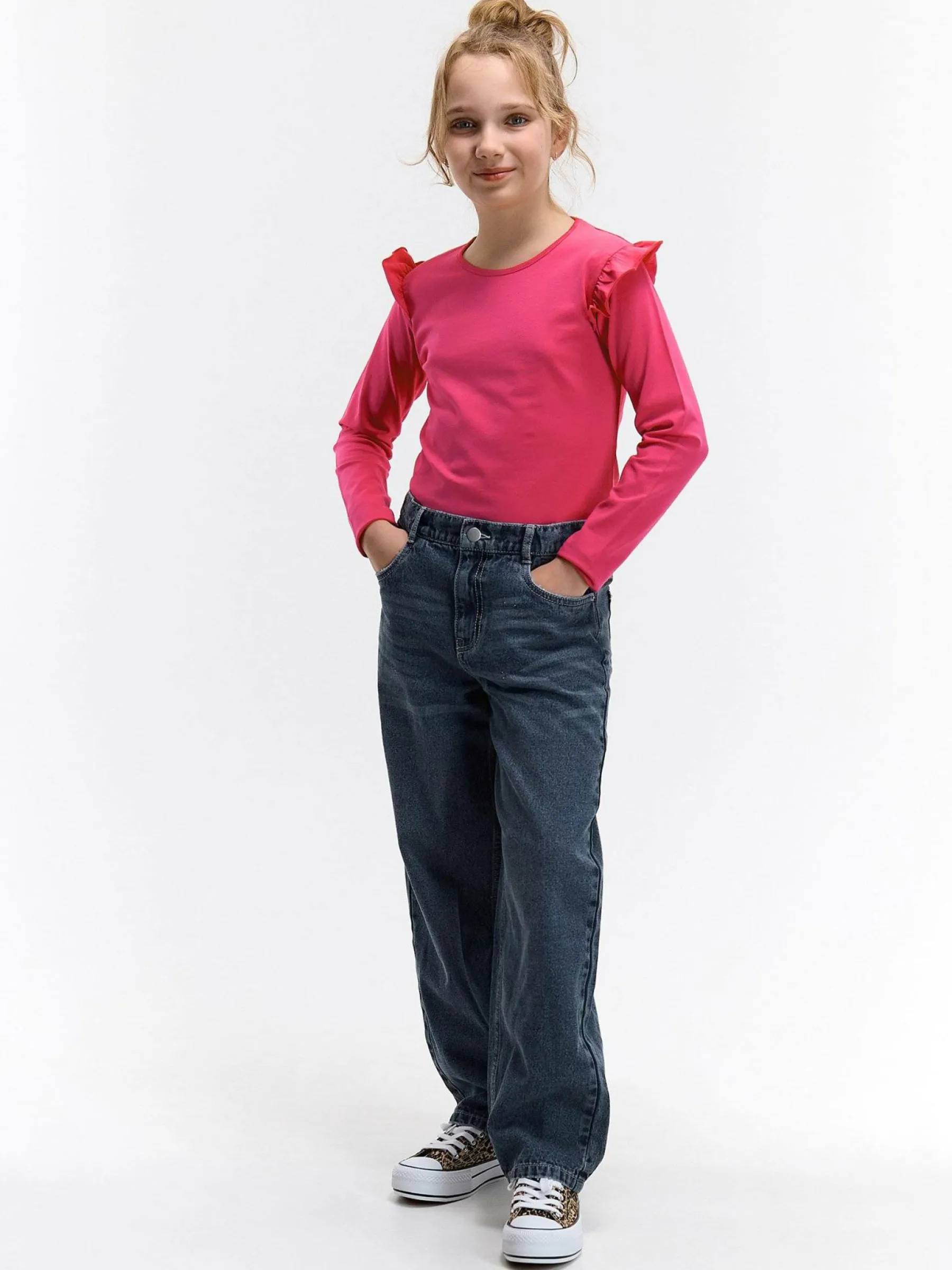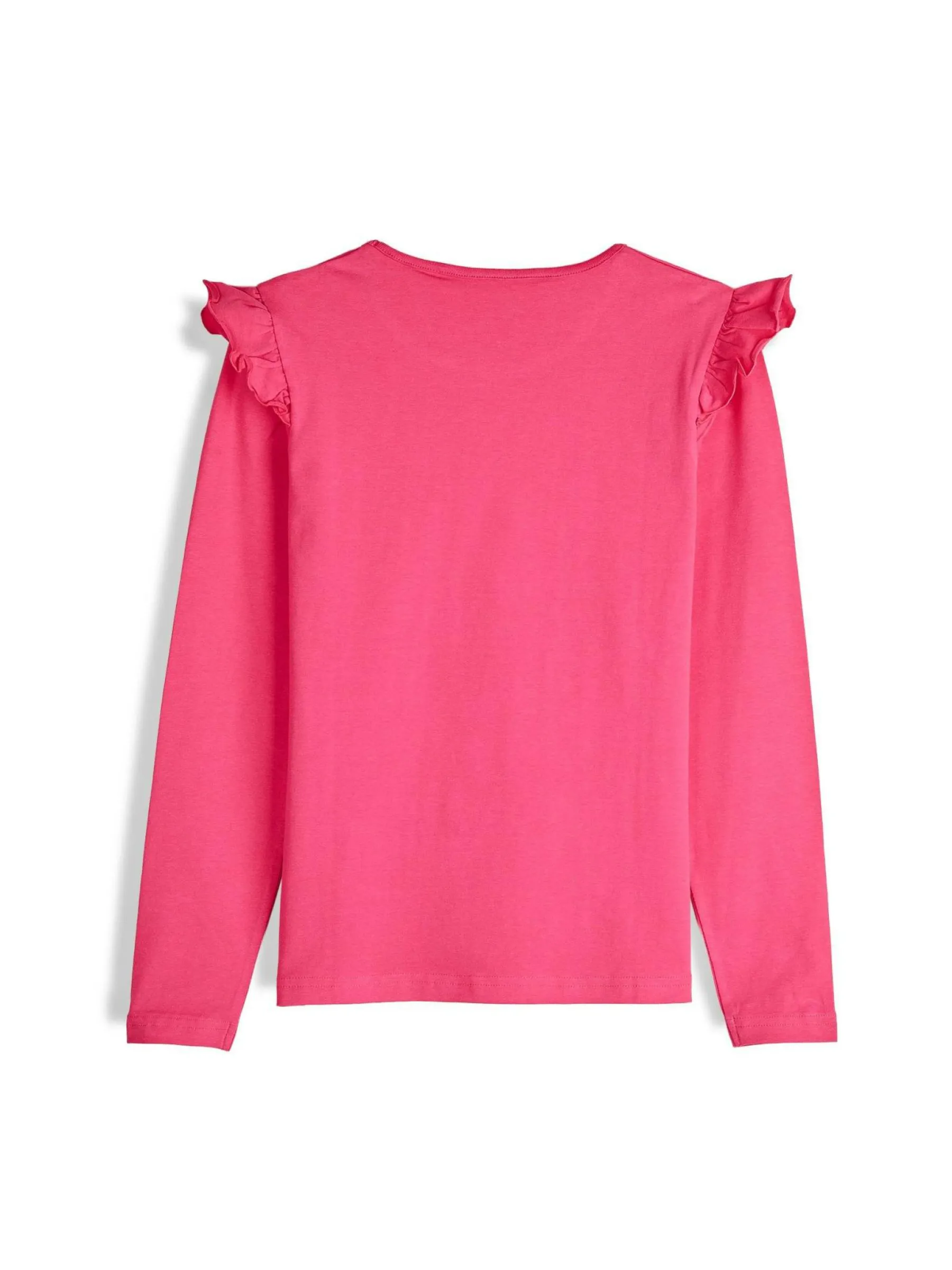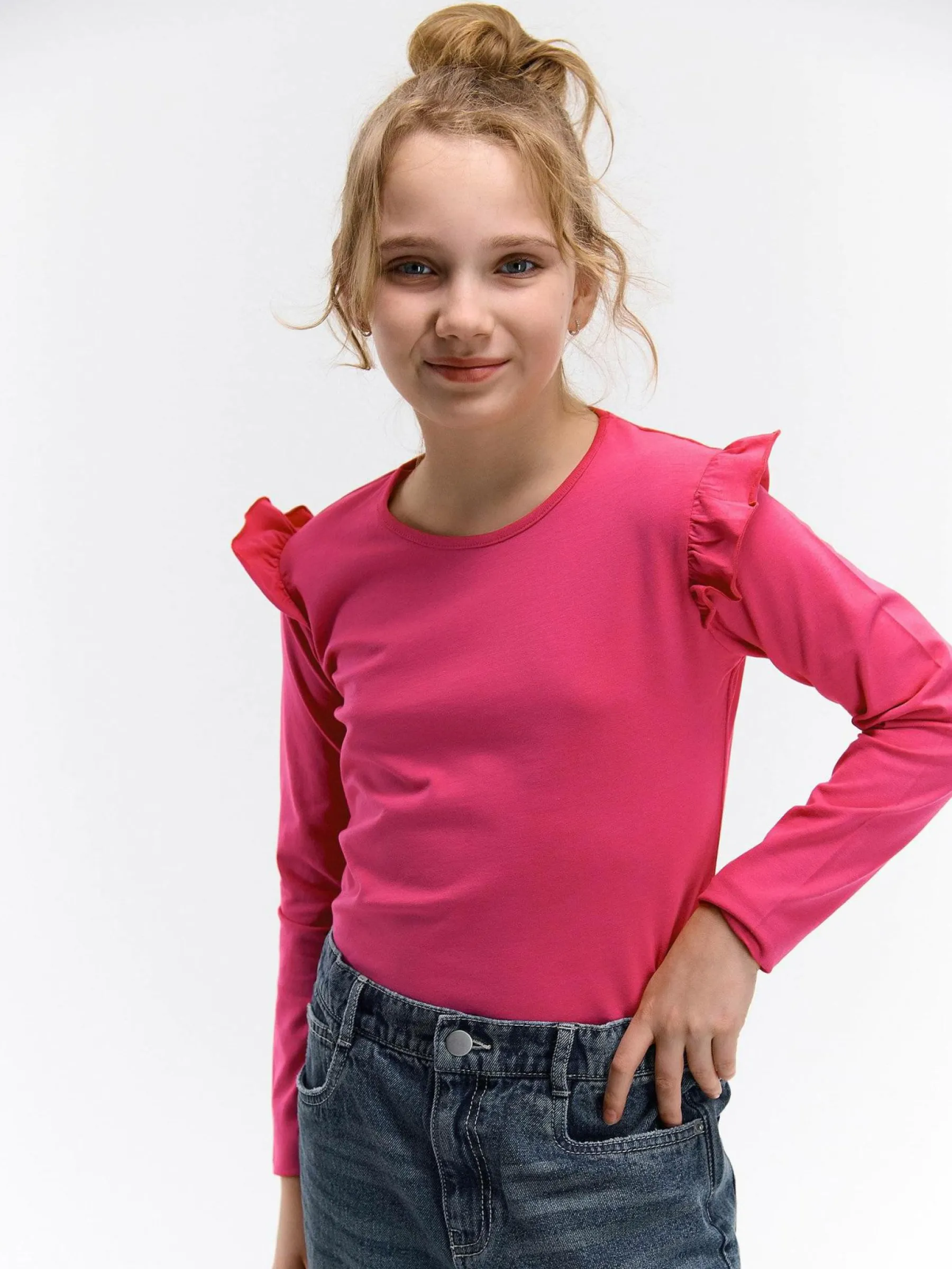 Kolor: różowyKrój: z falbanąTyp: koszulkaRekaw: długi rękawDługość: krótkiPattern style: pojedynczy kolorDetal…