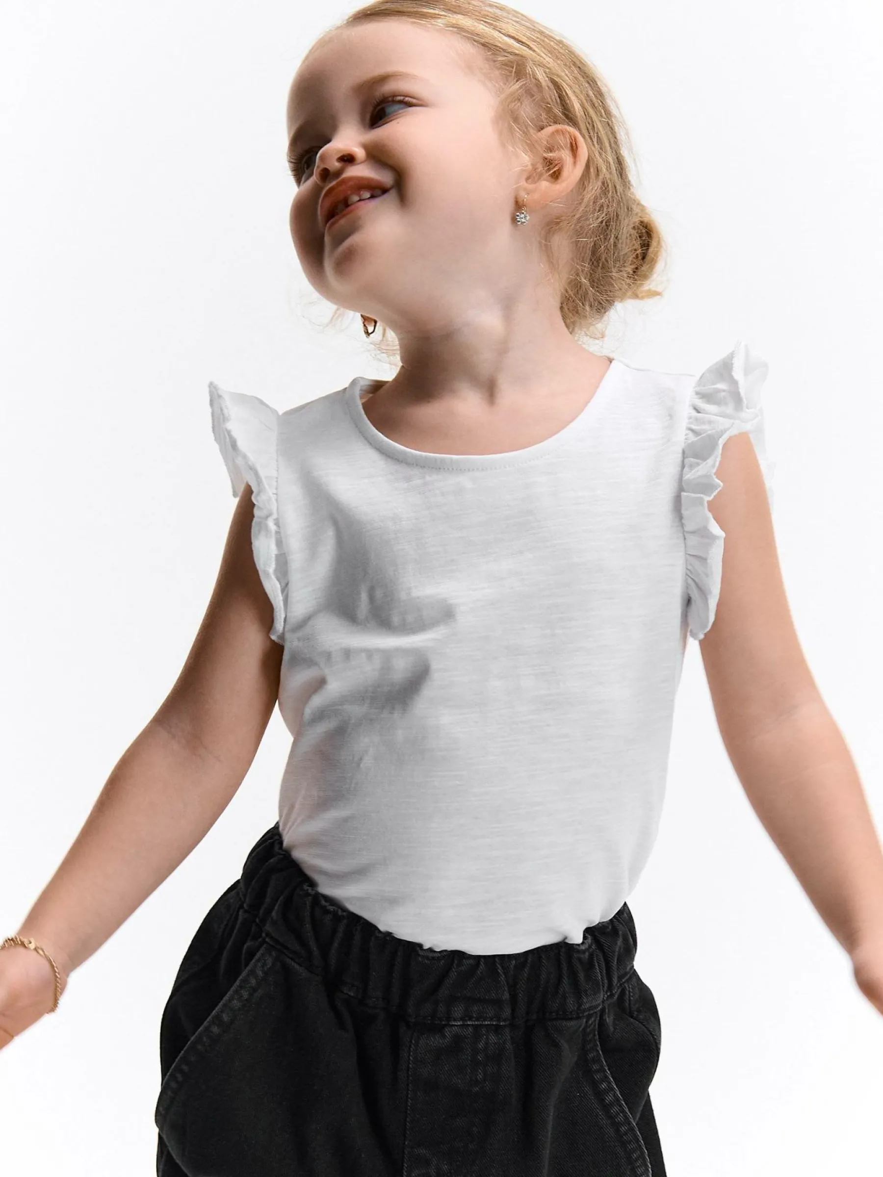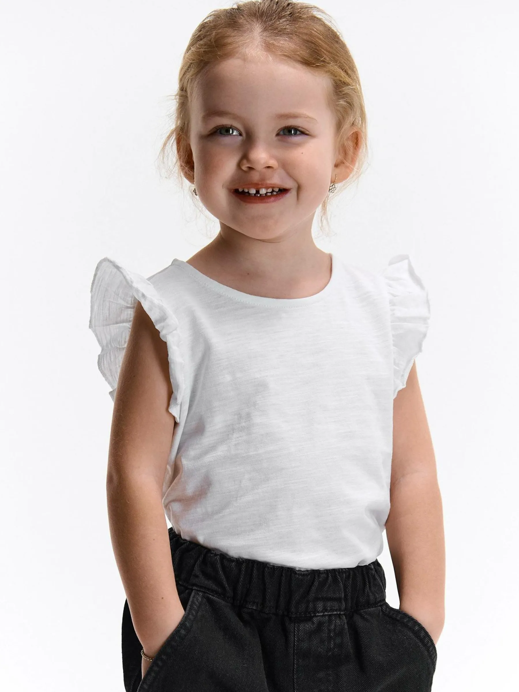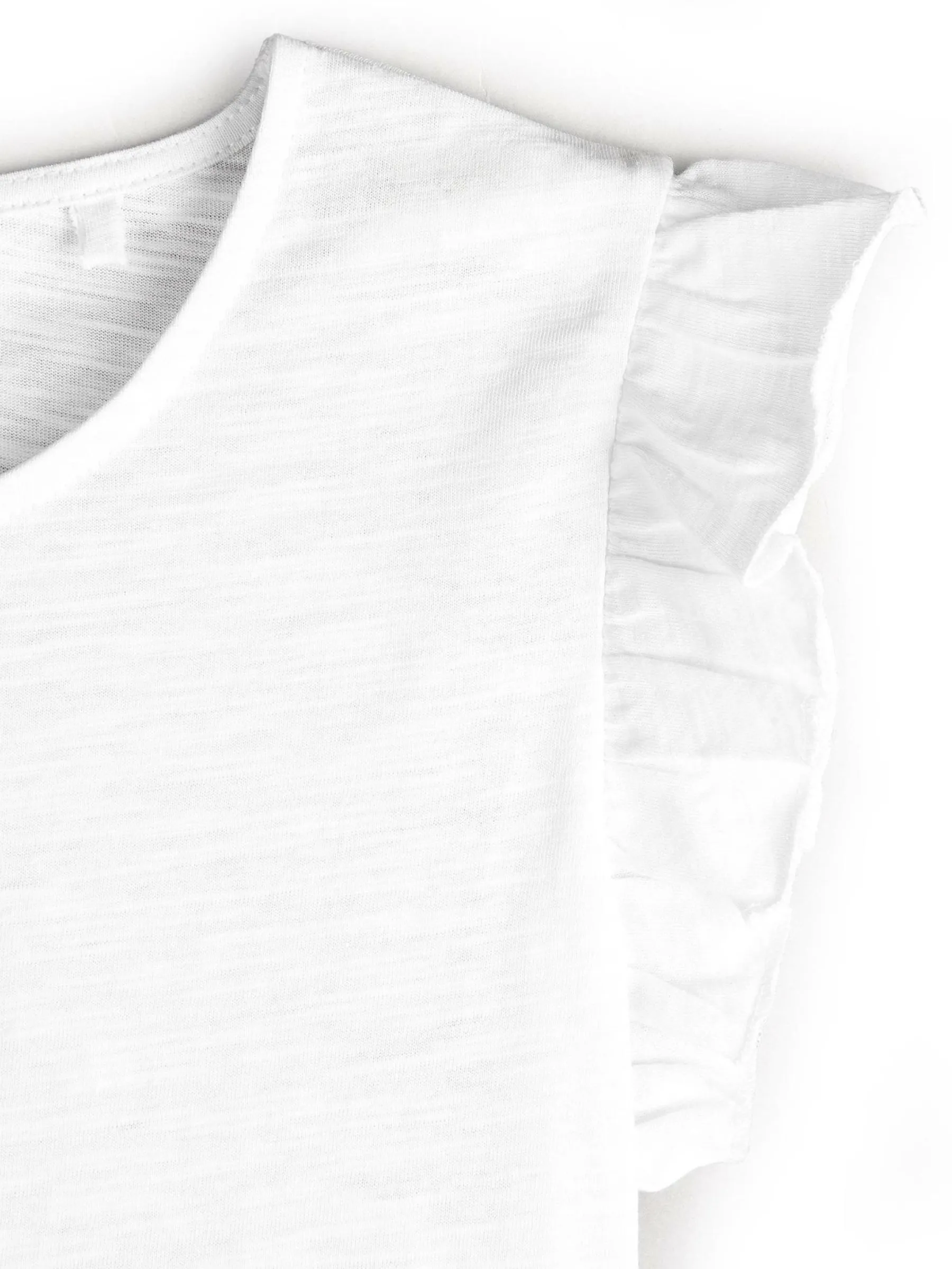 Kolor: białyKrój: z falbanąTyp: koszulkaRekaw: krótki rękawDługość: krótkiPattern style: pojedynczy kolorDetal:…