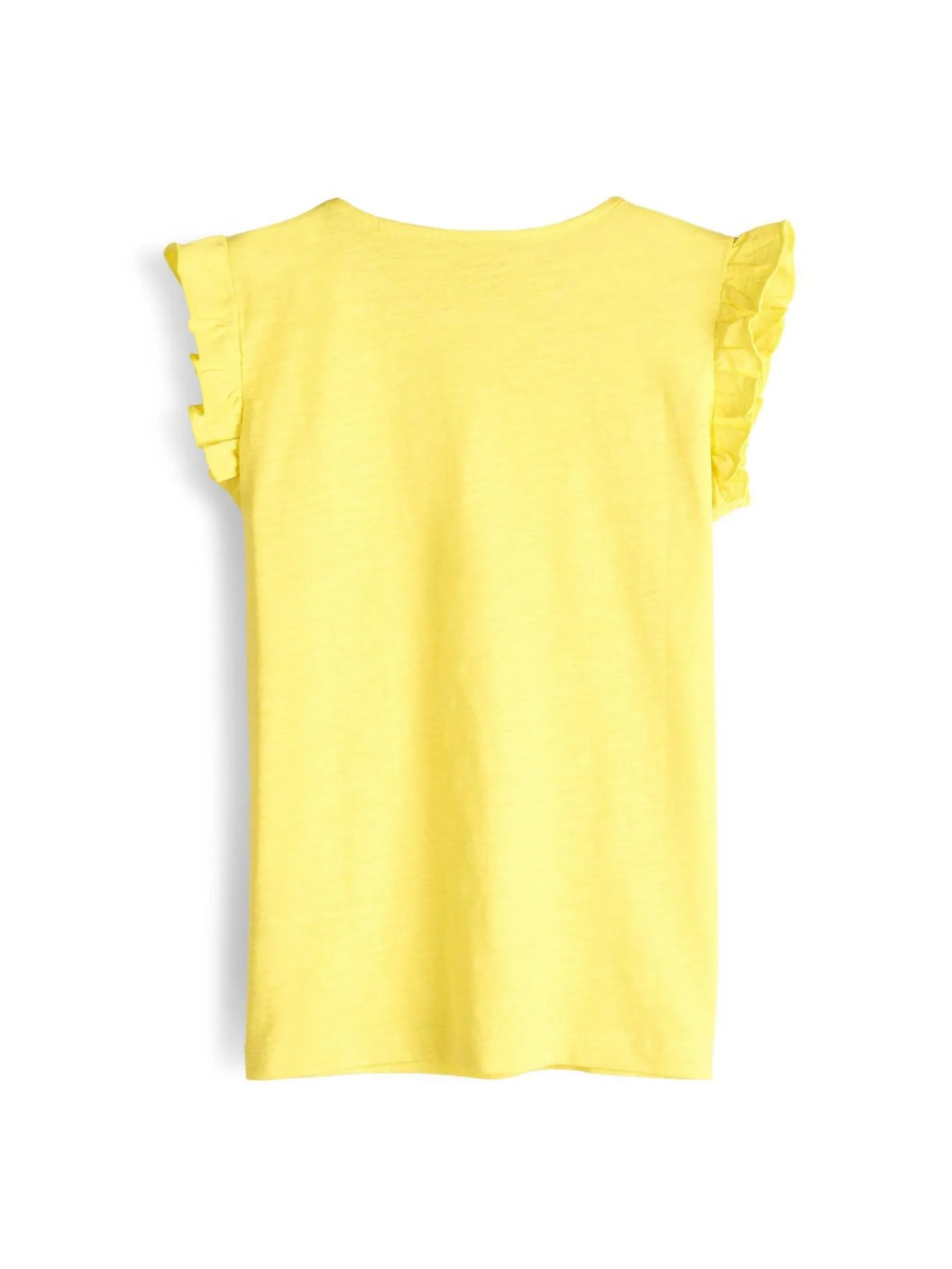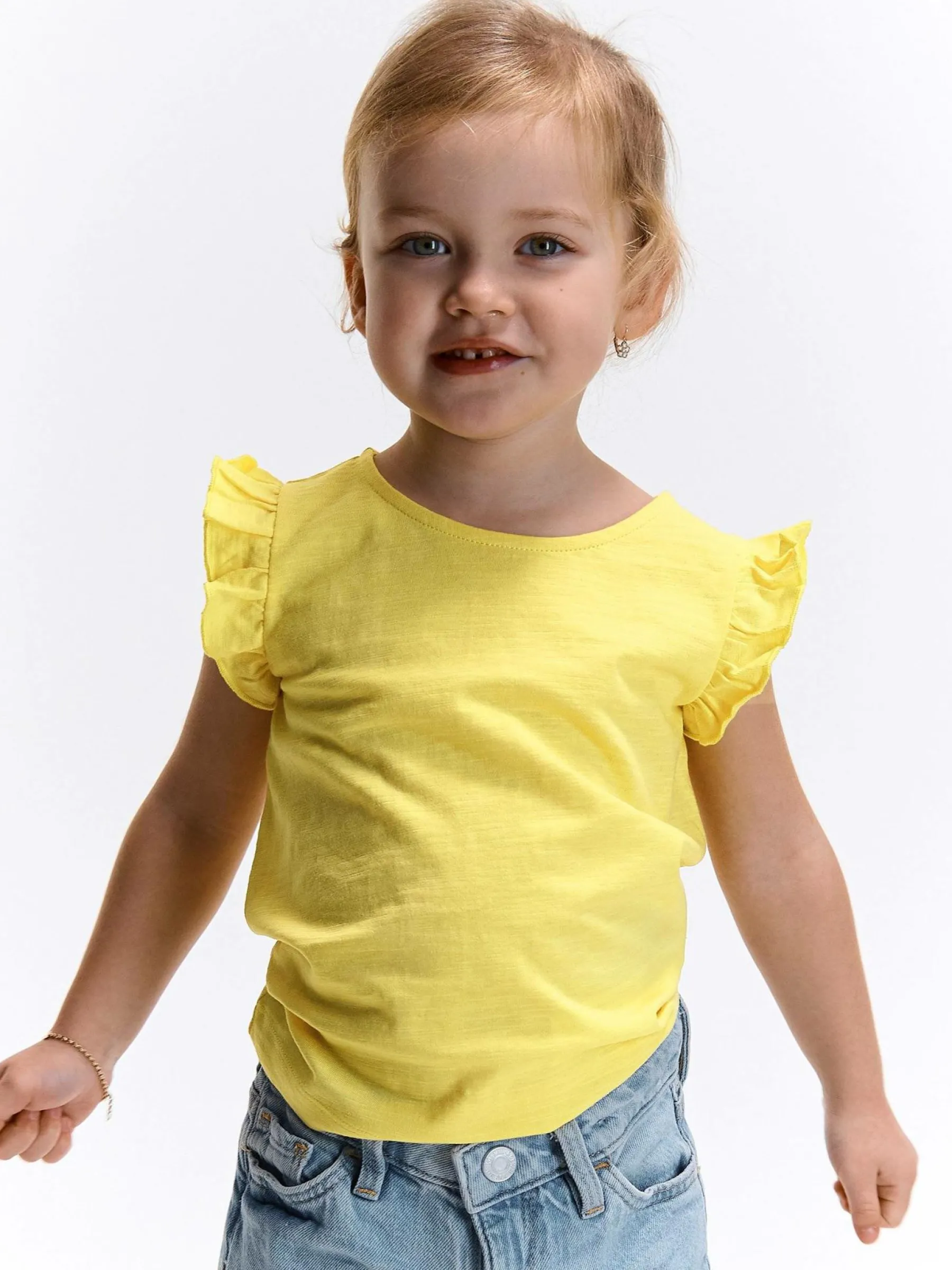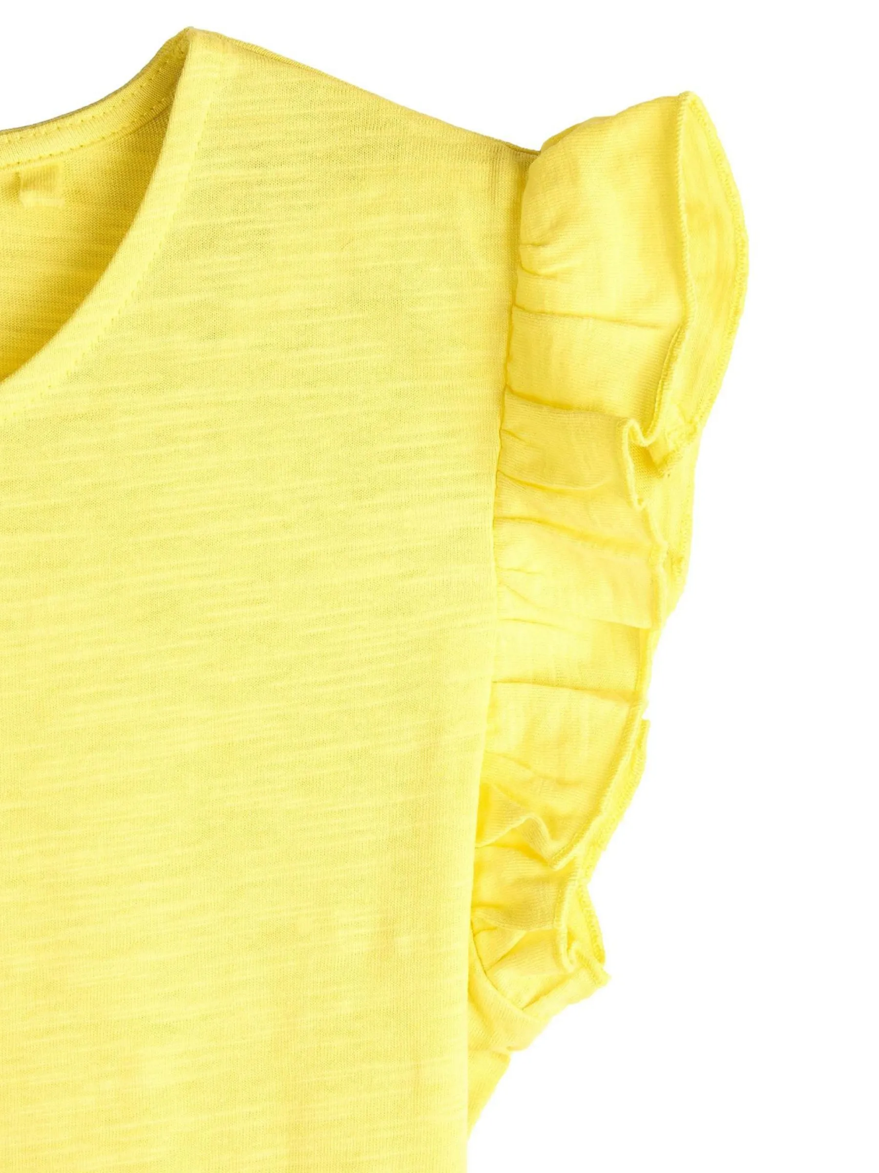 Kolor: żółtyKrój: z falbanąTyp: koszulkaRekaw: krótki rękawDługość: krótkiPattern style: pojedynczy kolorDeta…