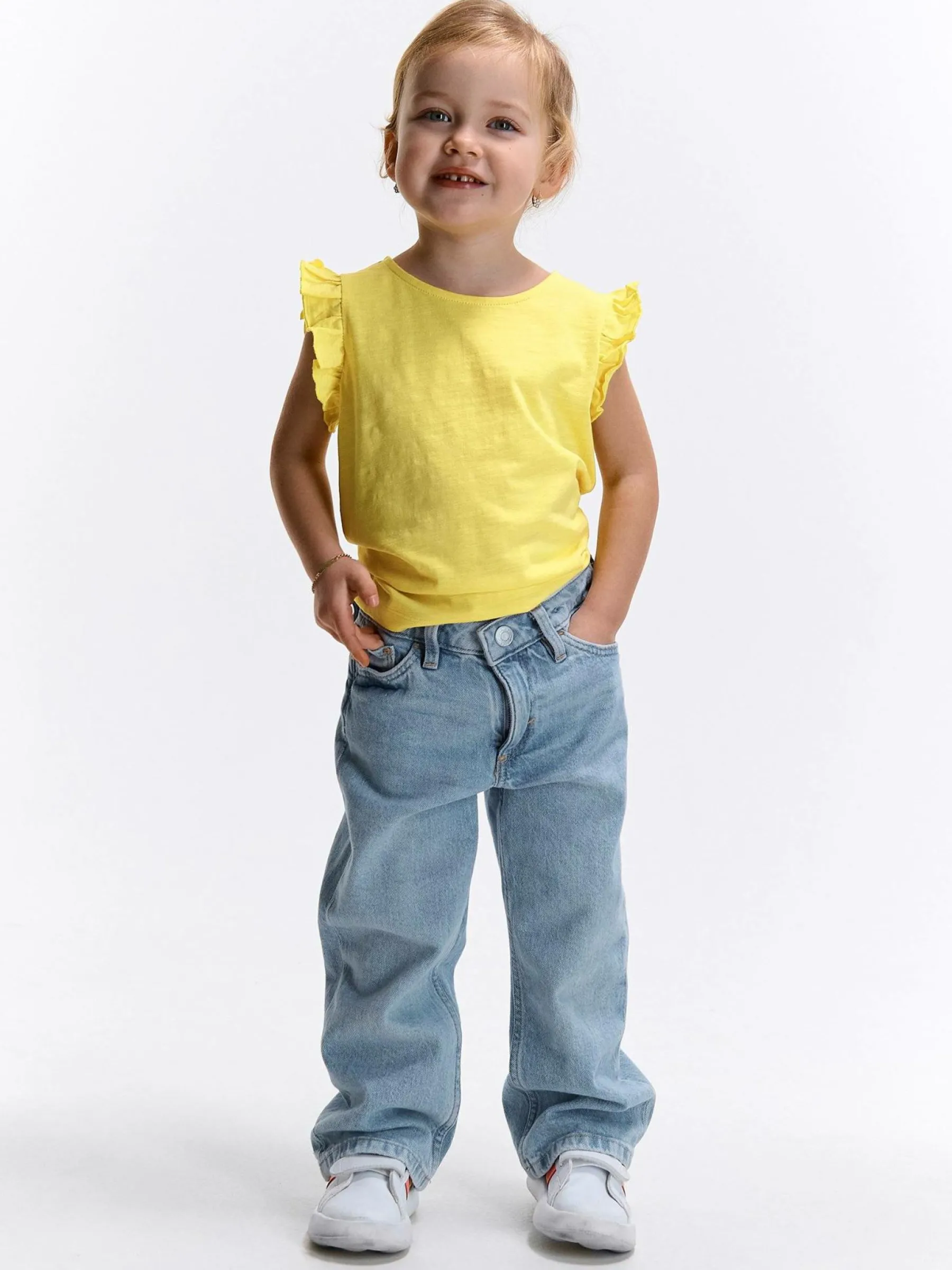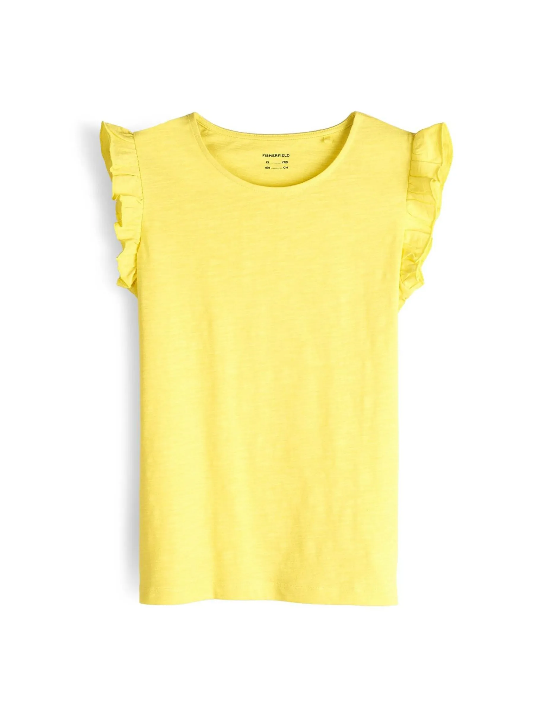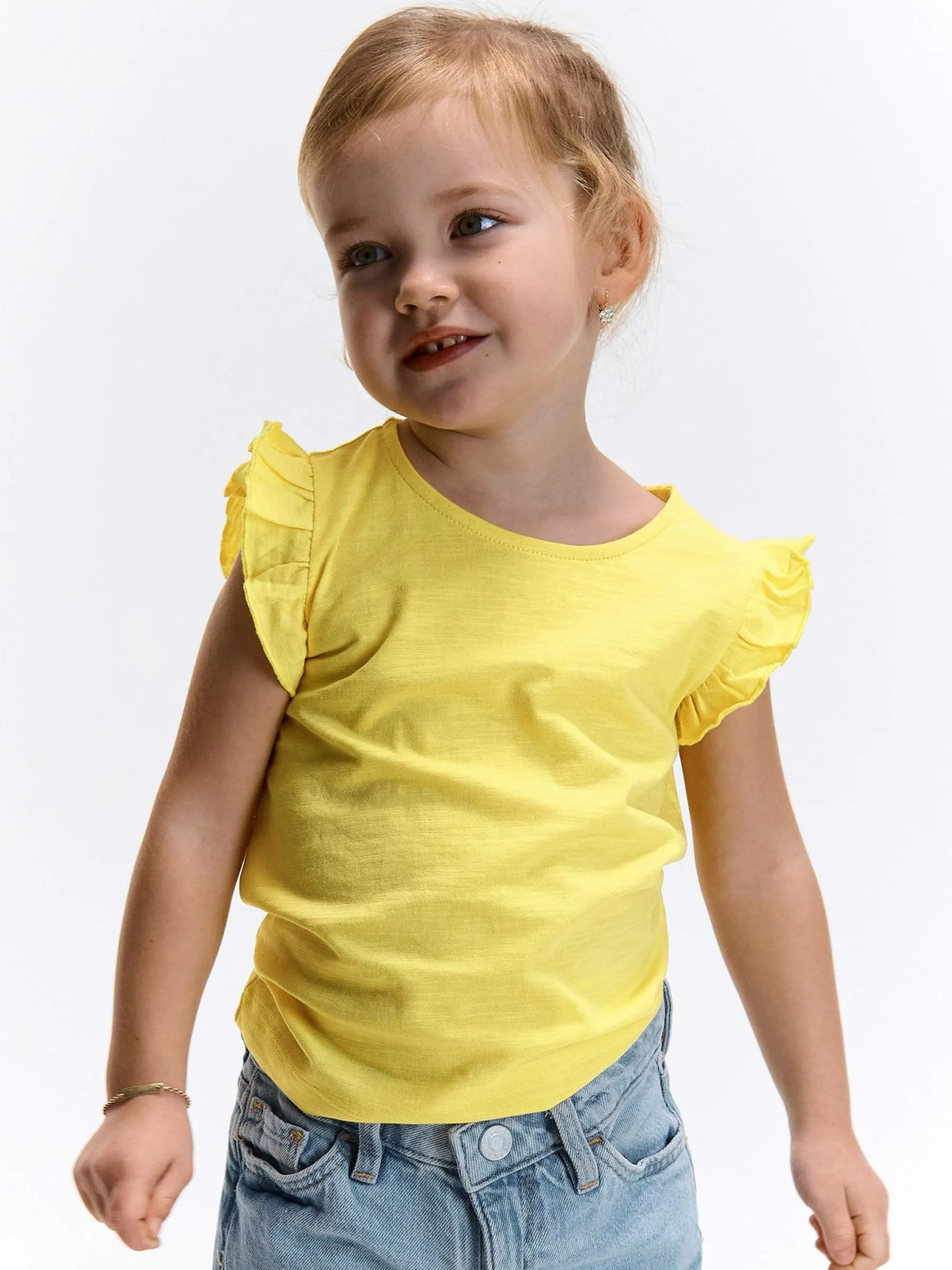 Kolor: żółtyKrój: z falbanąTyp: koszulkaRekaw: krótki rękawDługość: krótkiPattern style: pojedynczy kolorDeta…