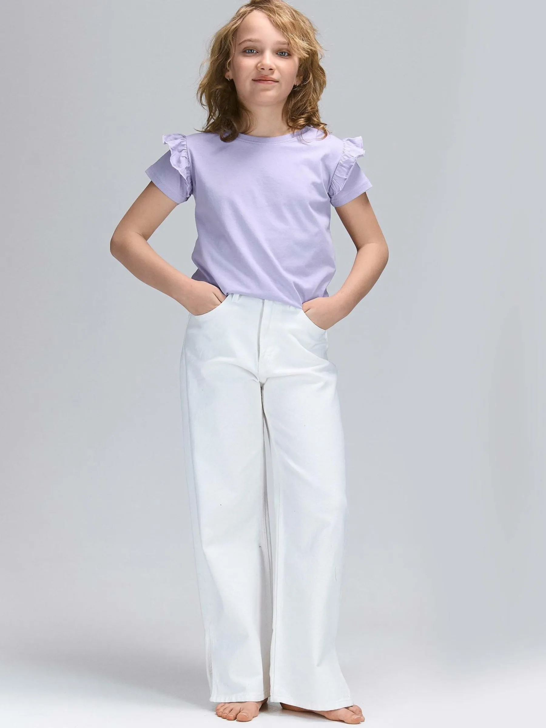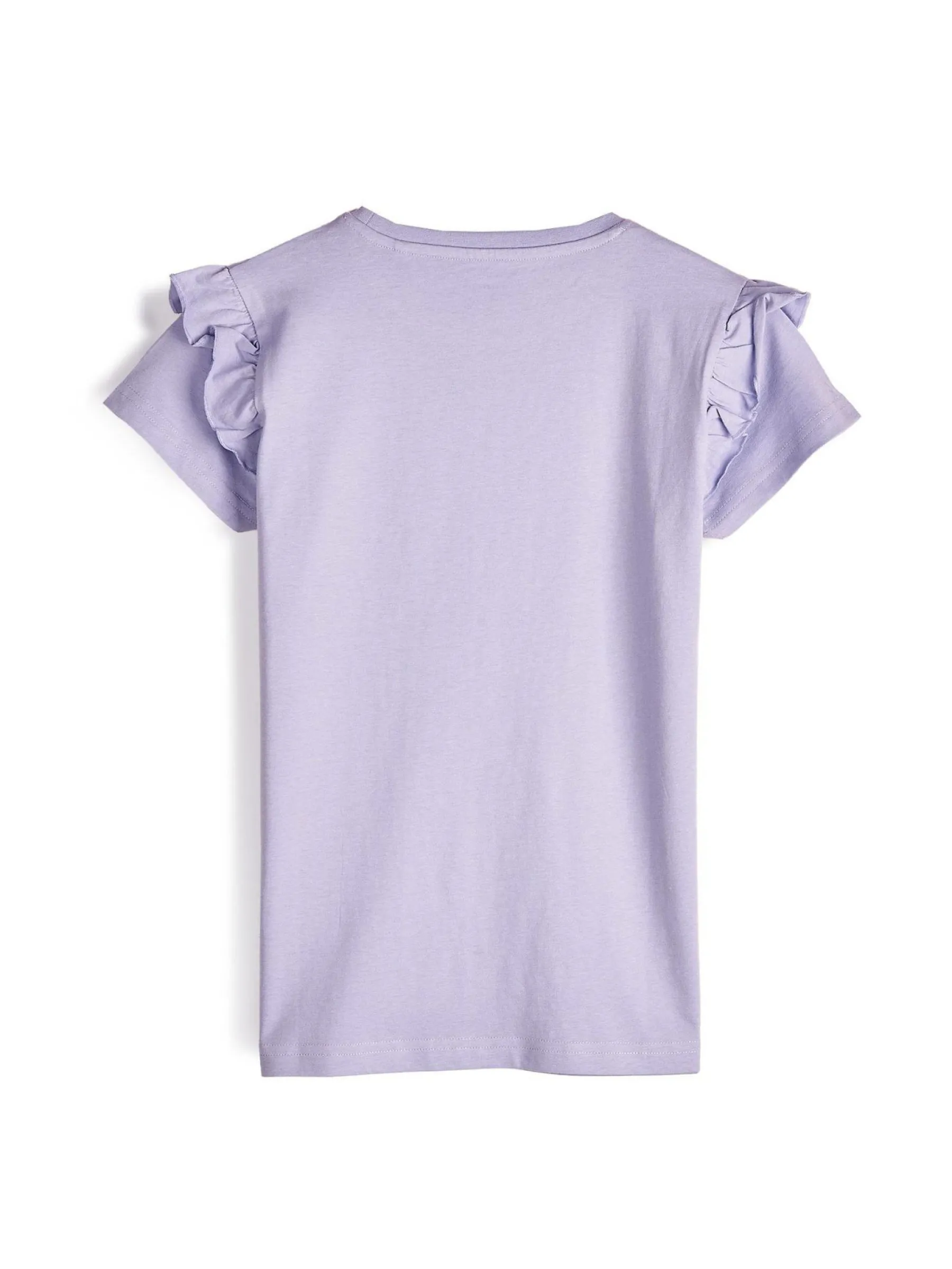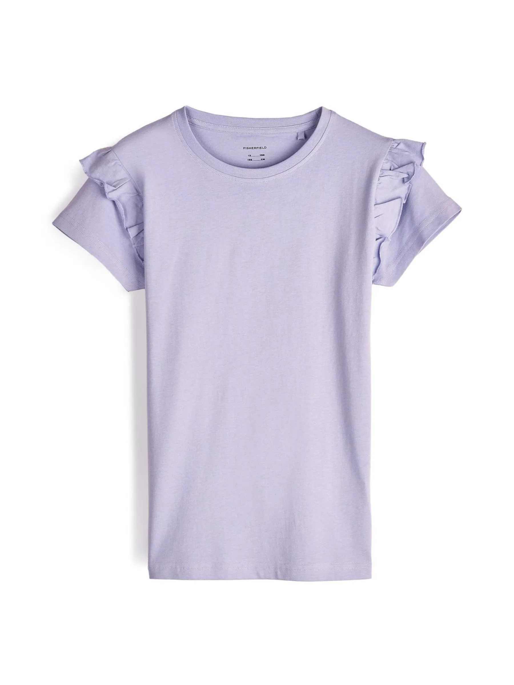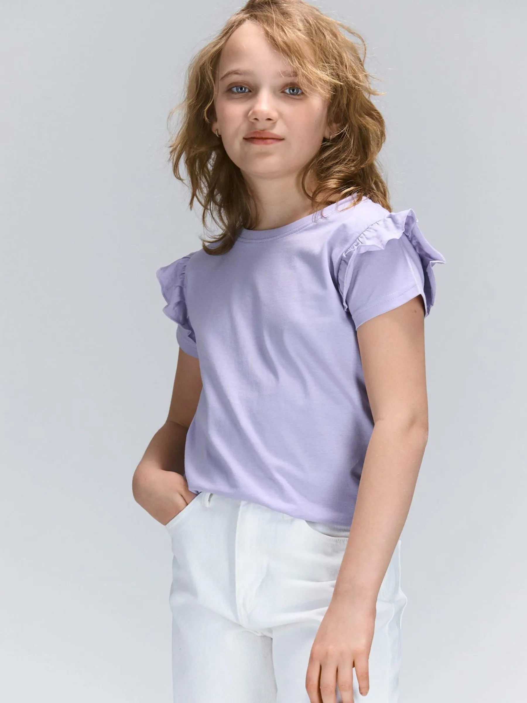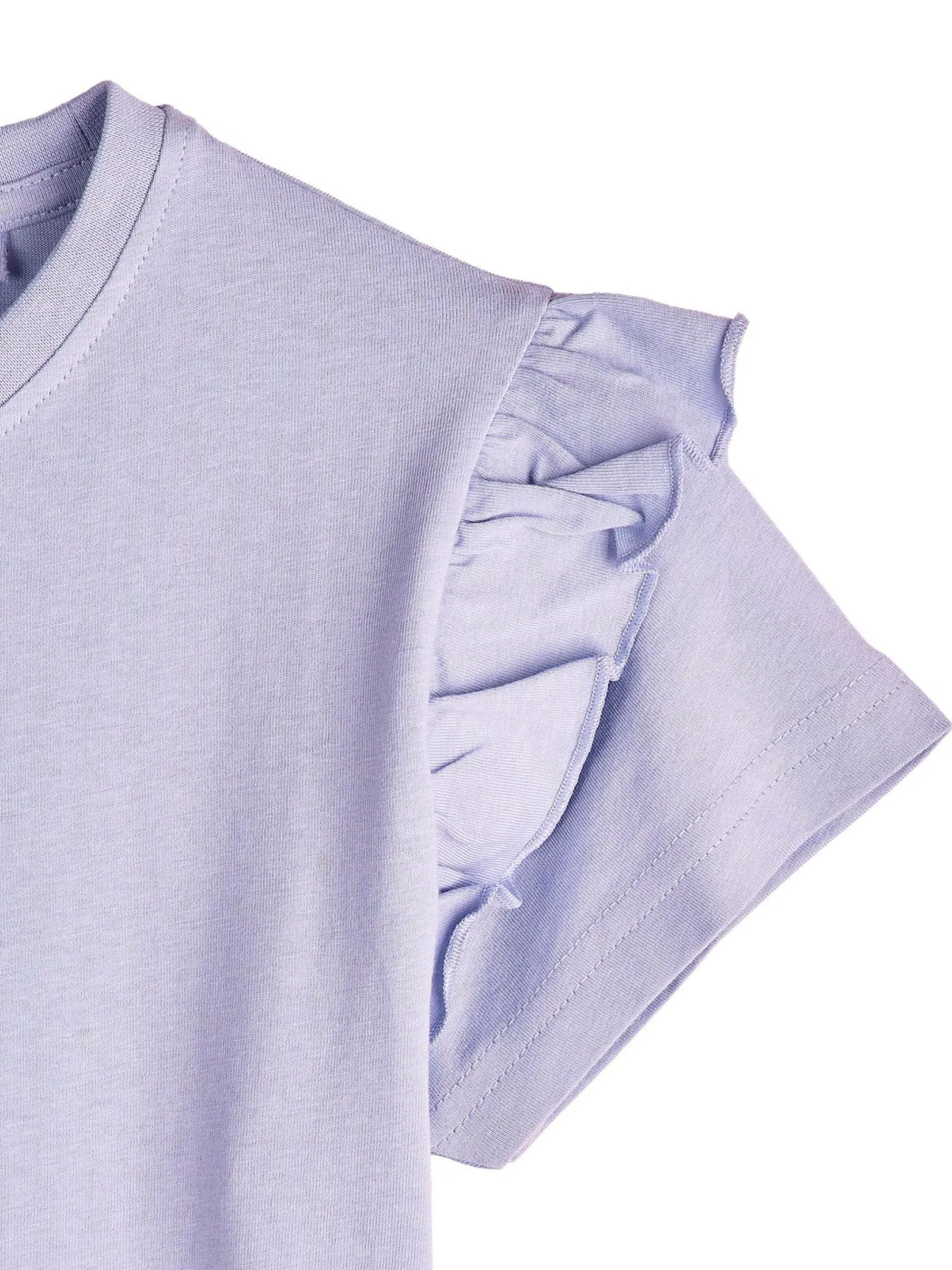 Kolor: purpurowyKrój: z falbanąTyp: koszulkaRekaw: krótki rękawDługość: krótkiPattern style: pojedynczy kolorDet…