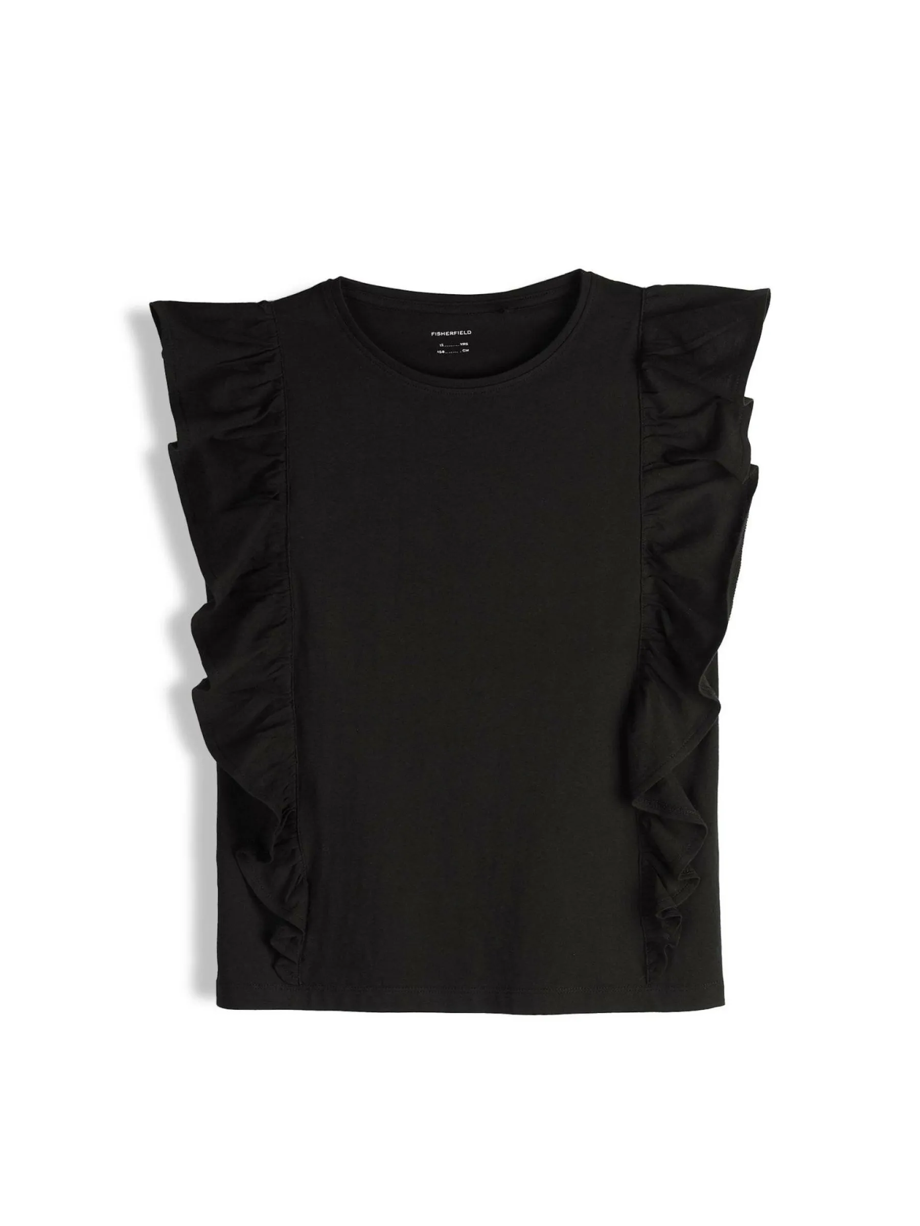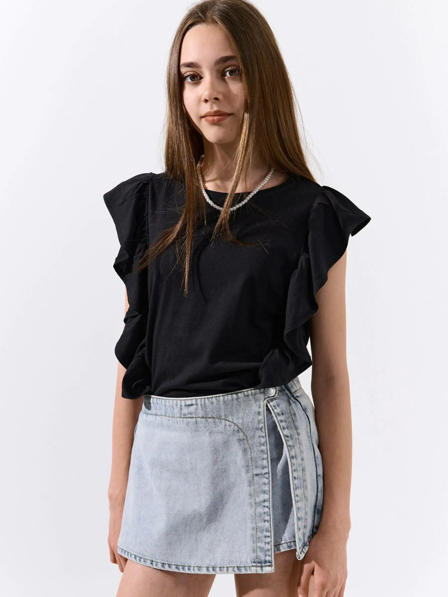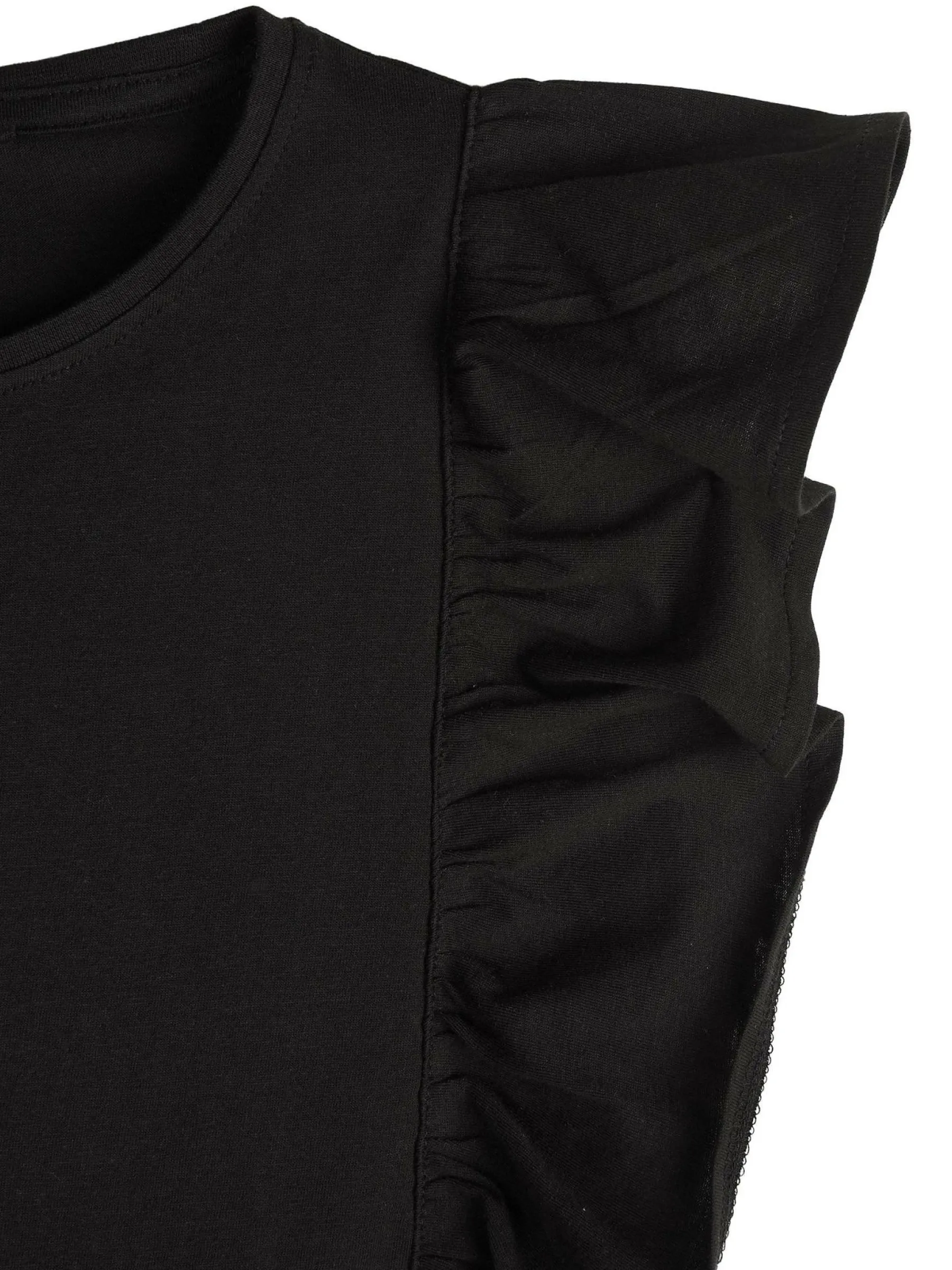 Kolor: czarnyKrój: z falbanąTyp: koszulkaRekaw: krótki rękawDługość: krótkiPattern style: pojedynczy kolorDetal:…