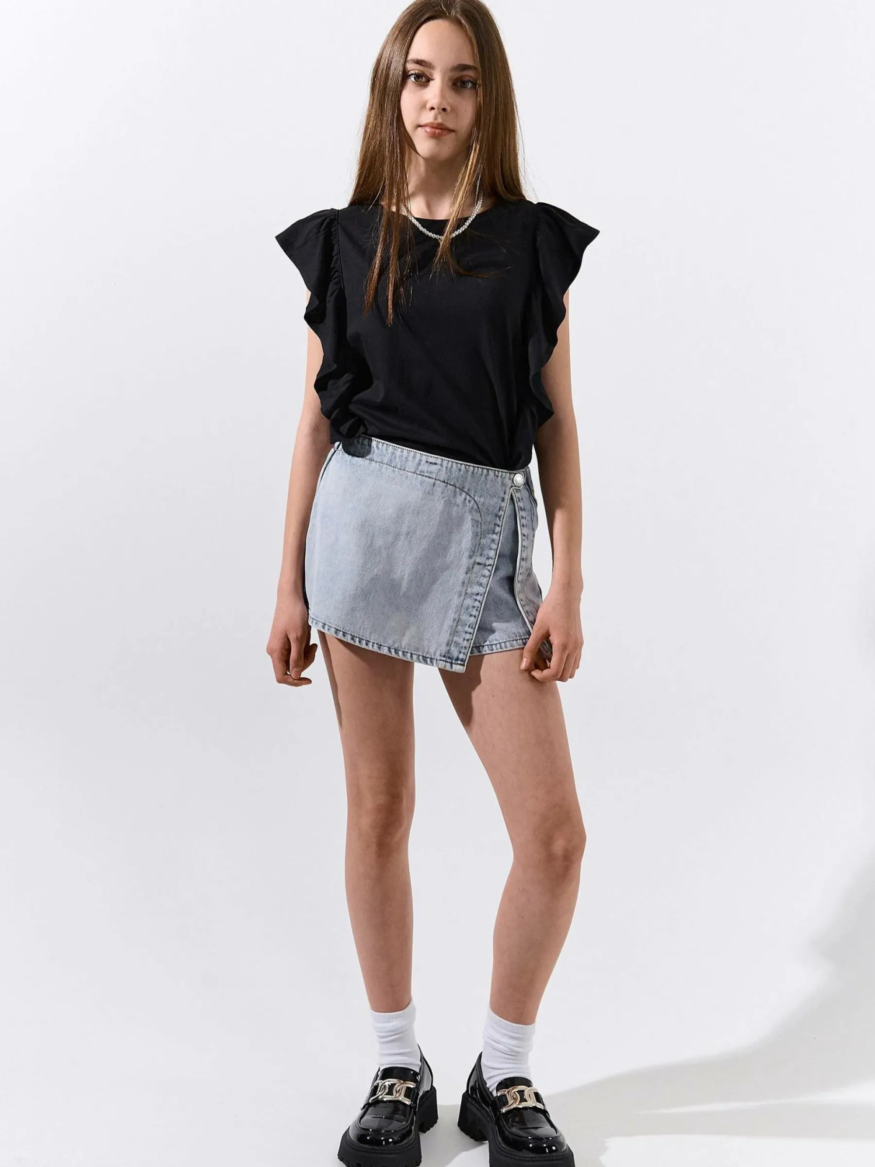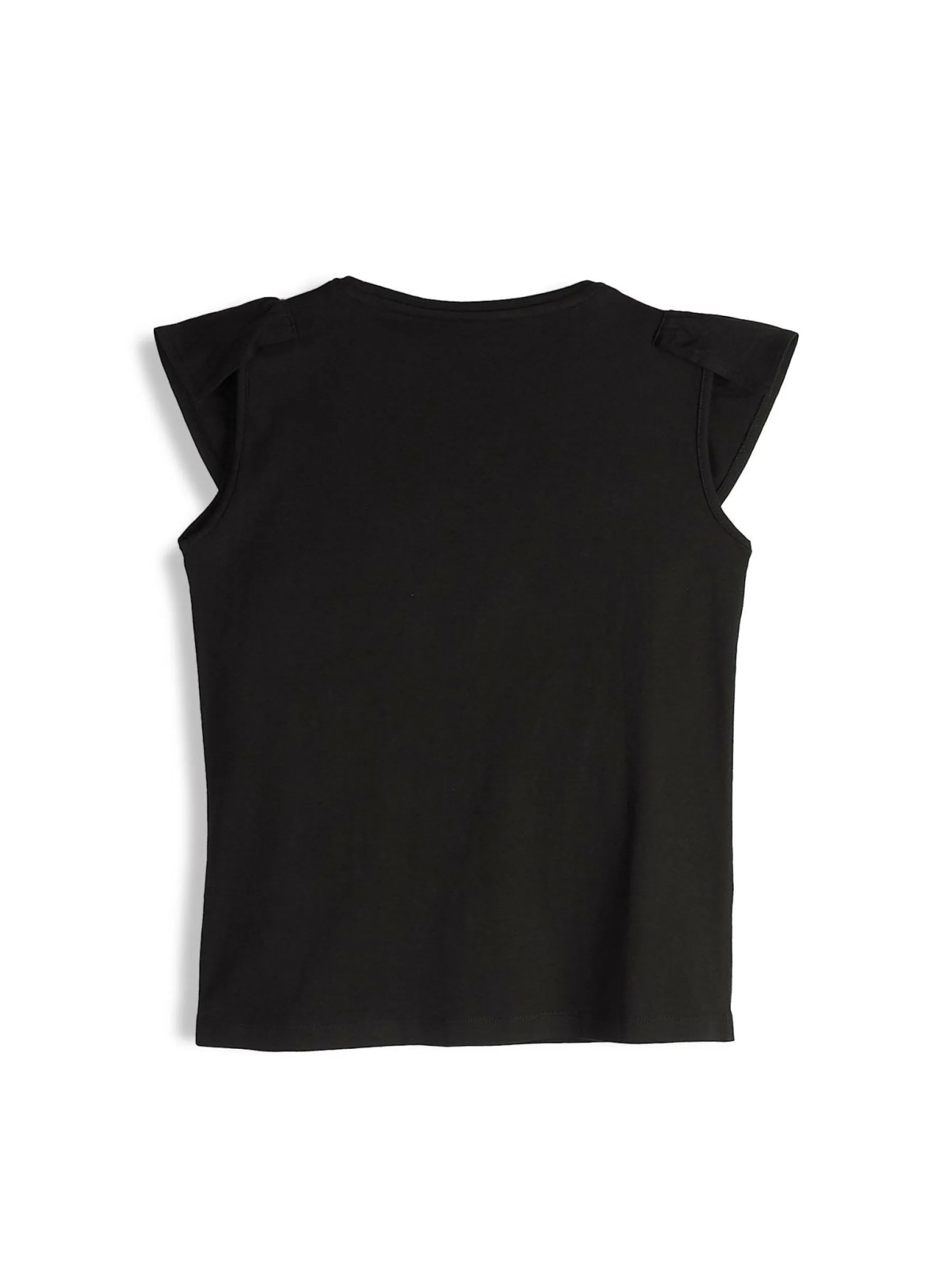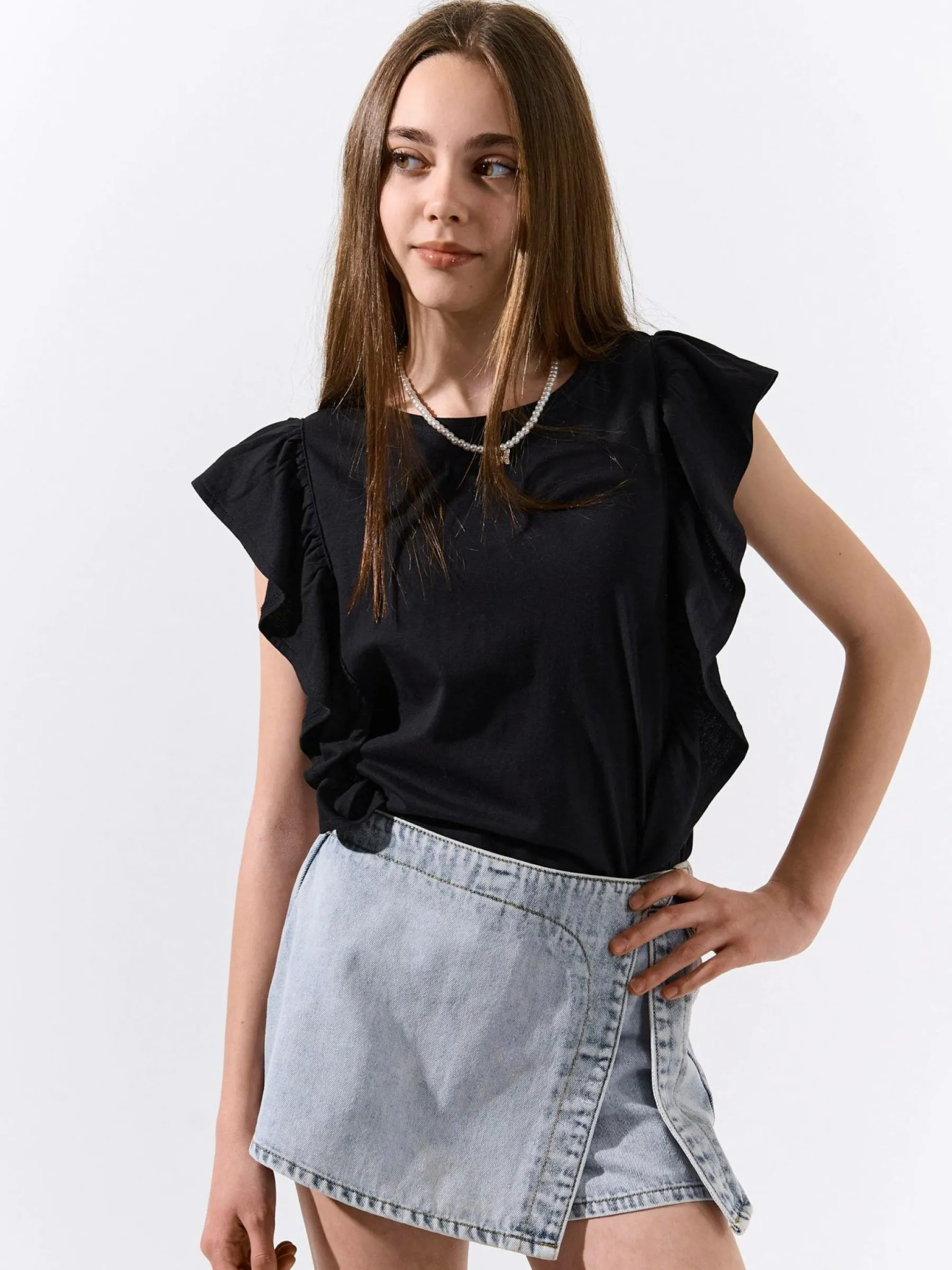 Kolor: czarnyKrój: z falbanąTyp: koszulkaRekaw: krótki rękawDługość: krótkiPattern style: pojedynczy kolorDetal:…