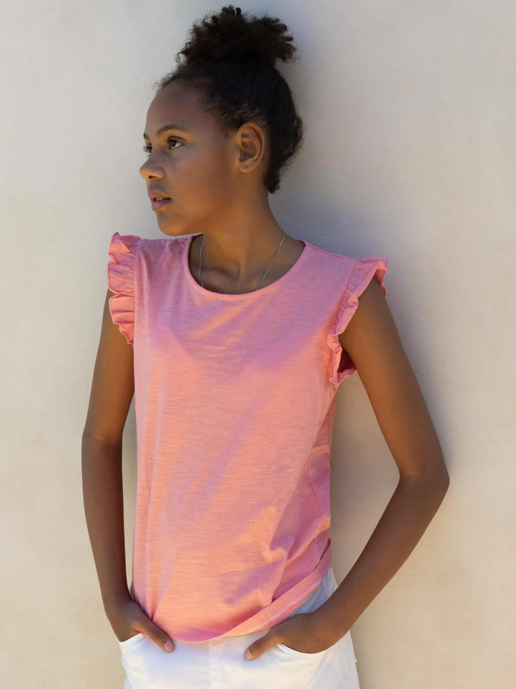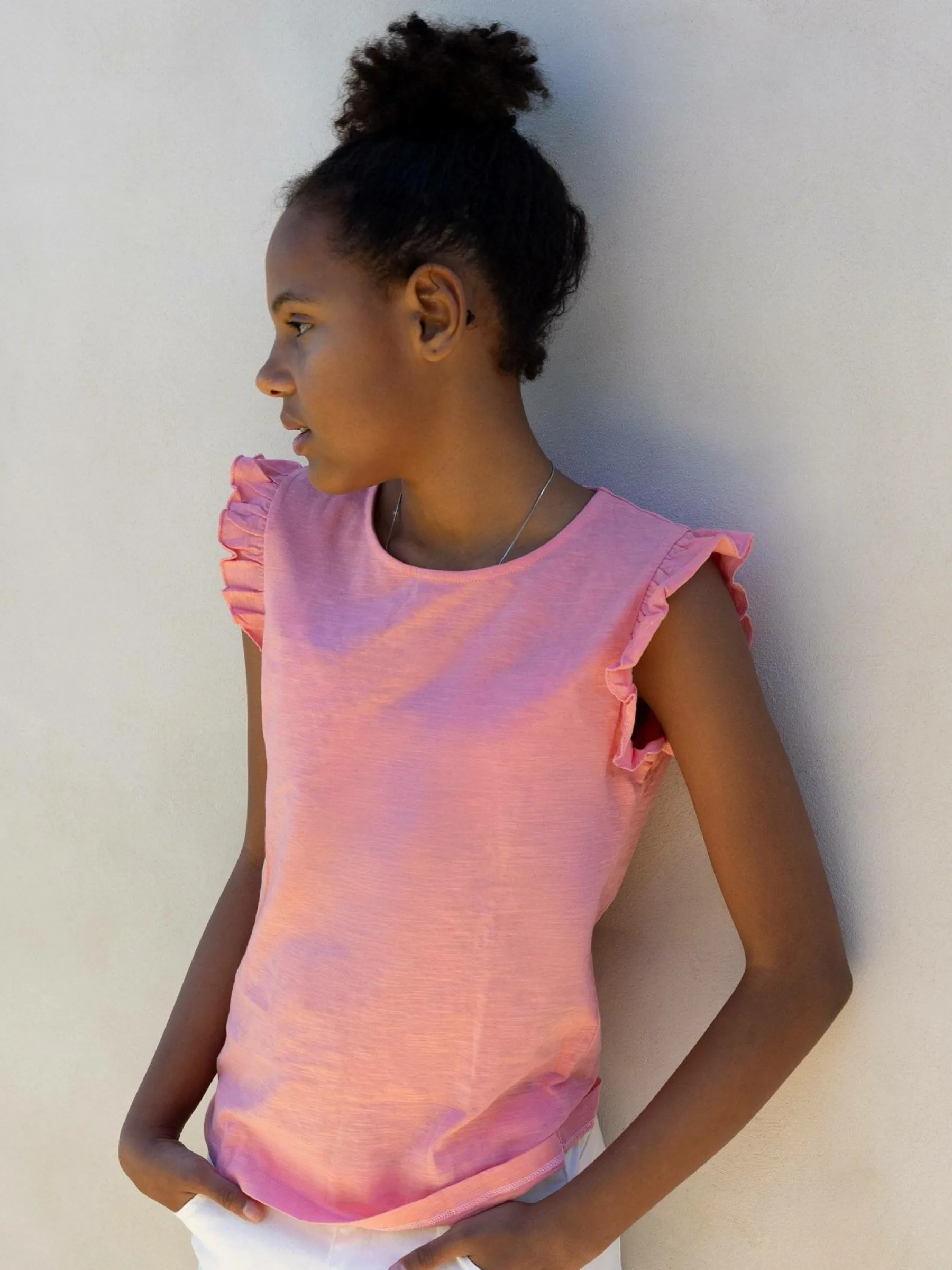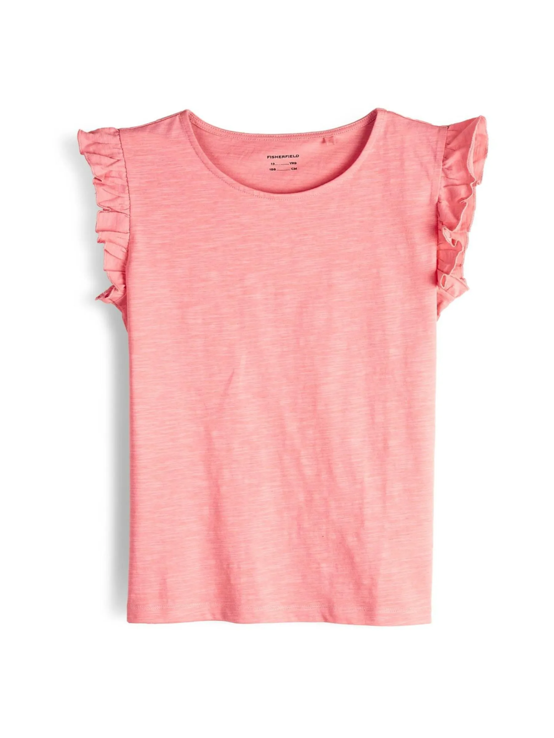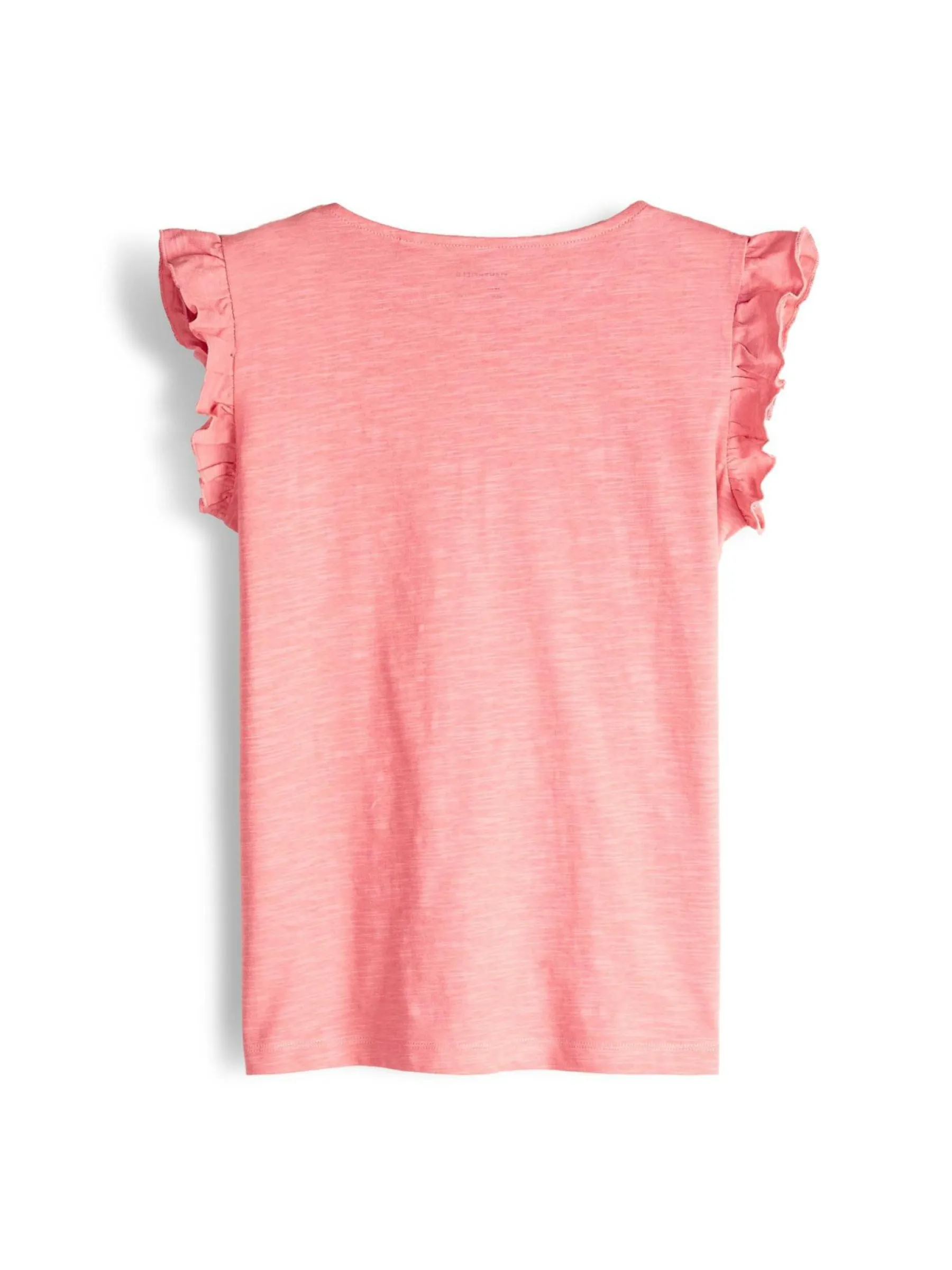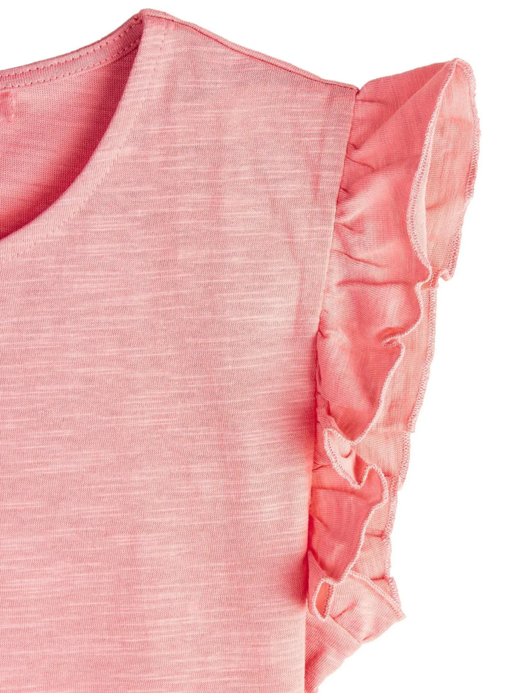 Kolor: różowyKrój: z falbanąTyp: koszulkaRekaw: krótki rękawDługość: krótkiPattern style: pojedynczy kolorDeta…
