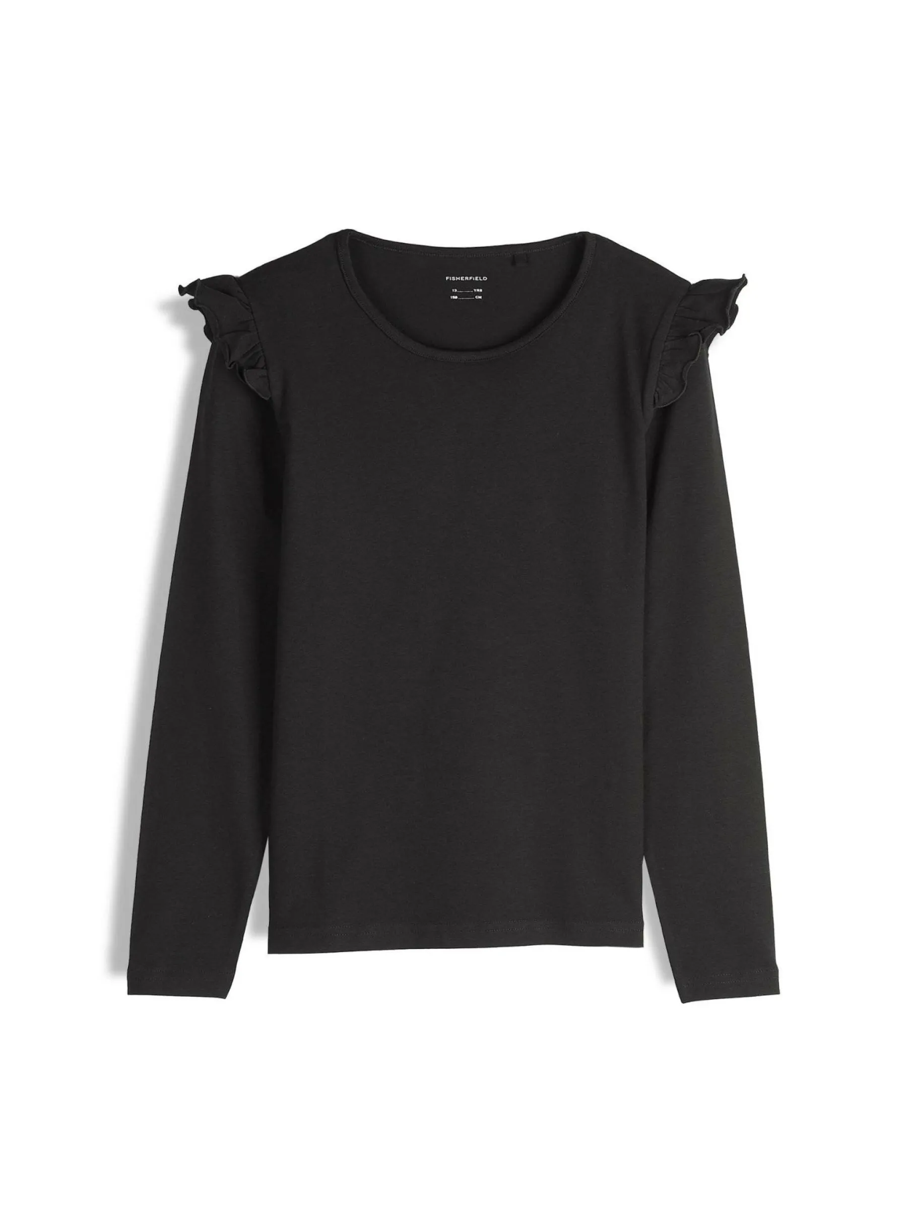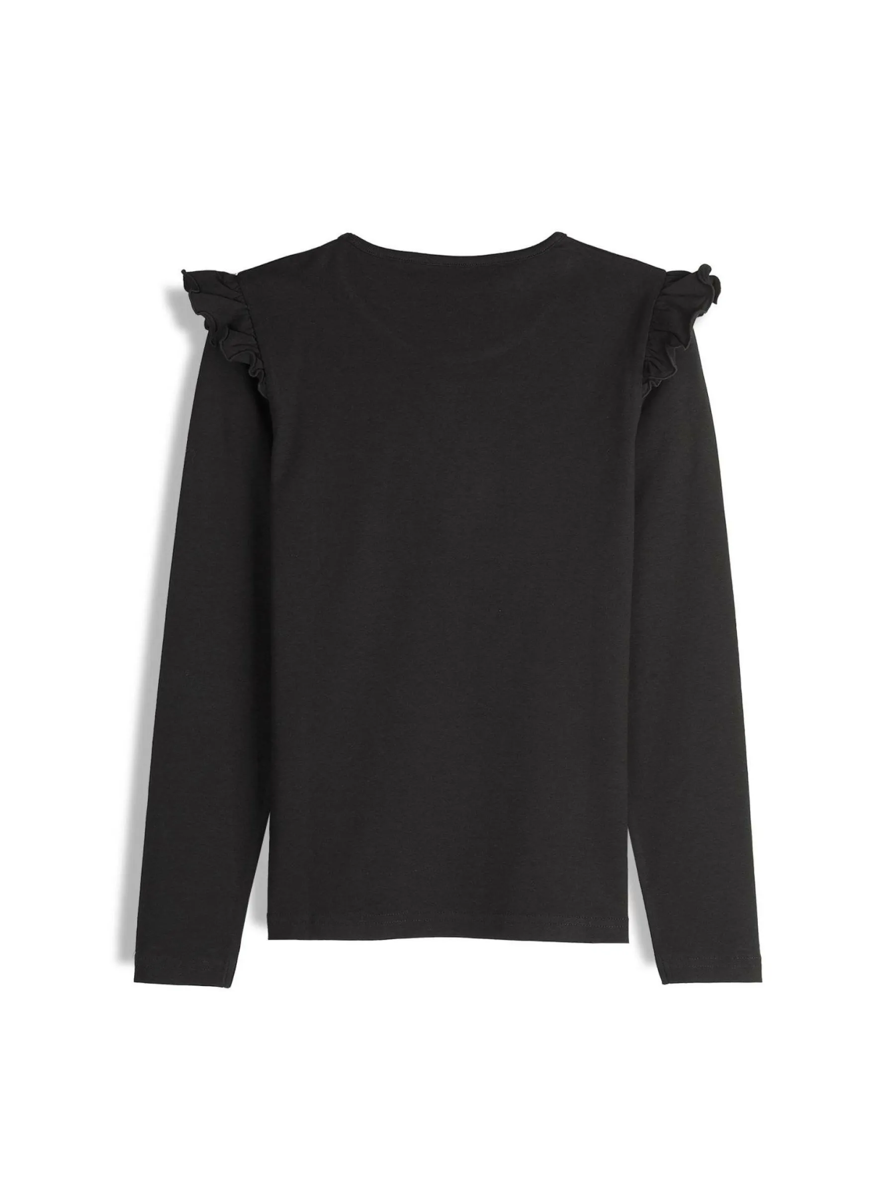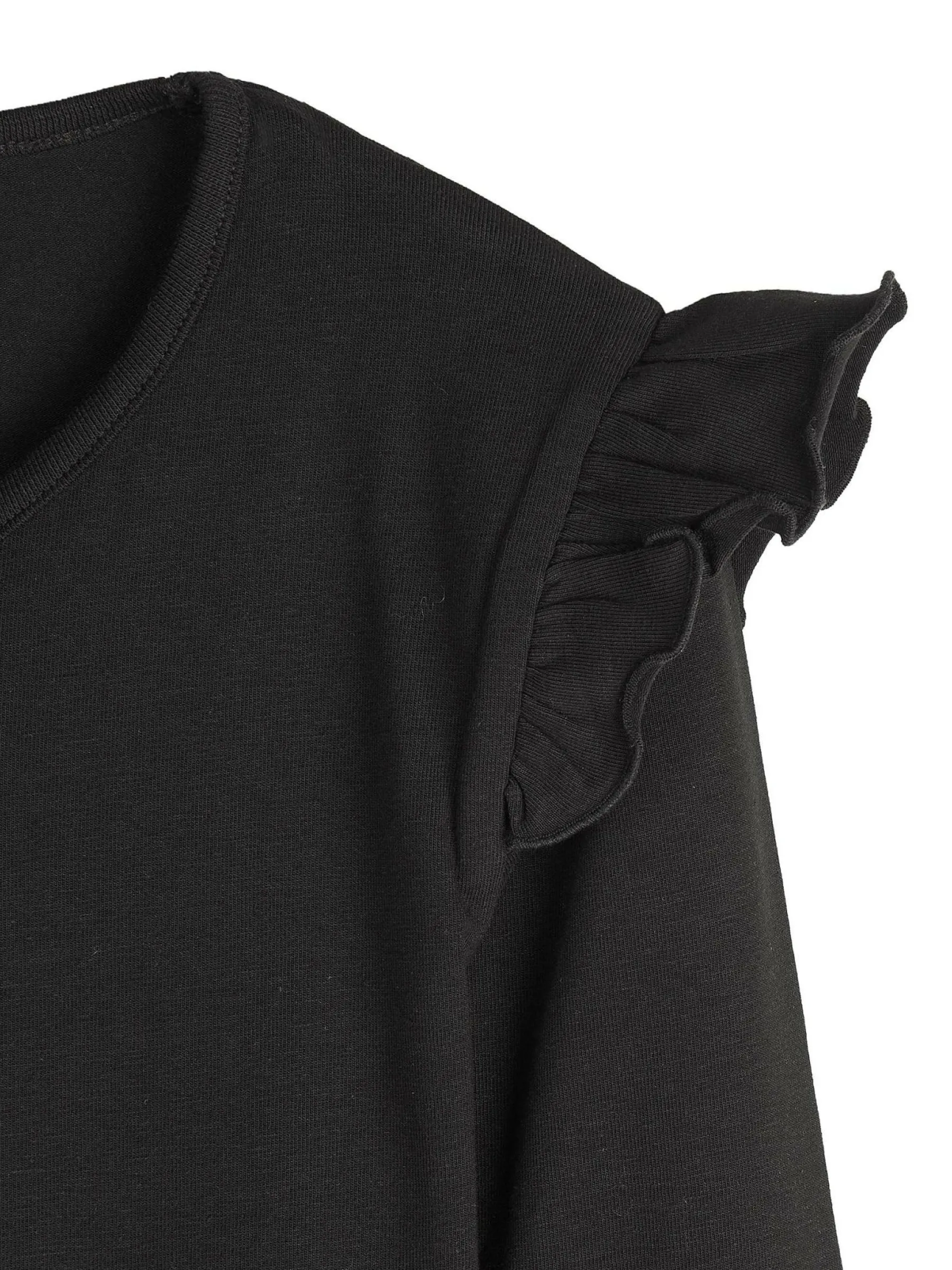 Kolor: czarnyKrój: z falbanąTyp: koszulkaRekaw: długi rękawDługość: krótkiPattern style: pojedynczy kolorDetal: …