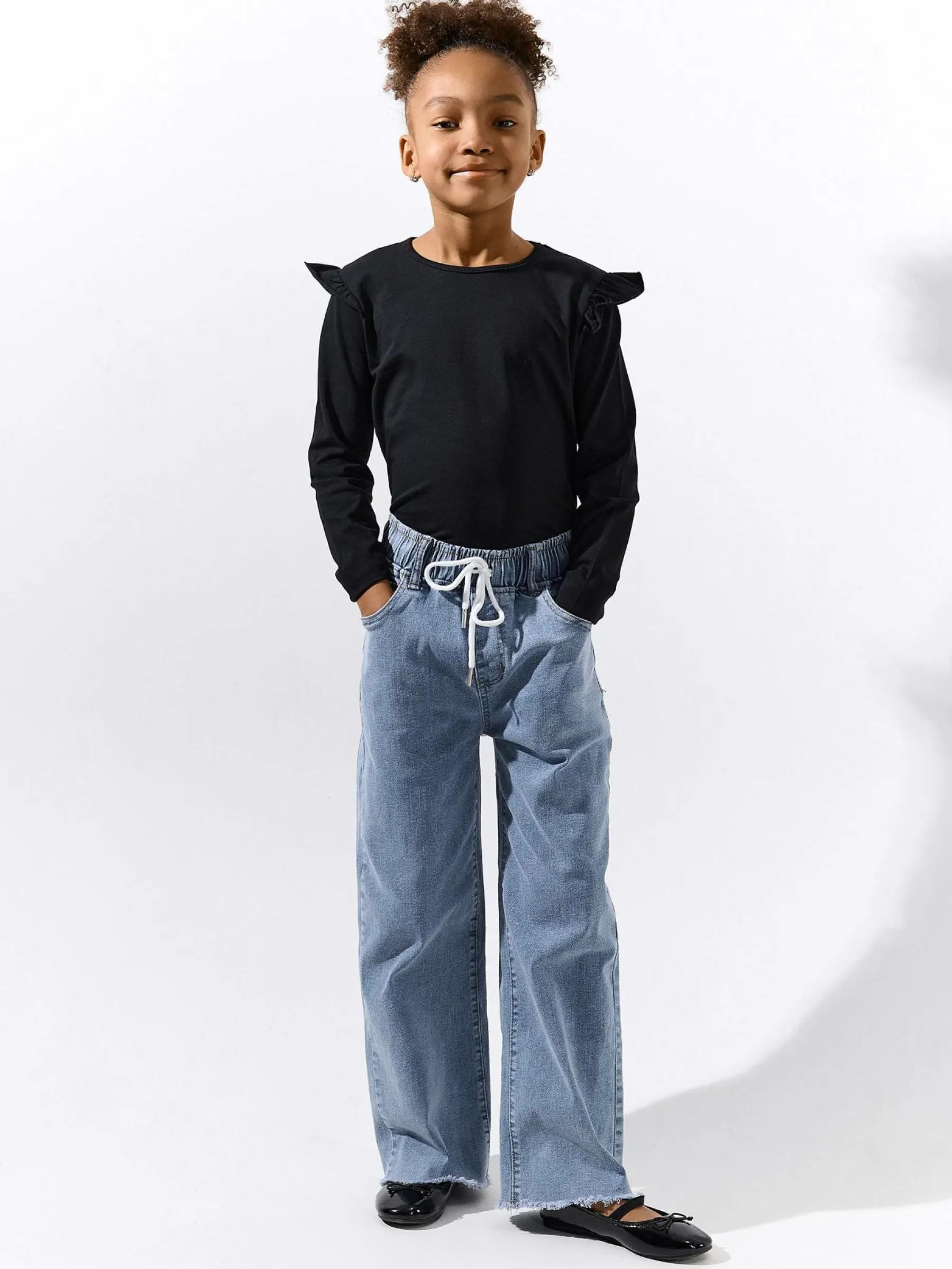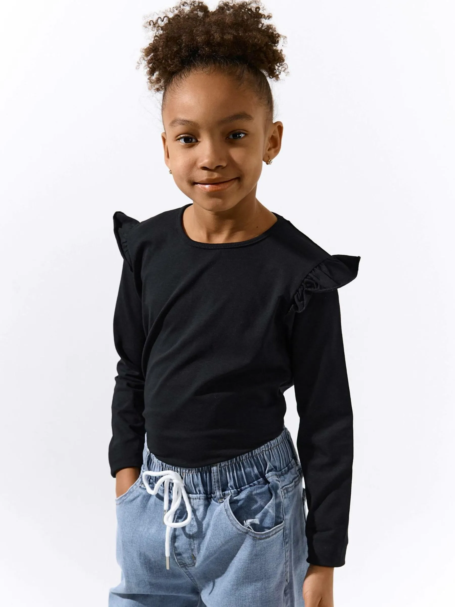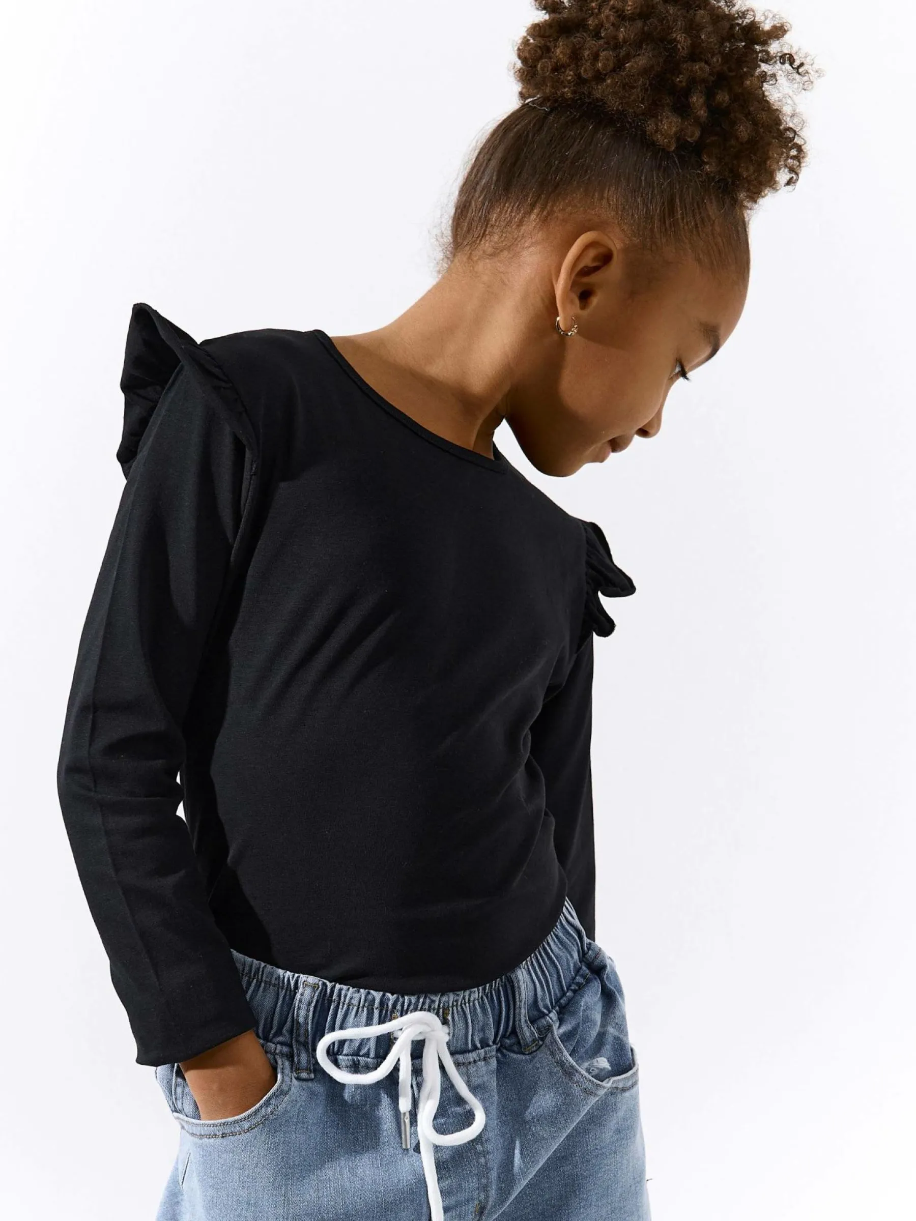 Kolor: czarnyKrój: z falbanąTyp: koszulkaRekaw: długi rękawDługość: krótkiPattern style: pojedynczy kolorDetal: …