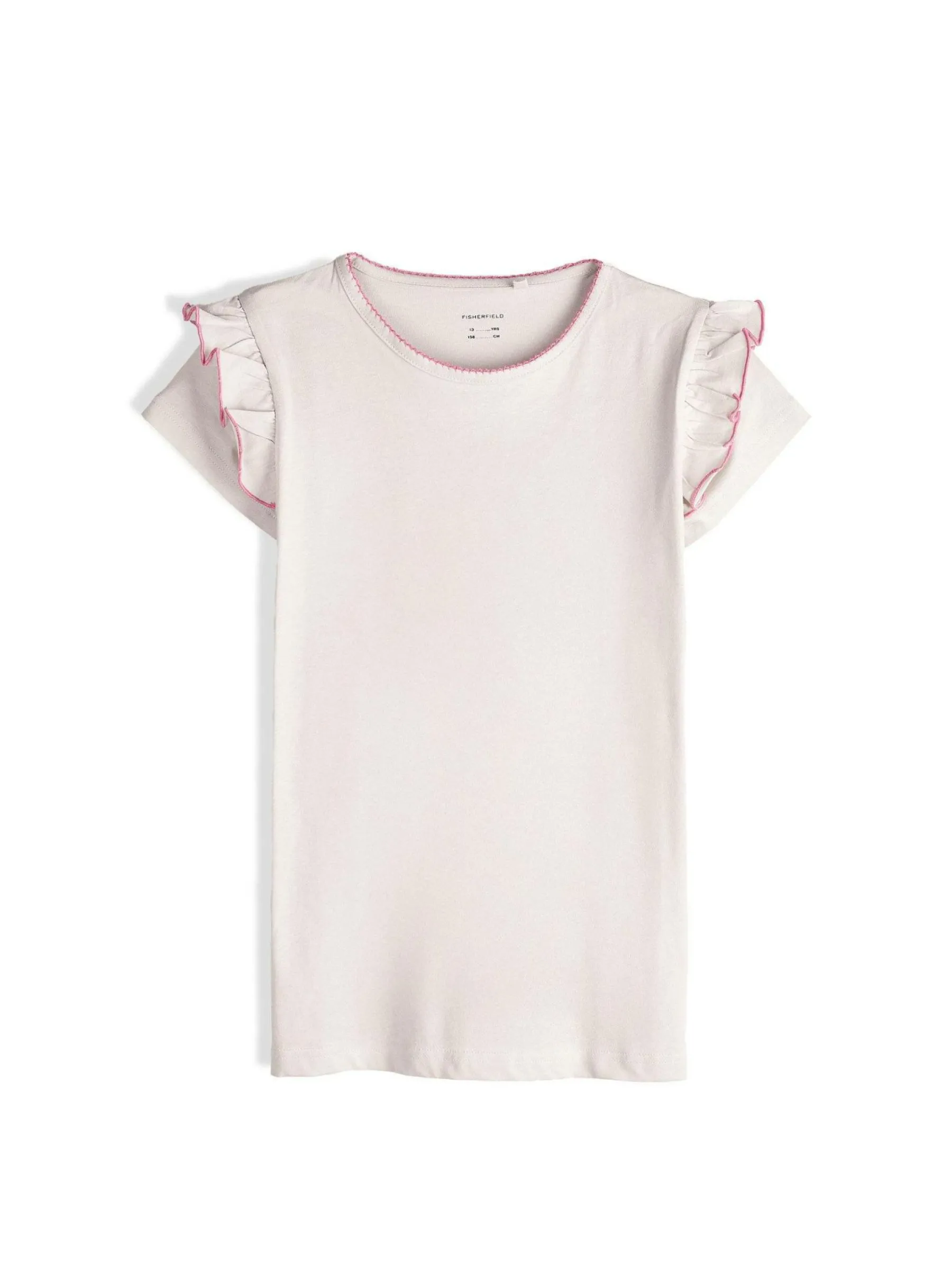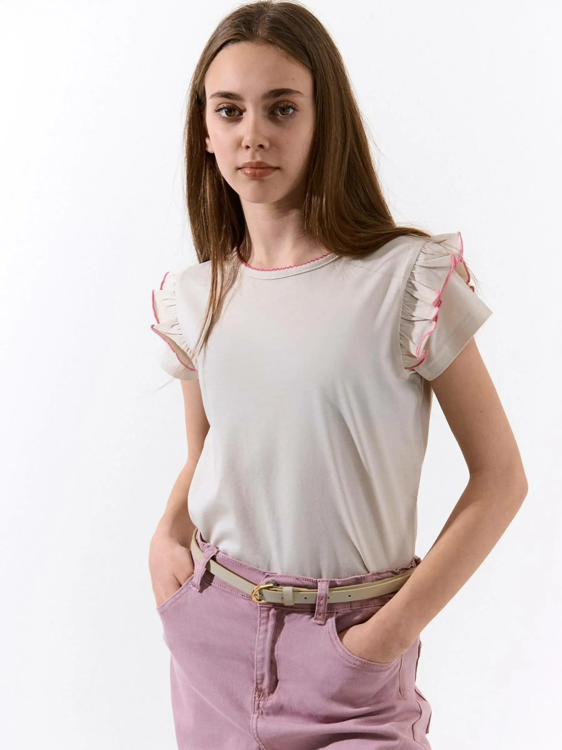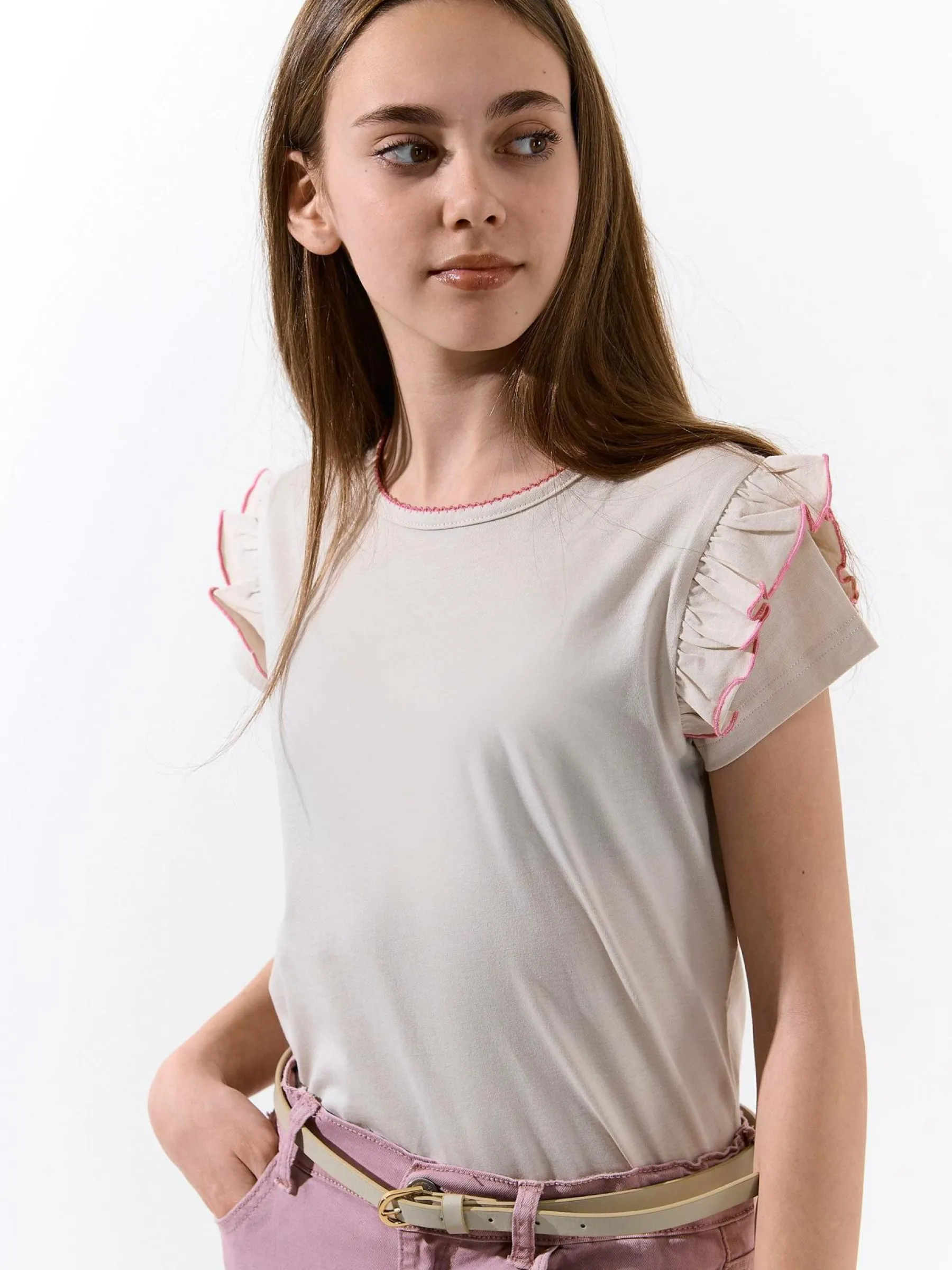 Kolor: beżowyKrój: z falbanąTyp: koszulkaRekaw: krótki rękawDługość: krótkiPattern style: pojedynczy kolorDetal…