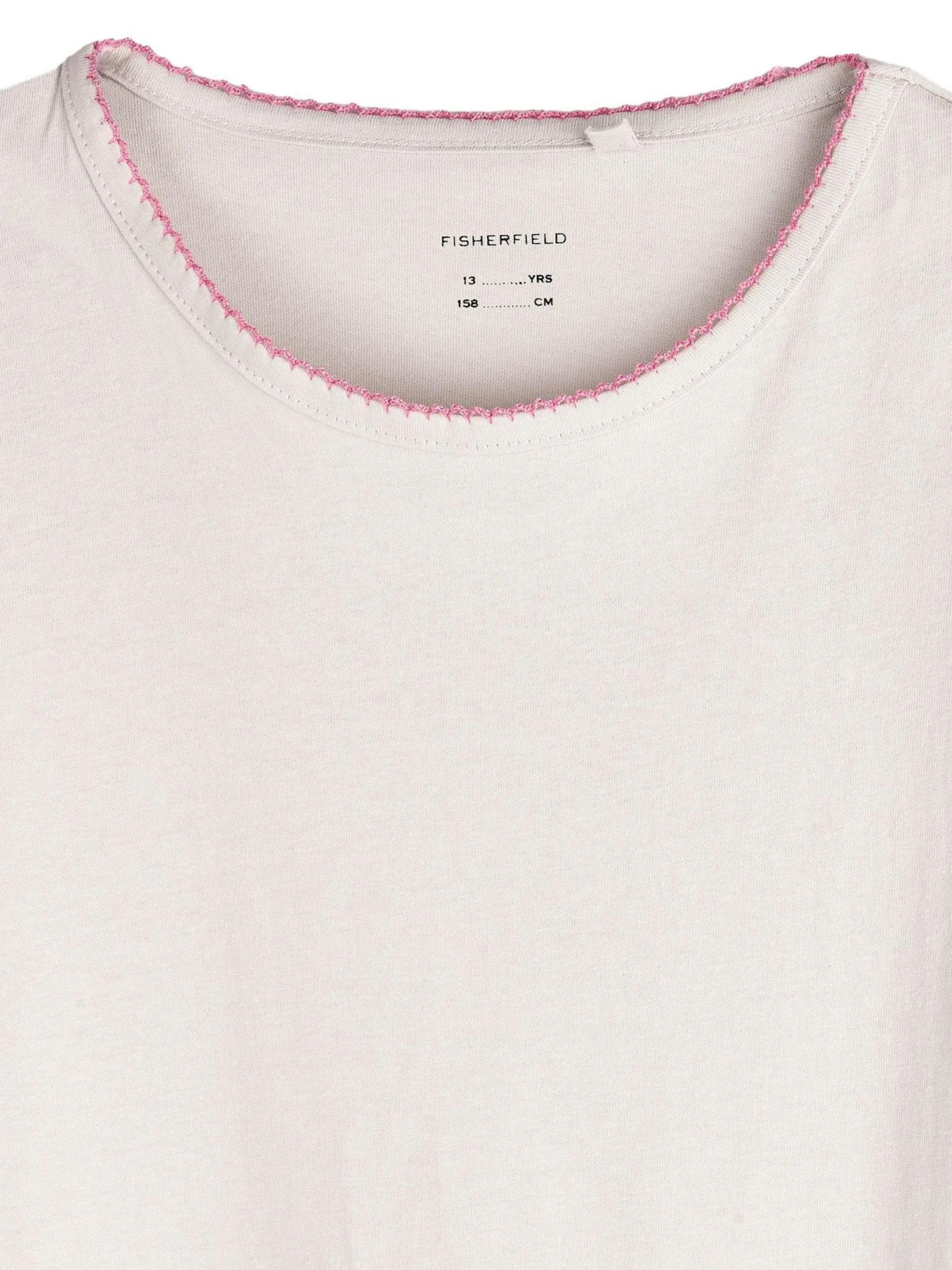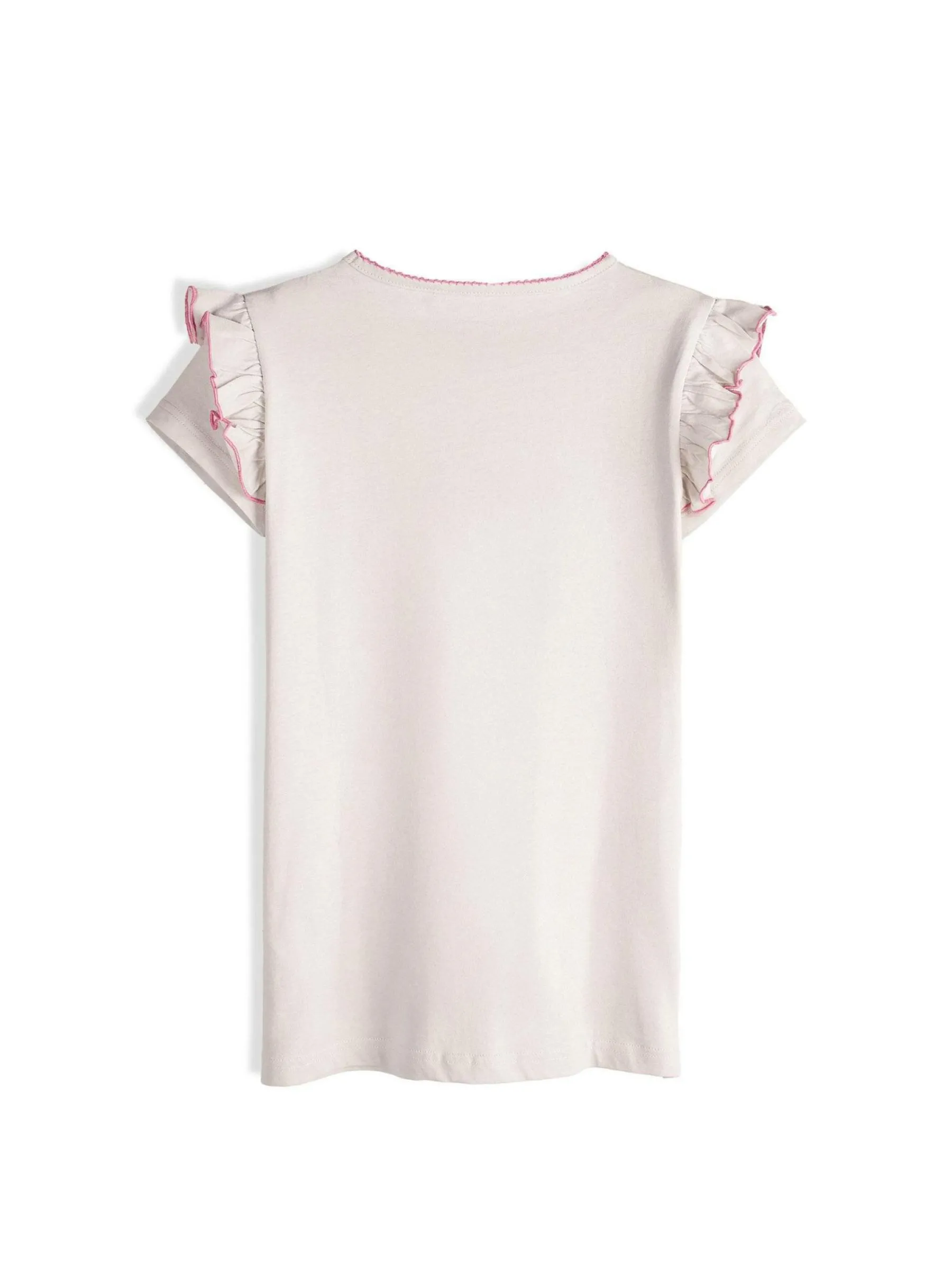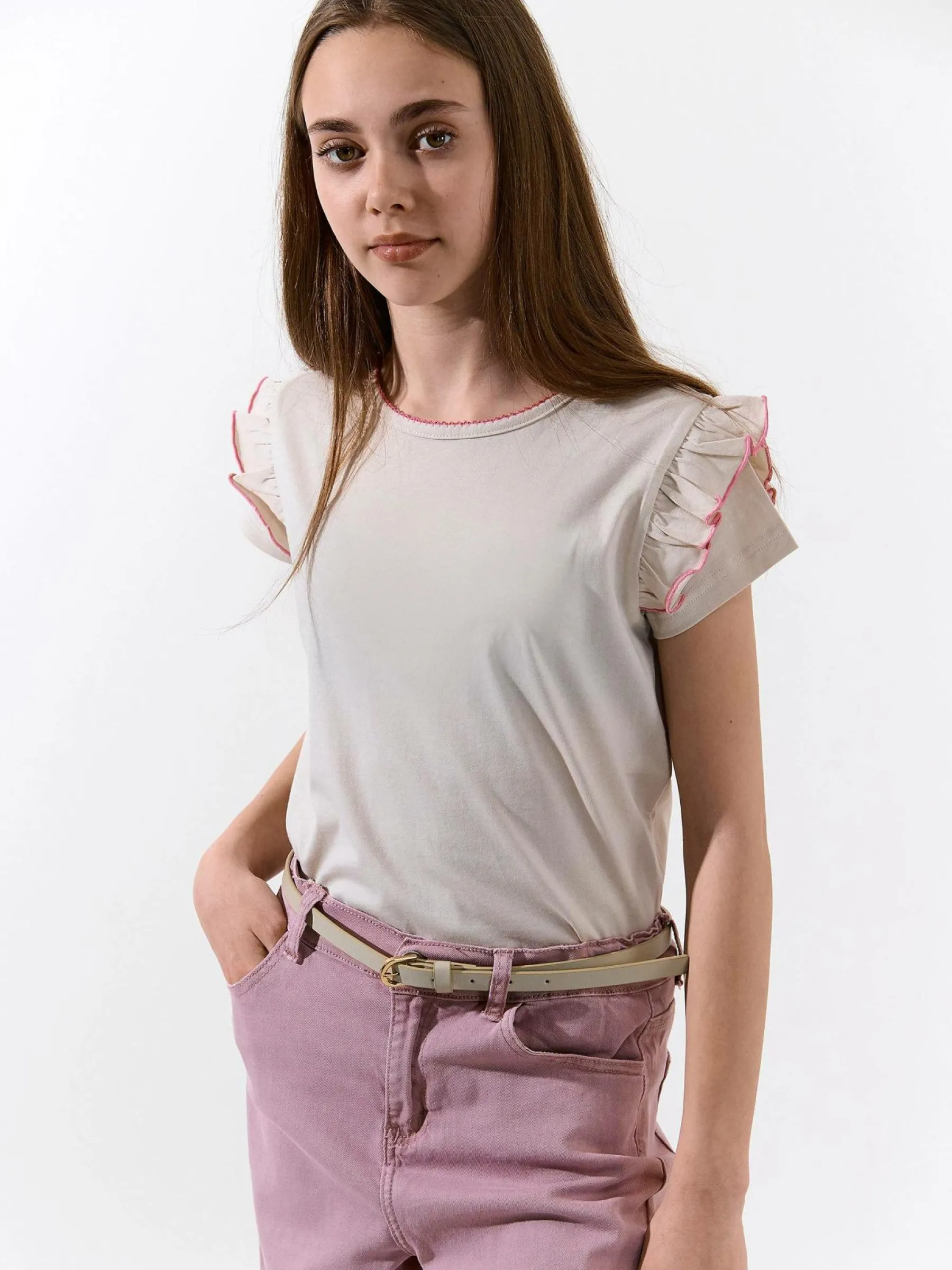 Kolor: beżowyKrój: z falbanąTyp: koszulkaRekaw: krótki rękawDługość: krótkiPattern style: pojedynczy kolorDetal…