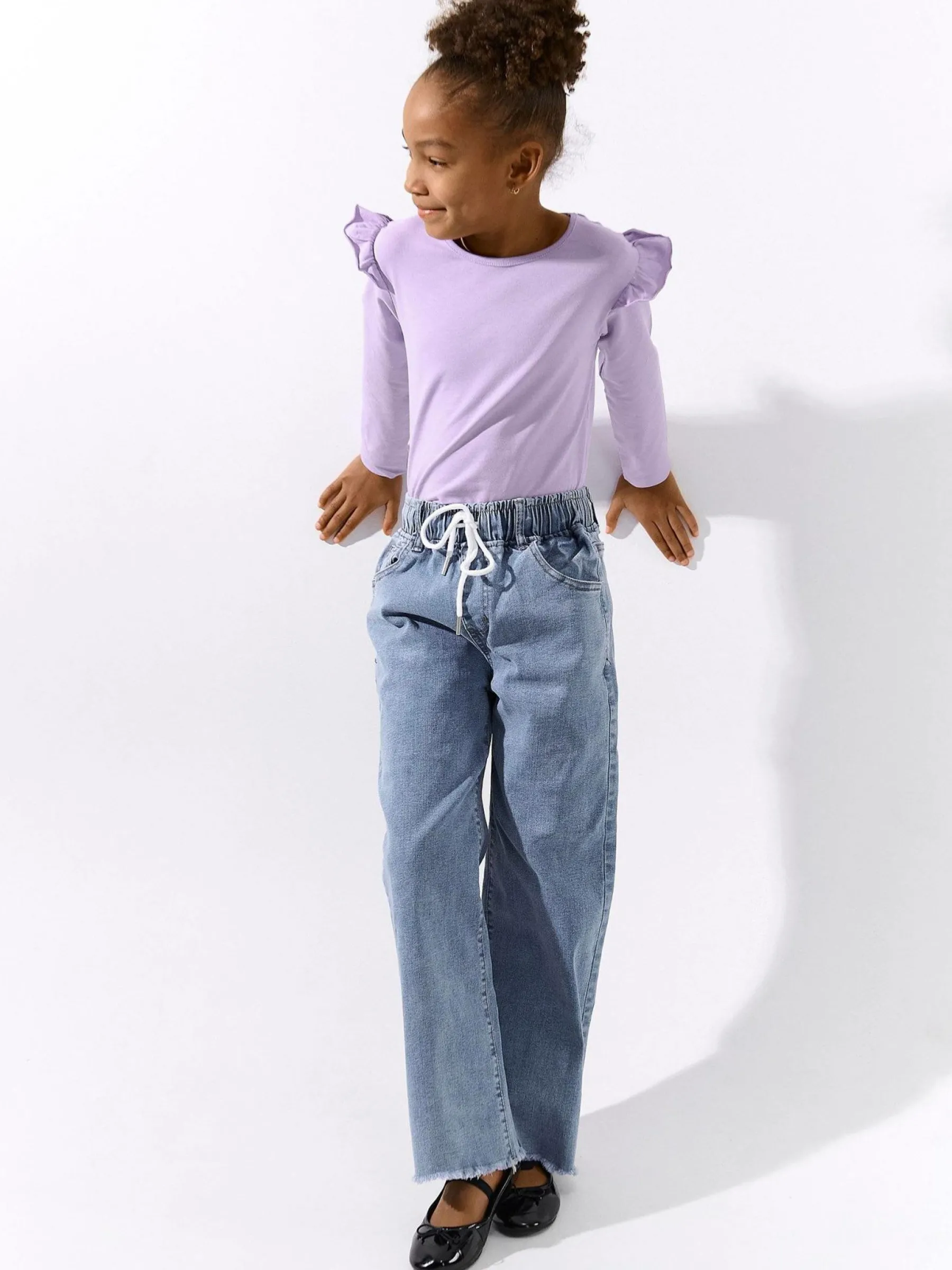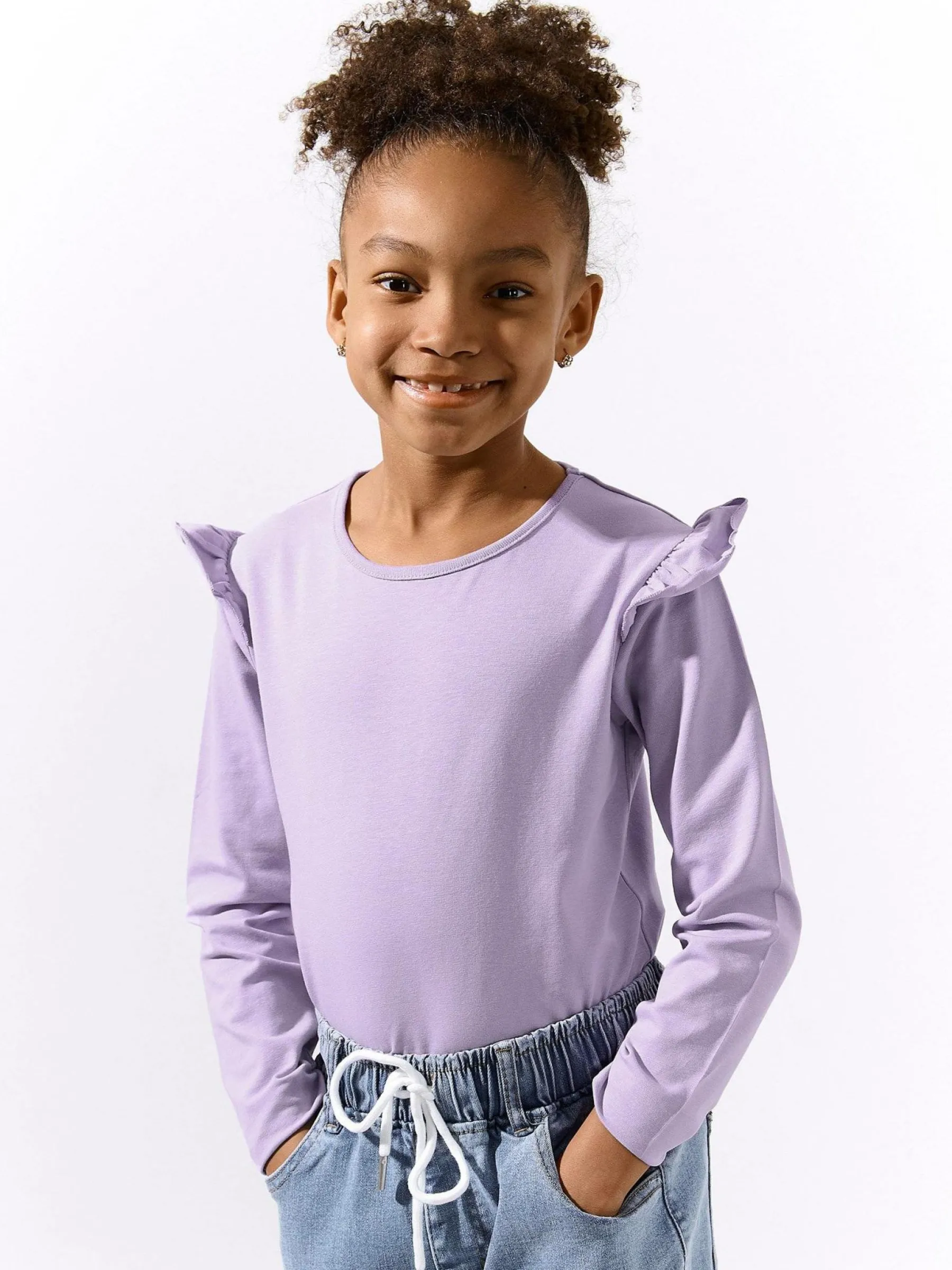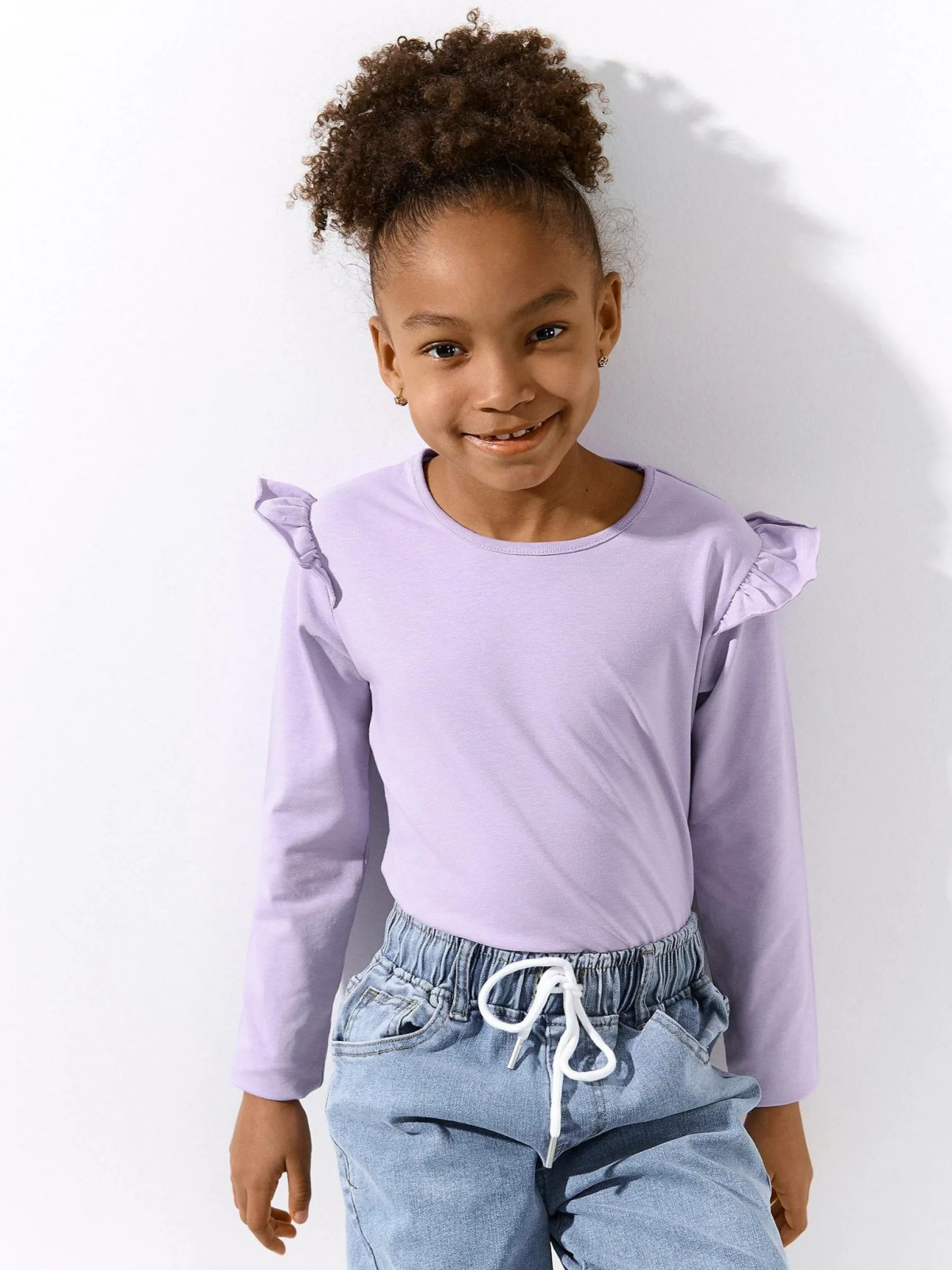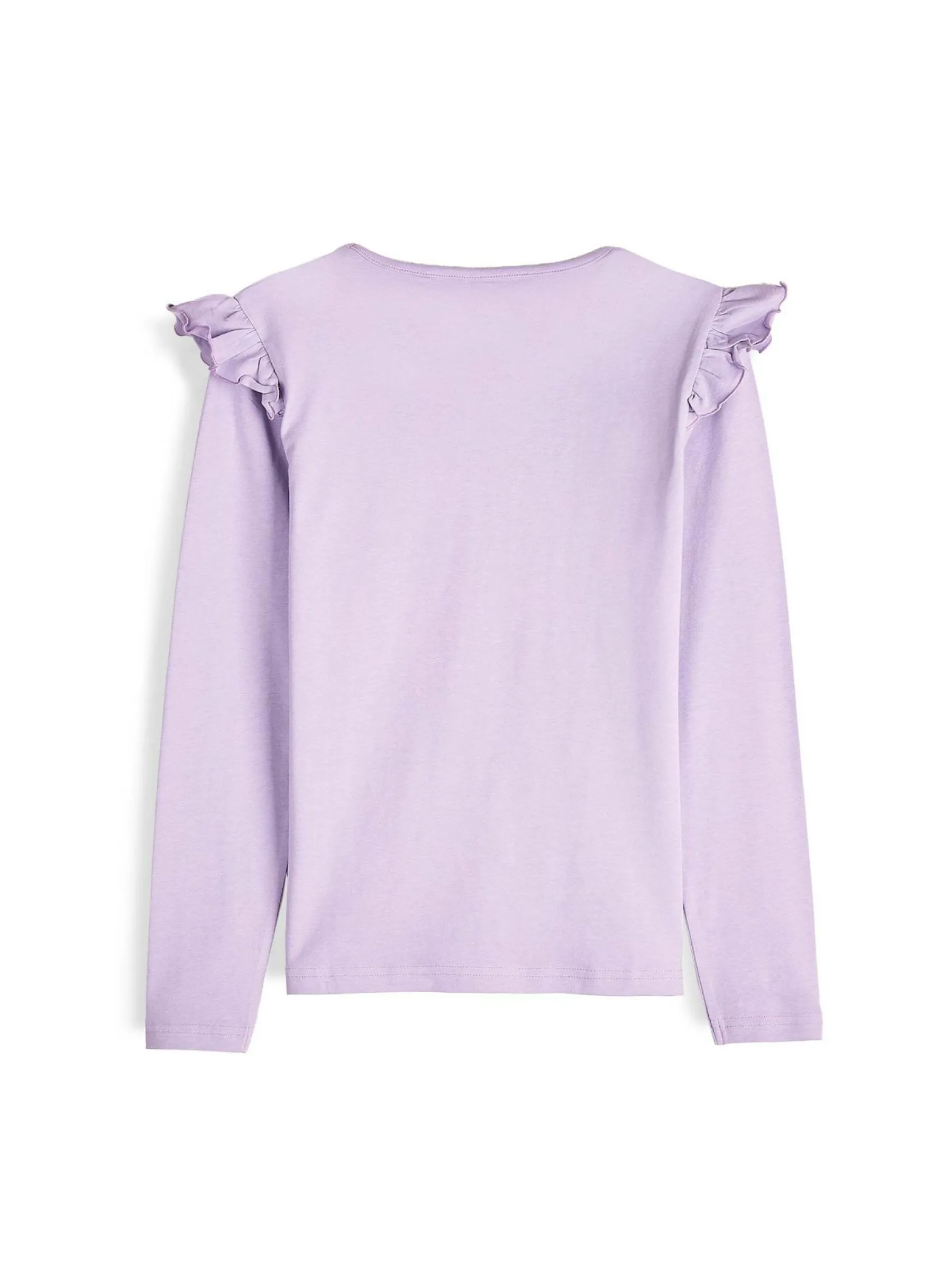 Kolor: purpurowyKrój: z falbanąTyp: koszulkaRekaw: długi rękawDługość: krótkiPattern style: pojedynczy kolorDeta…