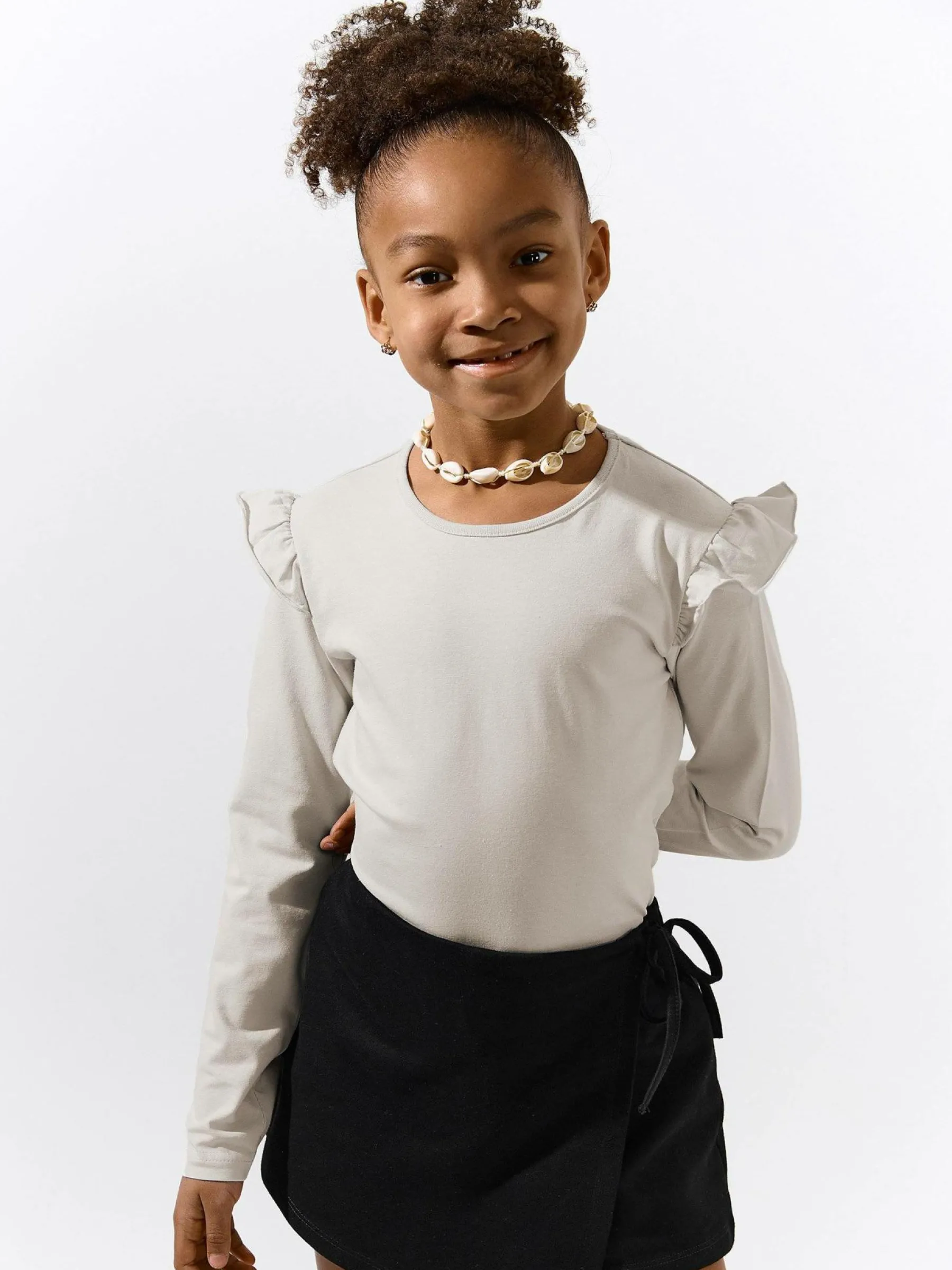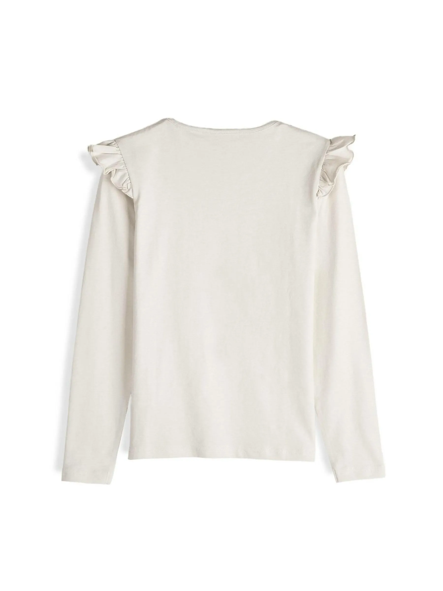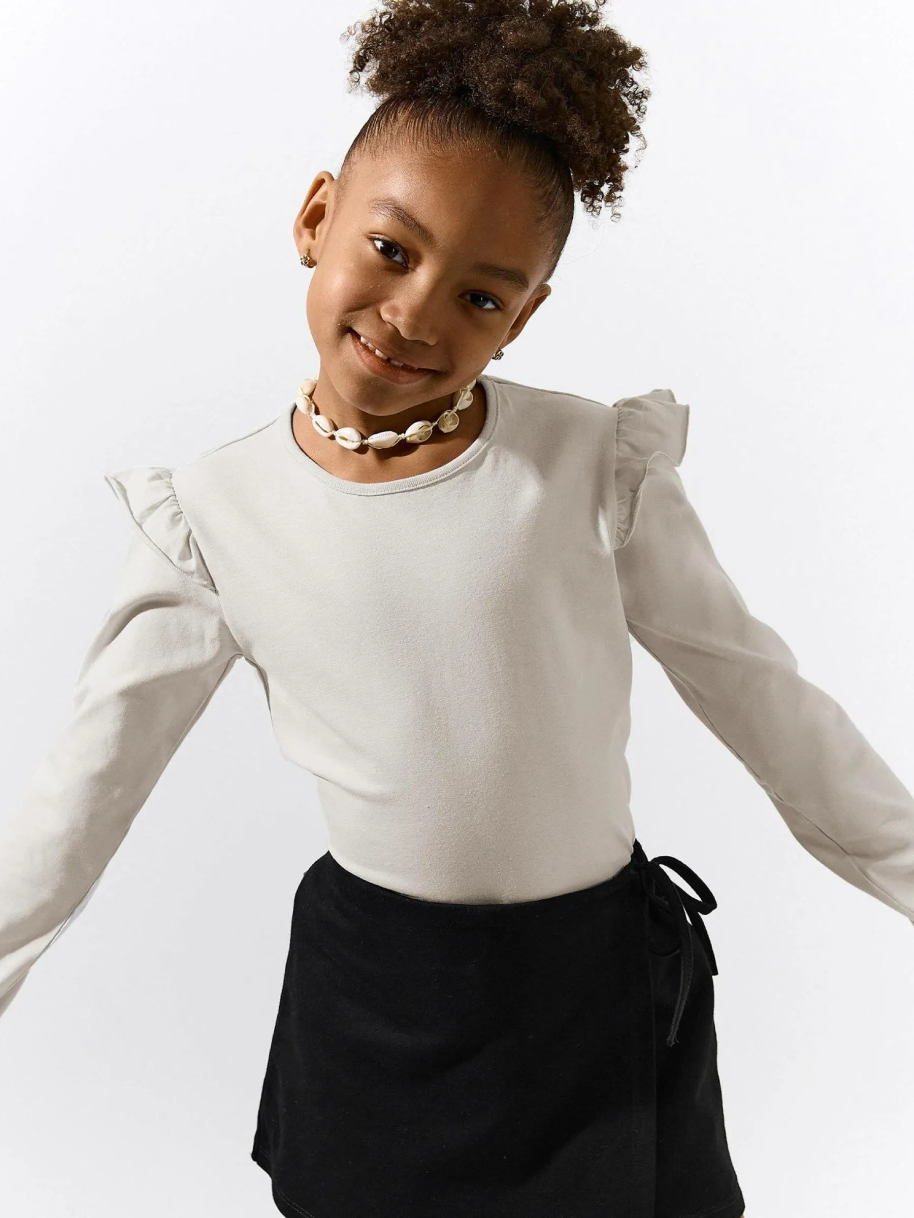 Kolor: beżowyKrój: z falbanąTyp: koszulkaRekaw: długi rękawDługość: krótkiPattern style: pojedynczy kolorDetal:…