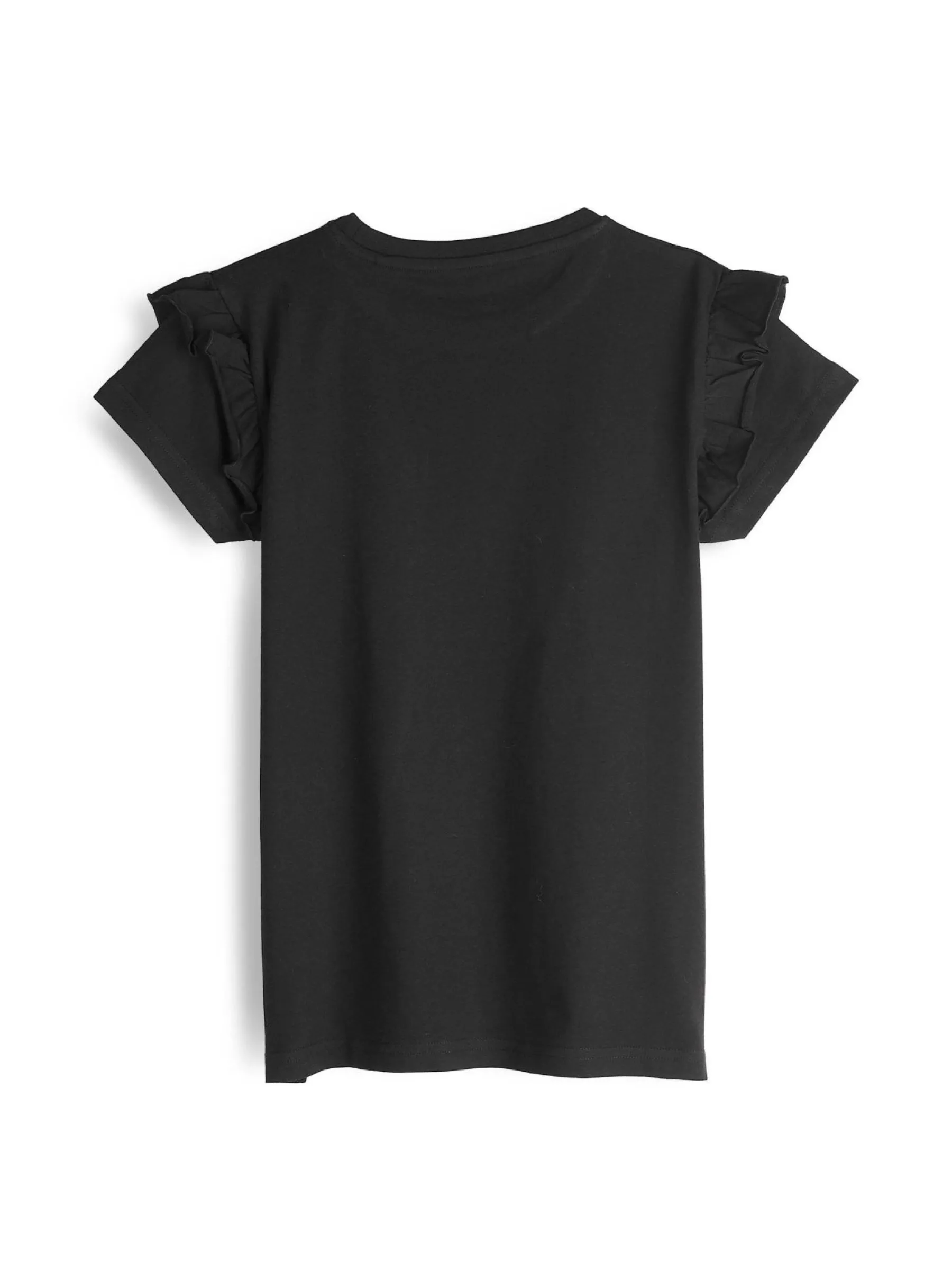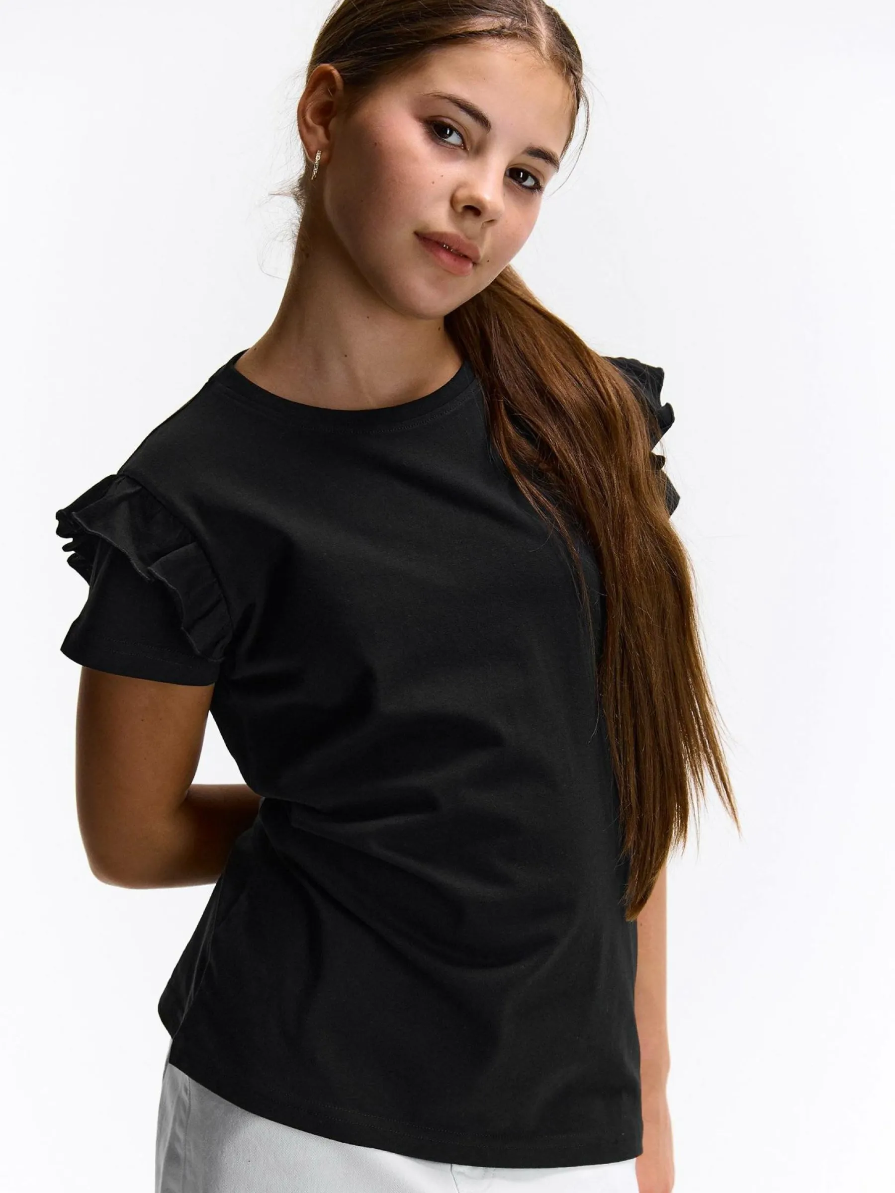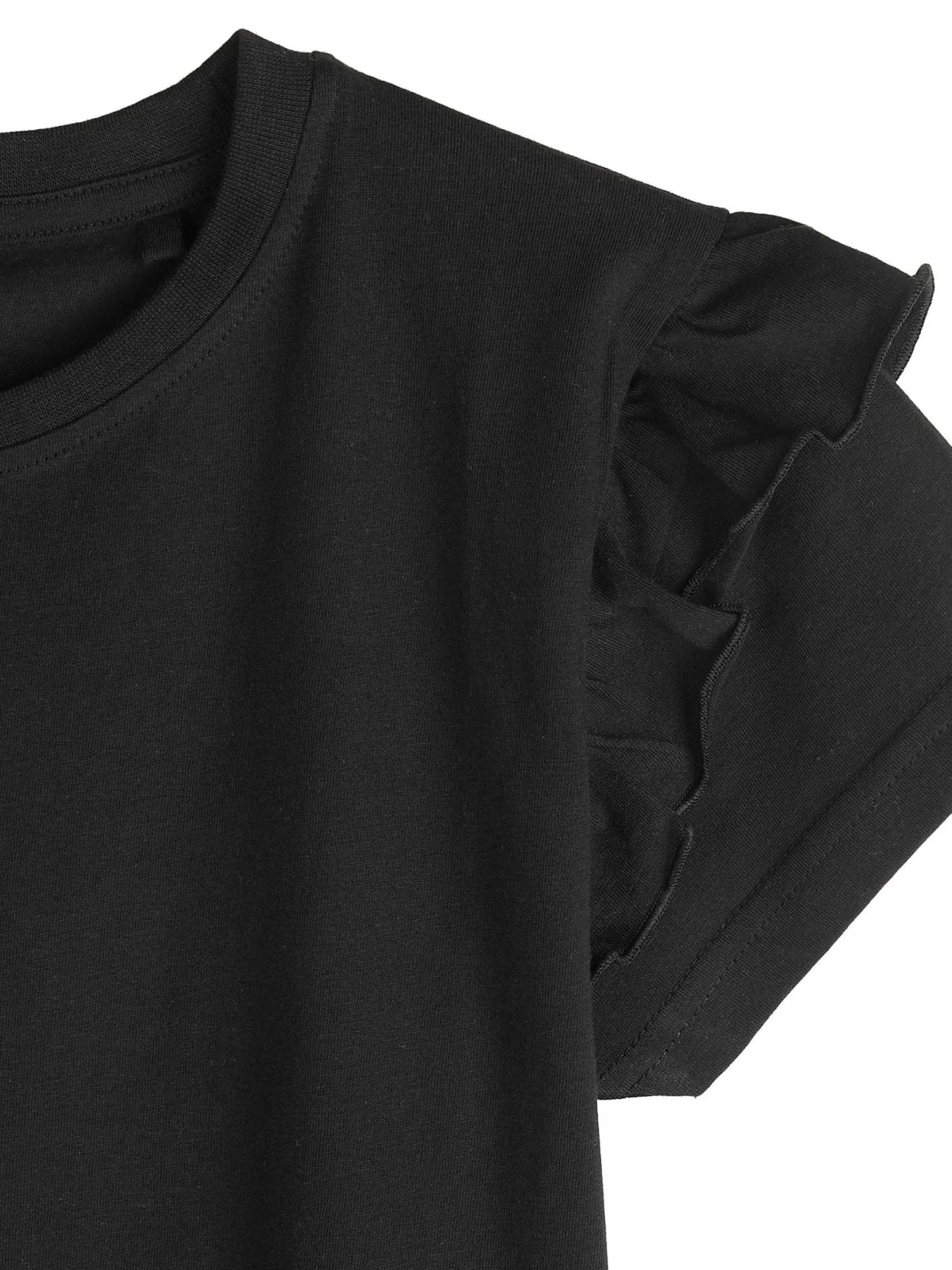 Kolor: czarnyKrój: z falbanąTyp: koszulkaRekaw: krótki rękawDługość: krótkiPattern style: pojedynczy kolorDetal:…