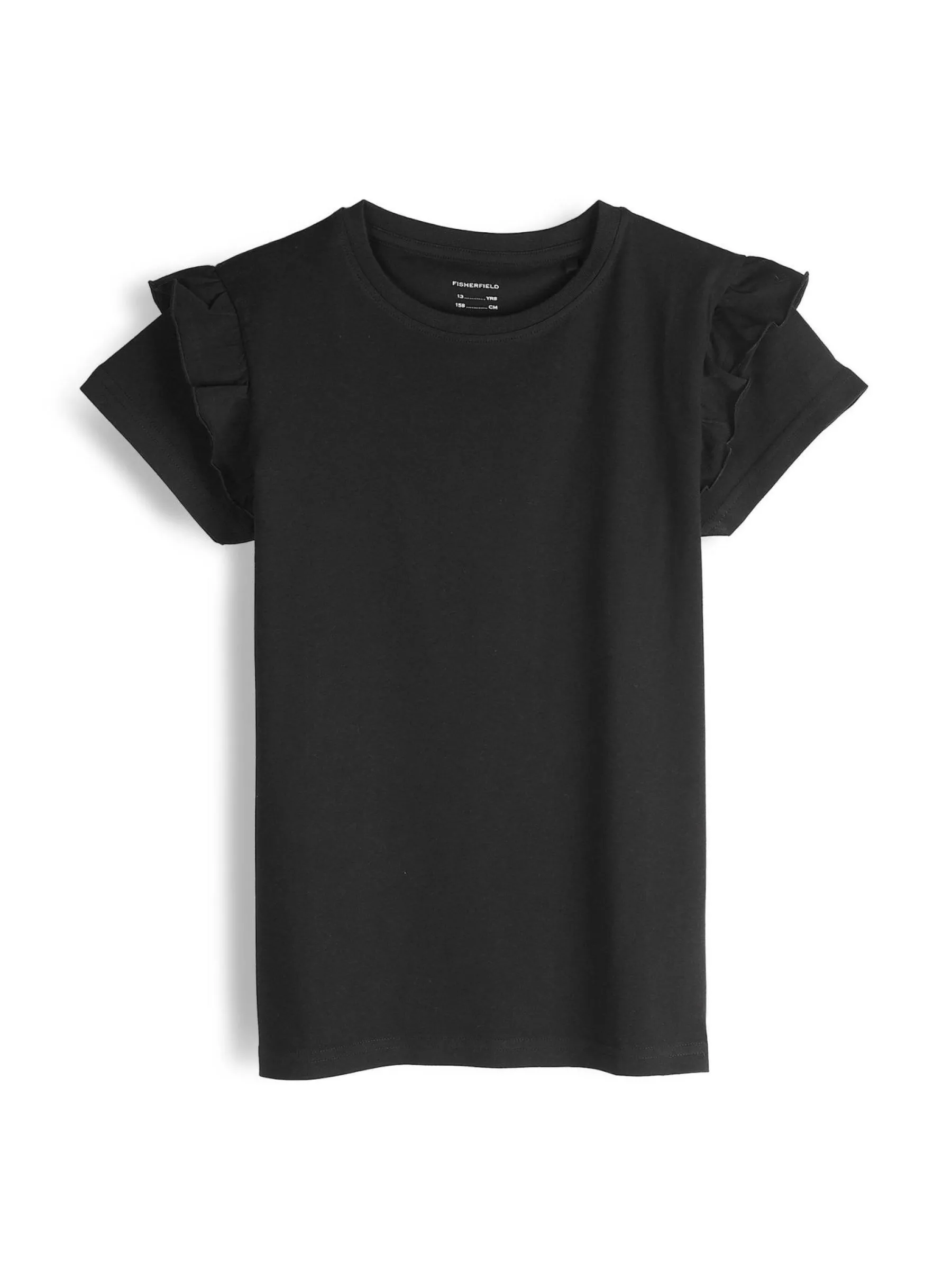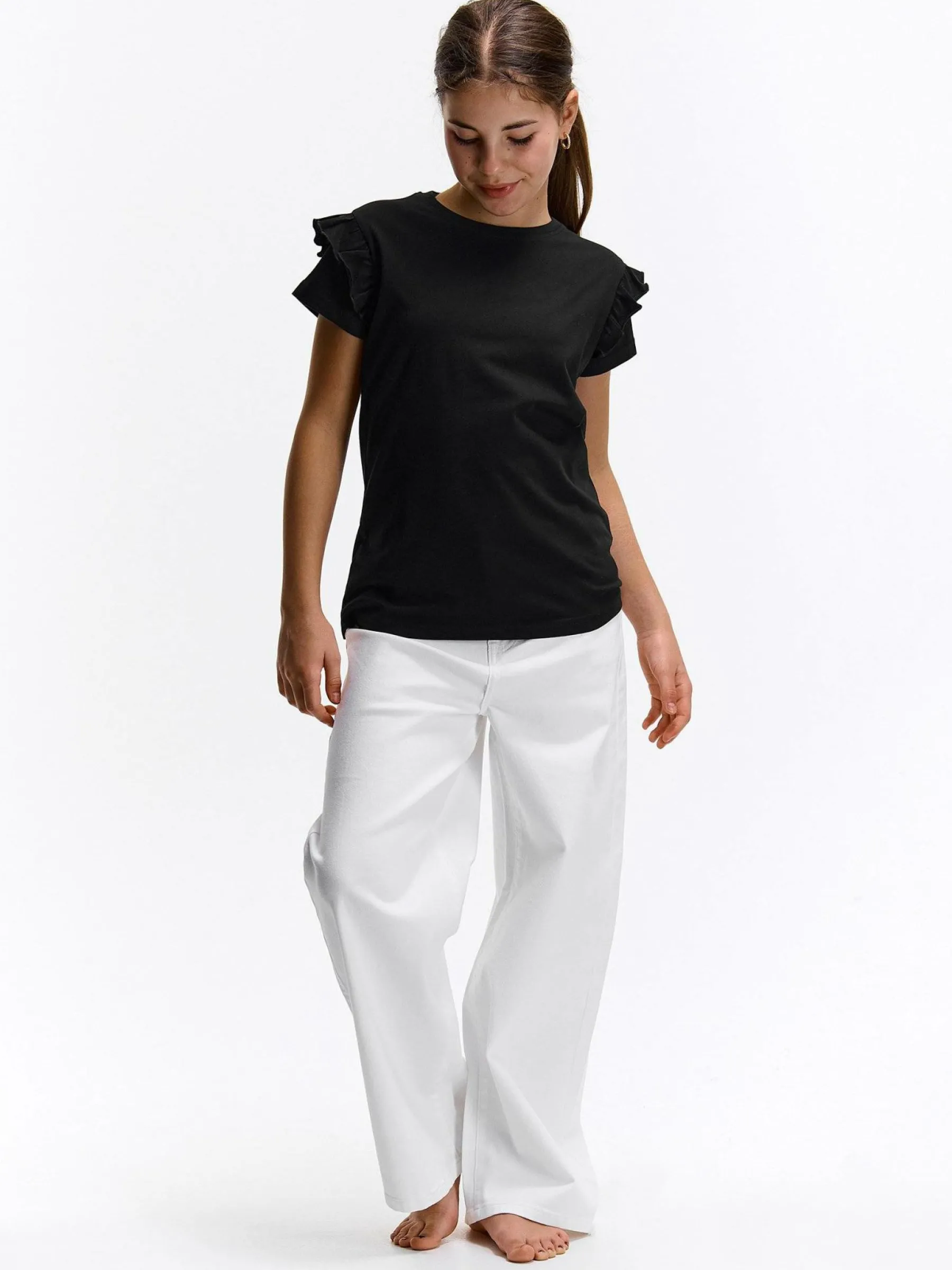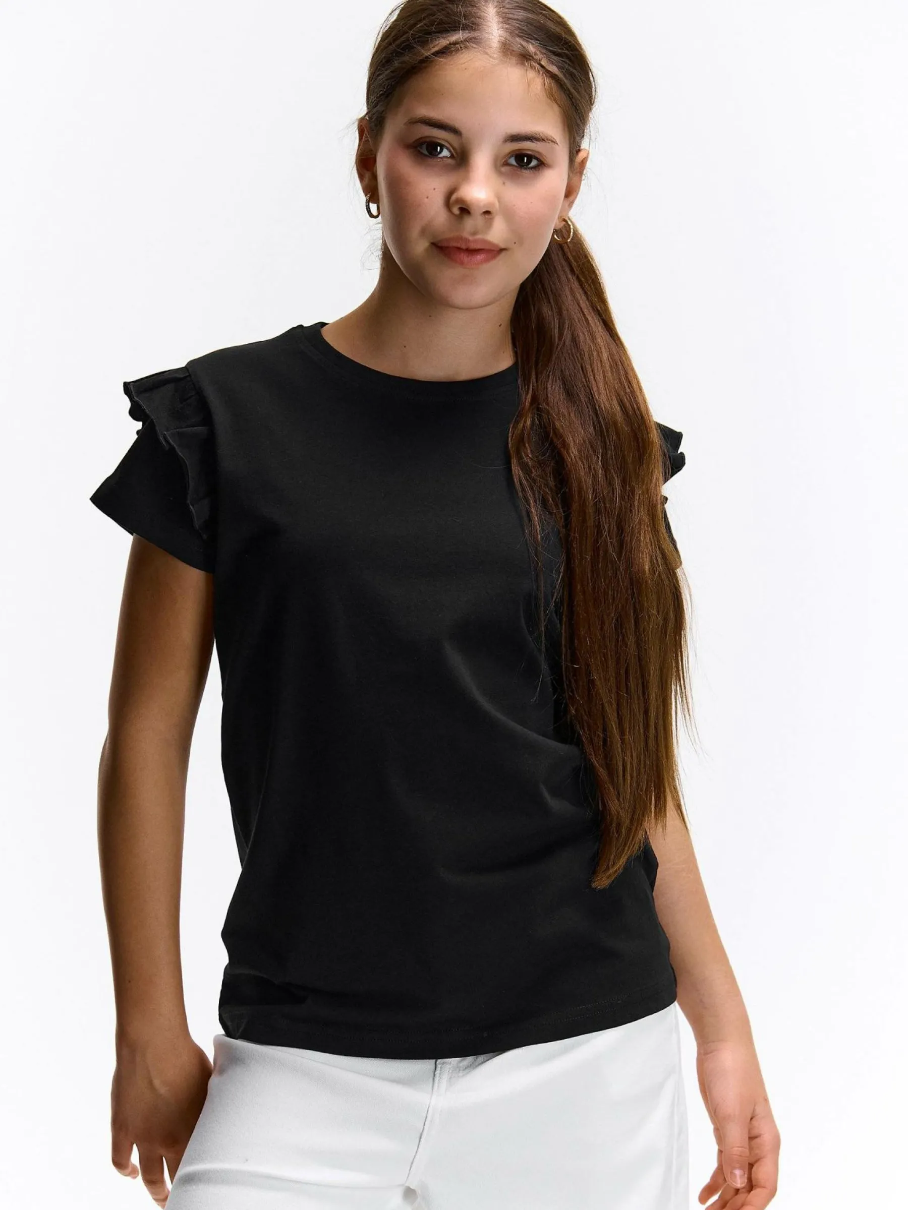 Kolor: czarnyKrój: z falbanąTyp: koszulkaRekaw: krótki rękawDługość: krótkiPattern style: pojedynczy kolorDetal:…