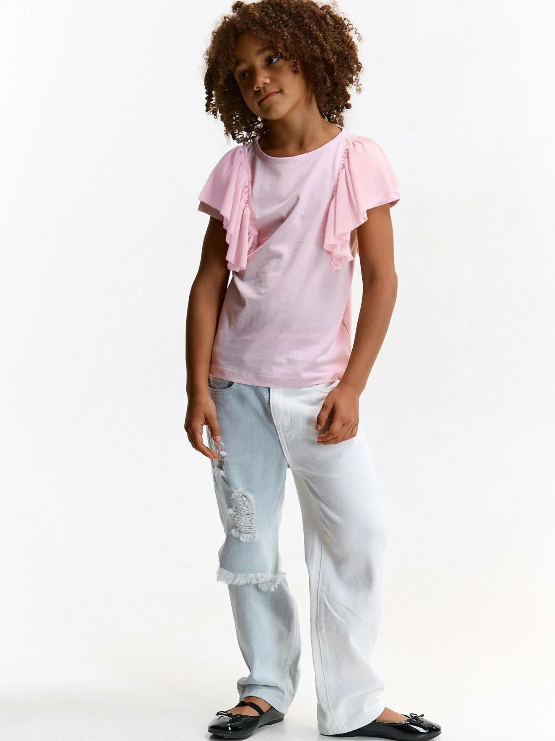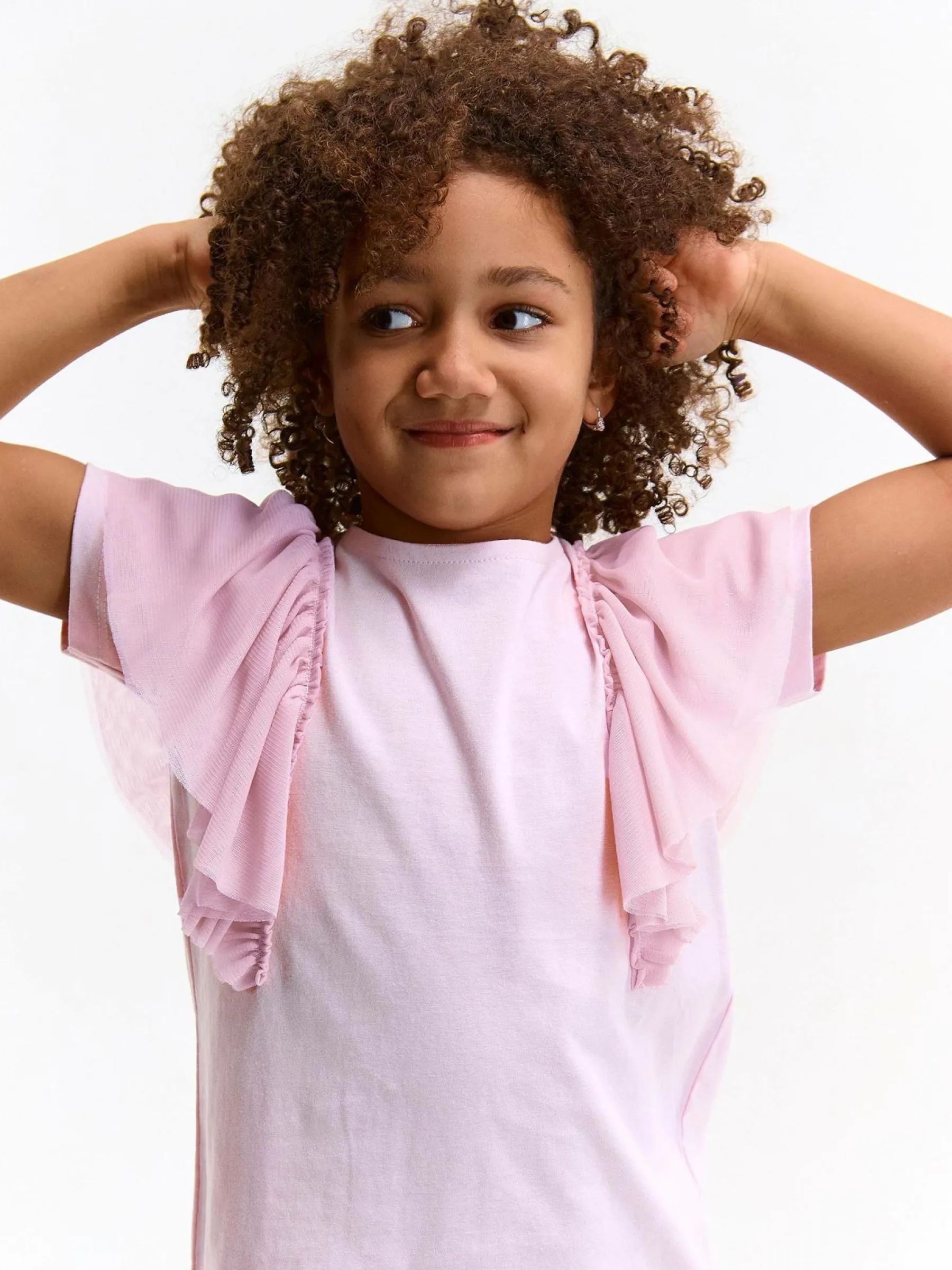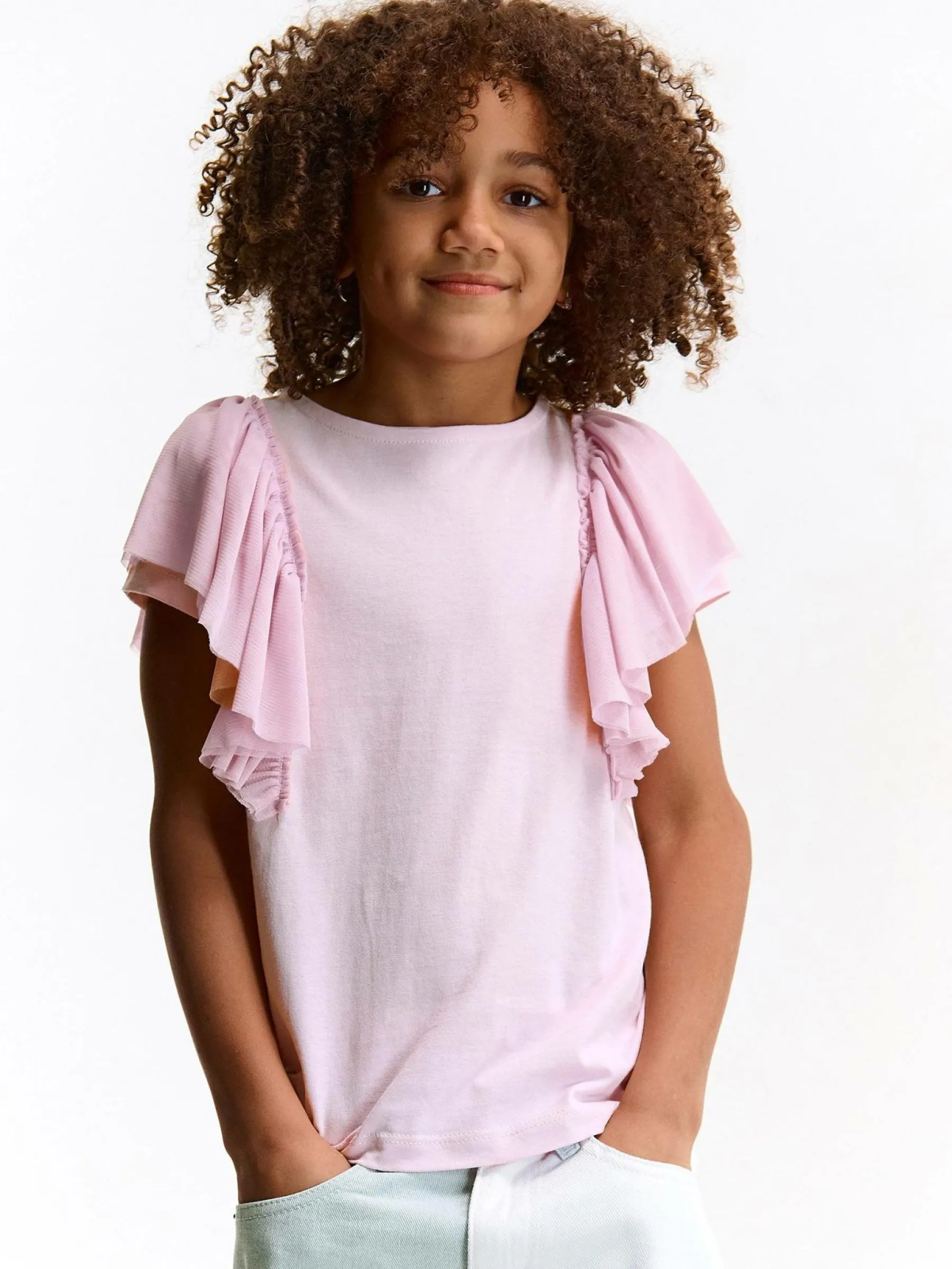Zdjęcia z modelką mogą nie odpowiadać rzeczywistemu kolorowi produktu.Kolor: różowyKrój: z falbanąTyp: koszulkaR…