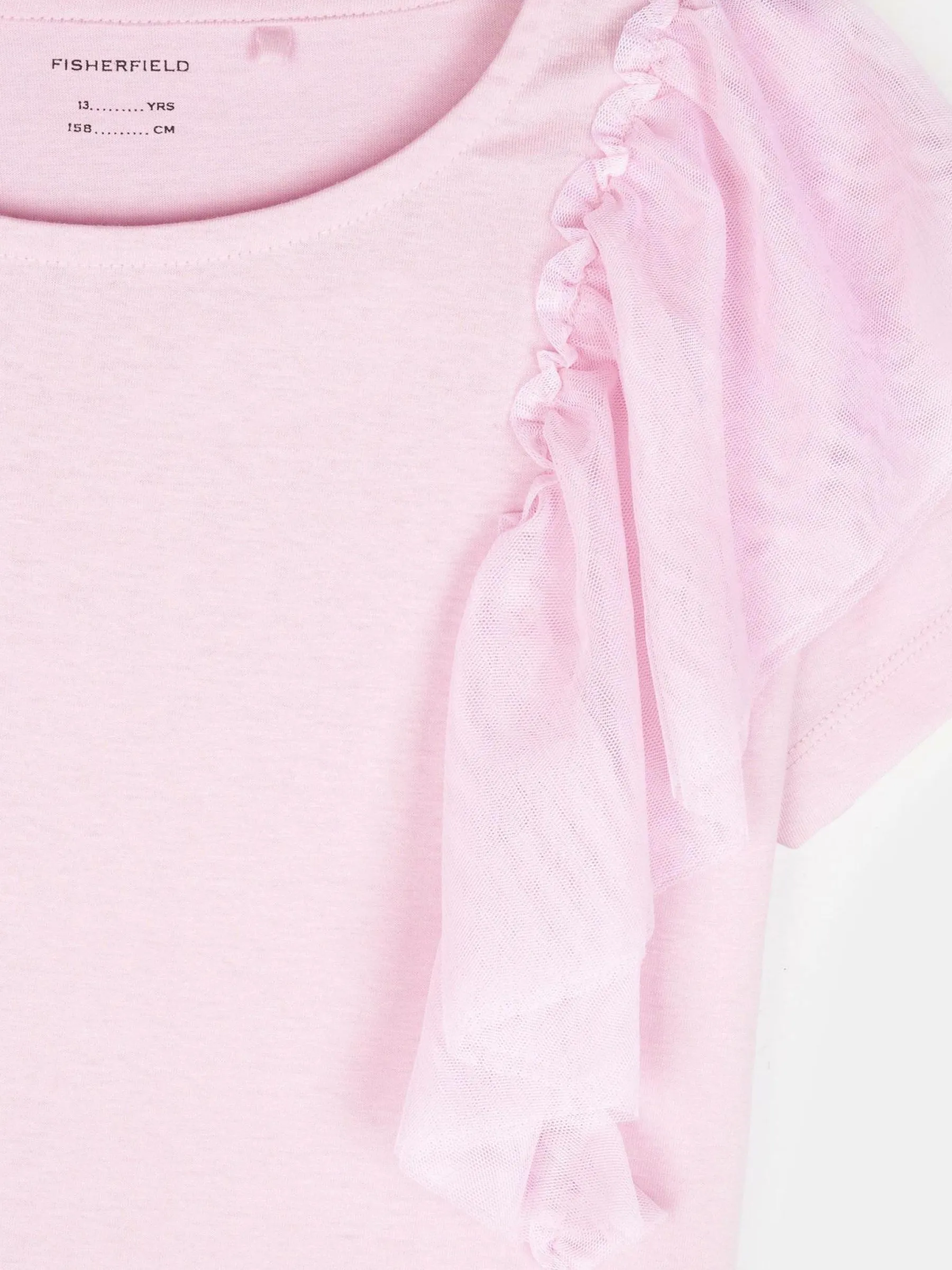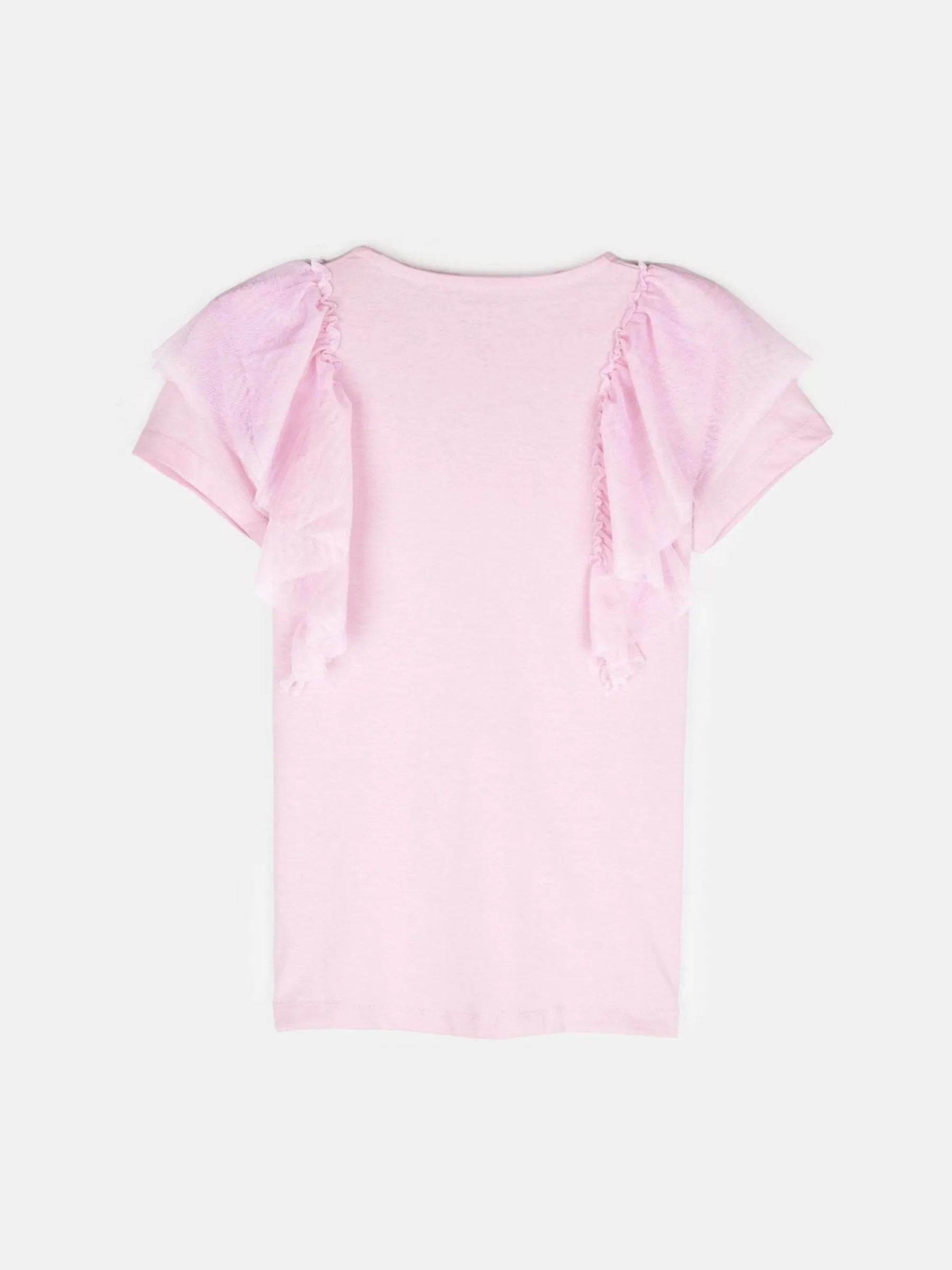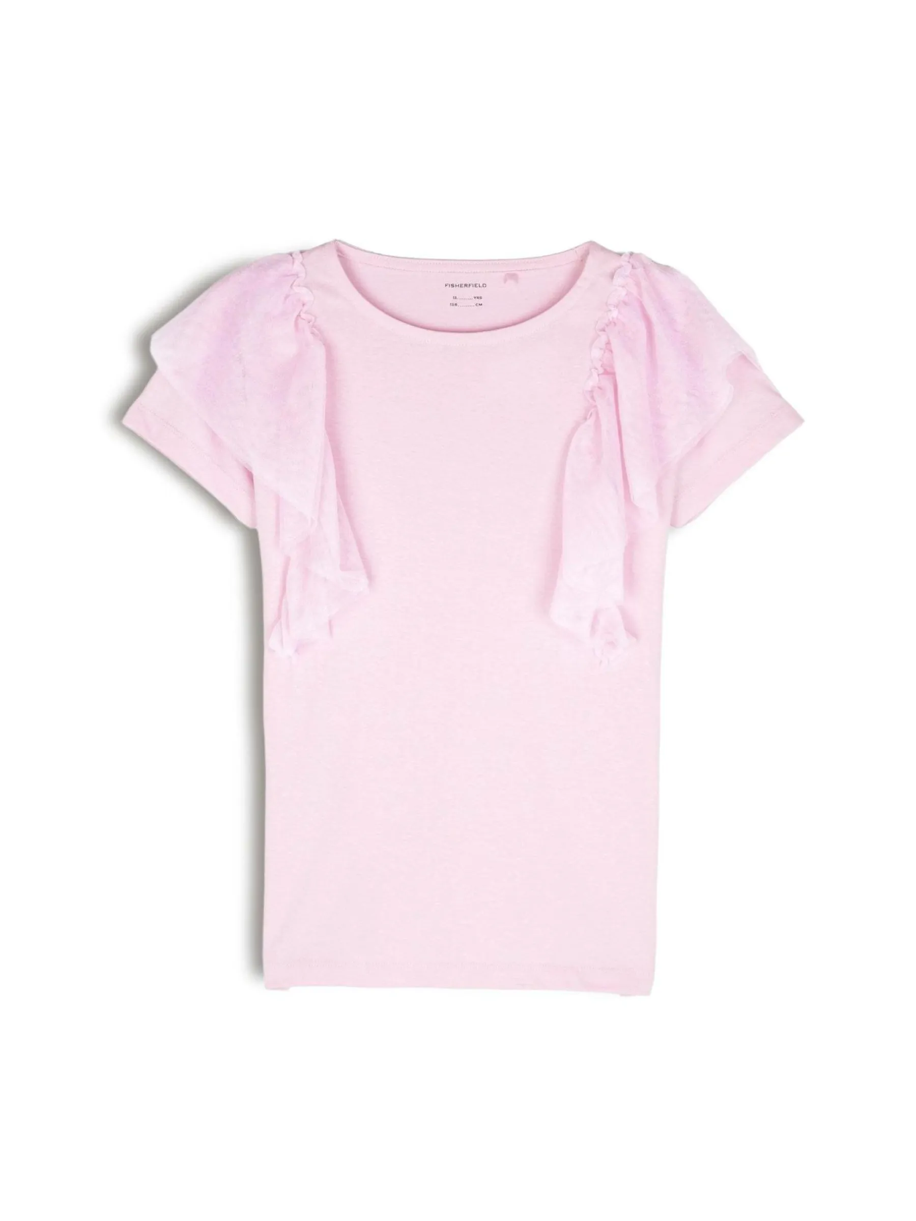 Zdjęcia z modelką mogą nie odpowiadać rzeczywistemu kolorowi produktu.Kolor: różowyKrój: z falbanąTyp: koszulkaR…