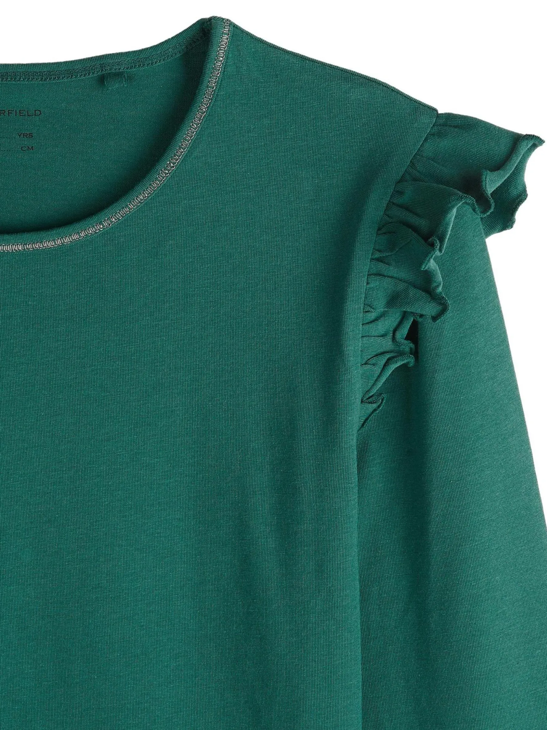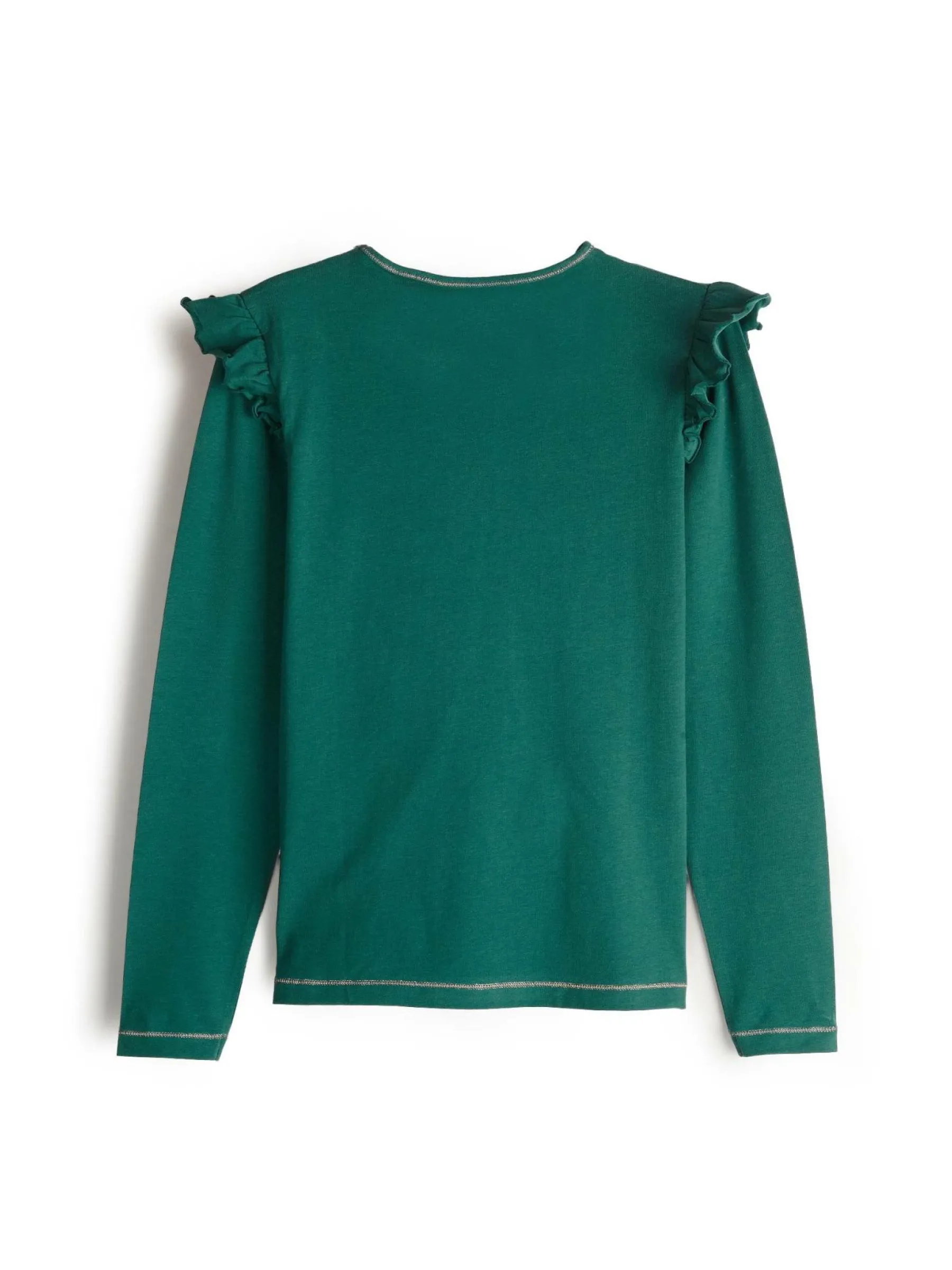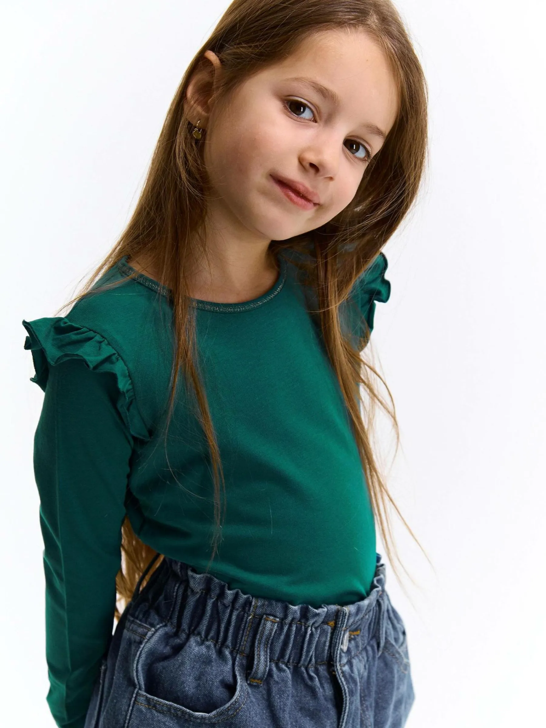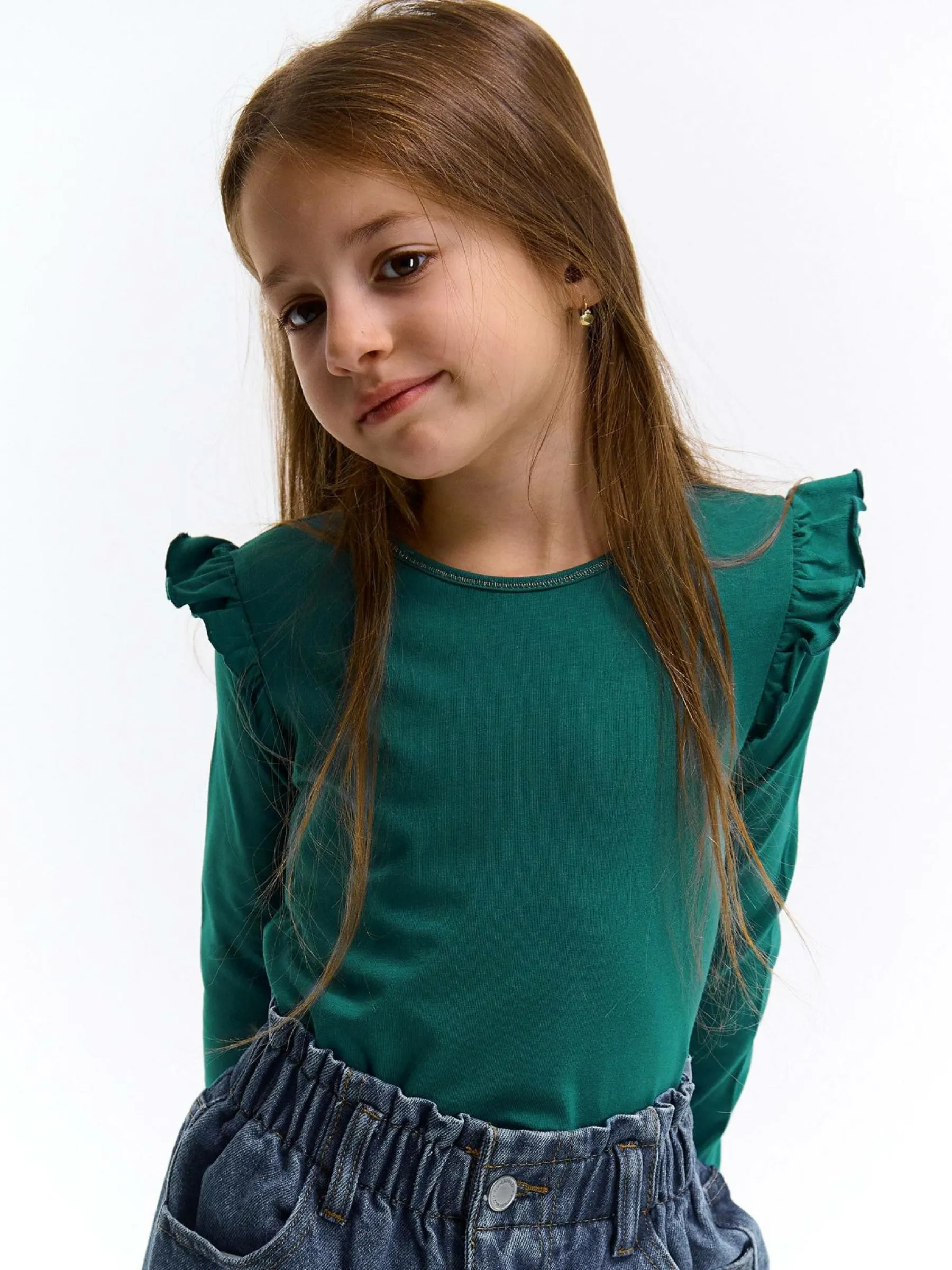 Kolor: zielonyKrój: z falbanąTyp: koszulkaRekaw: długi rękawDługość: krótkiPattern style: pojedynczy kolorDetal:…