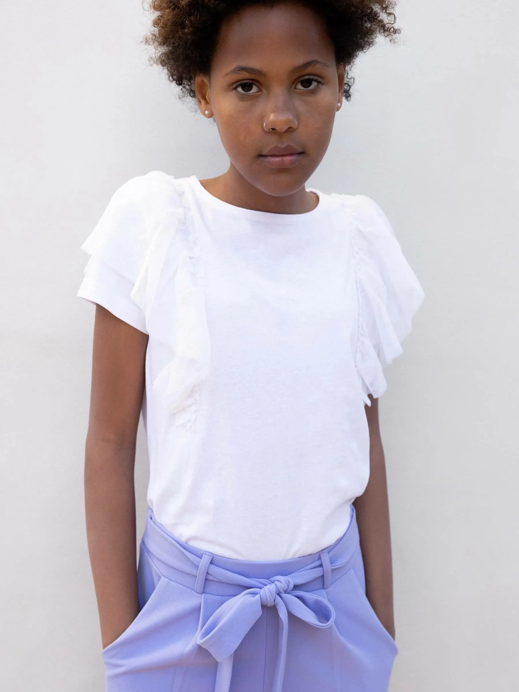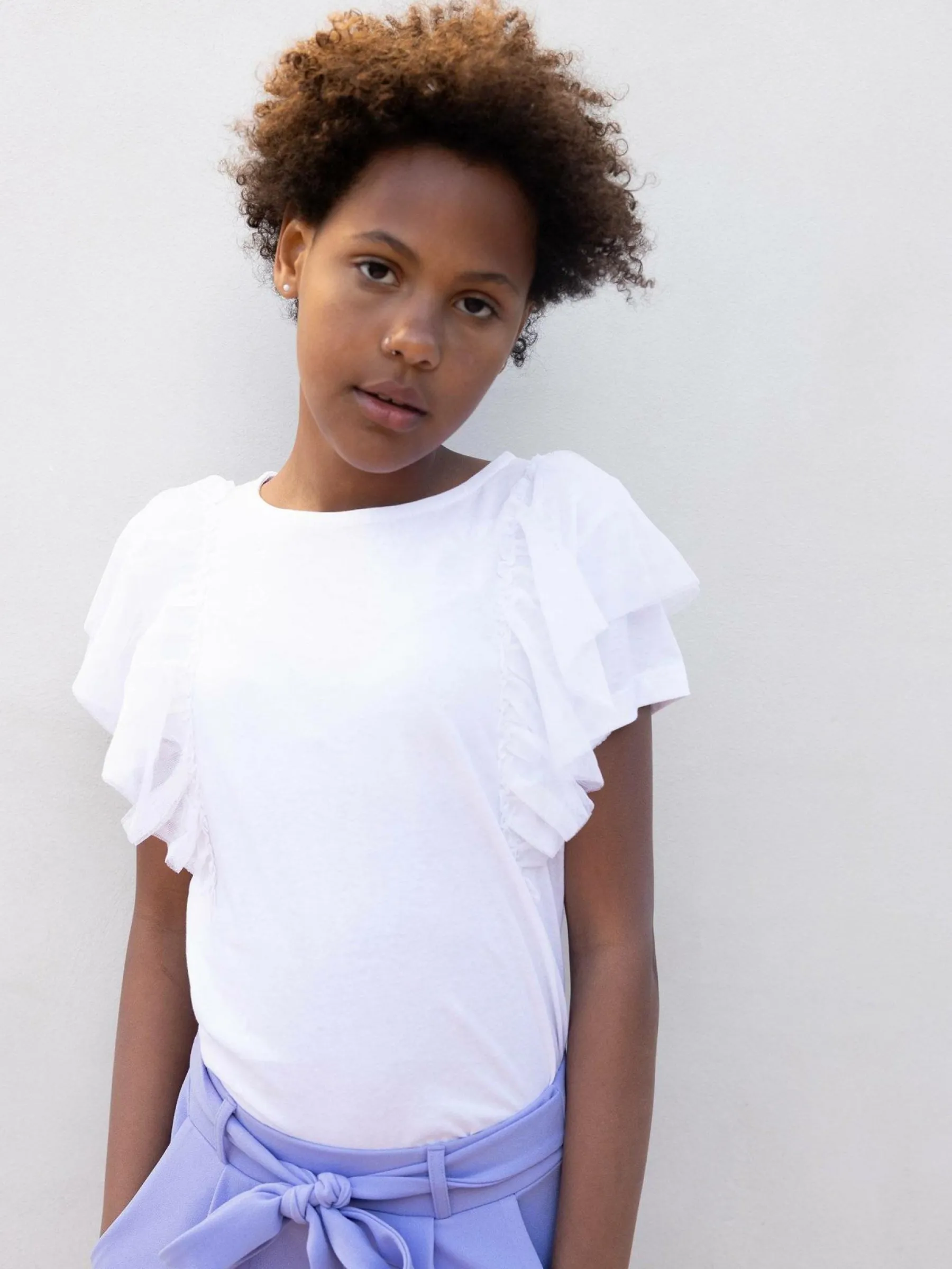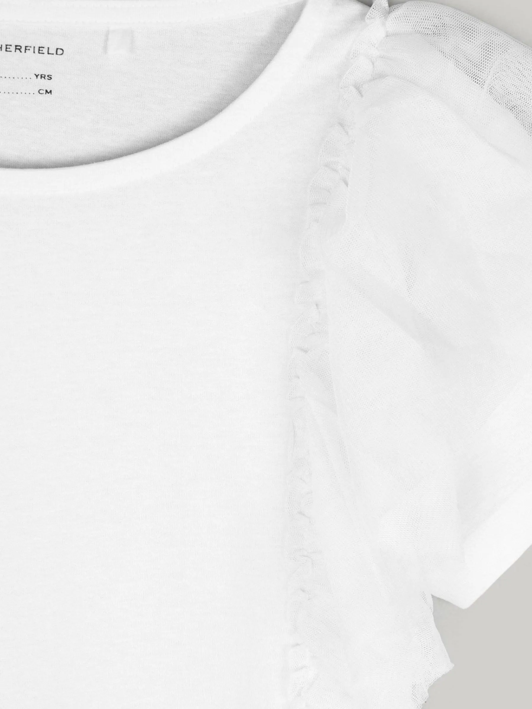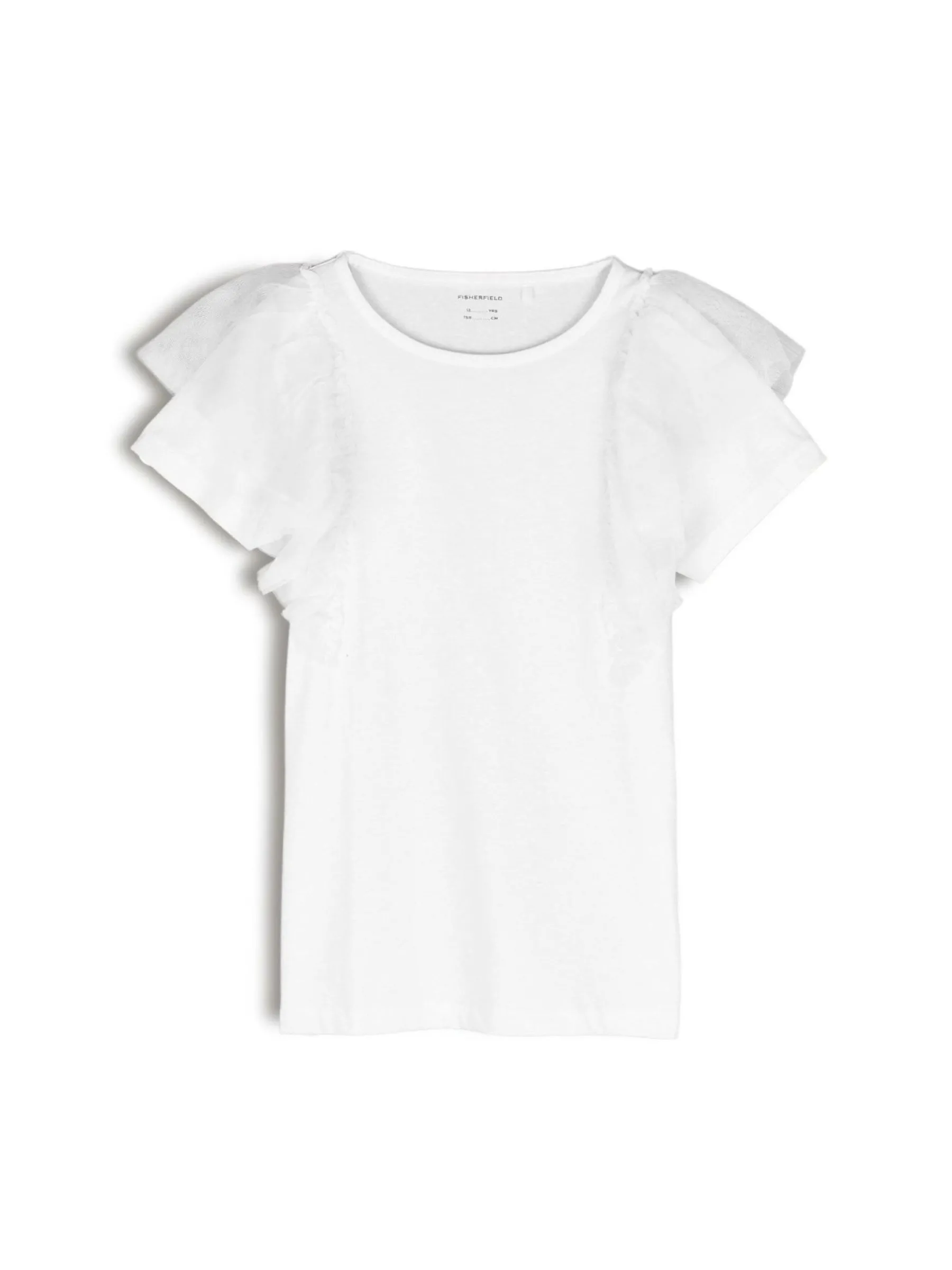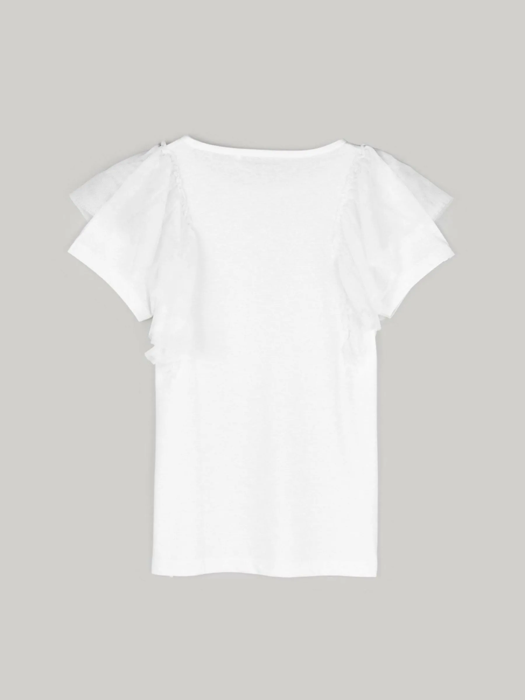 Kolor: białyKrój: z falbanąTyp: koszulkaRekaw: krótki rękawDługość: krótkiPattern style: pojedynczy kolorDetal:…