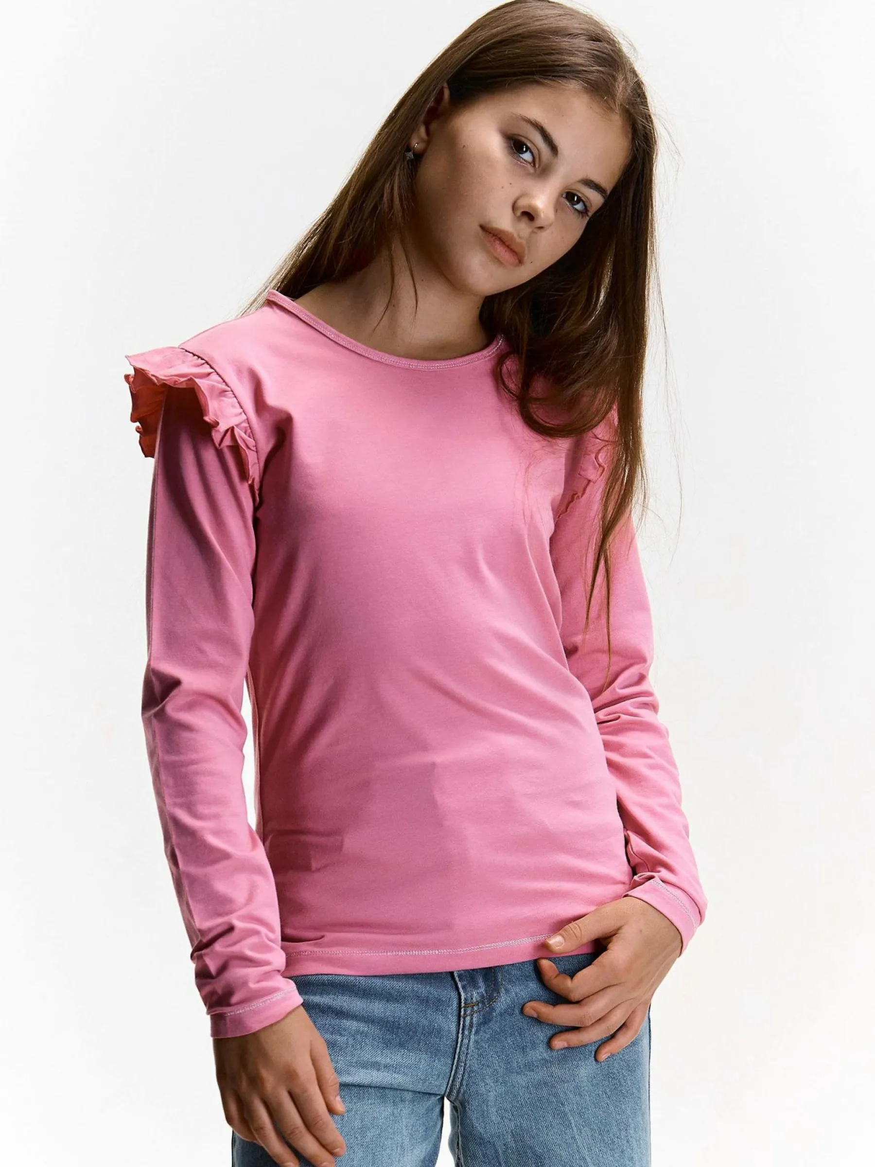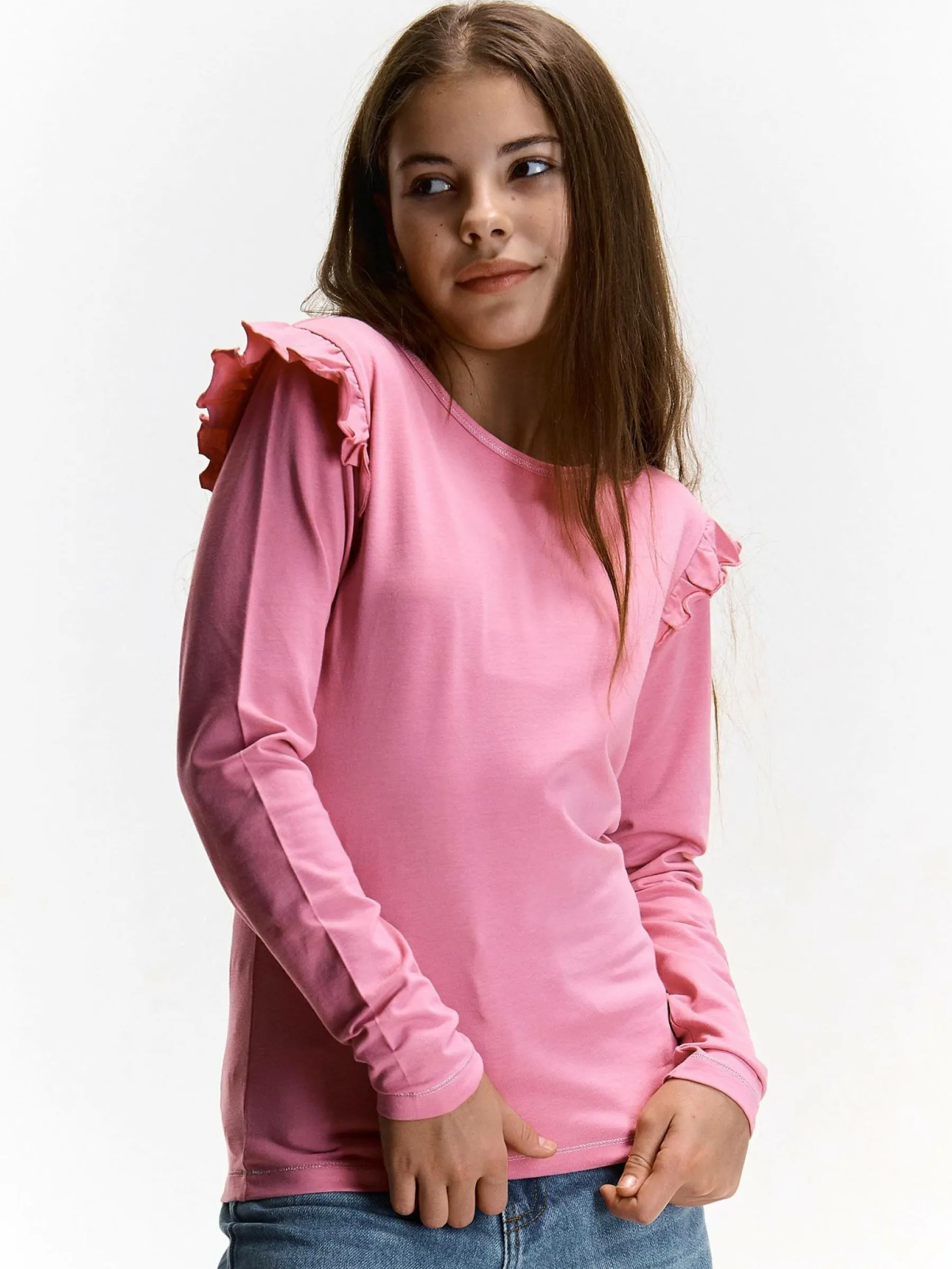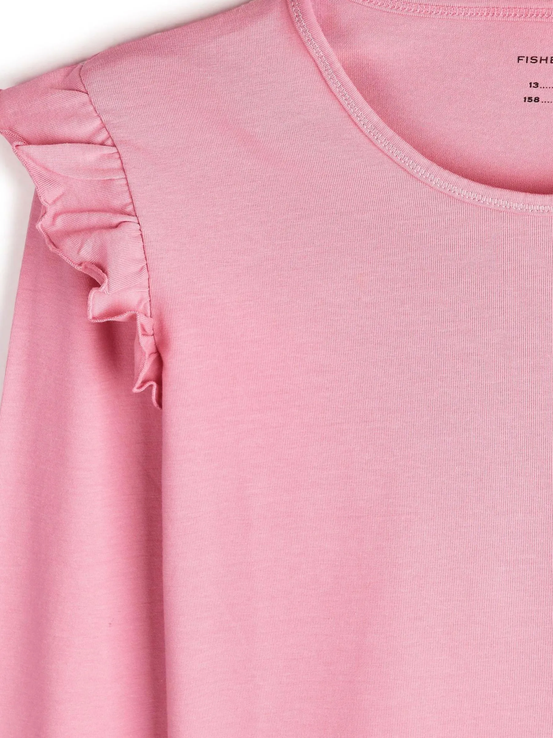 Kolor: różowyKrój: z falbanąTyp: koszulkaRekaw: długi rękawDługość: krótkiPattern style: pojedynczy kolorDetal…