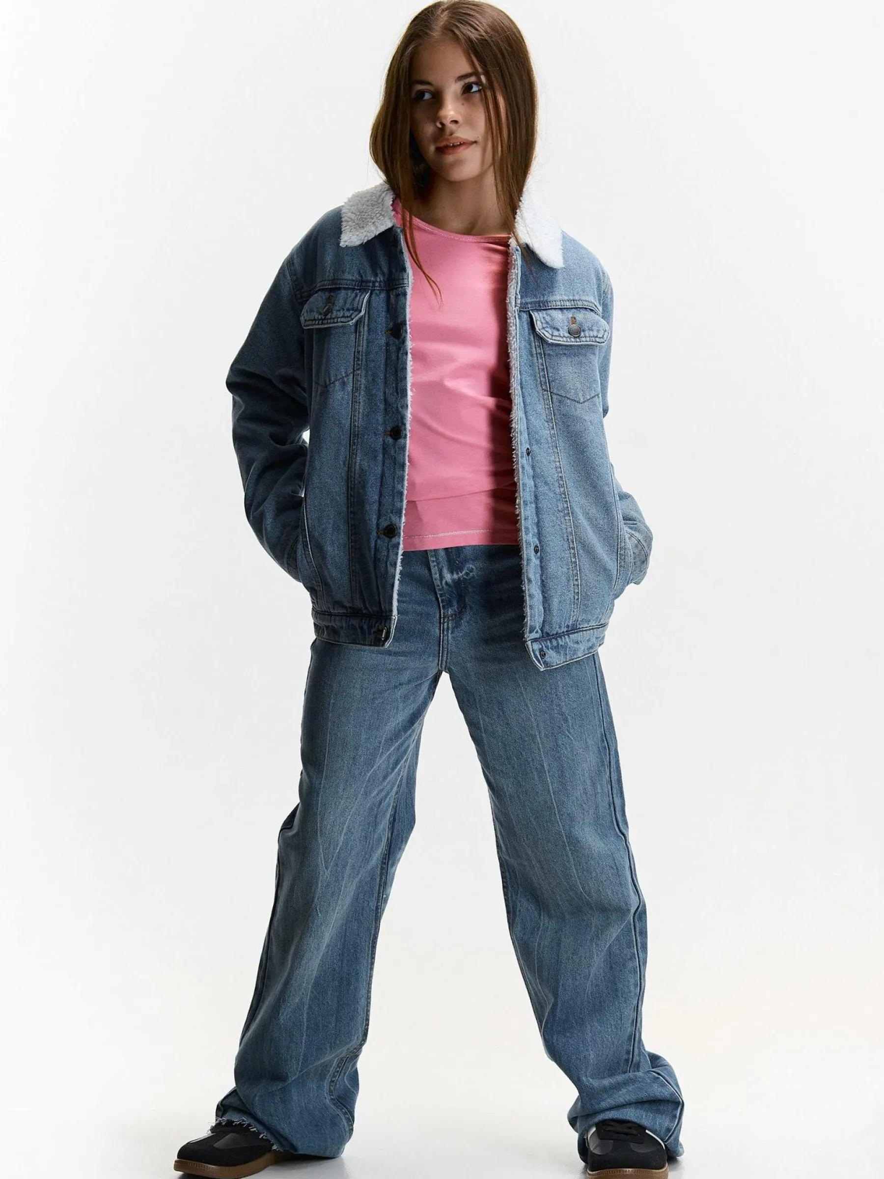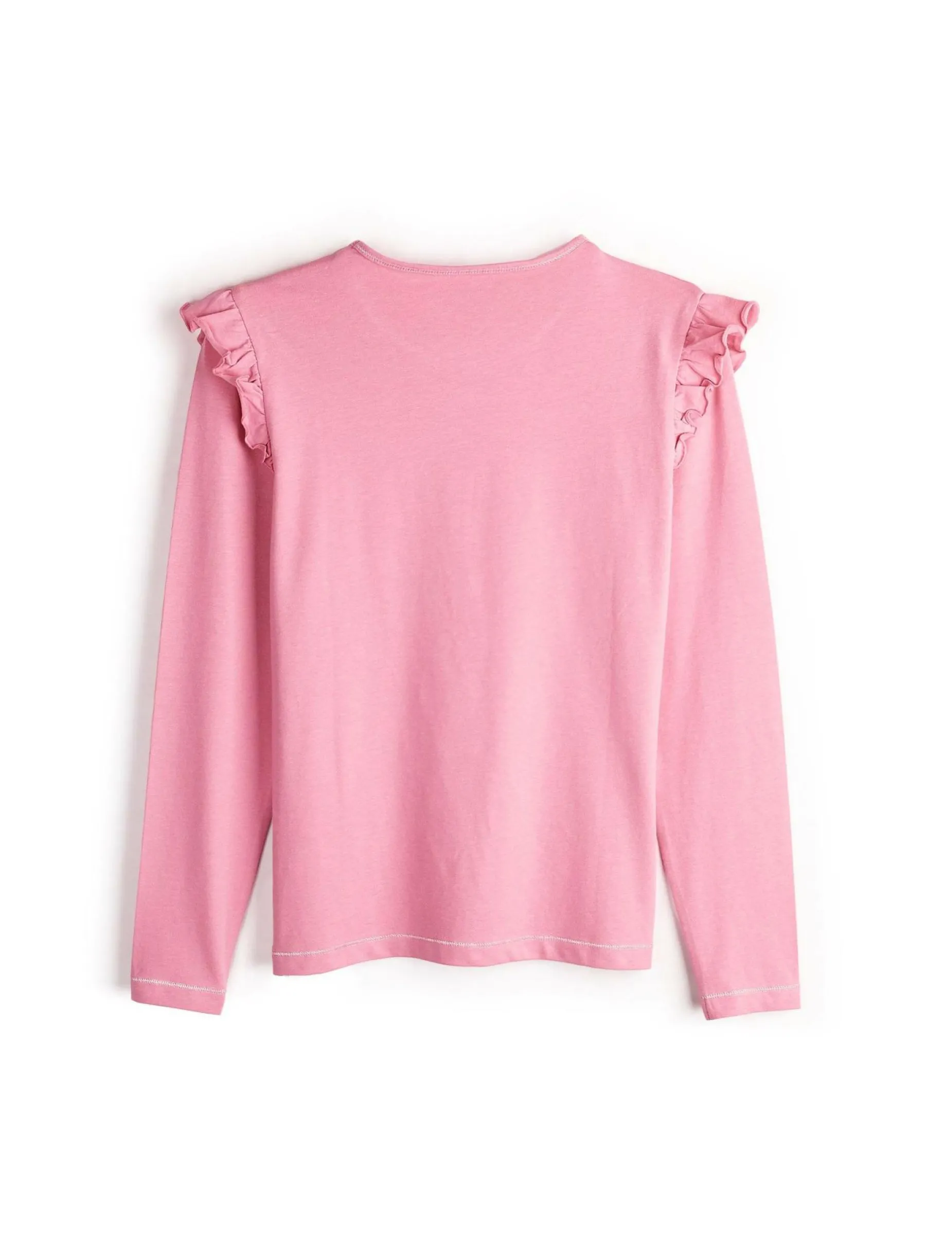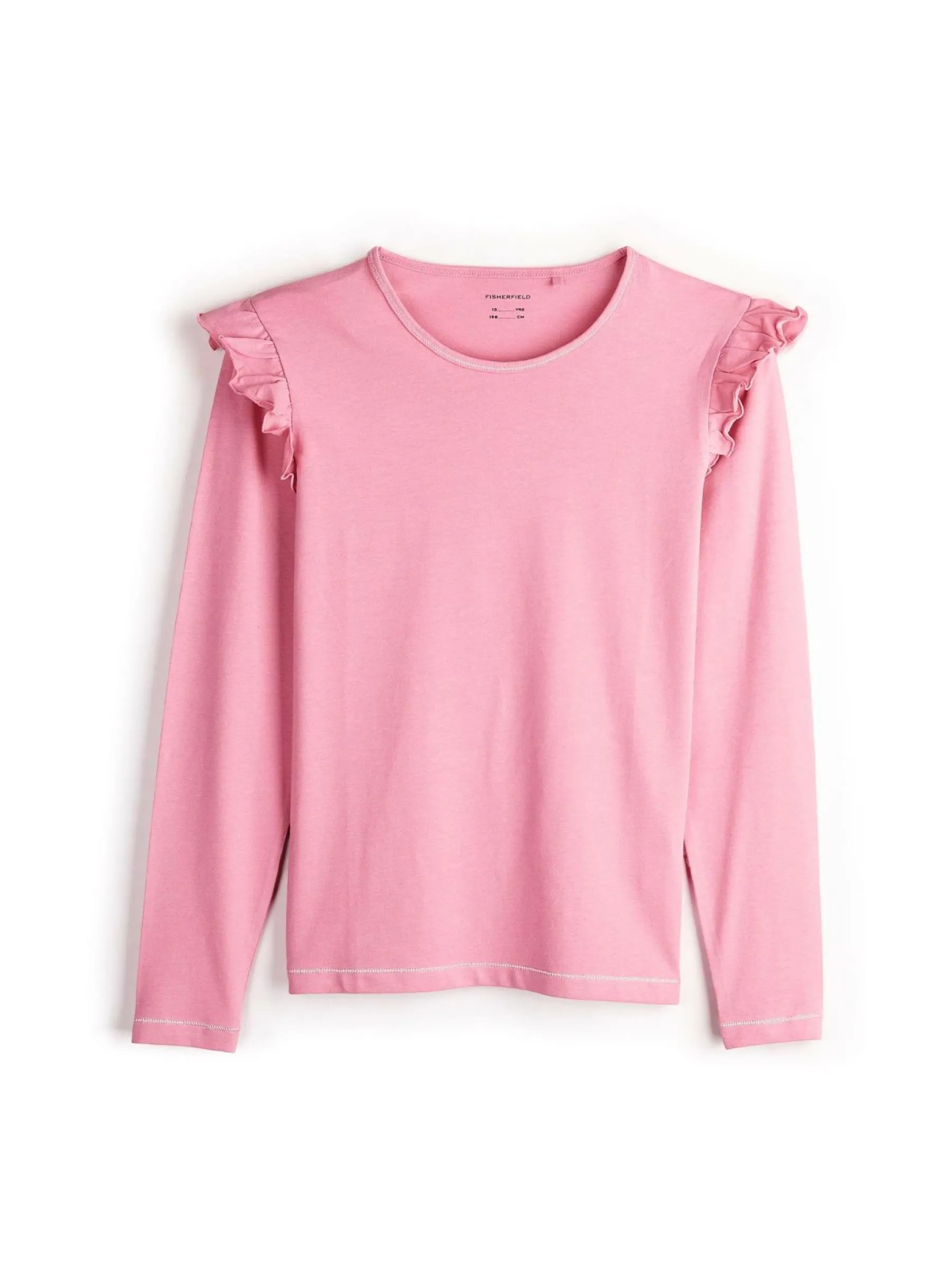 Kolor: różowyKrój: z falbanąTyp: koszulkaRekaw: długi rękawDługość: krótkiPattern style: pojedynczy kolorDetal…