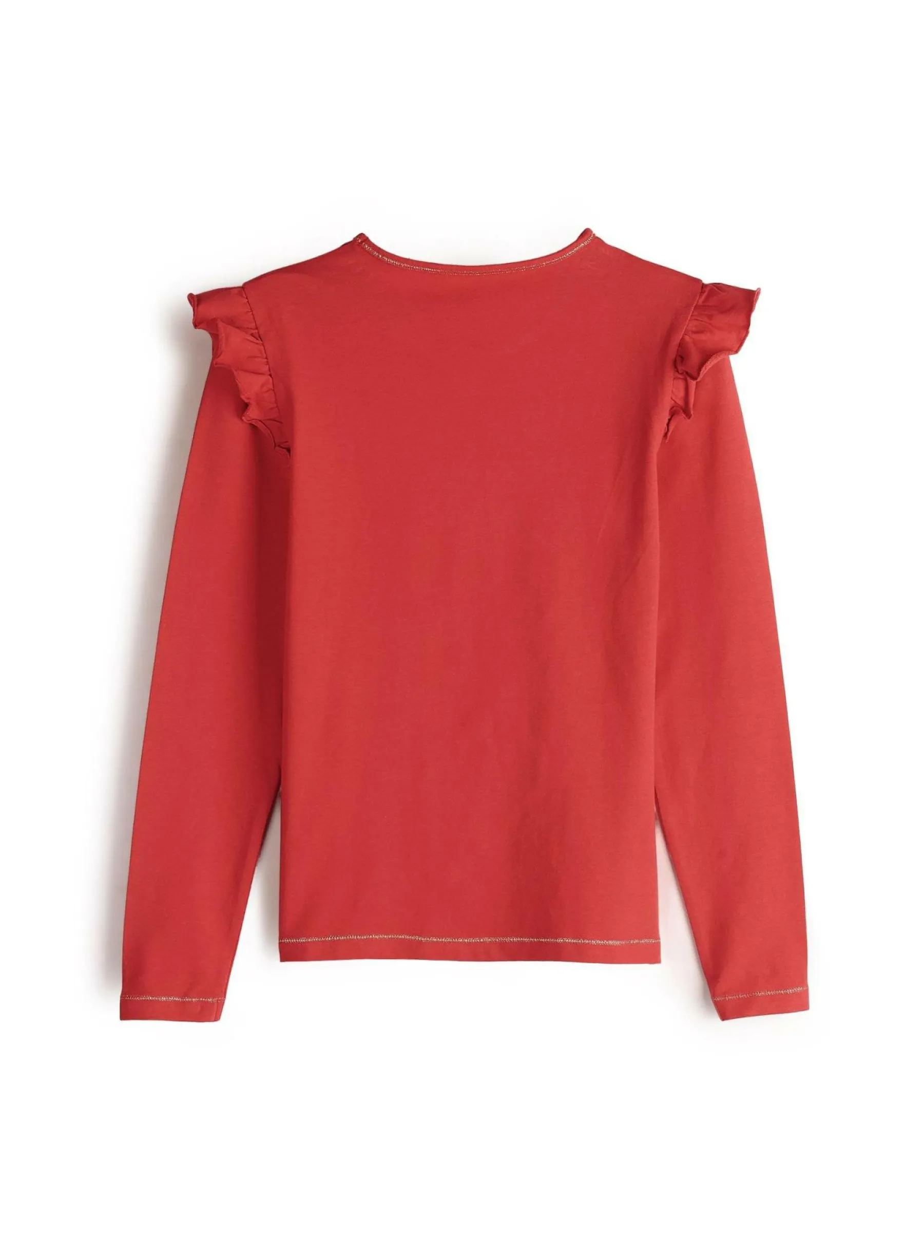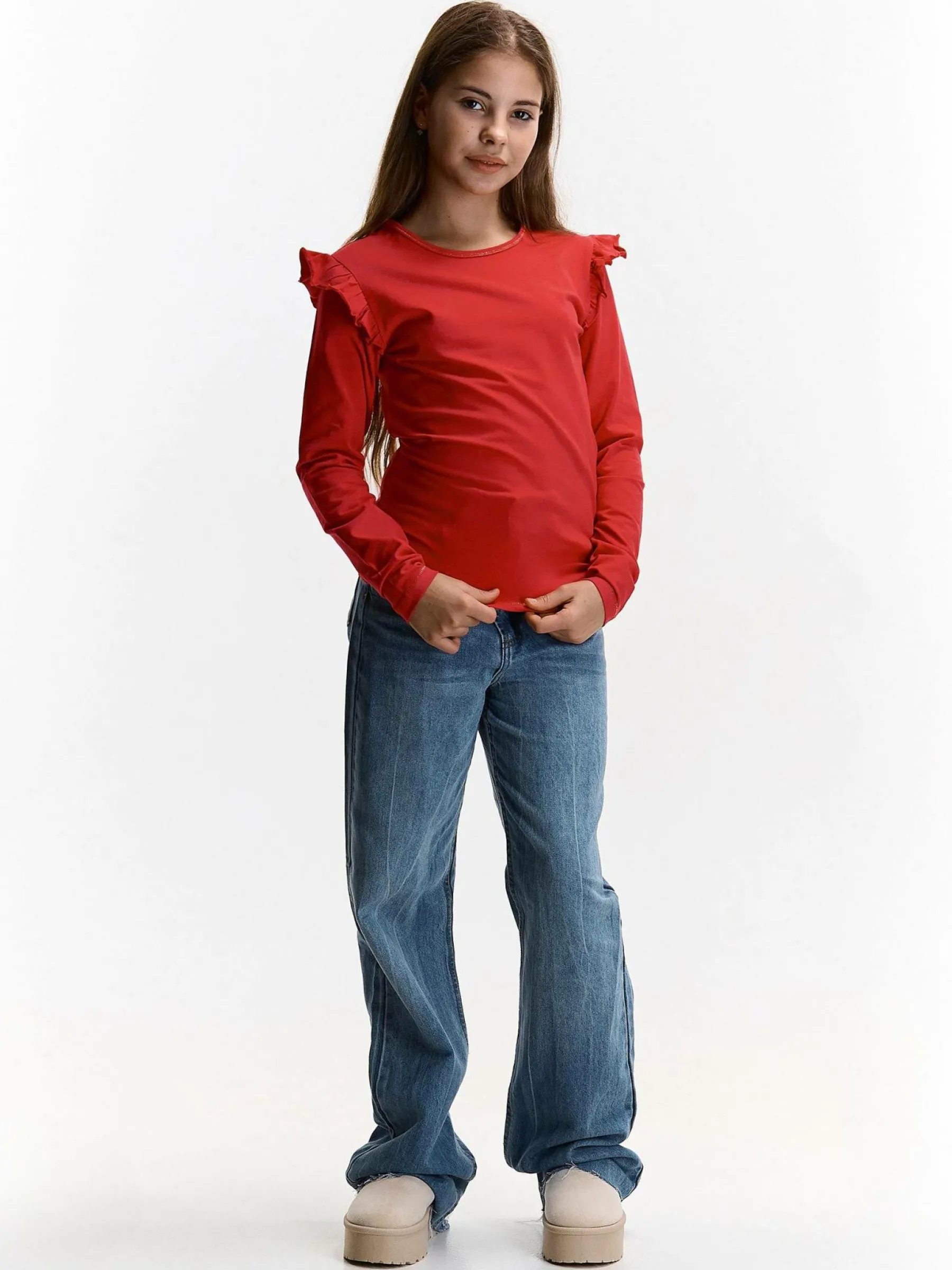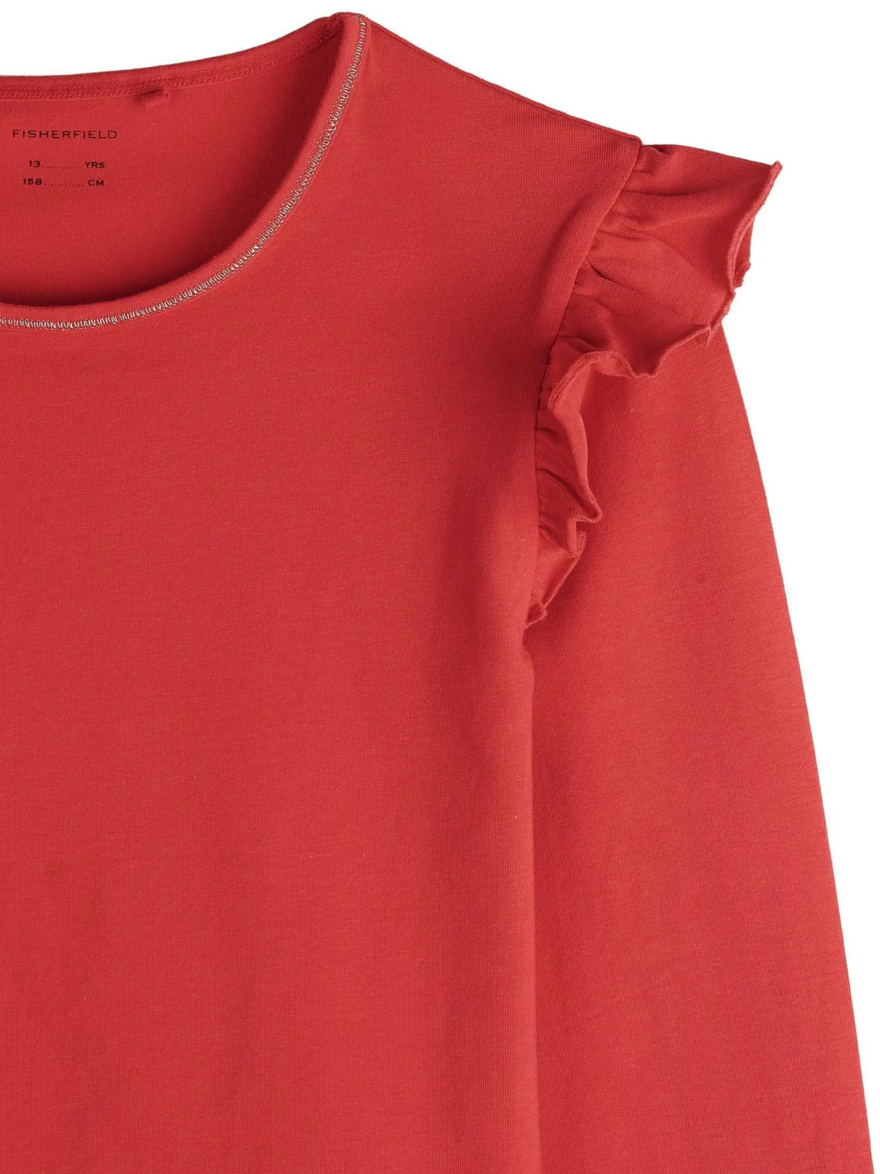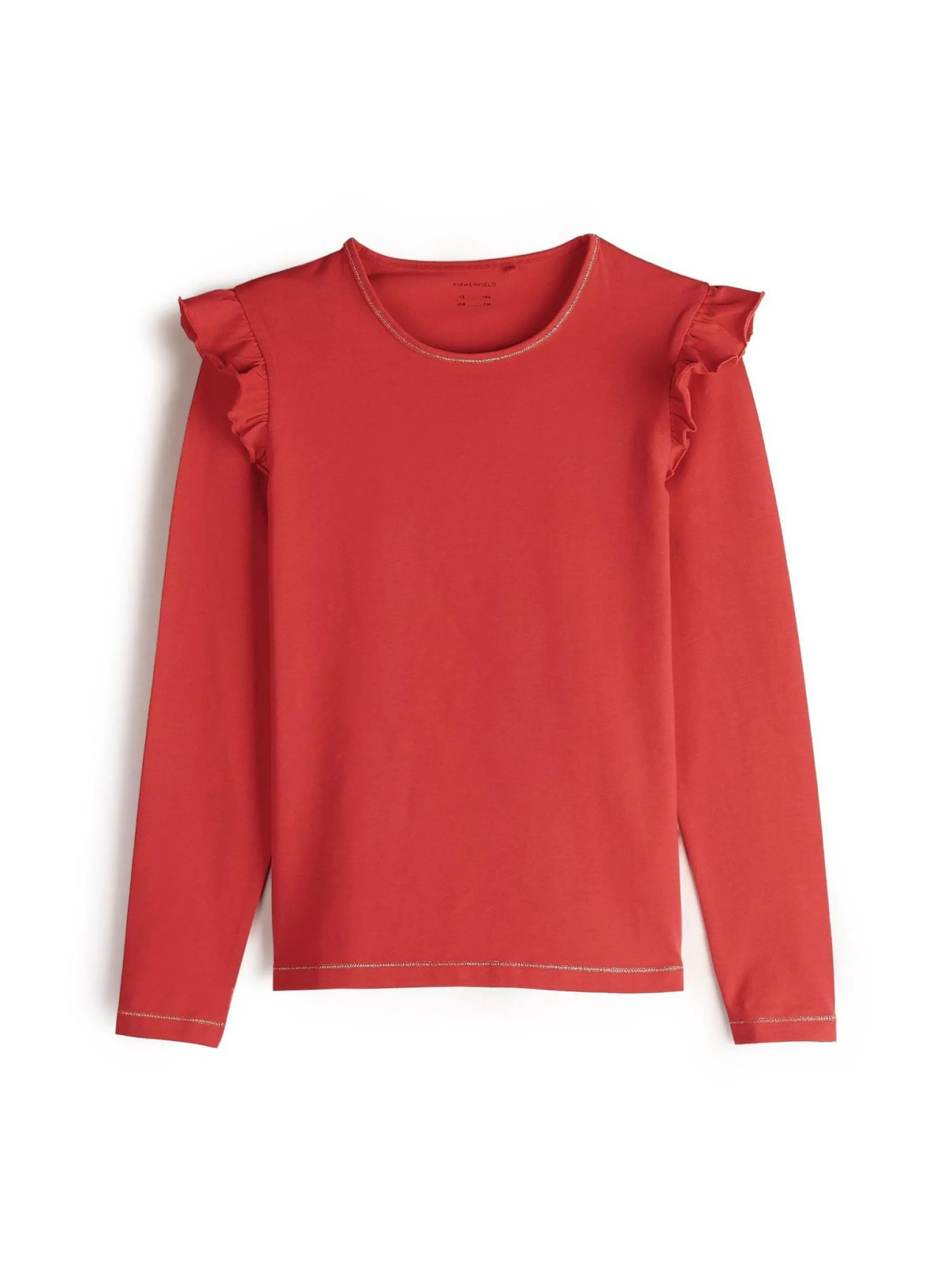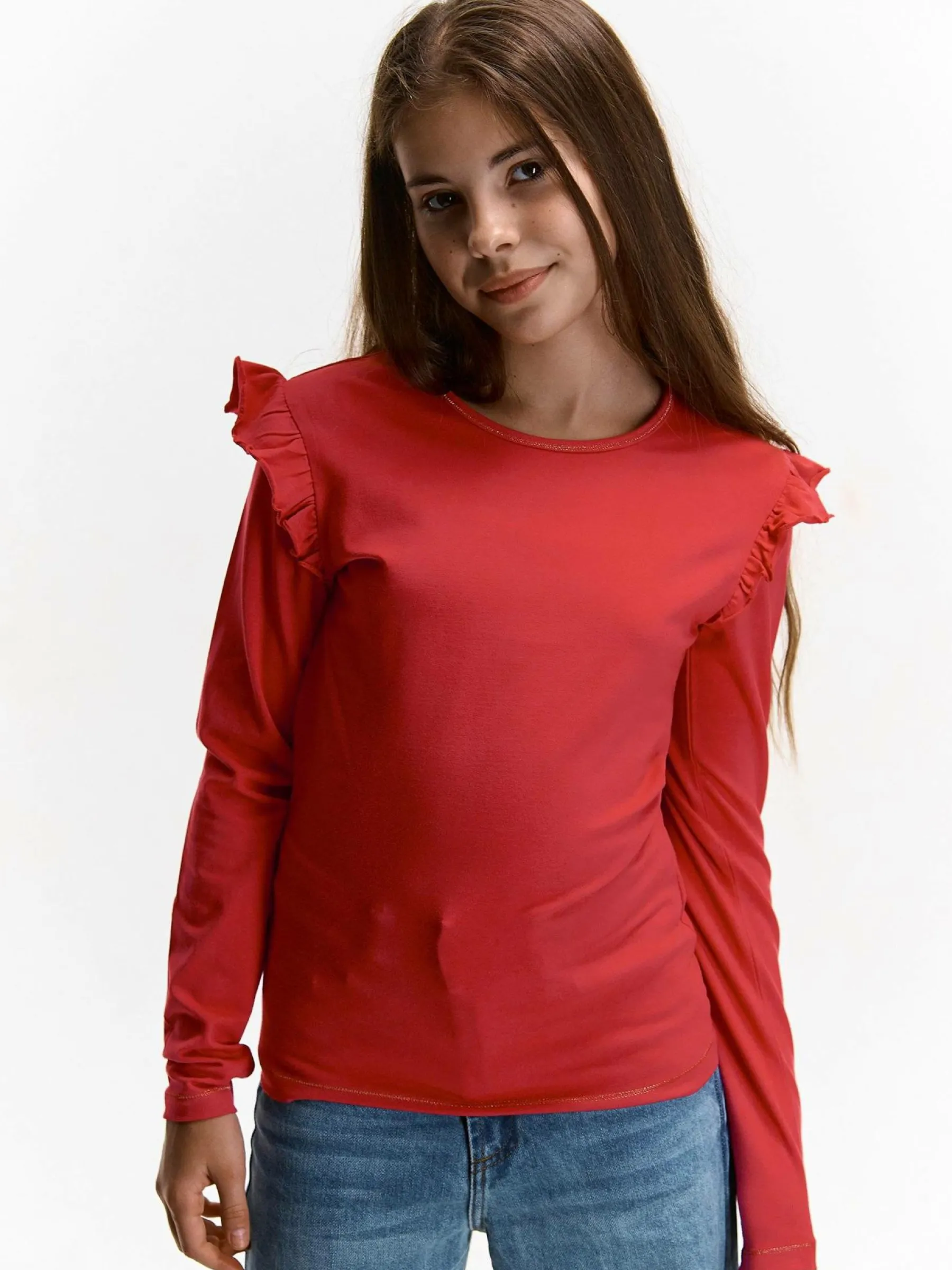 Kolor: czerwonyKrój: z falbanąTyp: koszulkaRekaw: długi rękawDługość: krótkiPattern style: pojedynczy kolorDetal…