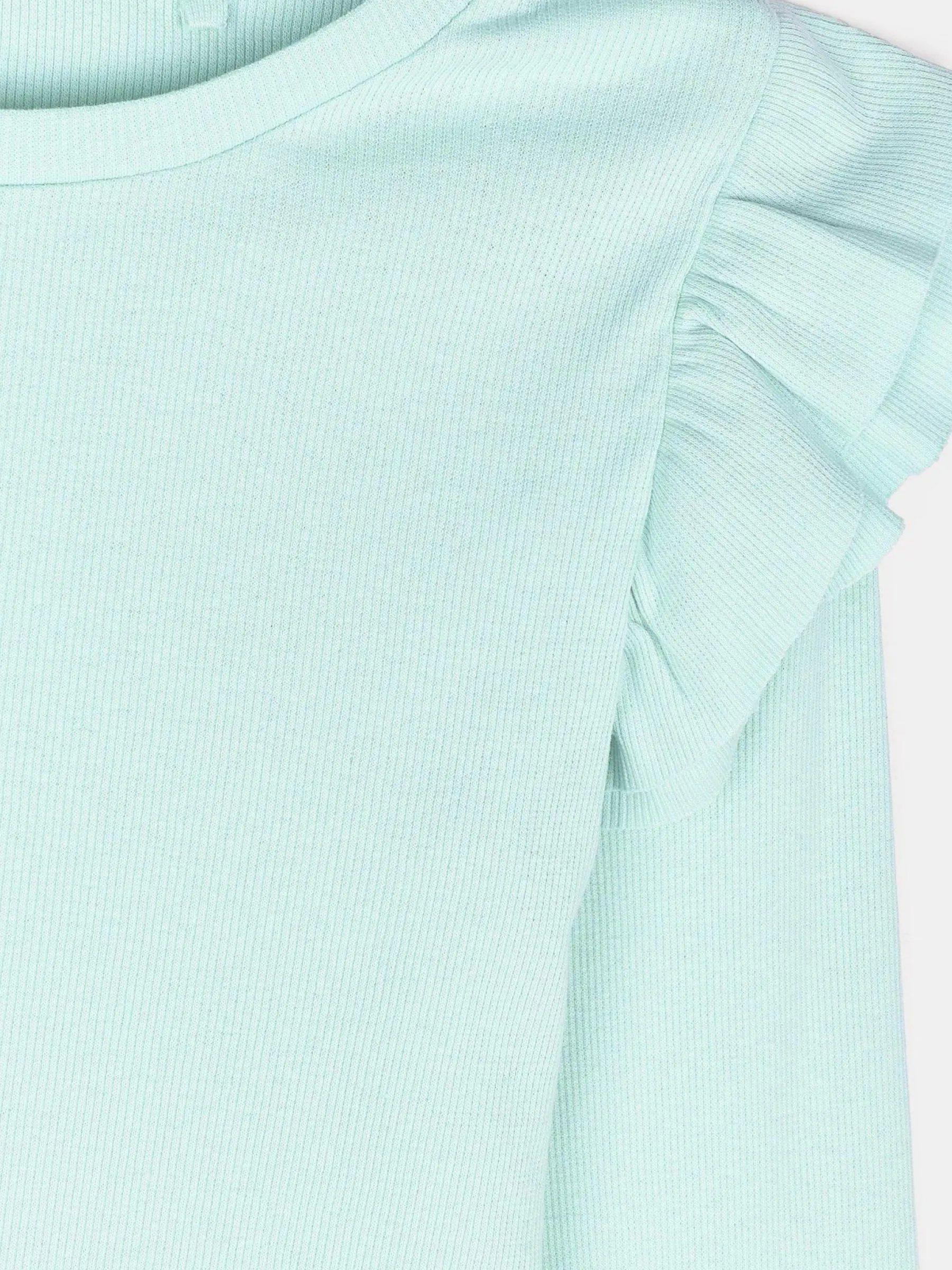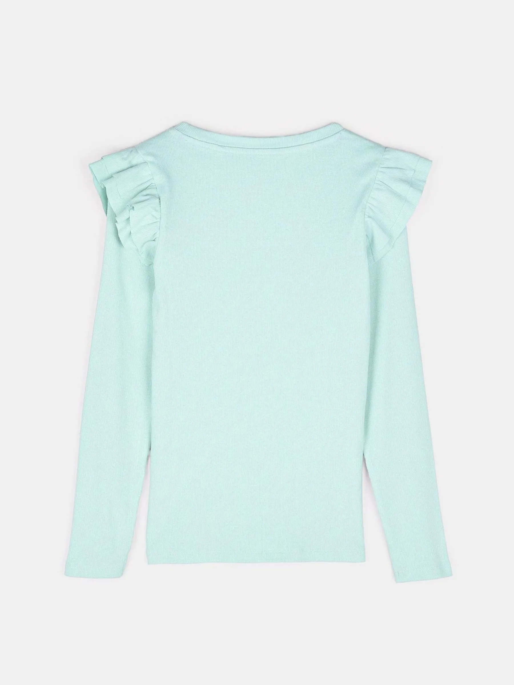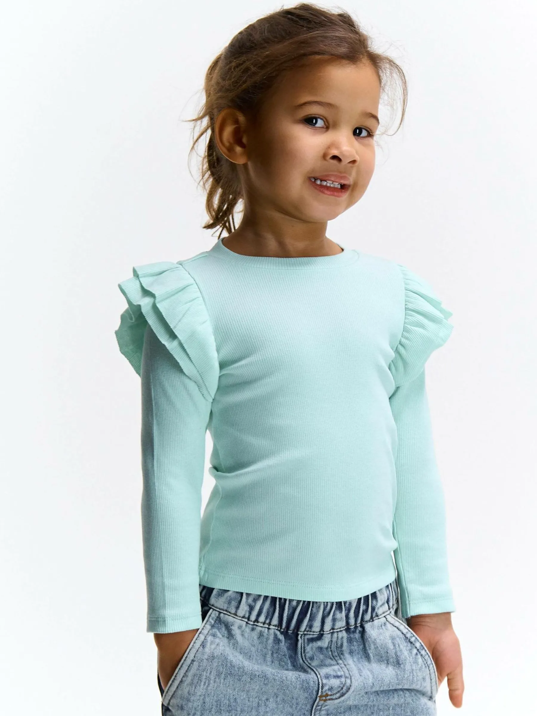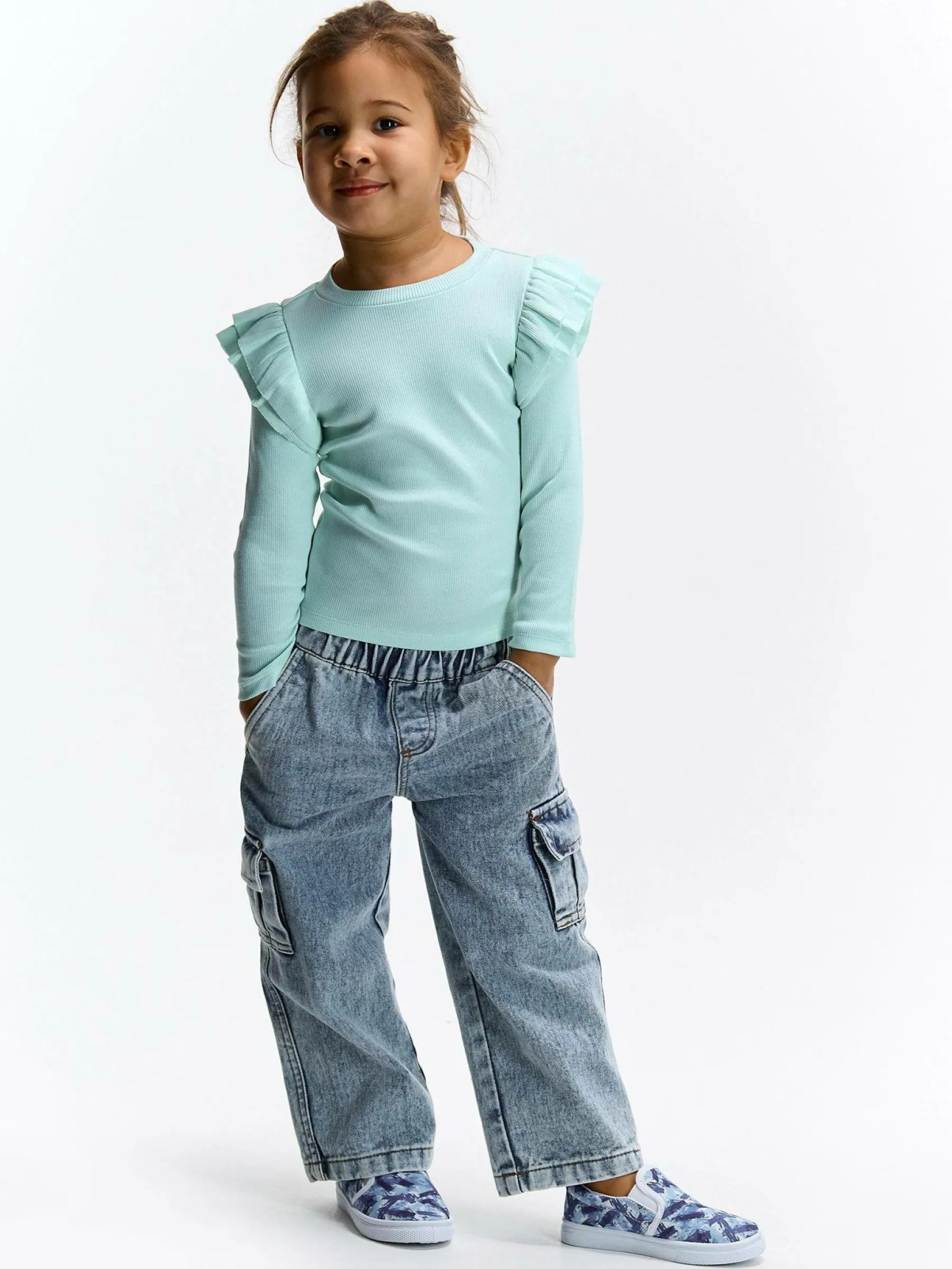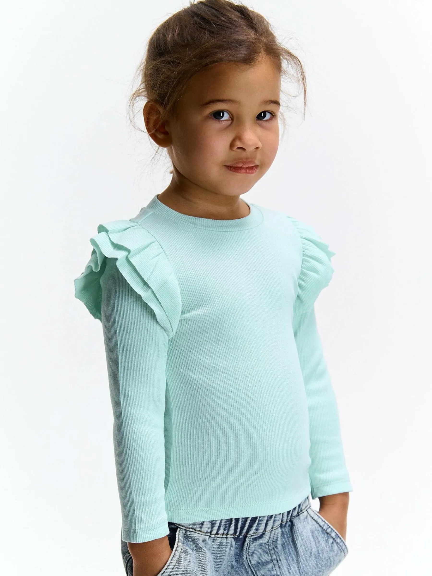 Kolor: zielony, niebieskiKrój: z falbanąTyp: koszulkaRekaw: długi rękawDługość: krótkiPattern style: pojedynczy …