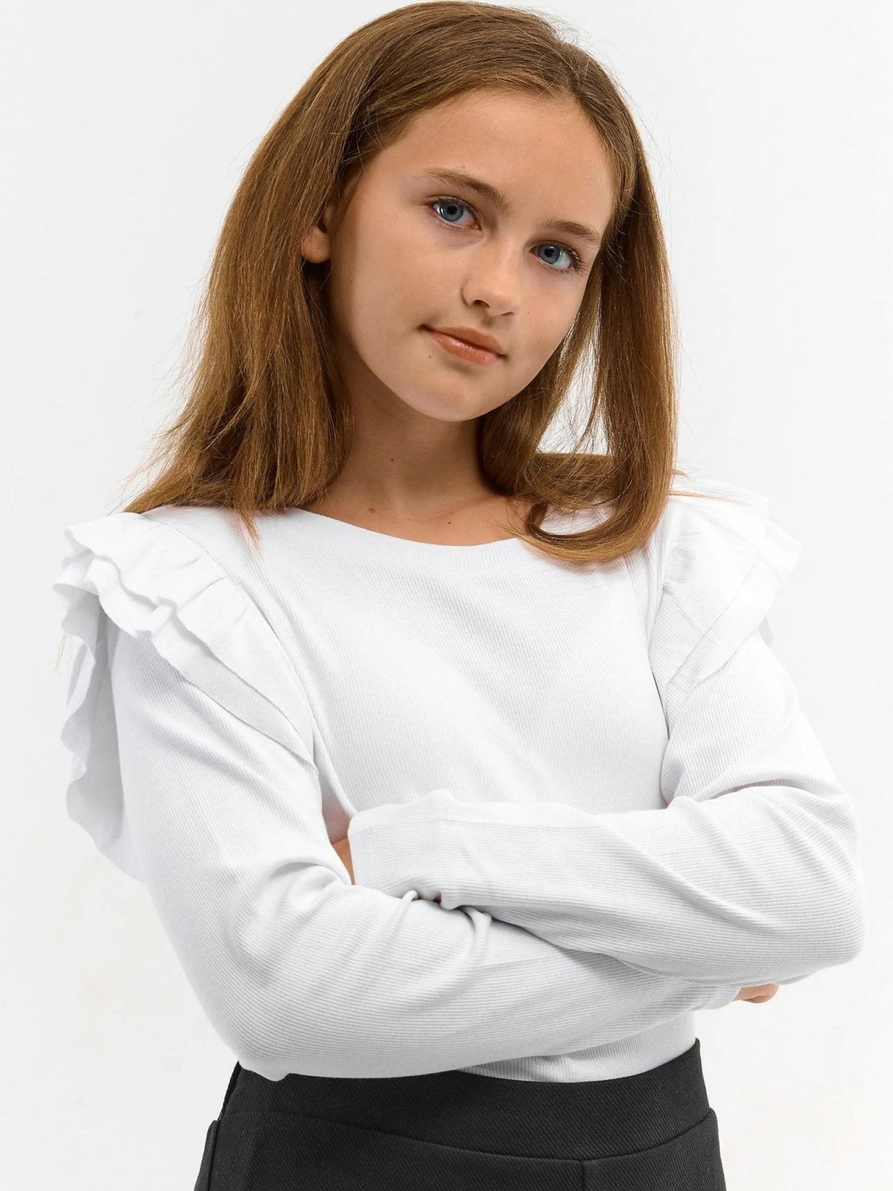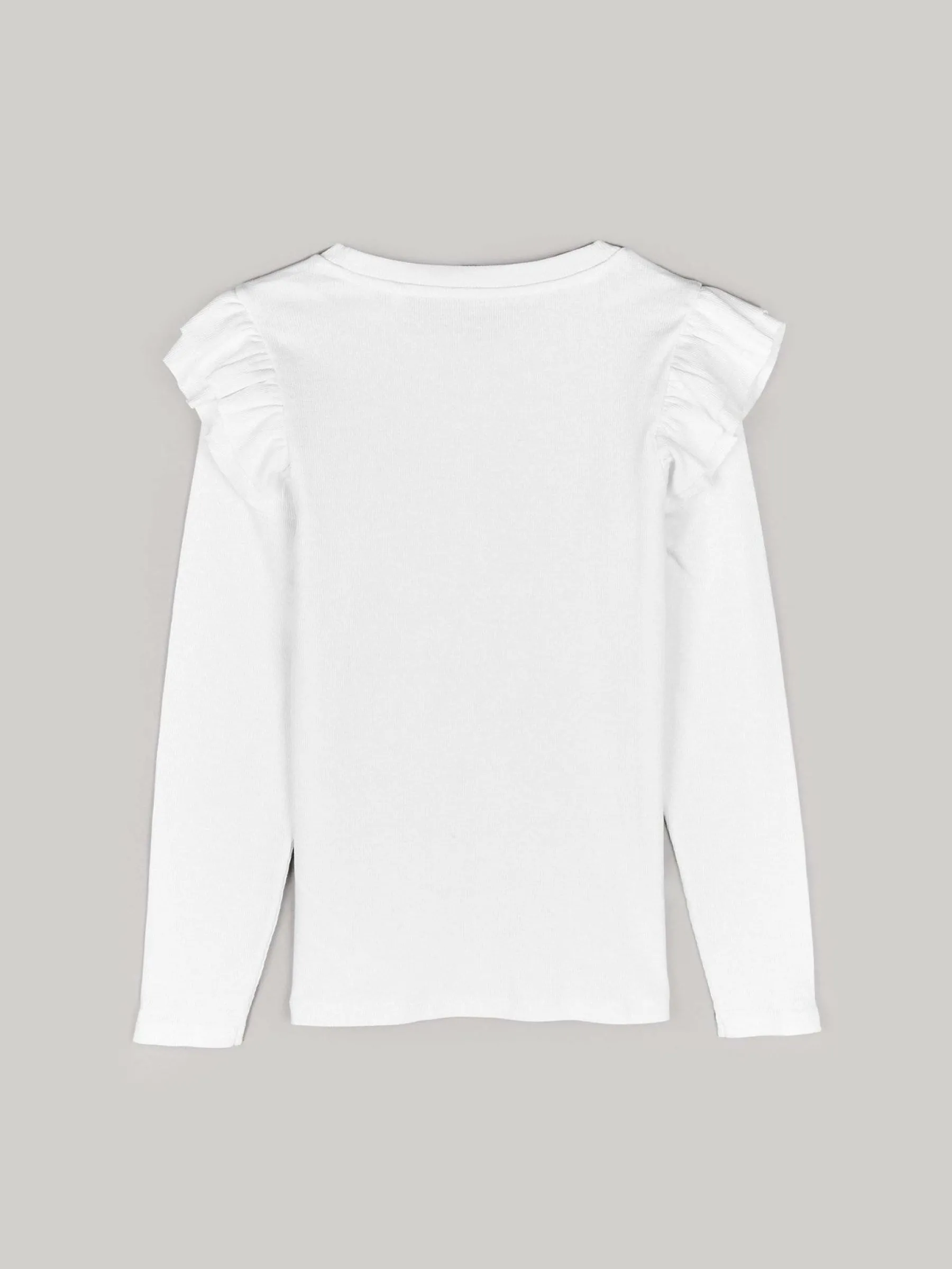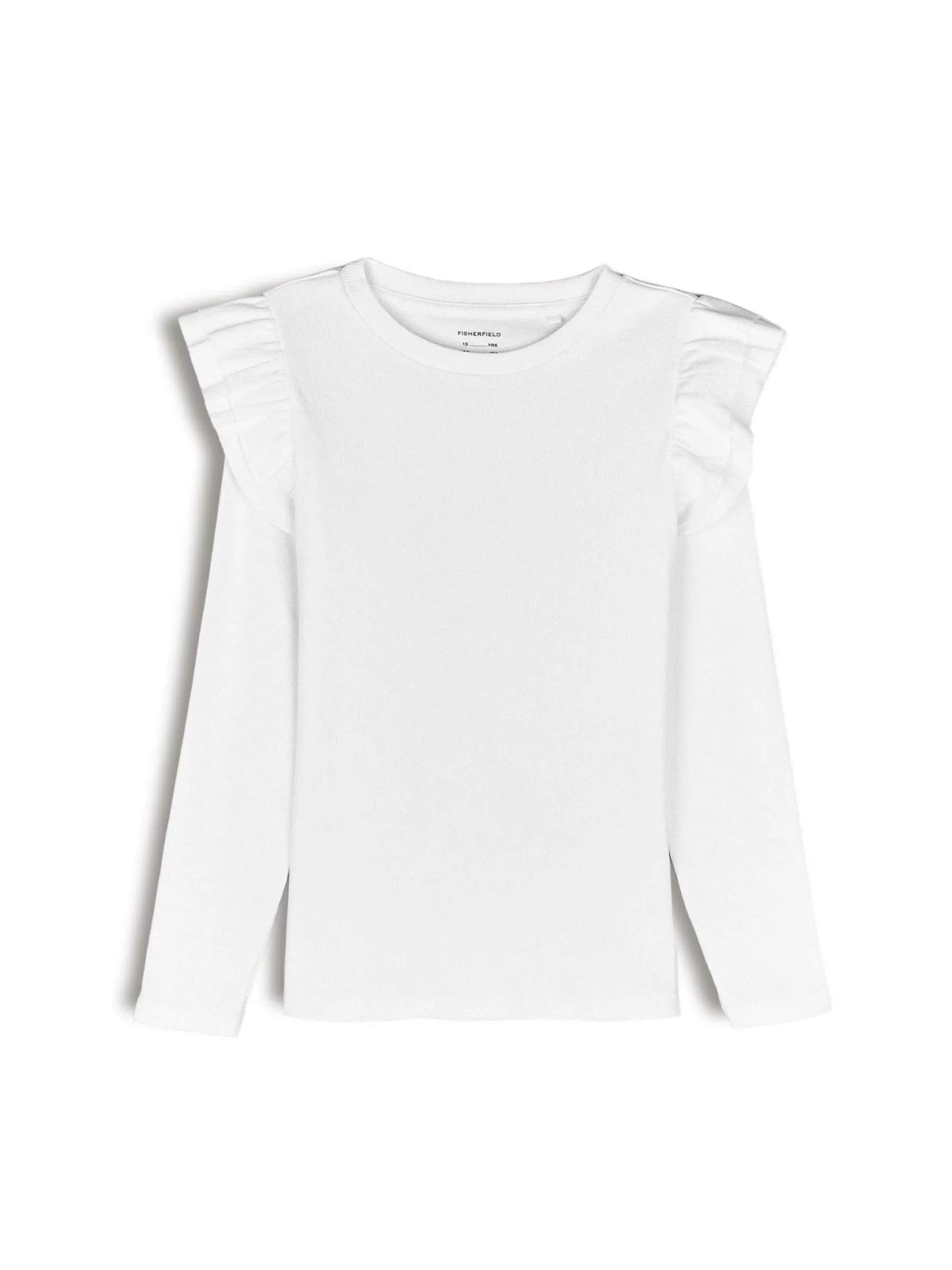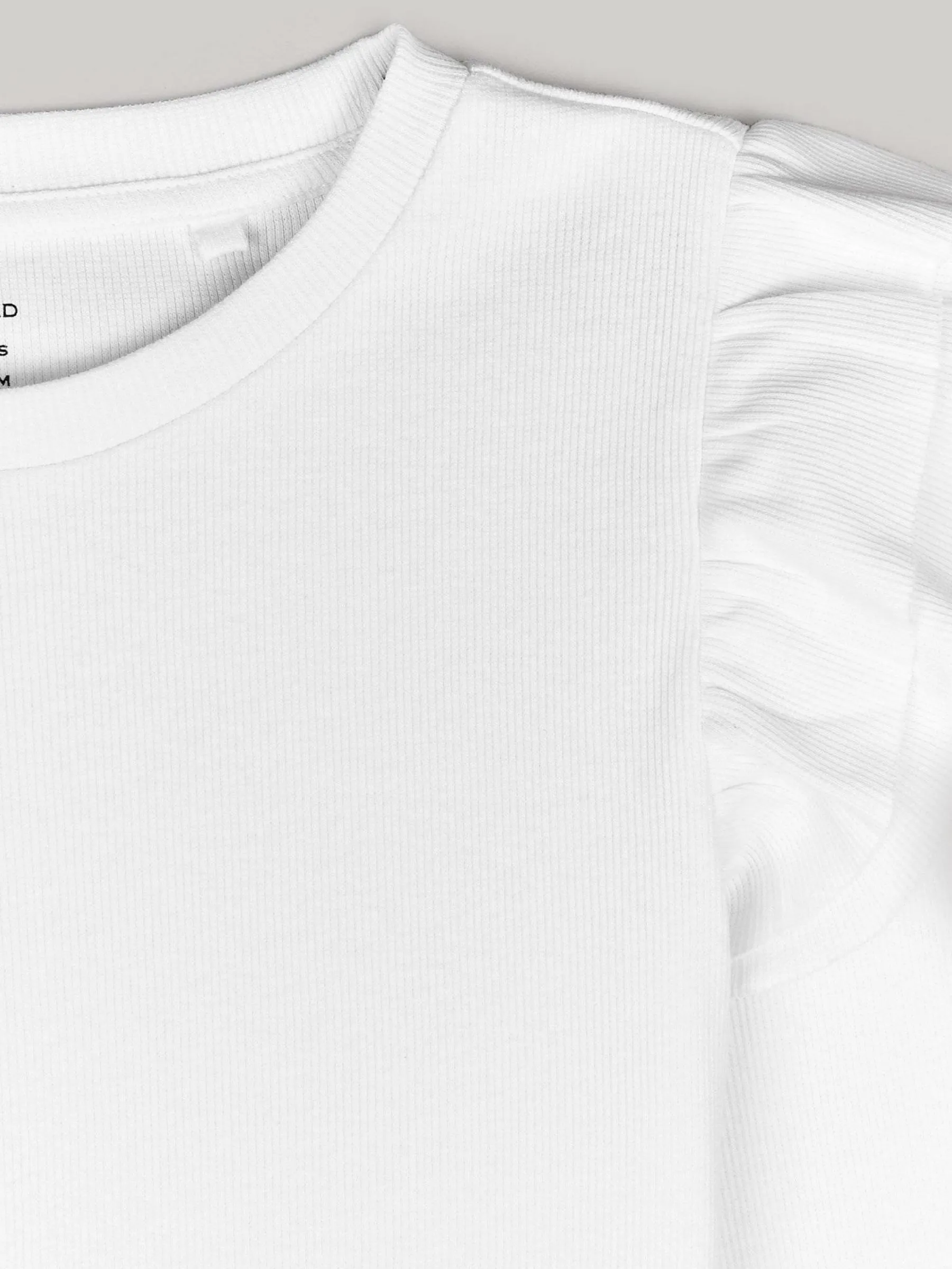 Kolor: białyKrój: z falbanąTyp: koszulkaRekaw: krótki rękawDługość: krótkiPattern style: pojedynczy kolor, żeb…
