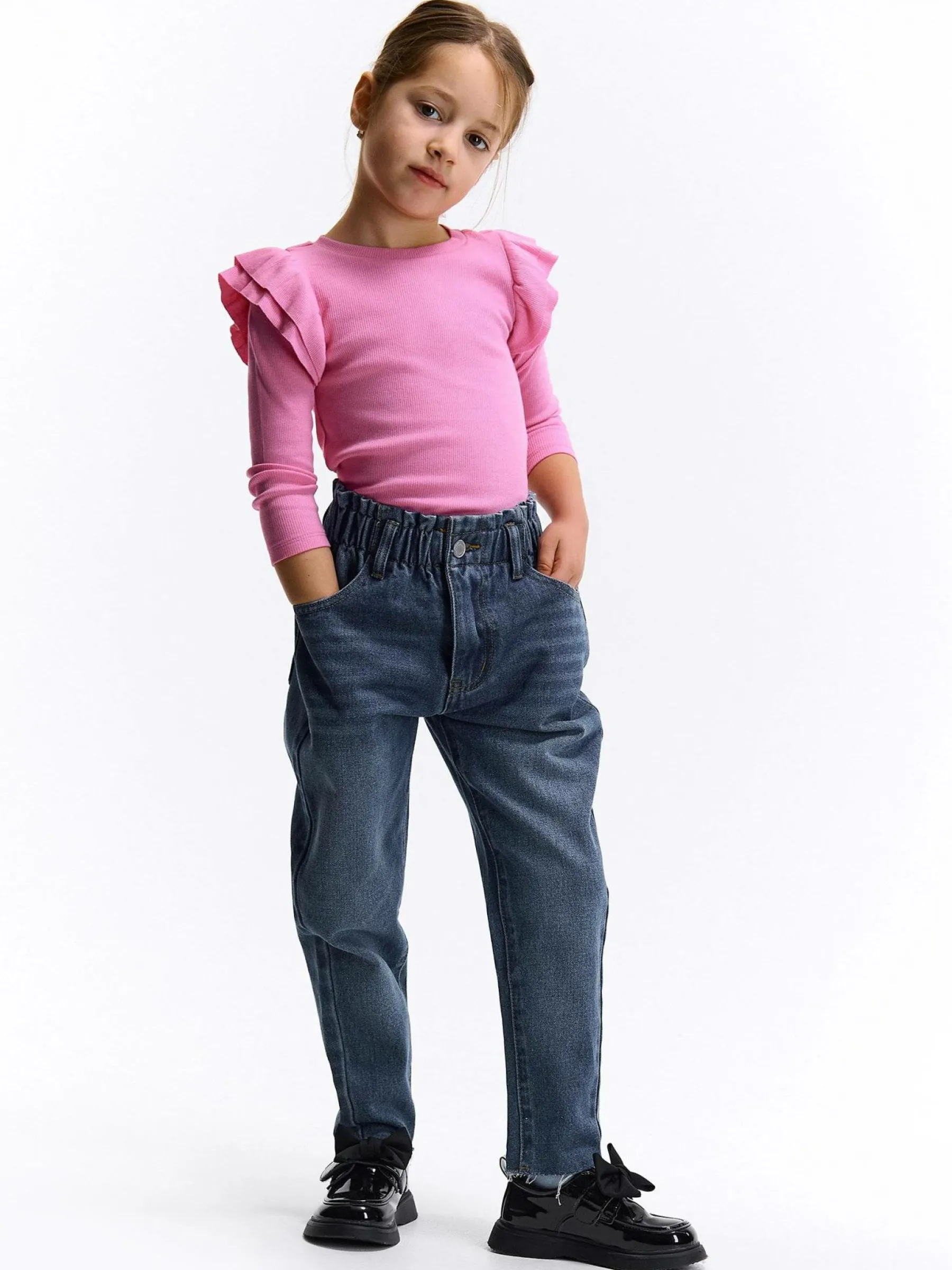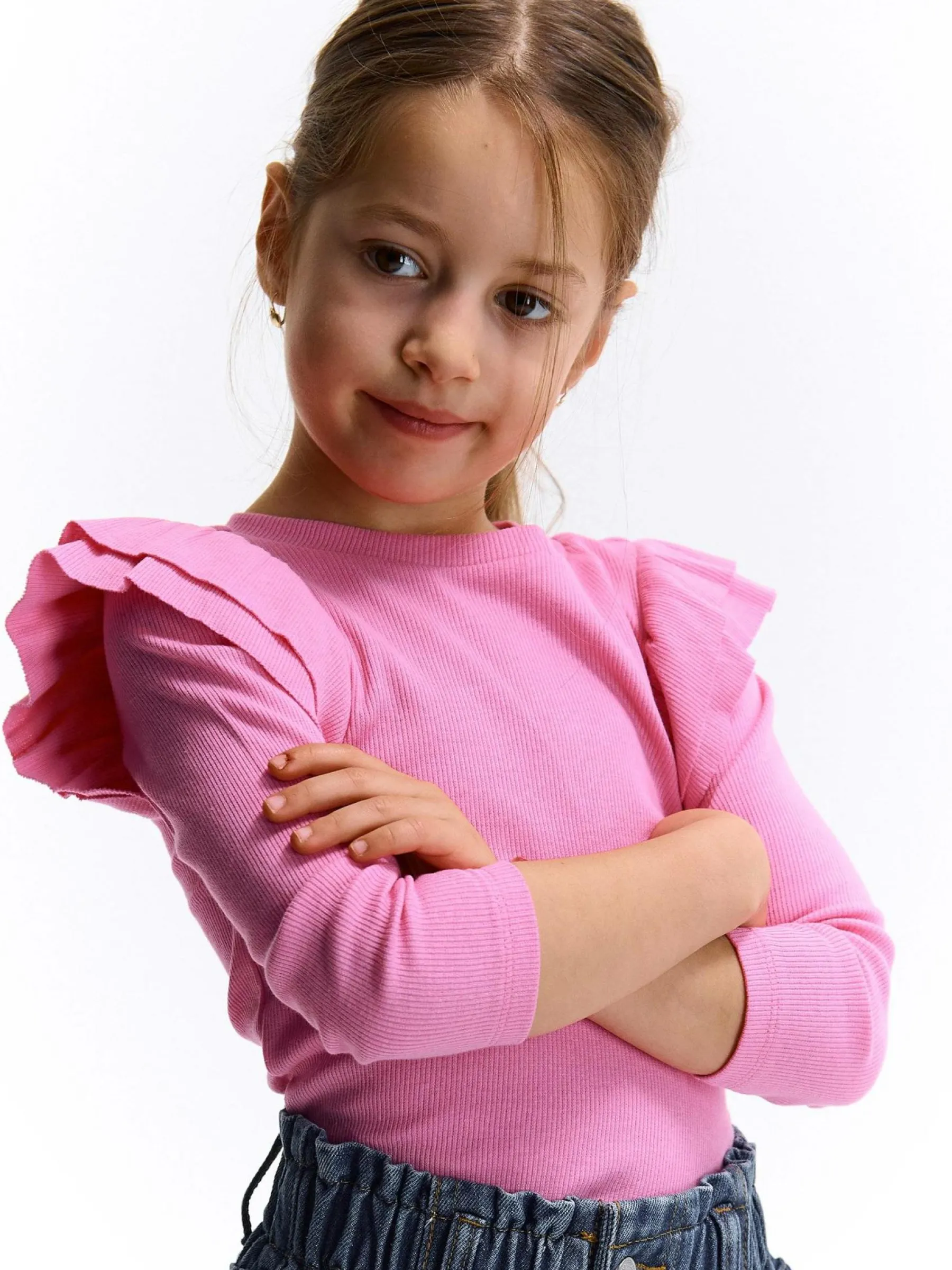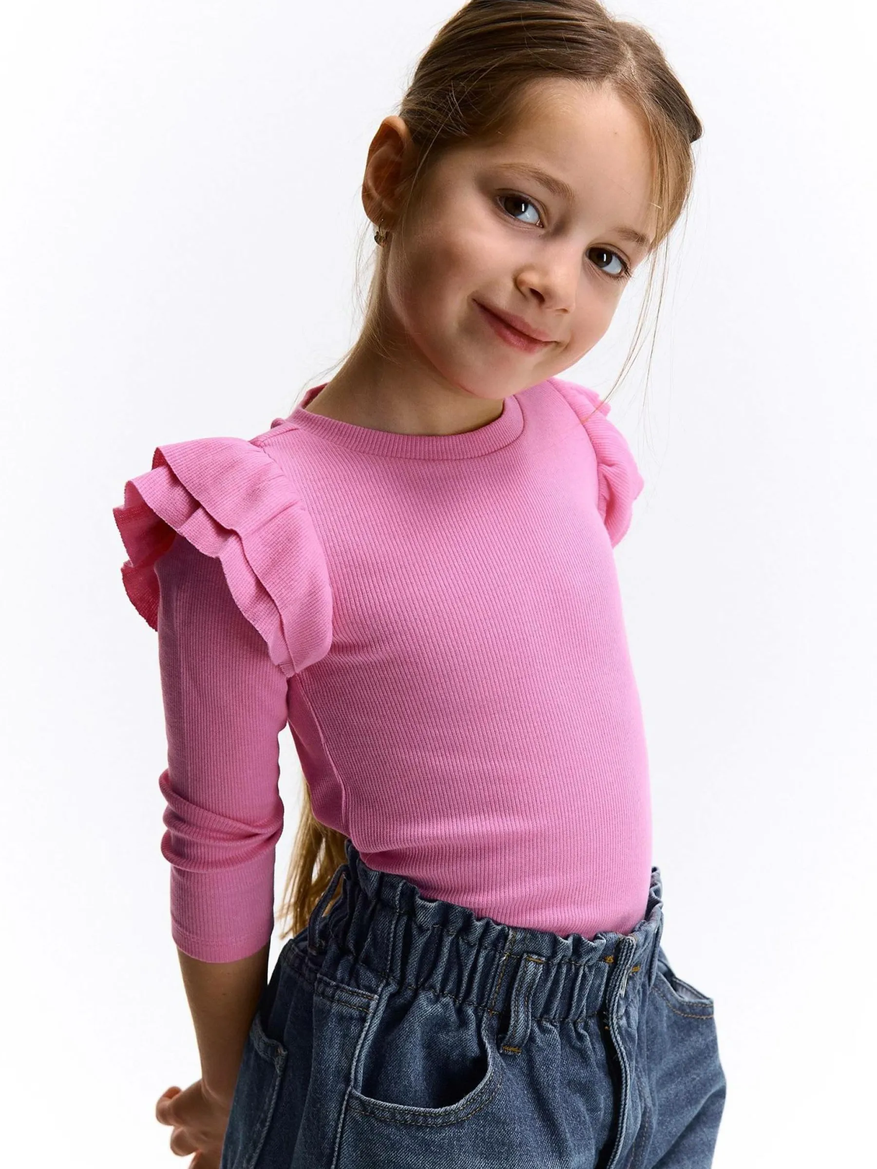 Kolor: różowyKrój: z falbanąTyp: koszulkaRekaw: długi rękawDługość: krótkiPattern style: pojedynczy kolor, że…