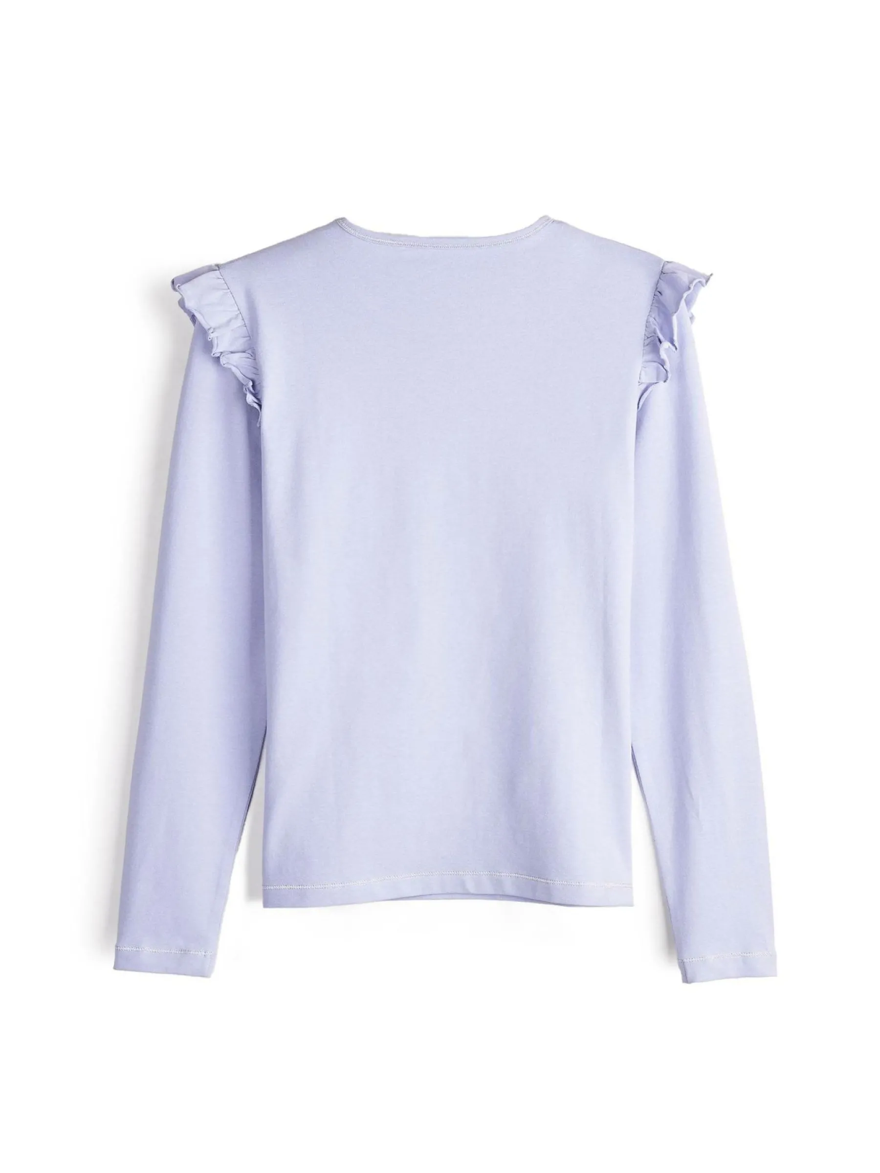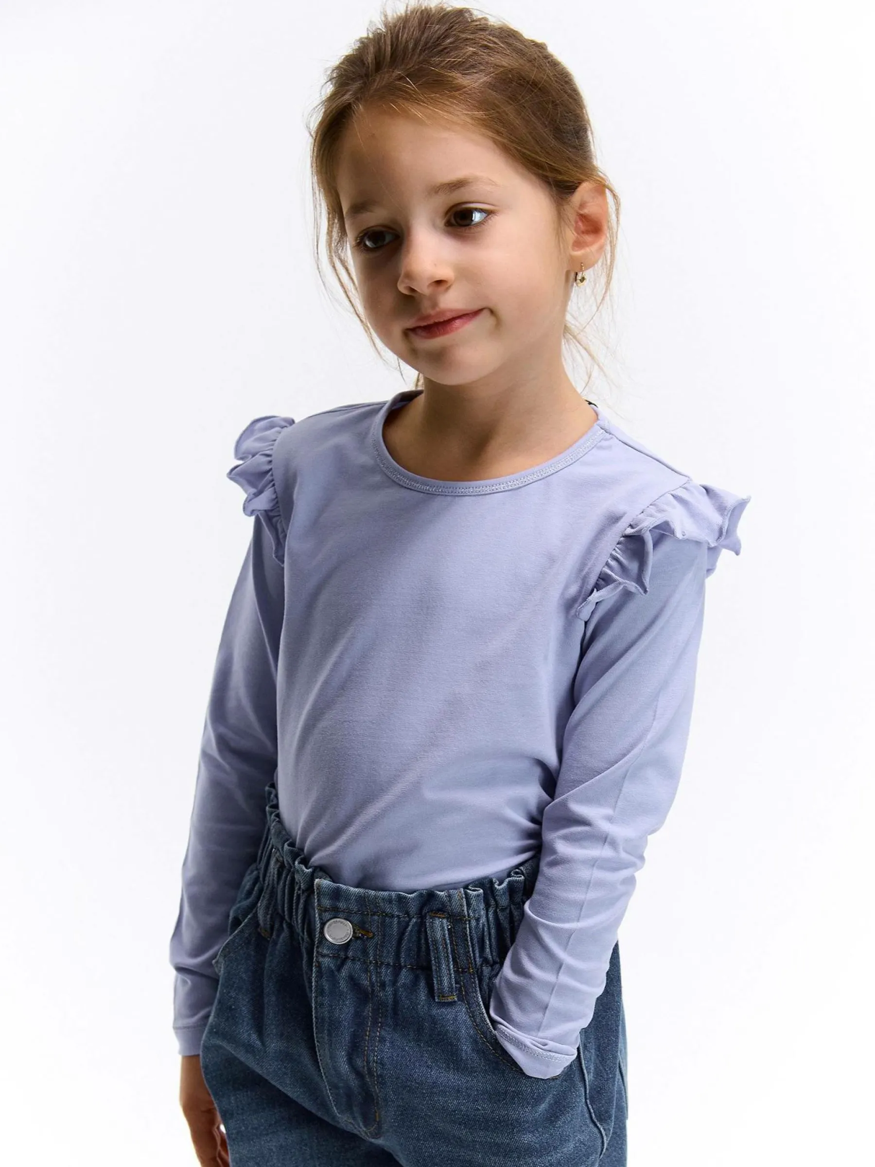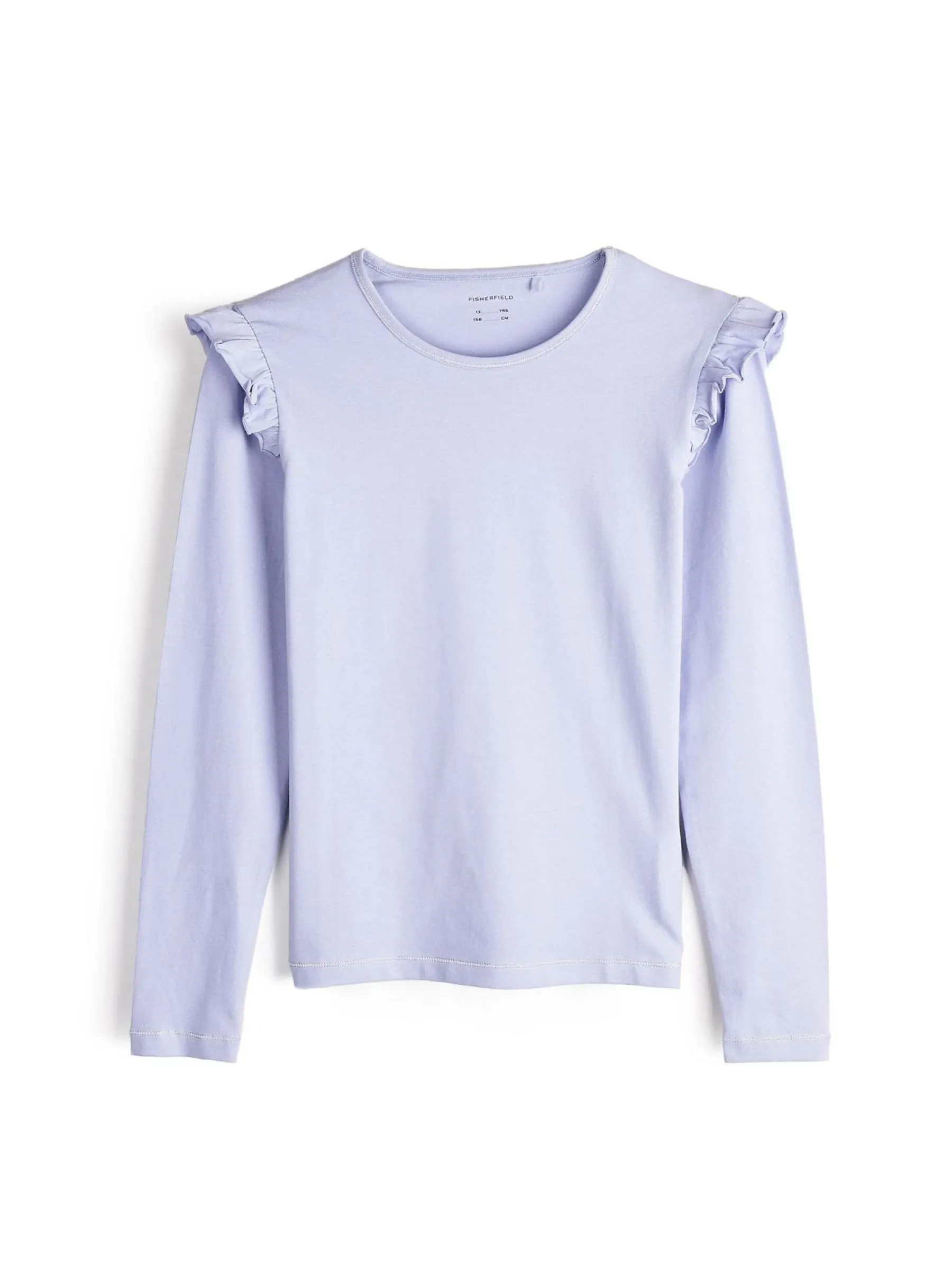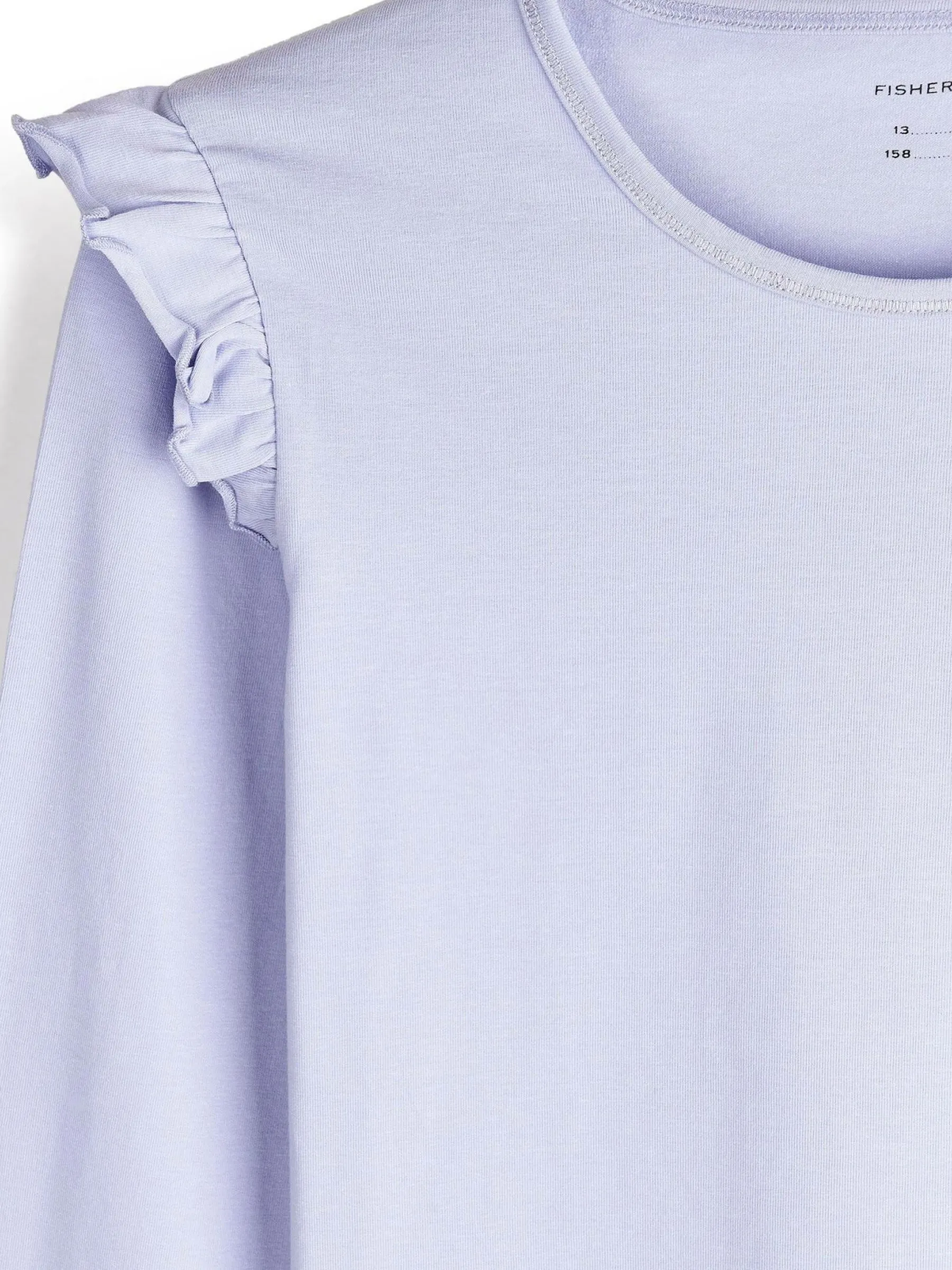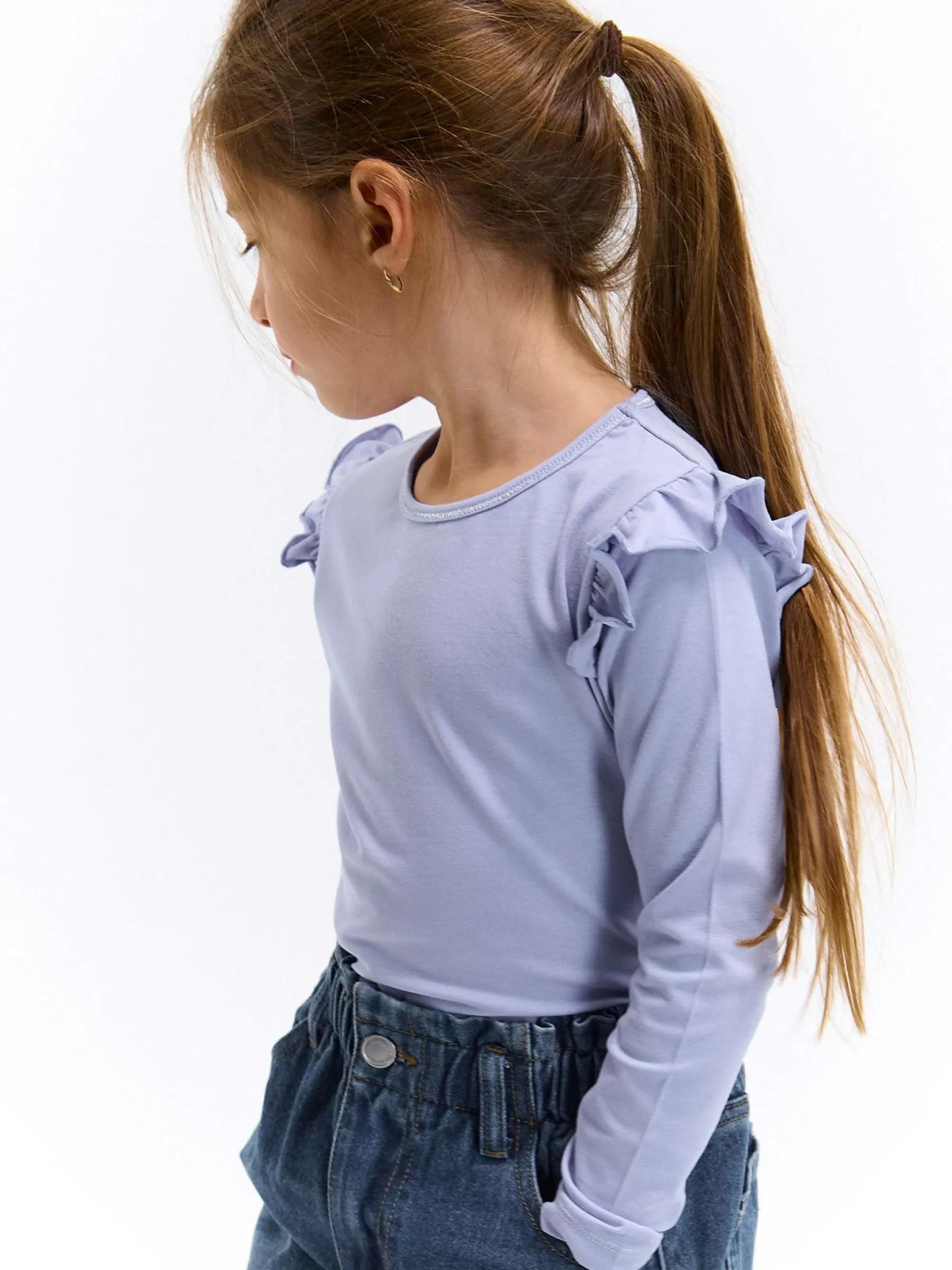 Kolor: purpurowyKrój: z falbanąTyp: koszulkaRekaw: długi rękawDługość: krótkiPattern style: pojedynczy kolorDeta…
