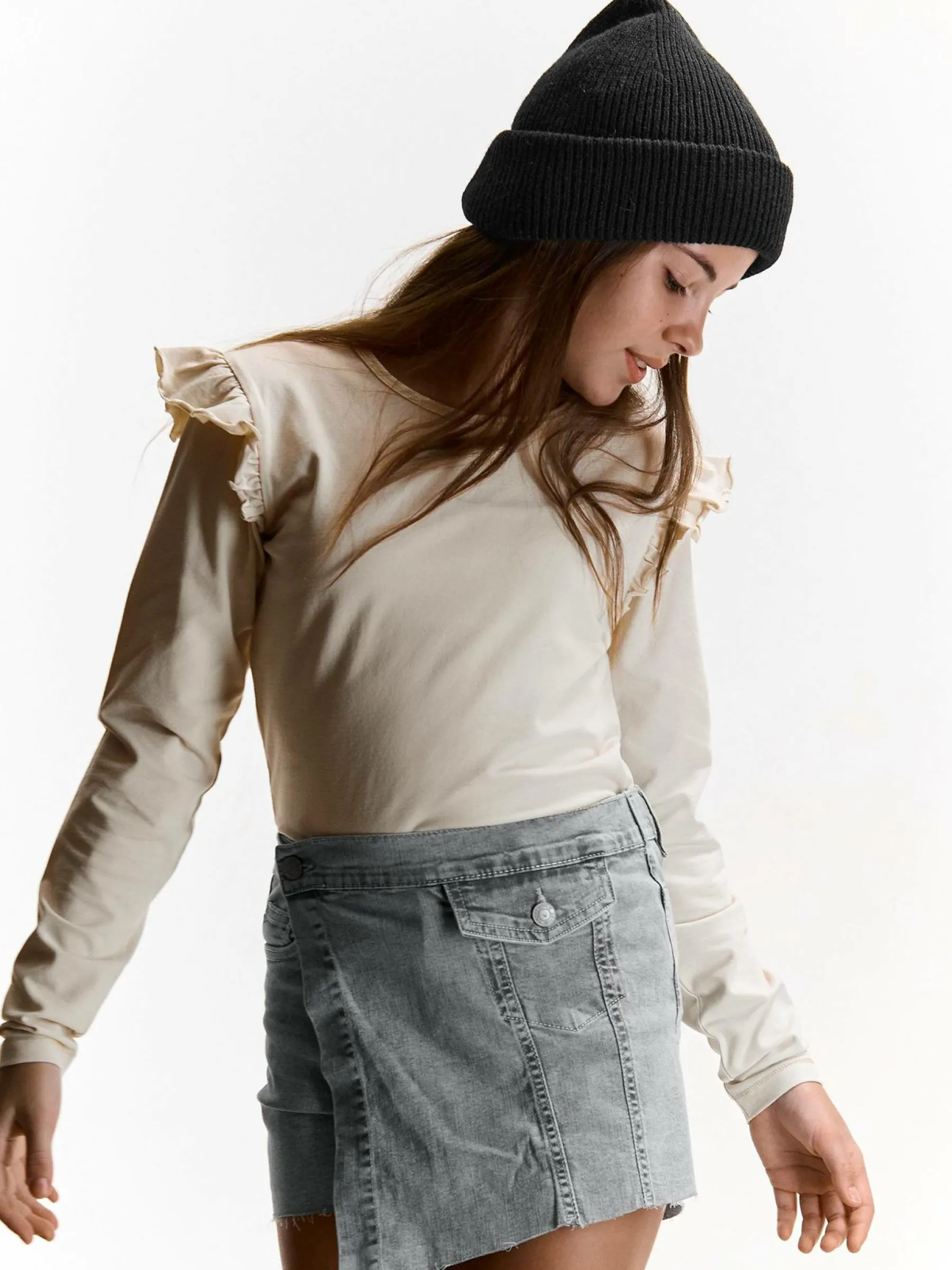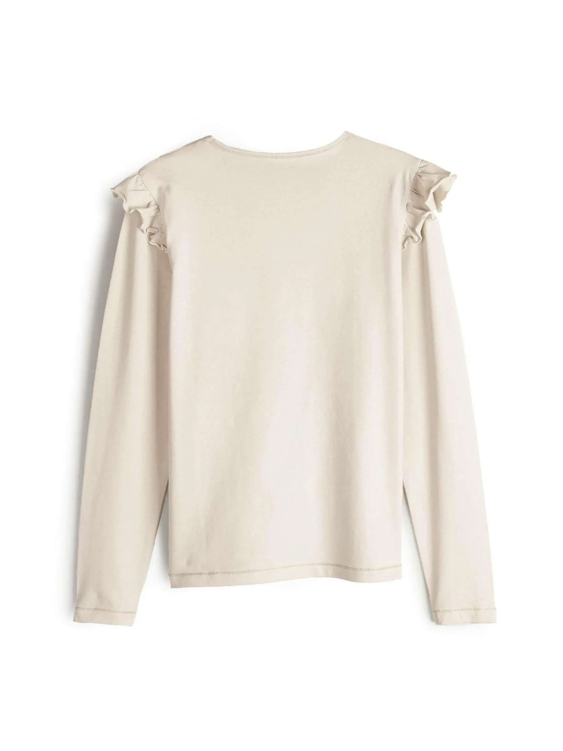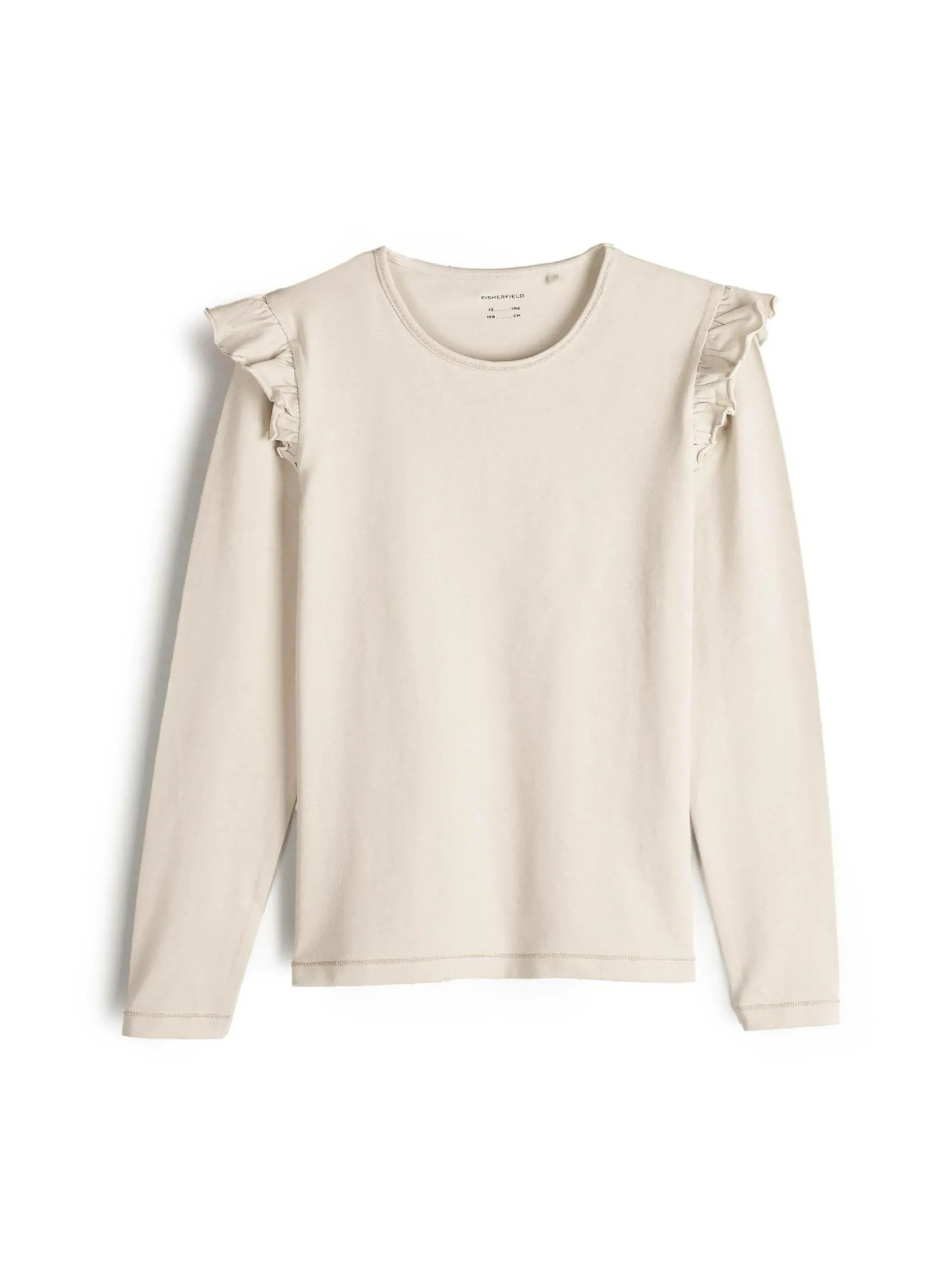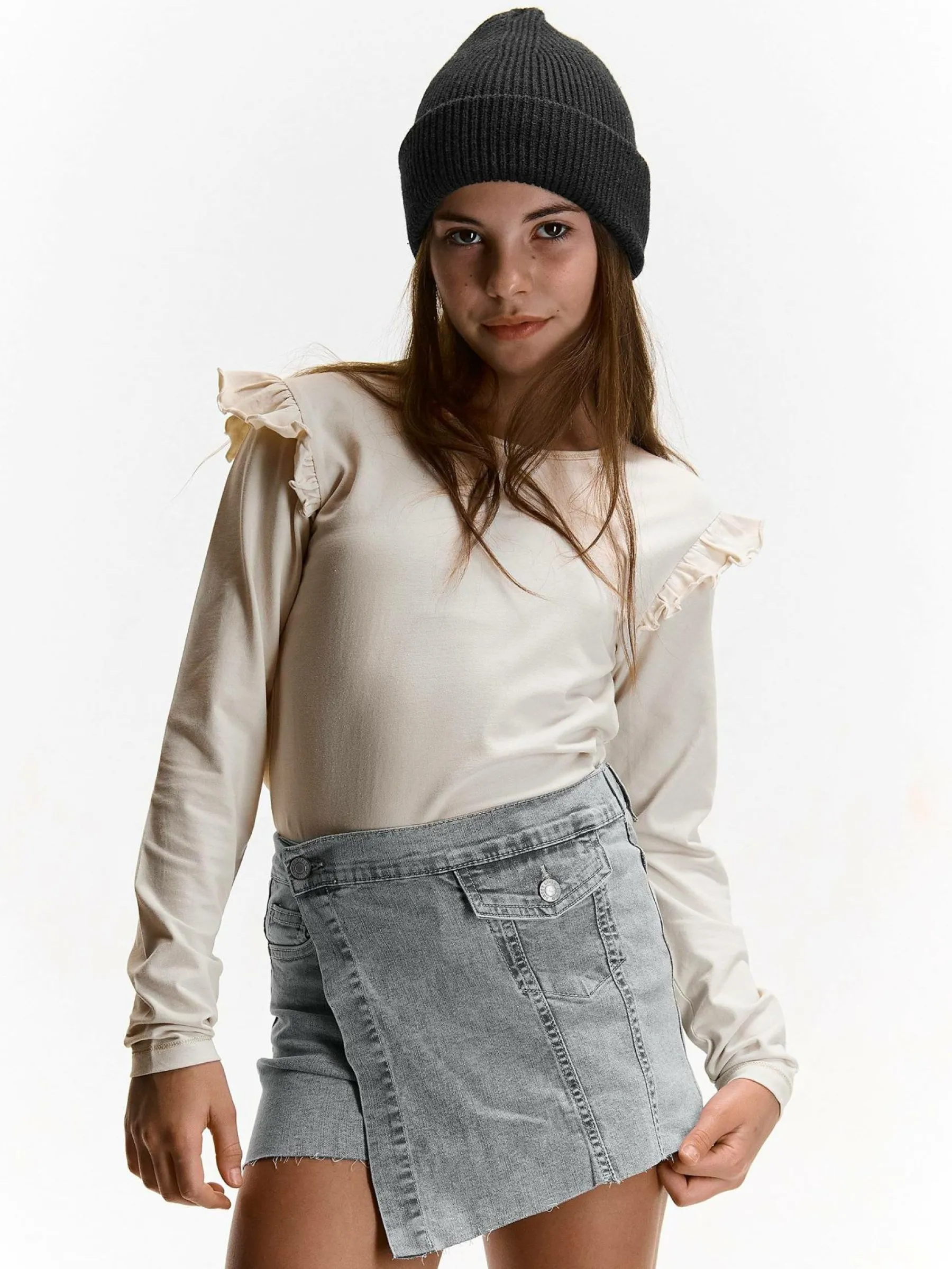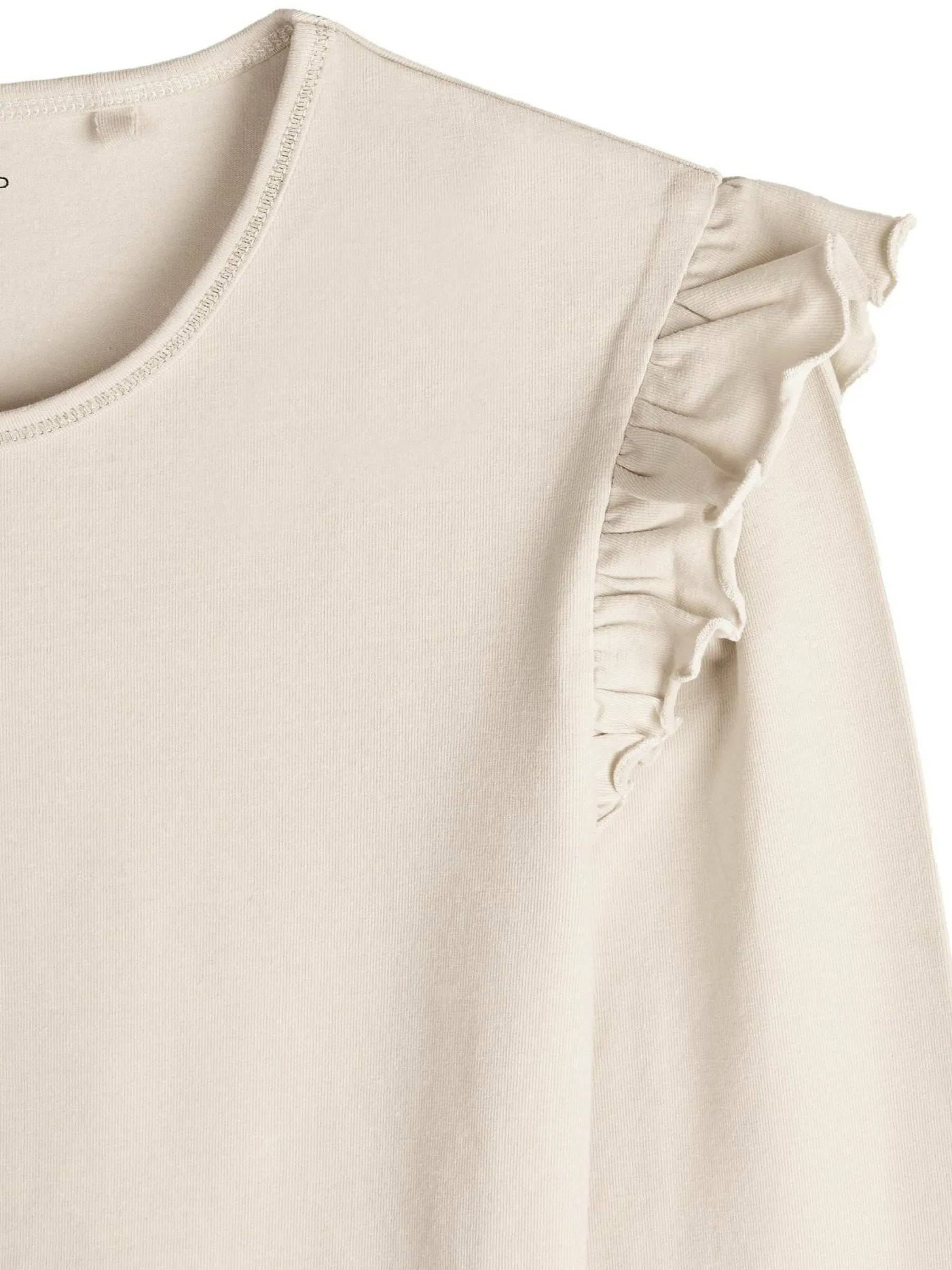 Kolor: beżowyKrój: z falbanąTyp: koszulkaRekaw: długi rękawDługość: krótkiPattern style: pojedynczy kolorDetal:…
