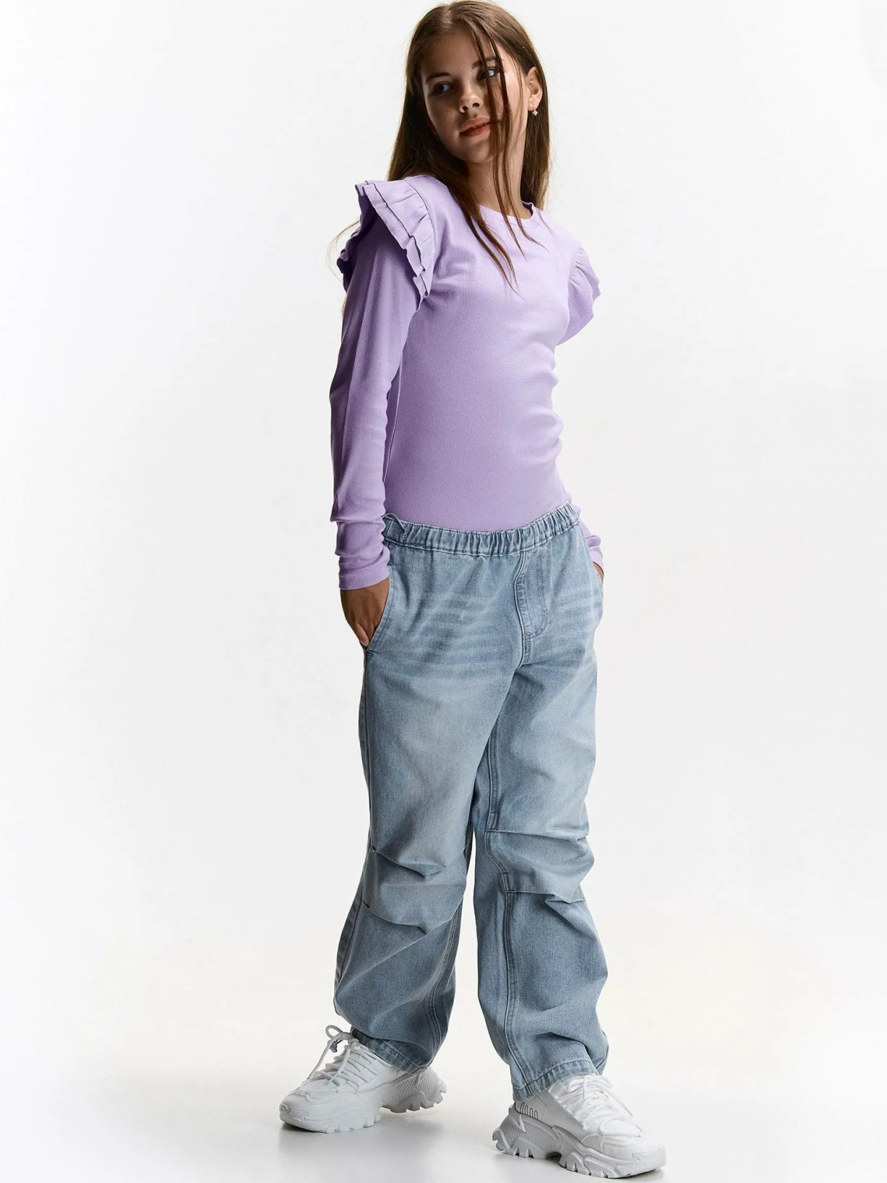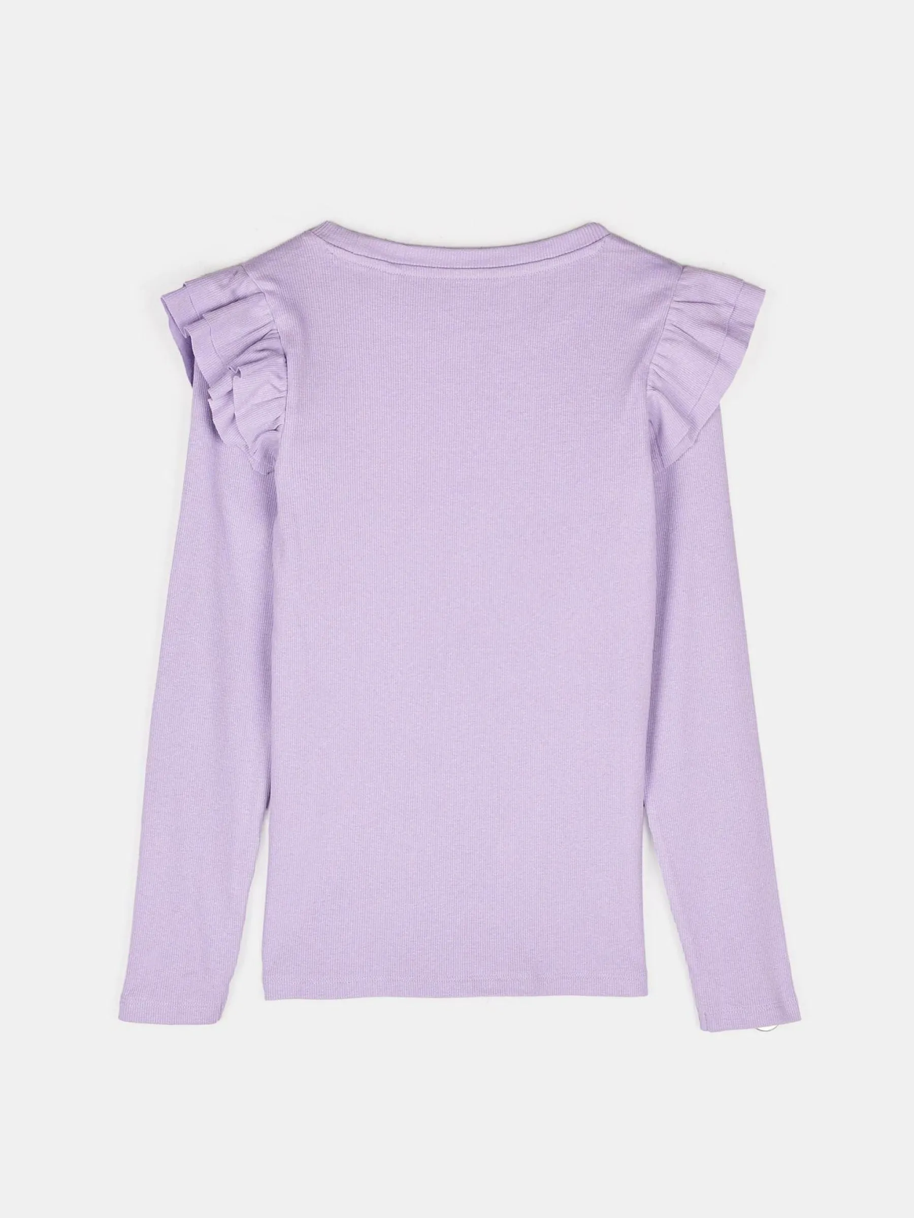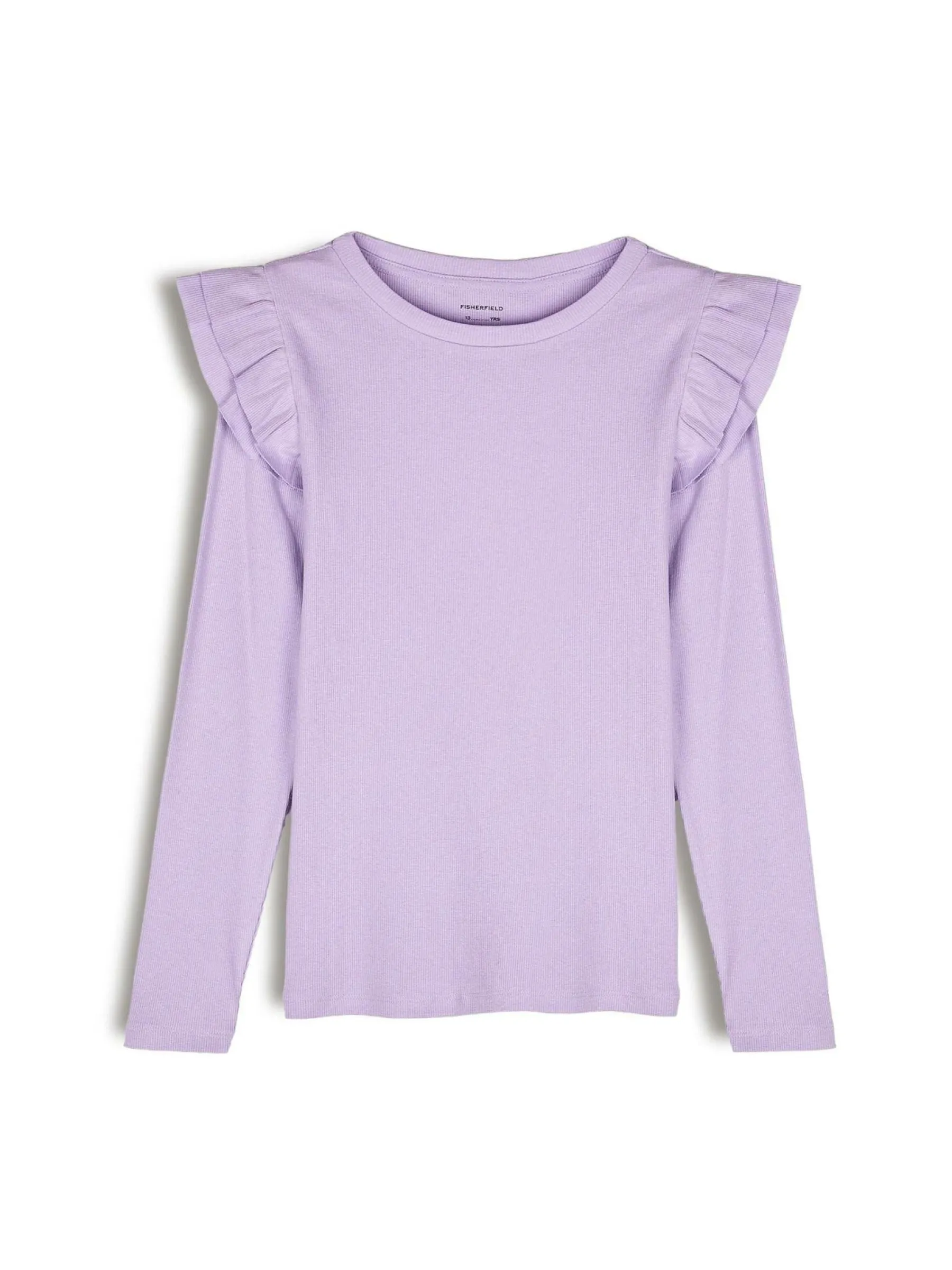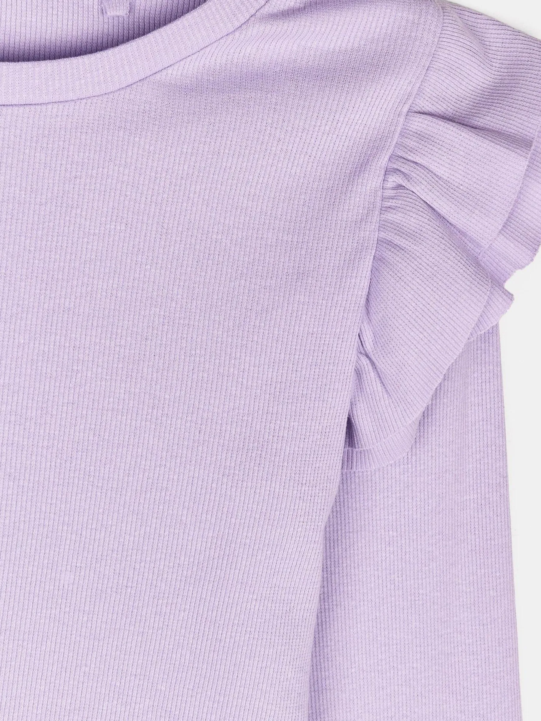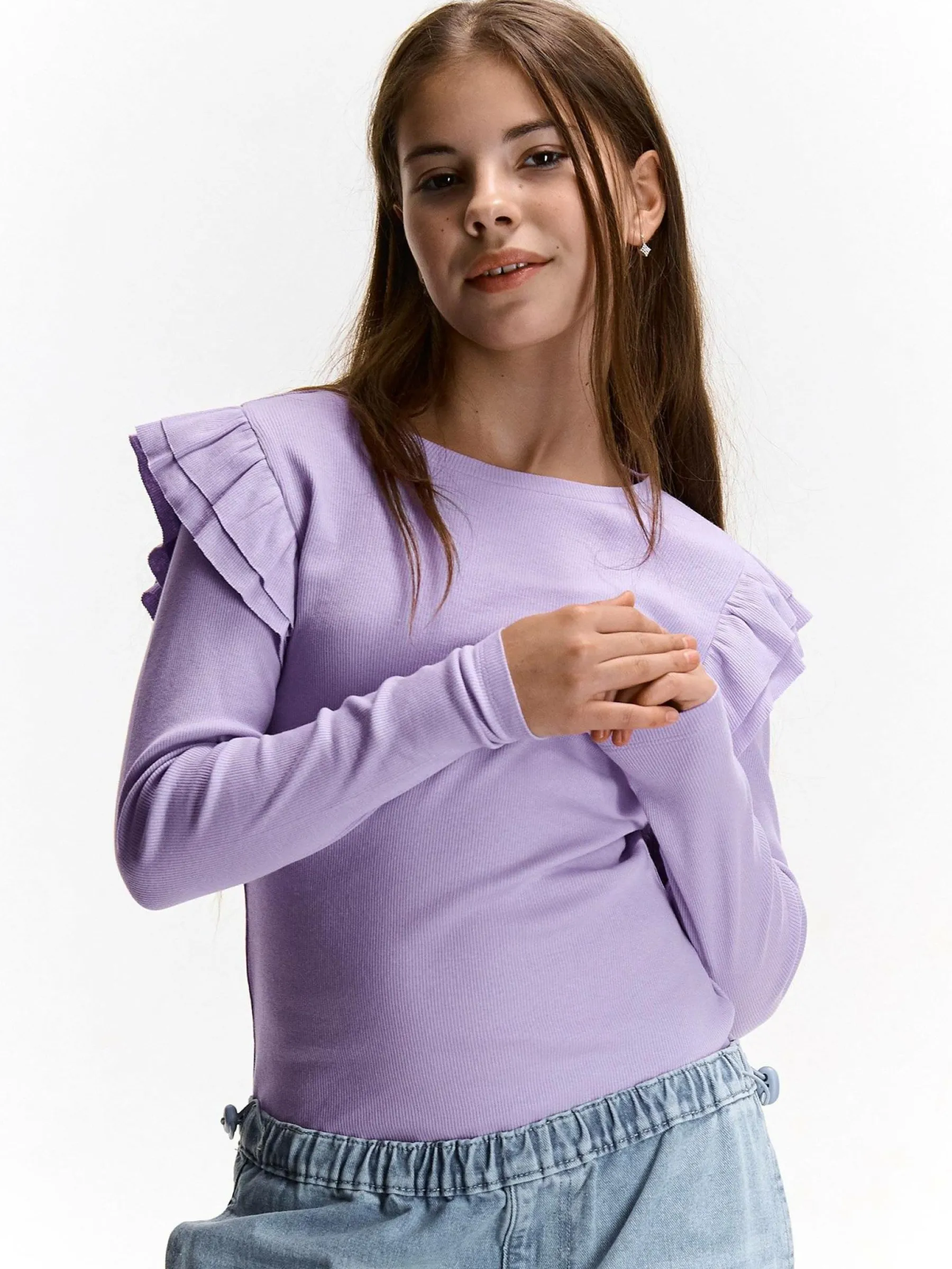Kolor: purpurowyKrój: z falbanąTyp: koszulkaRekaw: długi rękawDługość: krótkiPattern style: pojedynczy kolor, ż…