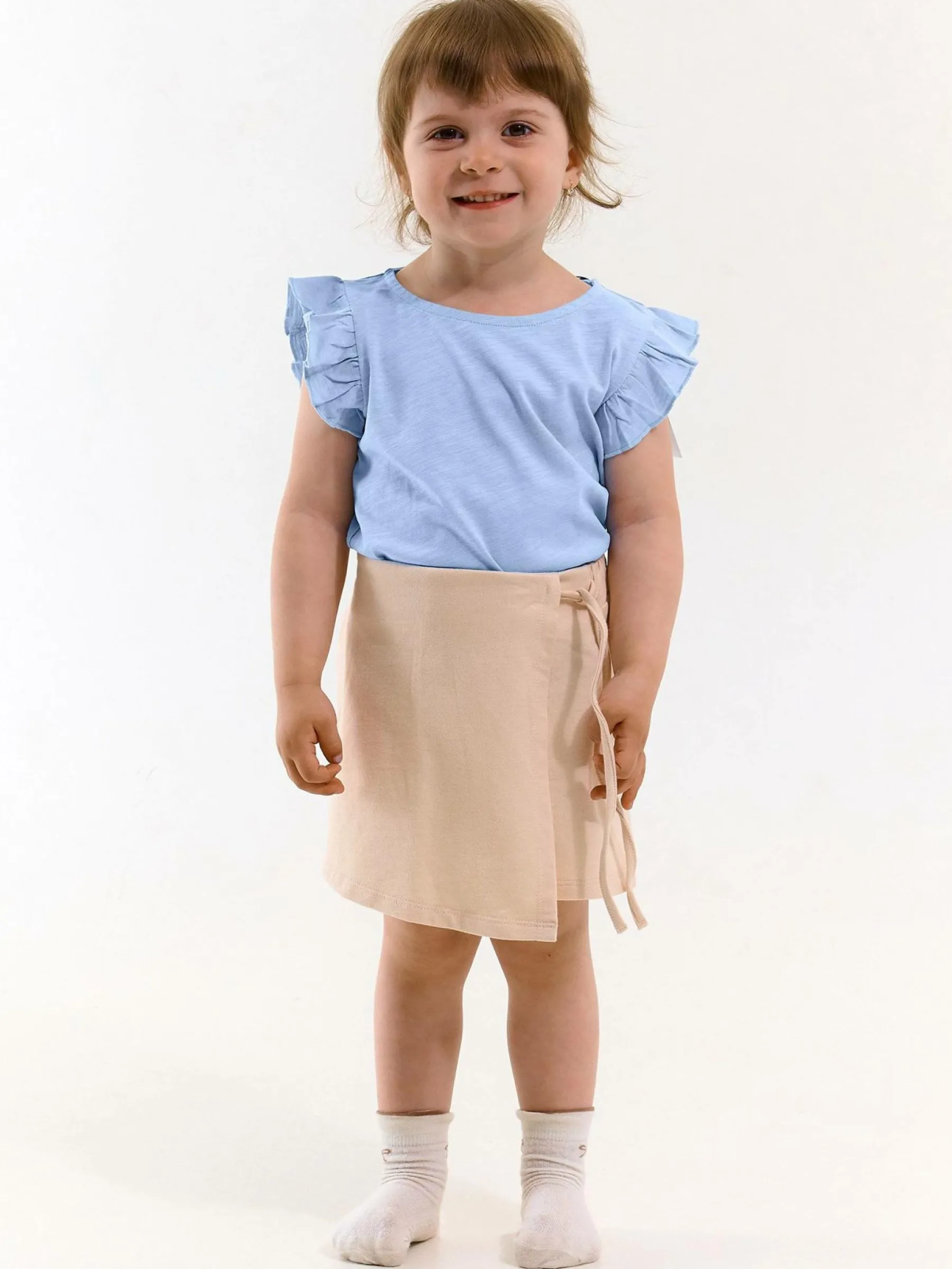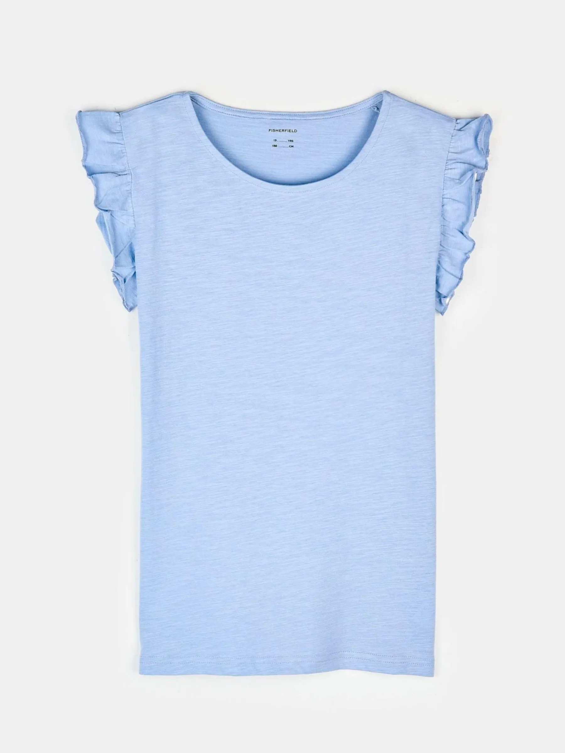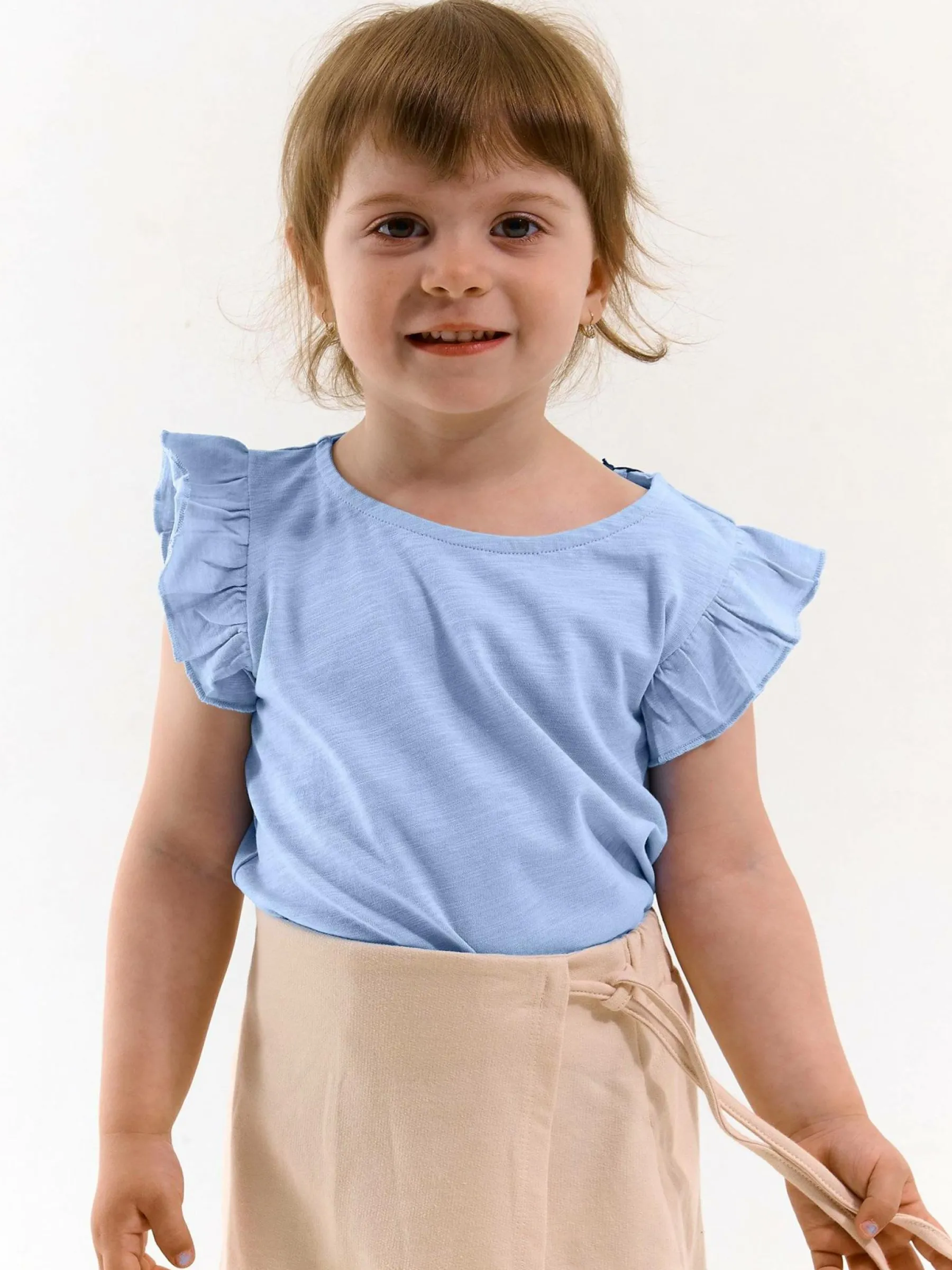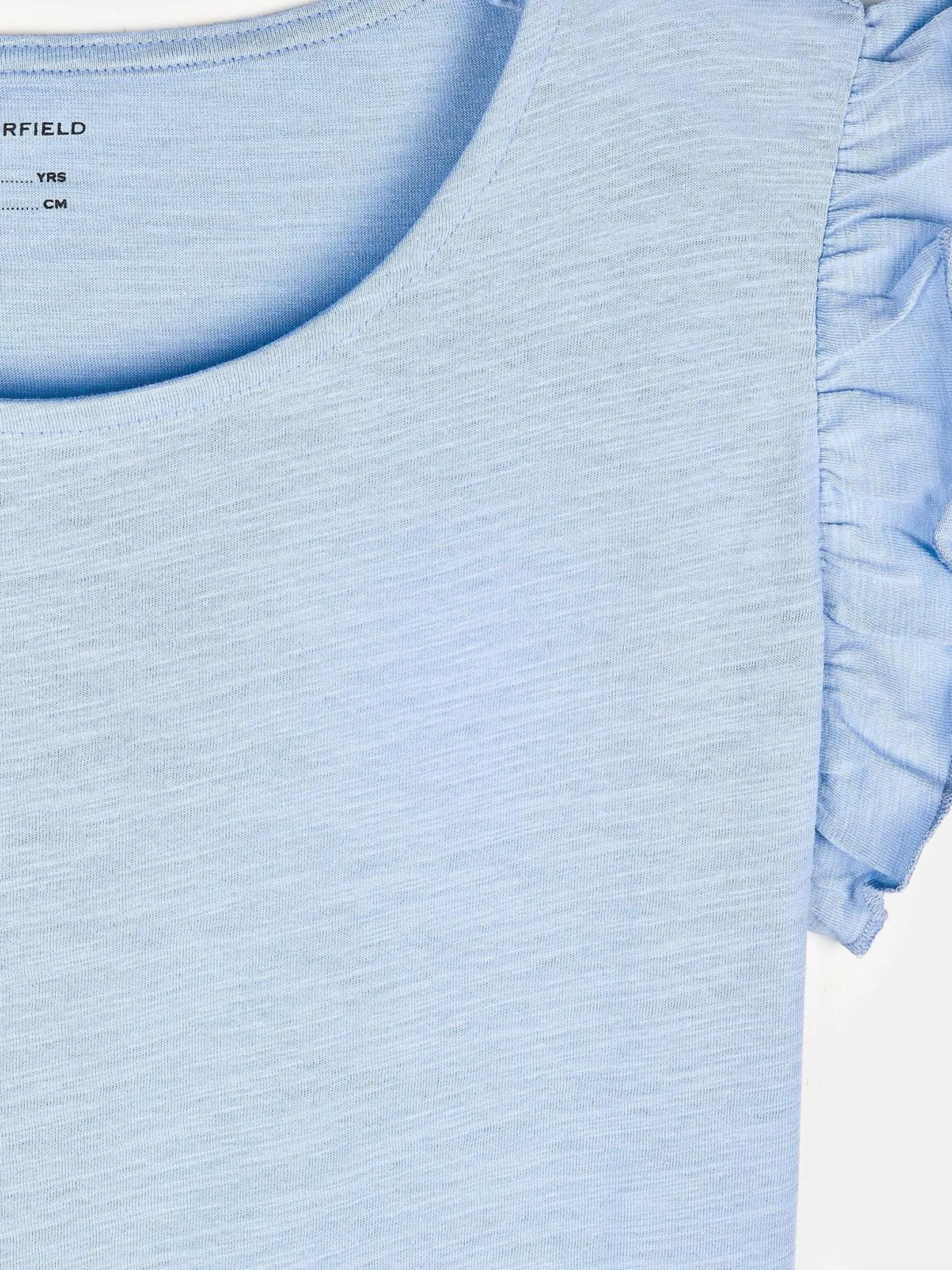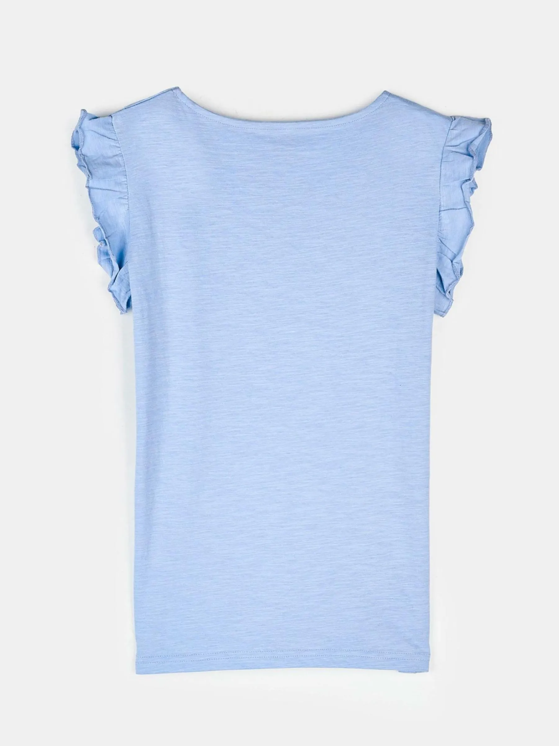 Kolor: niebieskiKrój: z falbanąTyp: koszulkaRekaw: bez rękawówDługość: krótkiPattern style: pojedynczy kolorDeta…