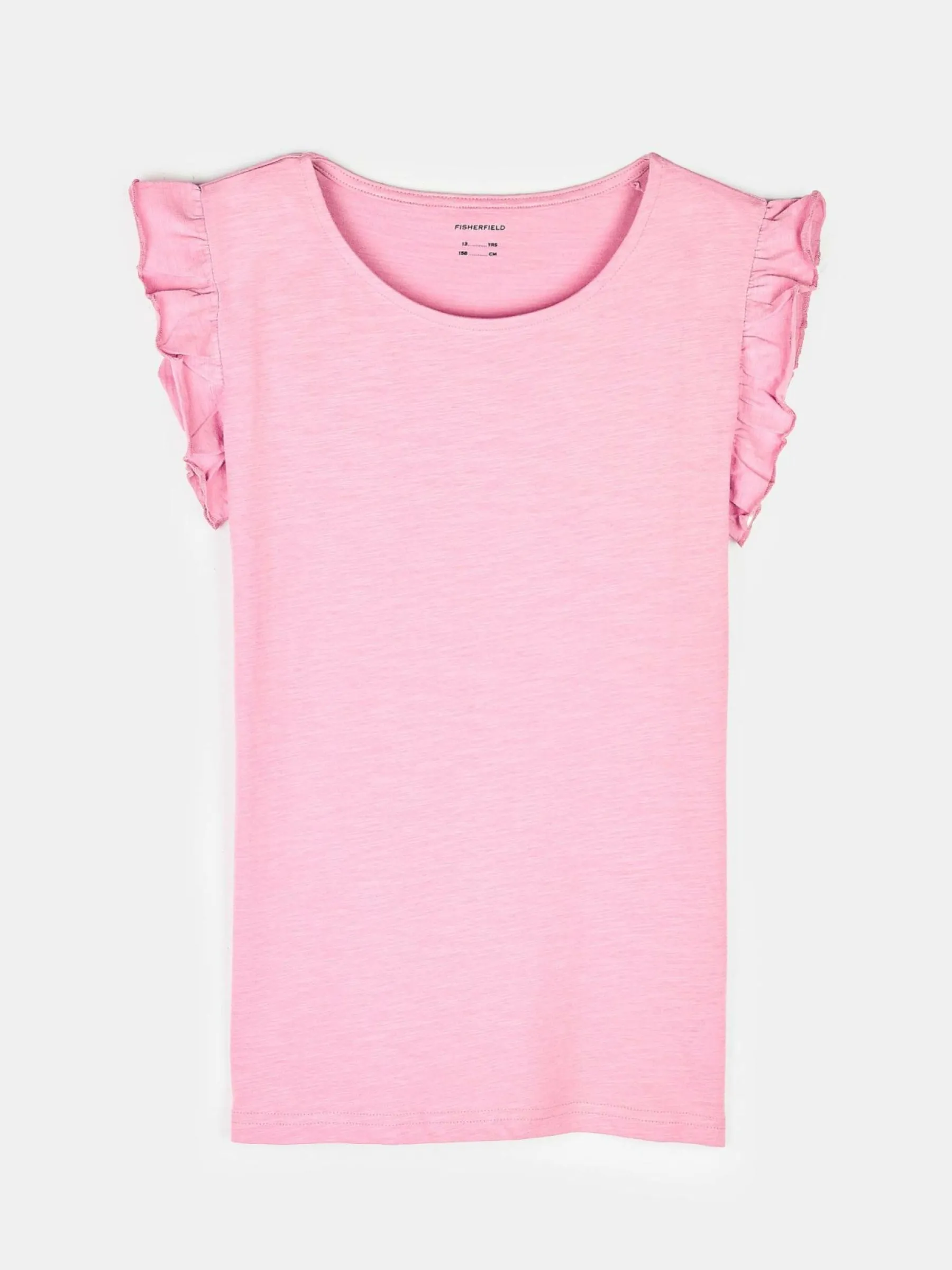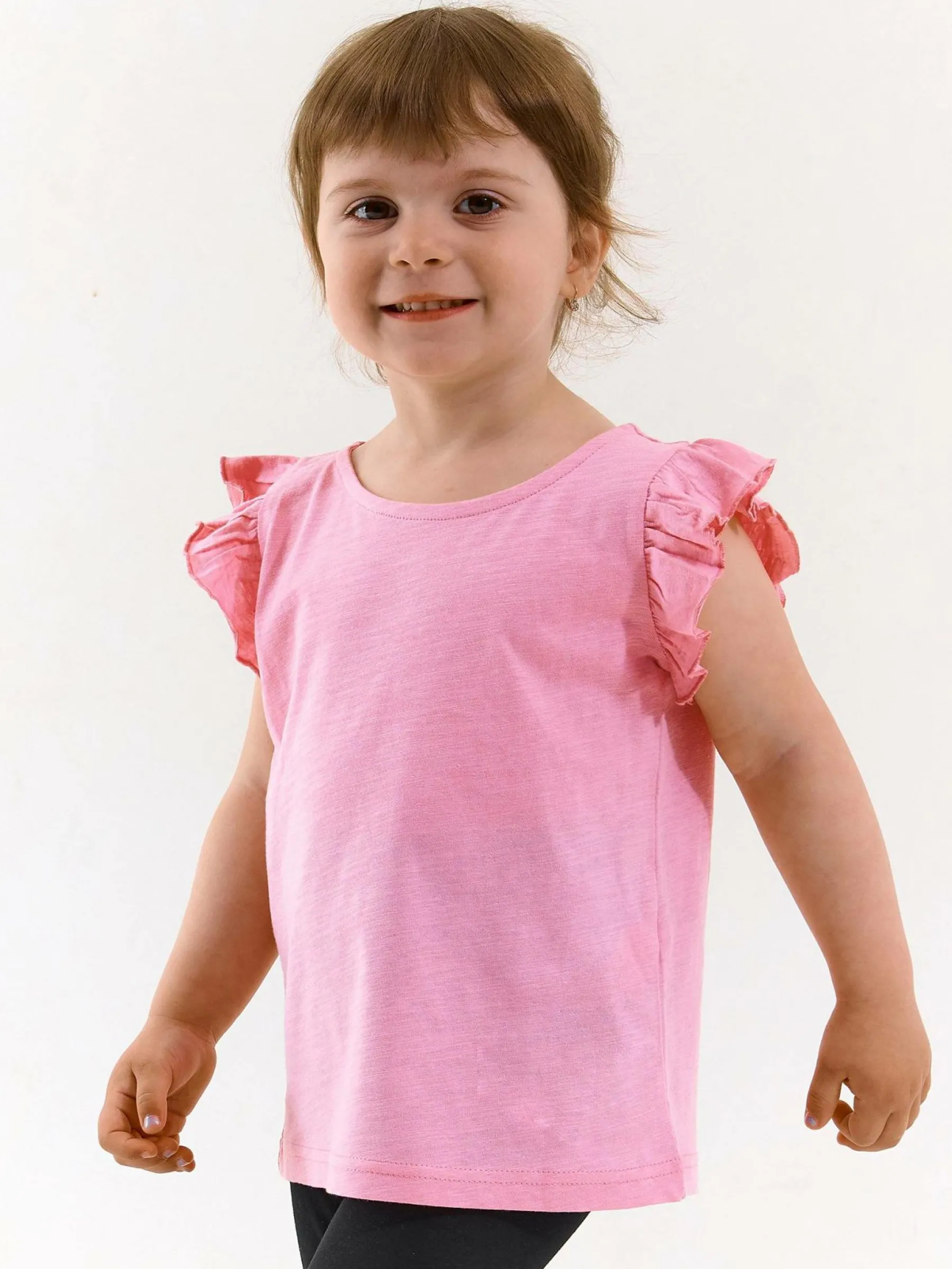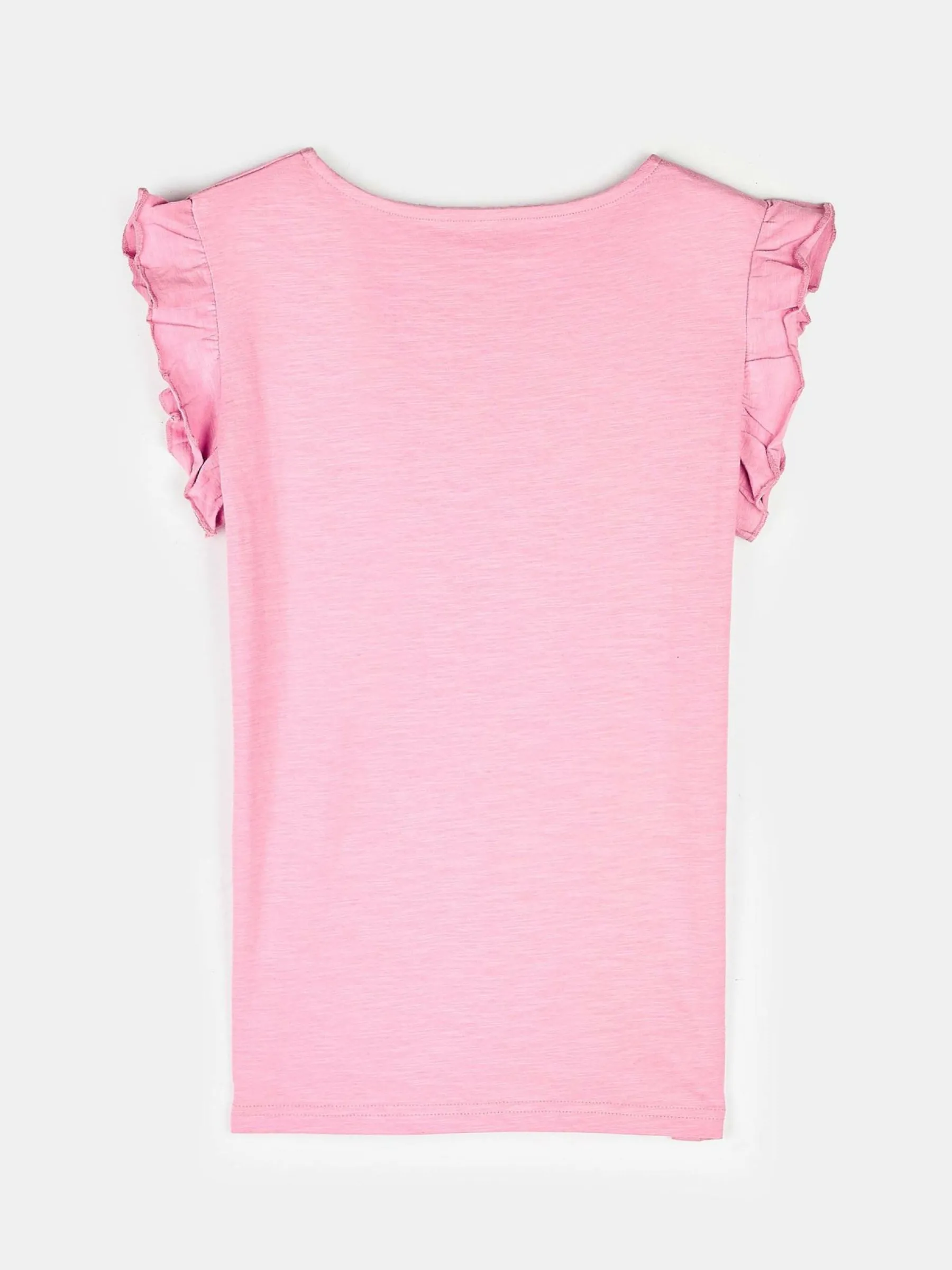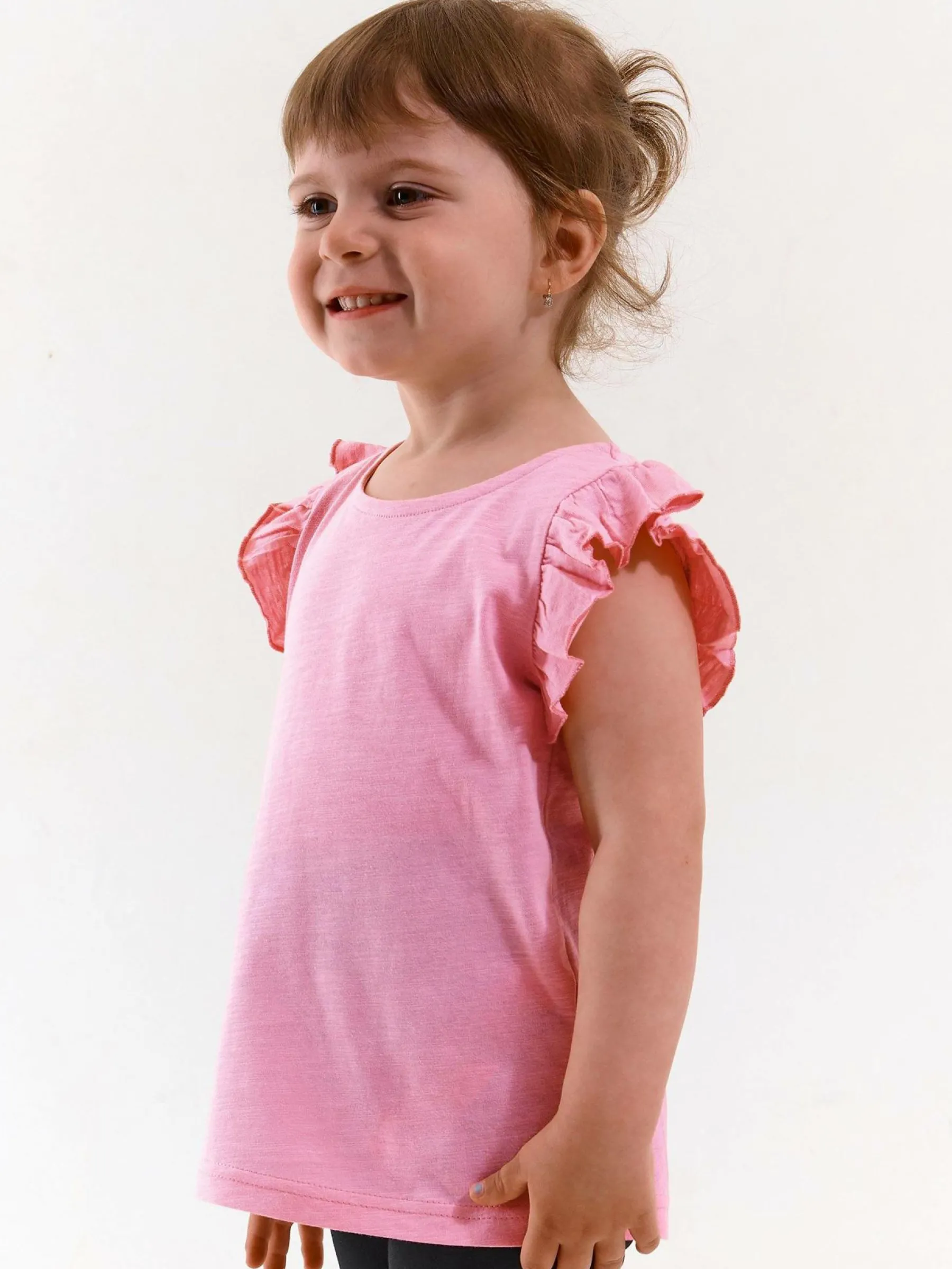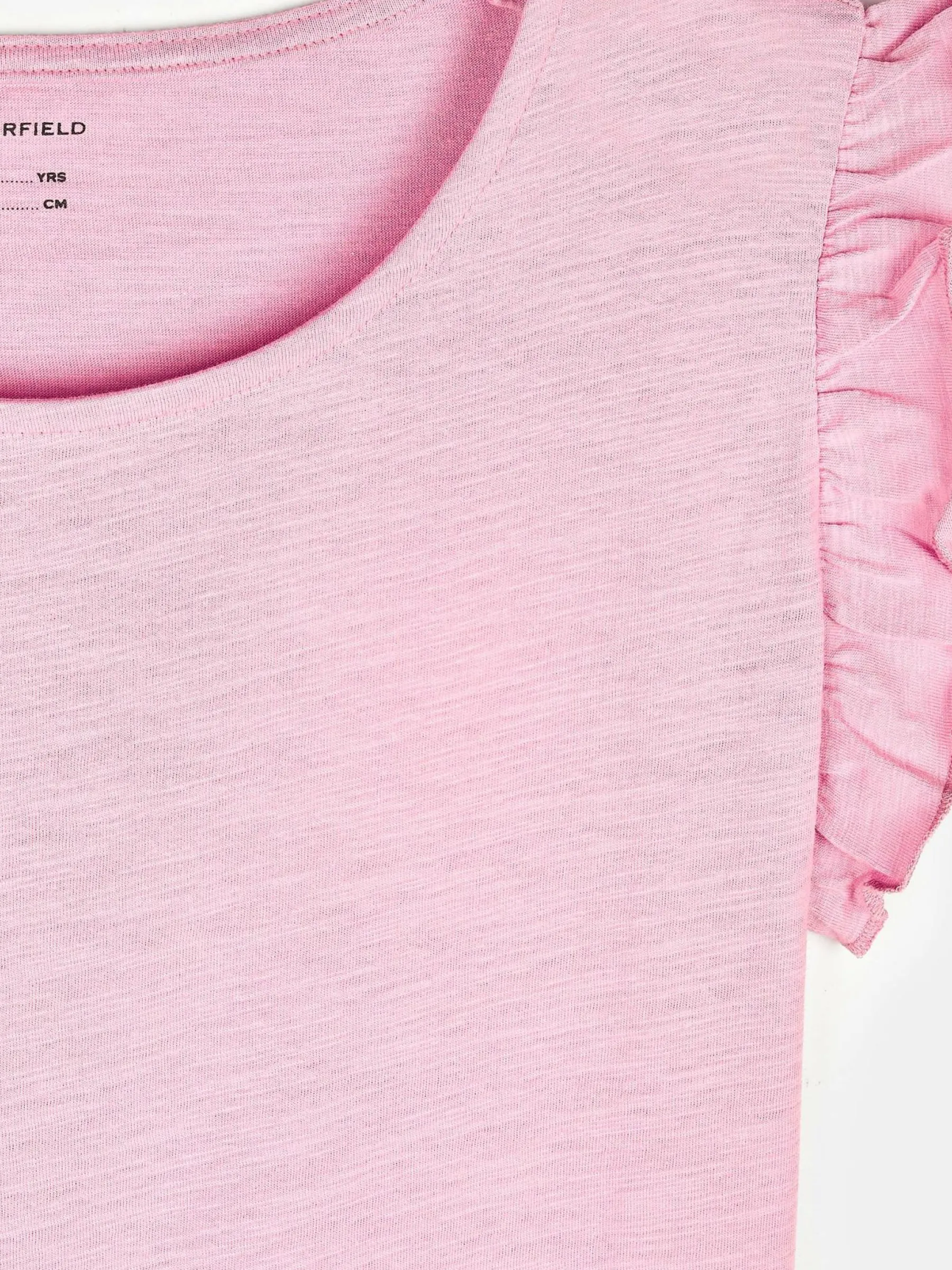 Kolor: różowyKrój: z falbanąTyp: koszulkaRekaw: bez rękawówDługość: krótkiPattern style: pojedynczy kolorDetal…
