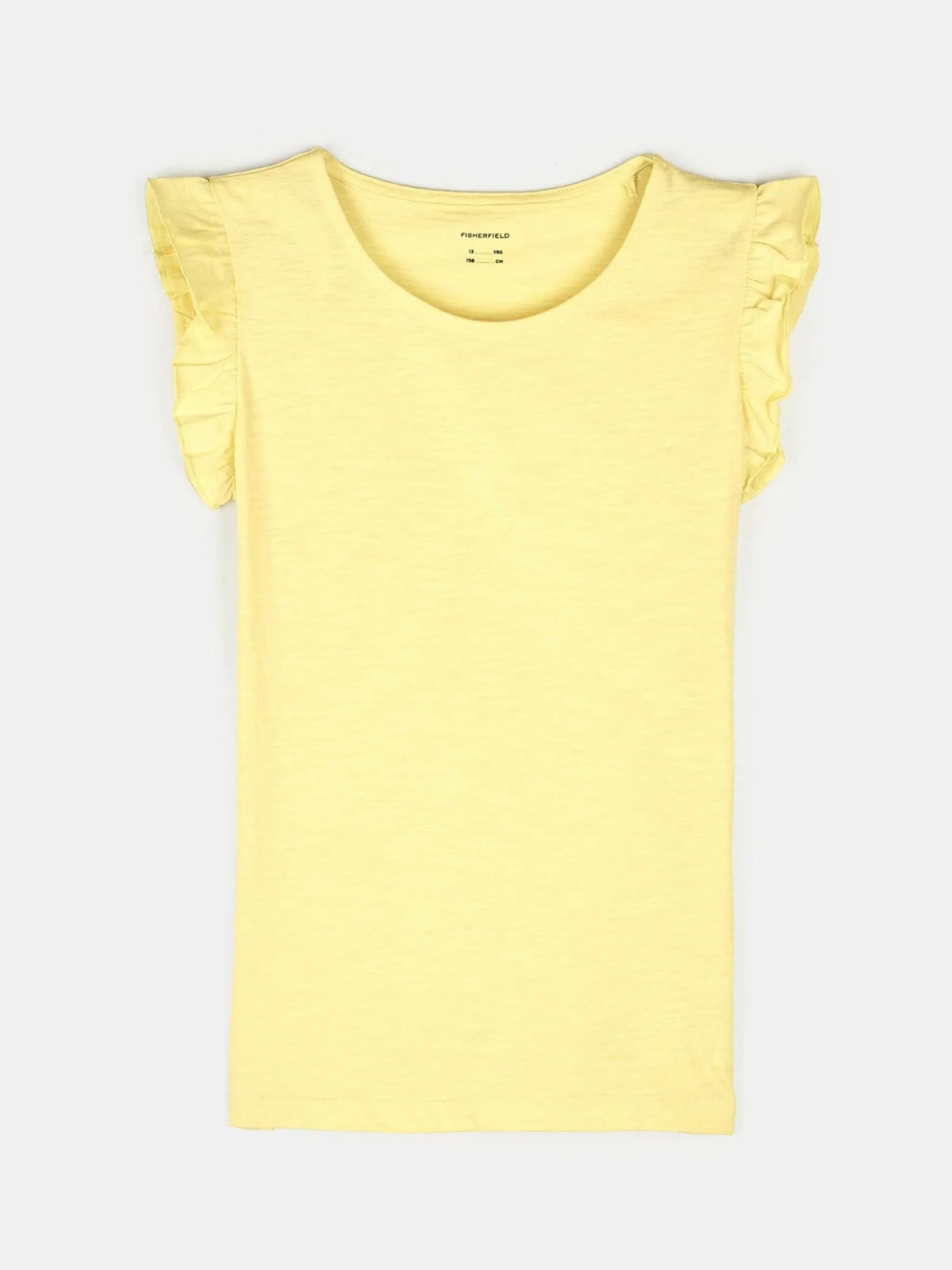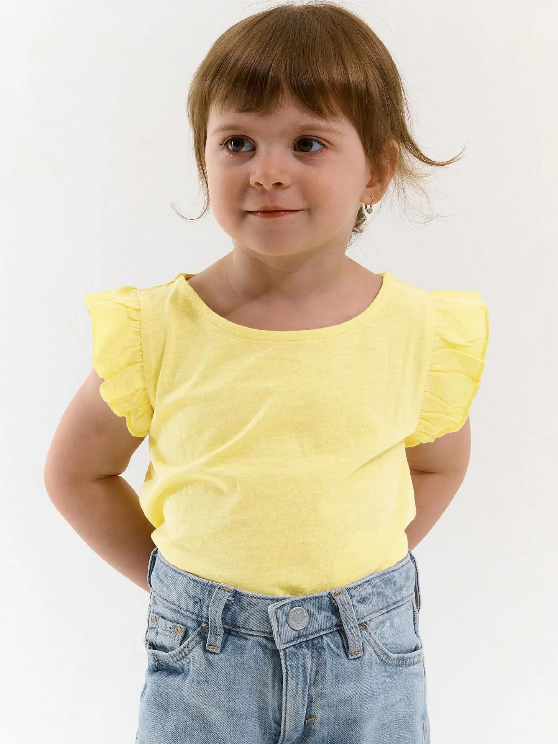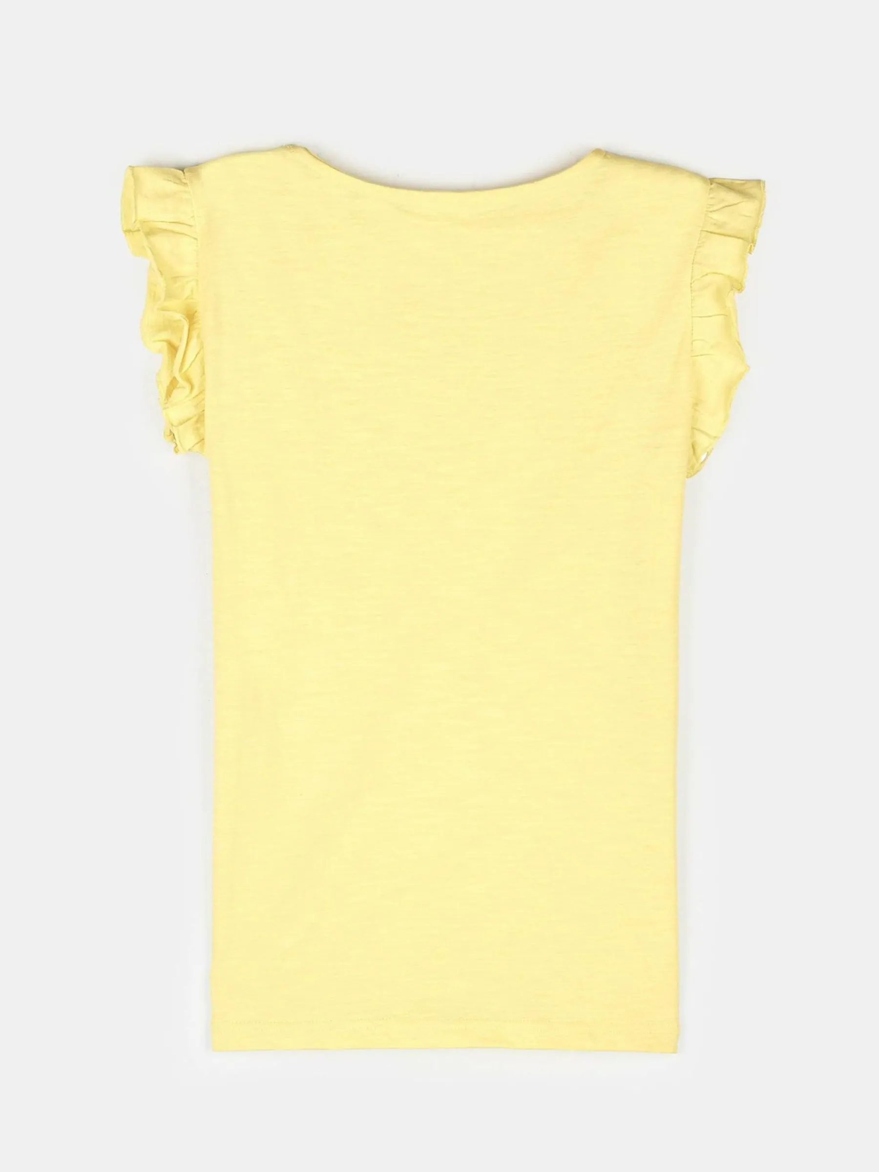 Kolor: żółtyKrój: z falbanąTyp: koszulkaRekaw: bez rękawówDługość: krótkiPattern style: pojedynczy kolorDetal…
