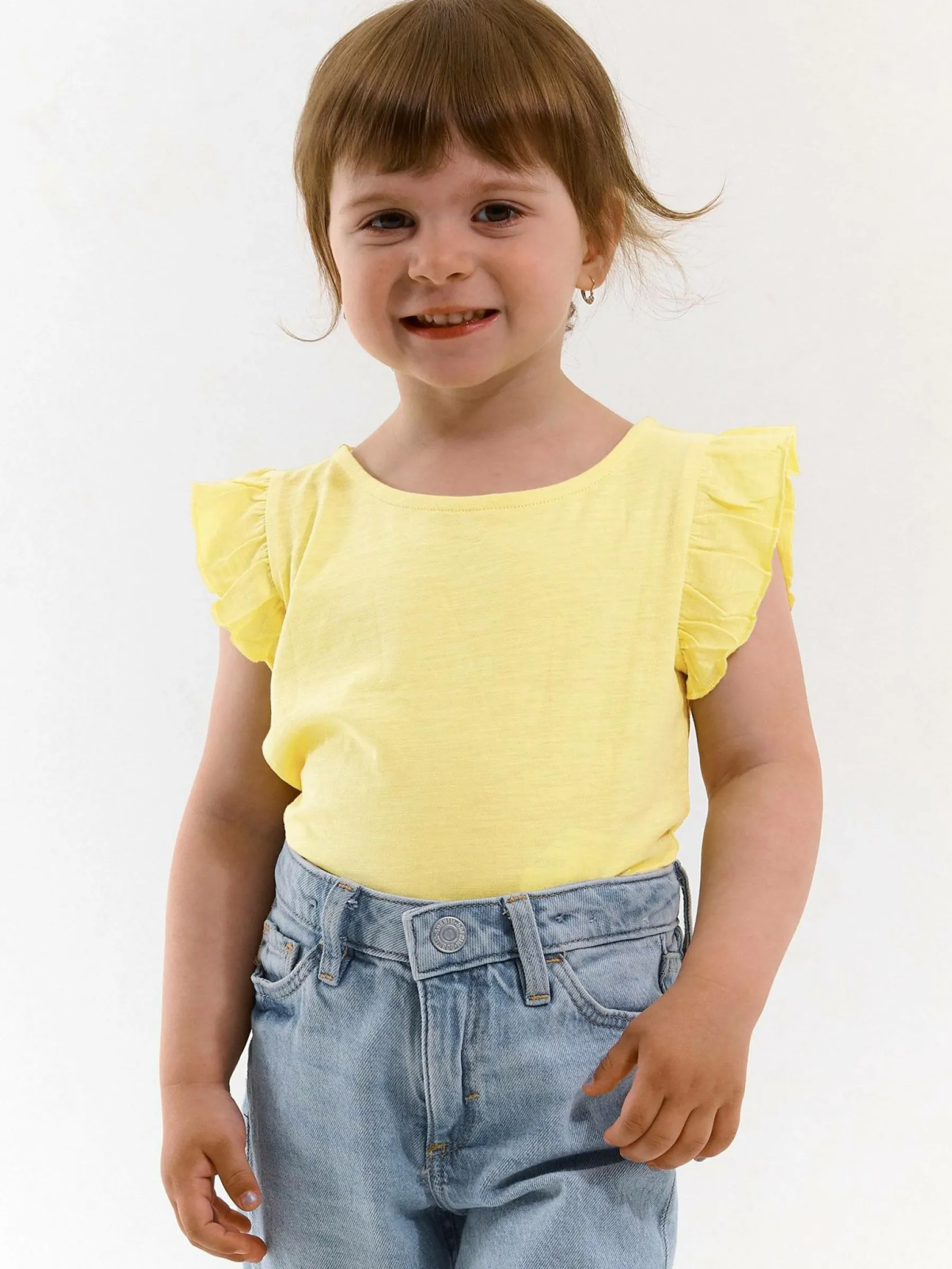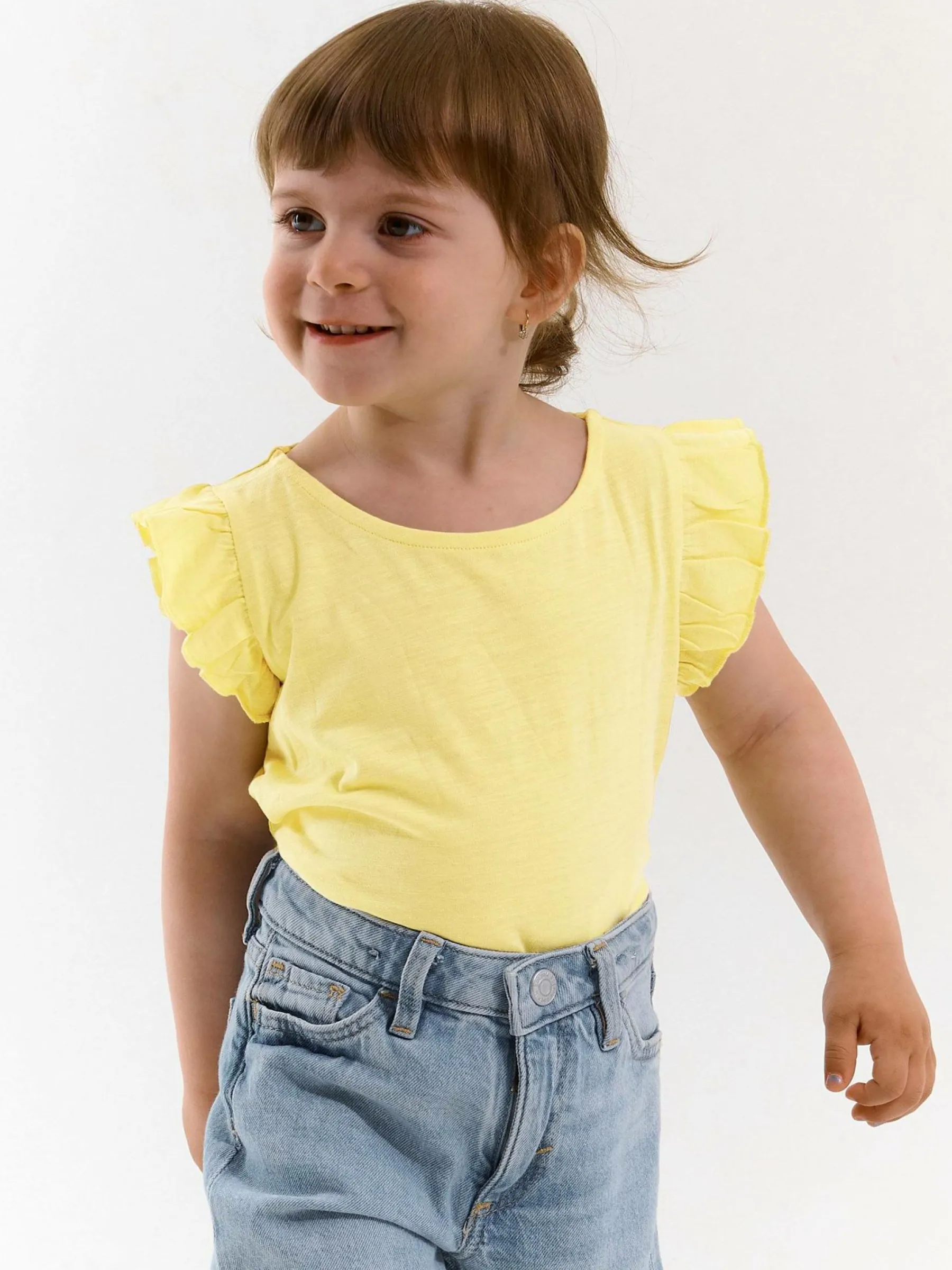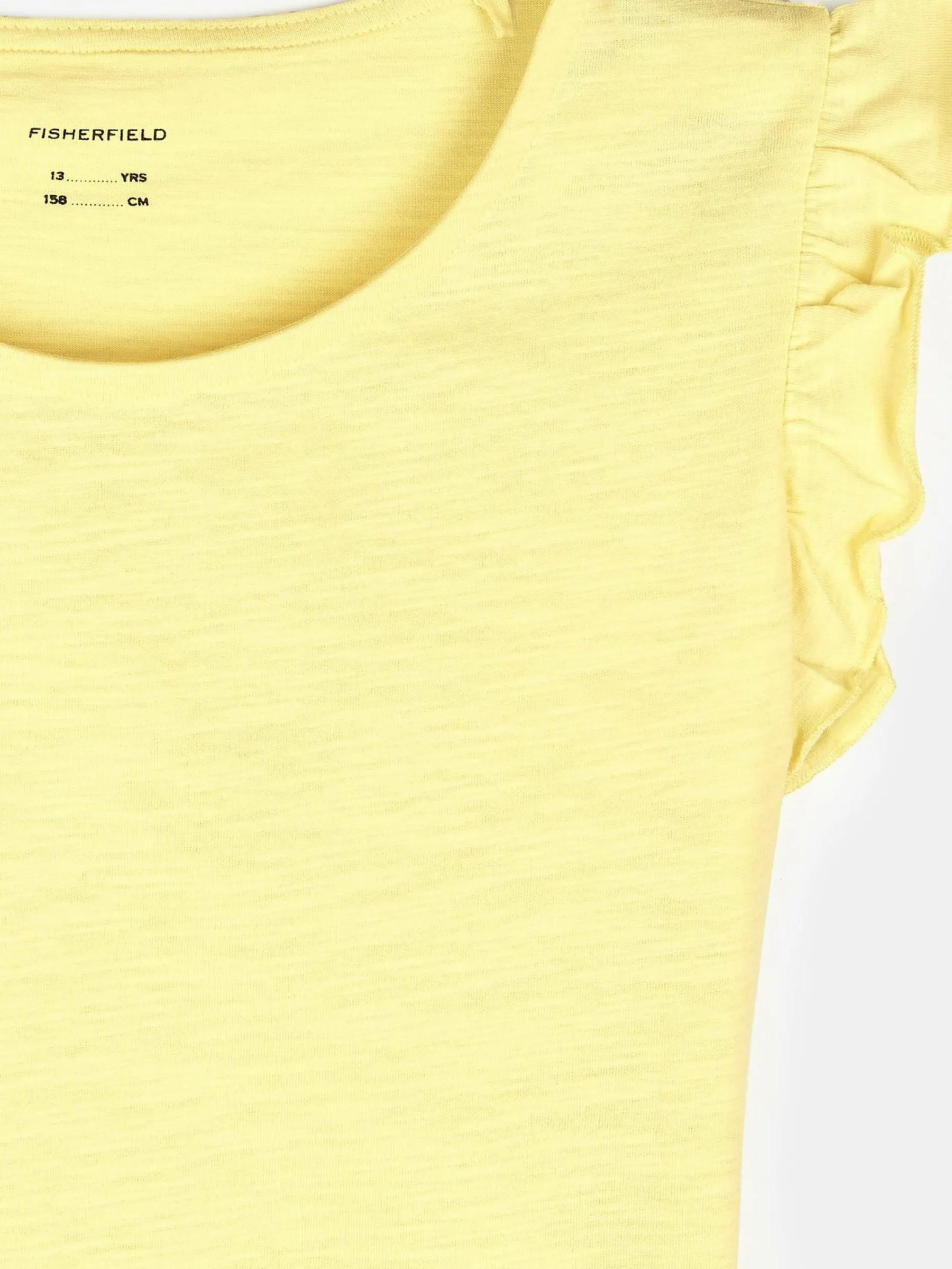 Kolor: żółtyKrój: z falbanąTyp: koszulkaRekaw: bez rękawówDługość: krótkiPattern style: pojedynczy kolorDetal…