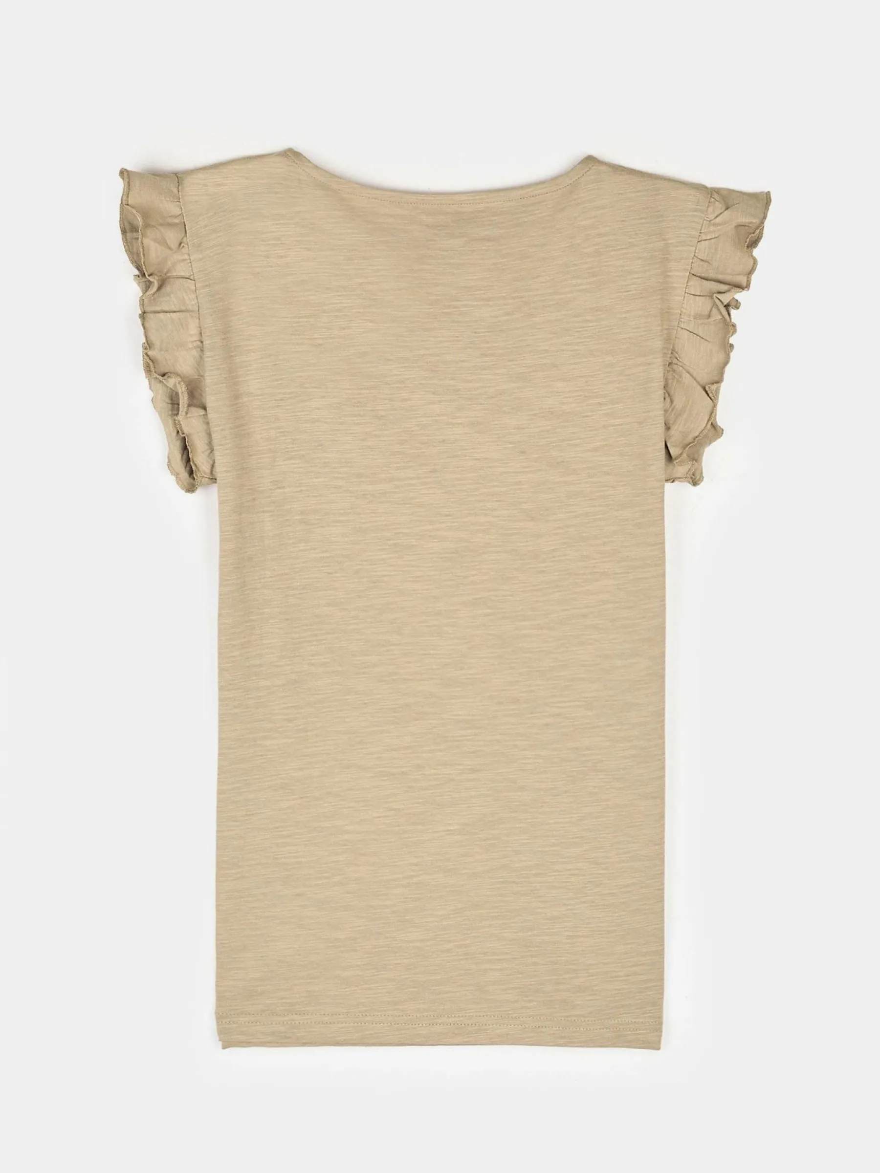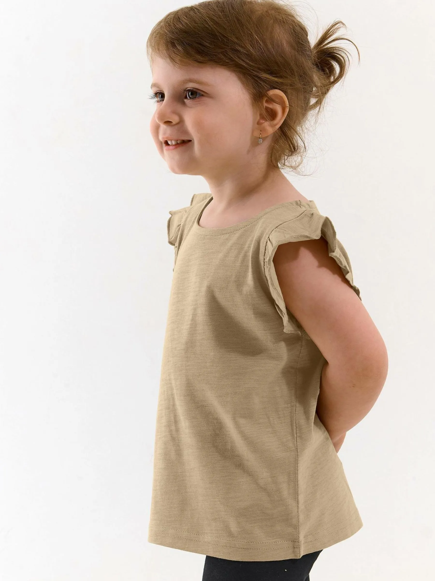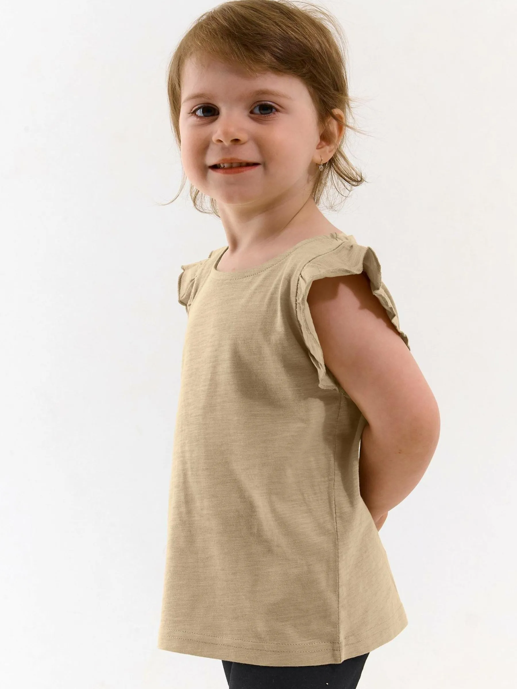 Kolor: beżowy, brązowyKrój: z falbanąTyp: koszulkaRekaw: bez rękawówDługość: krótkiPattern style: pojedynczy k…