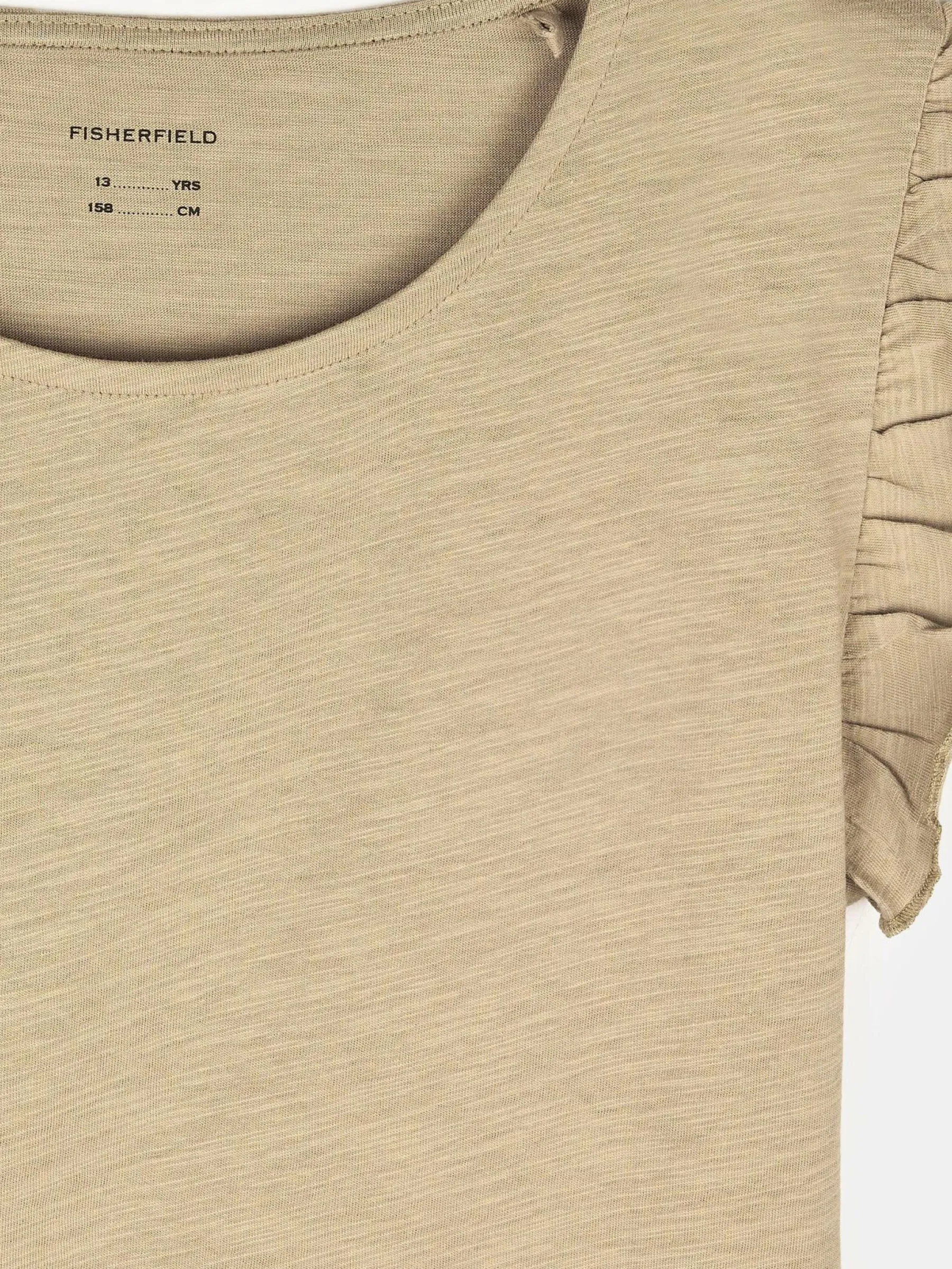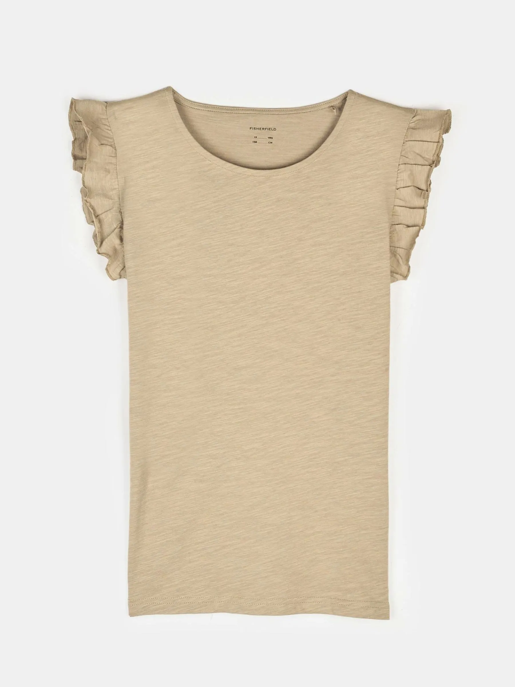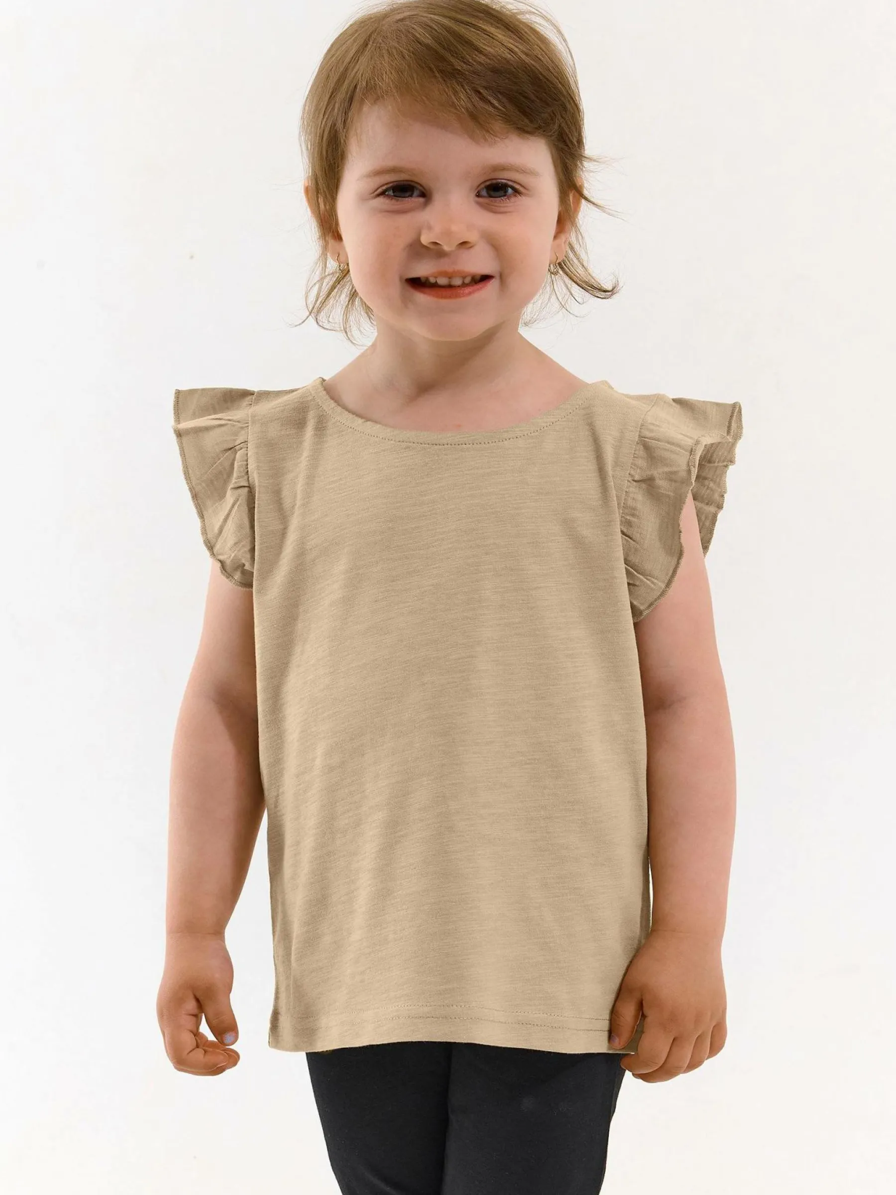 Kolor: beżowy, brązowyKrój: z falbanąTyp: koszulkaRekaw: bez rękawówDługość: krótkiPattern style: pojedynczy k…