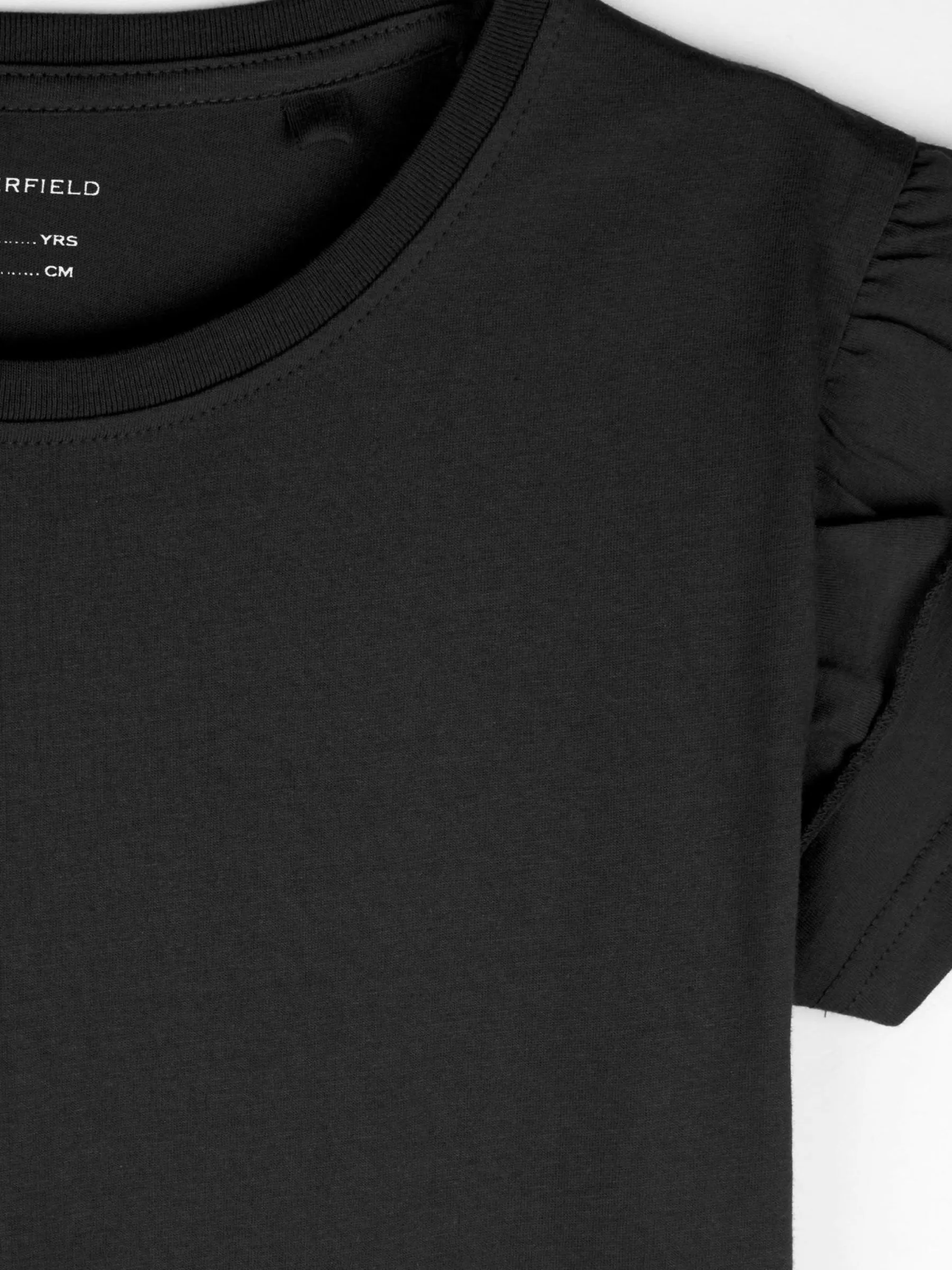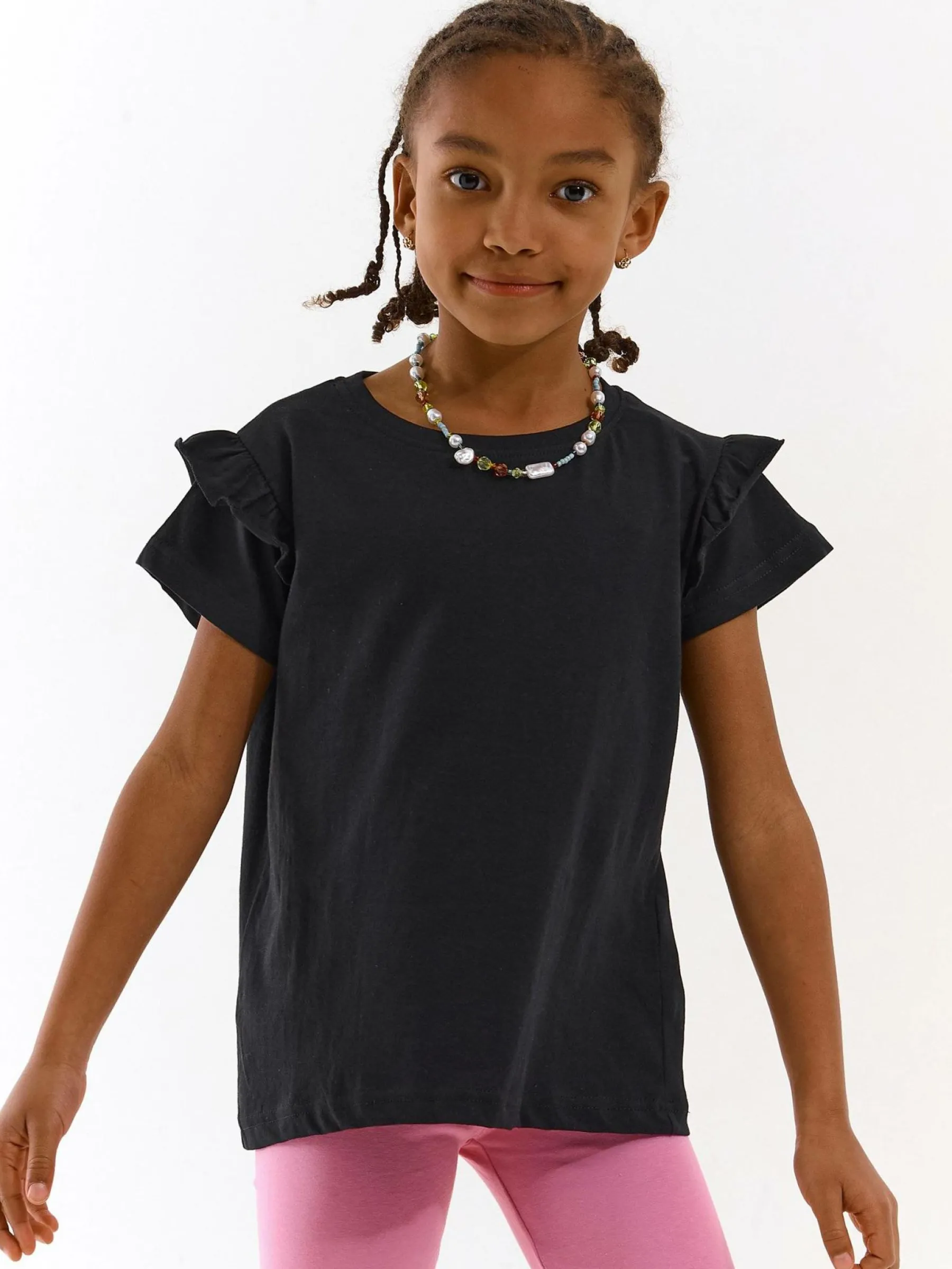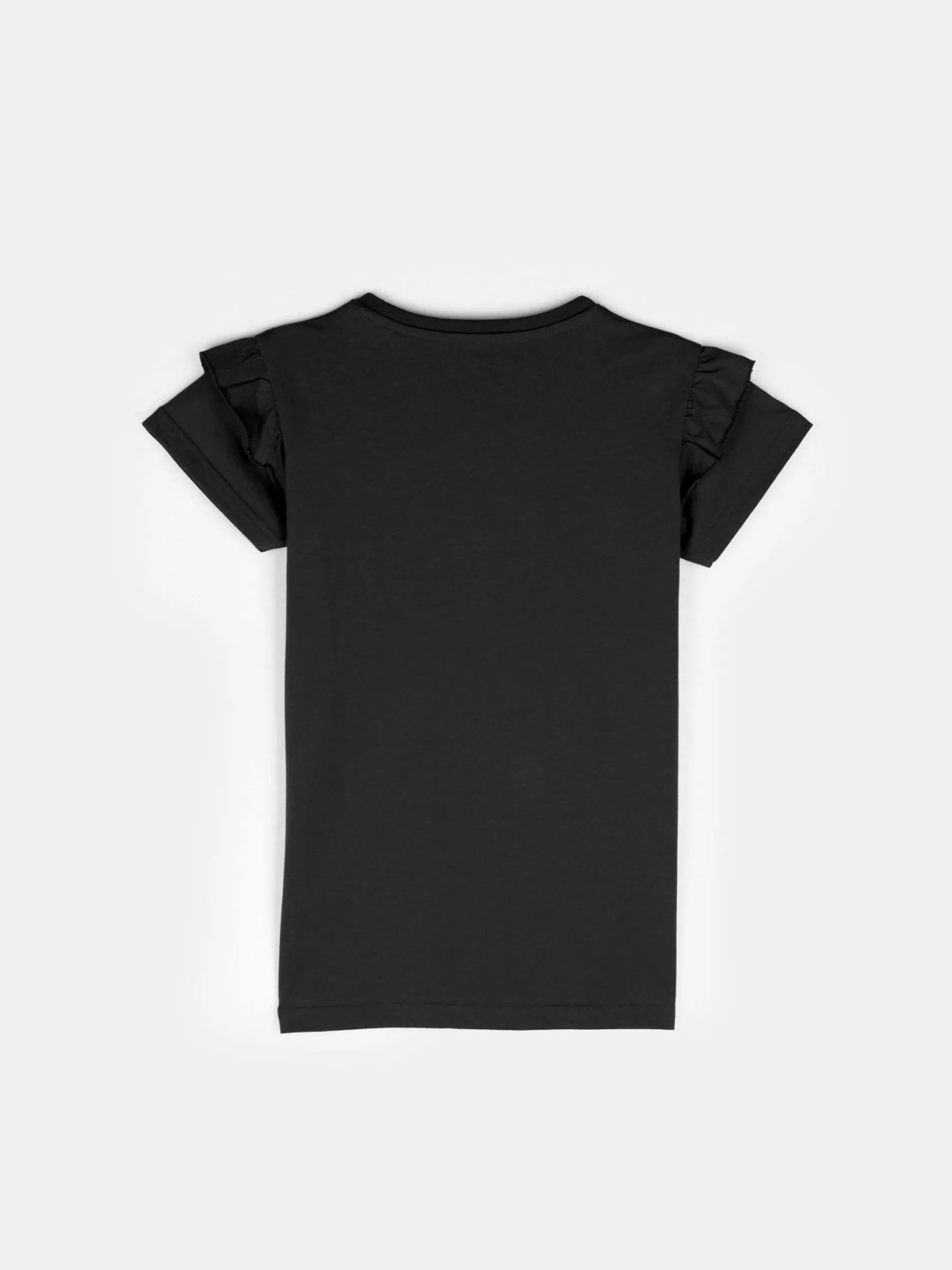 Kolor: czarnyKrój: z falbanąTyp: koszulkaRekaw: krótki rękawDługość: krótkiPattern style: pojedynczy kolorDetal:…