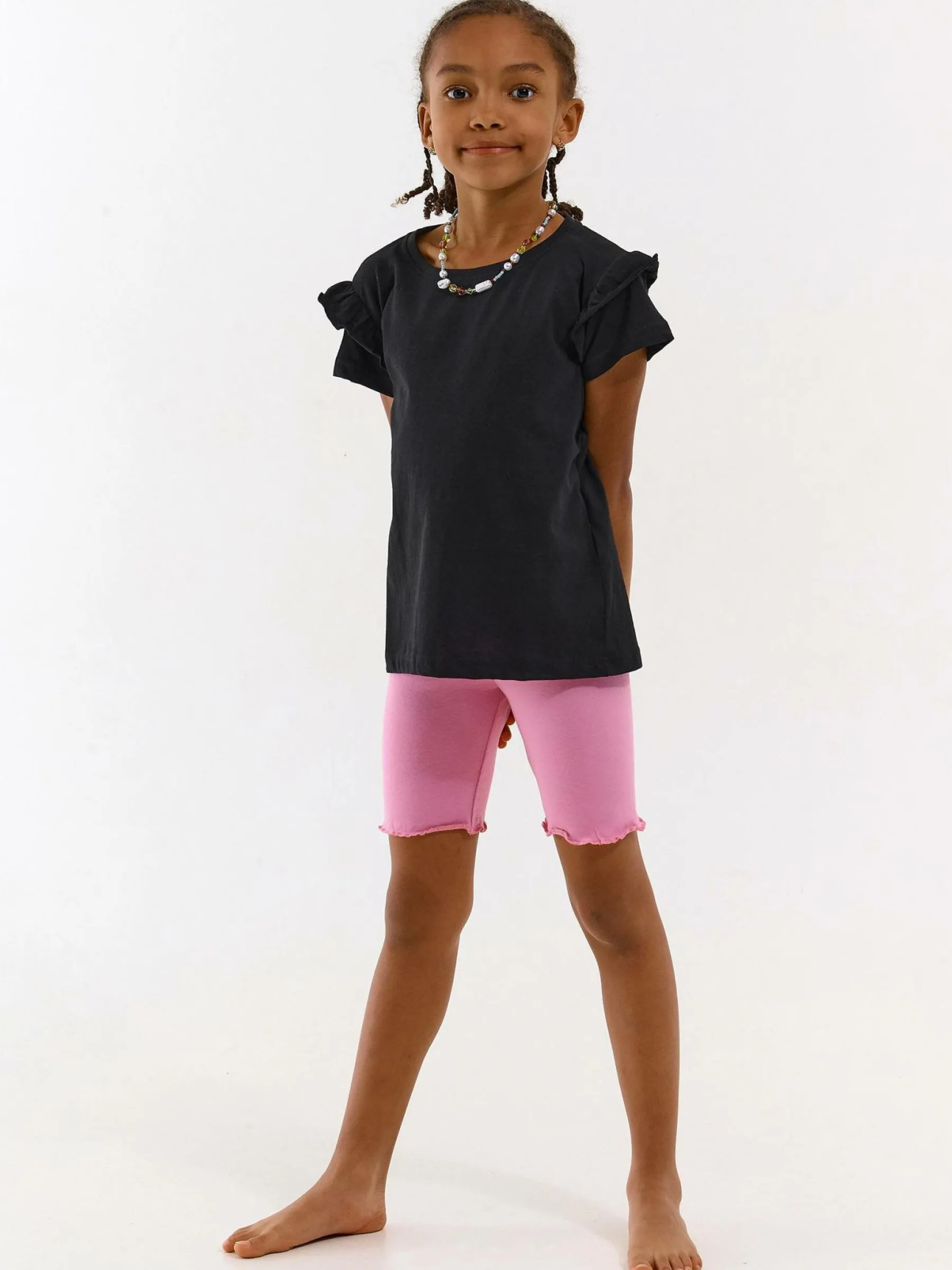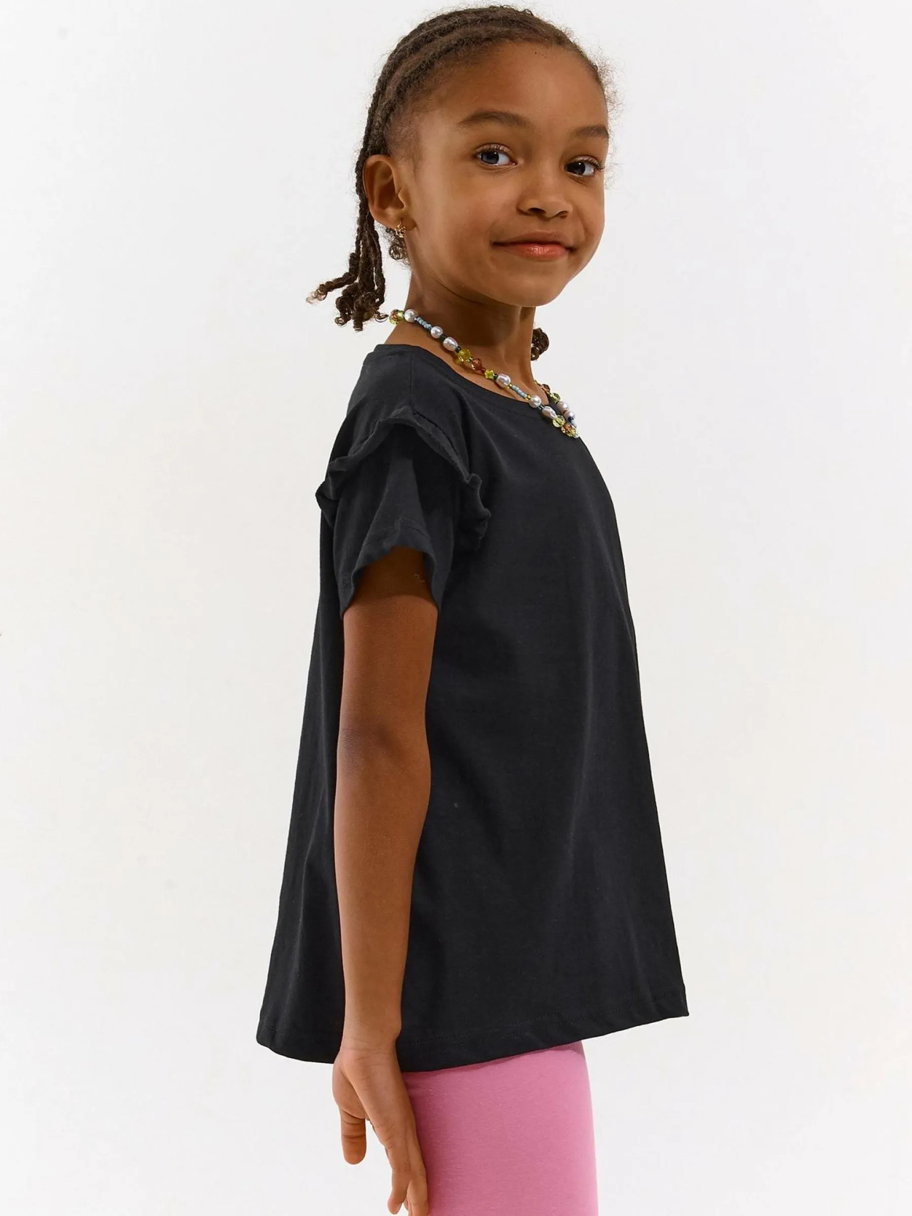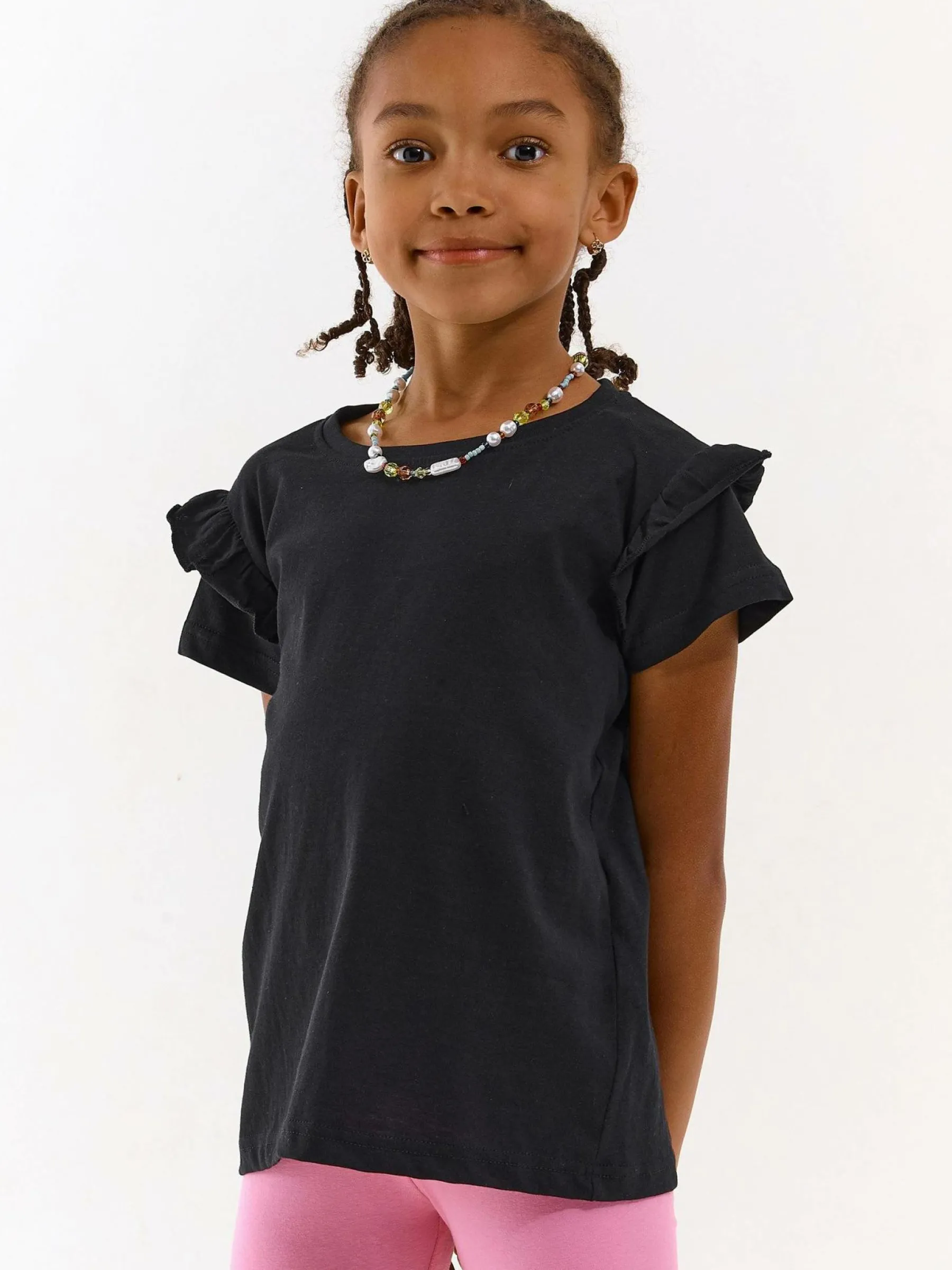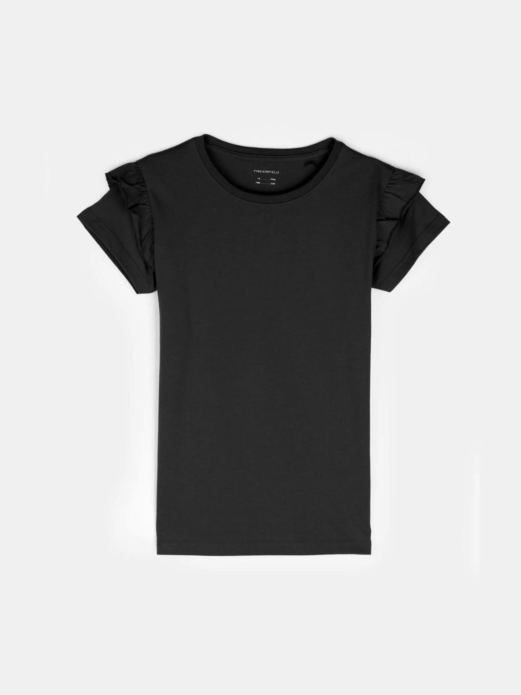 Kolor: czarnyKrój: z falbanąTyp: koszulkaRekaw: krótki rękawDługość: krótkiPattern style: pojedynczy kolorDetal:…